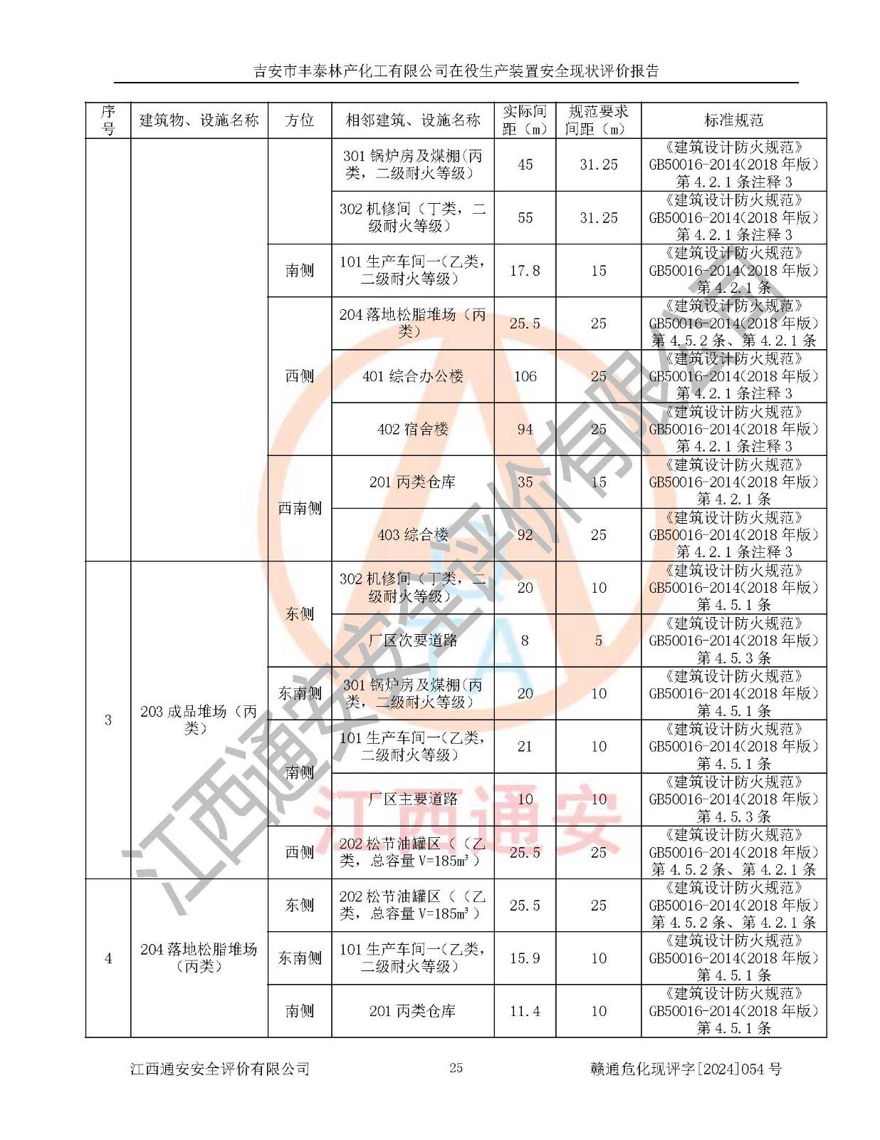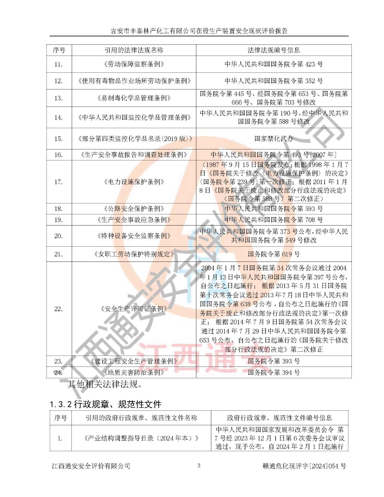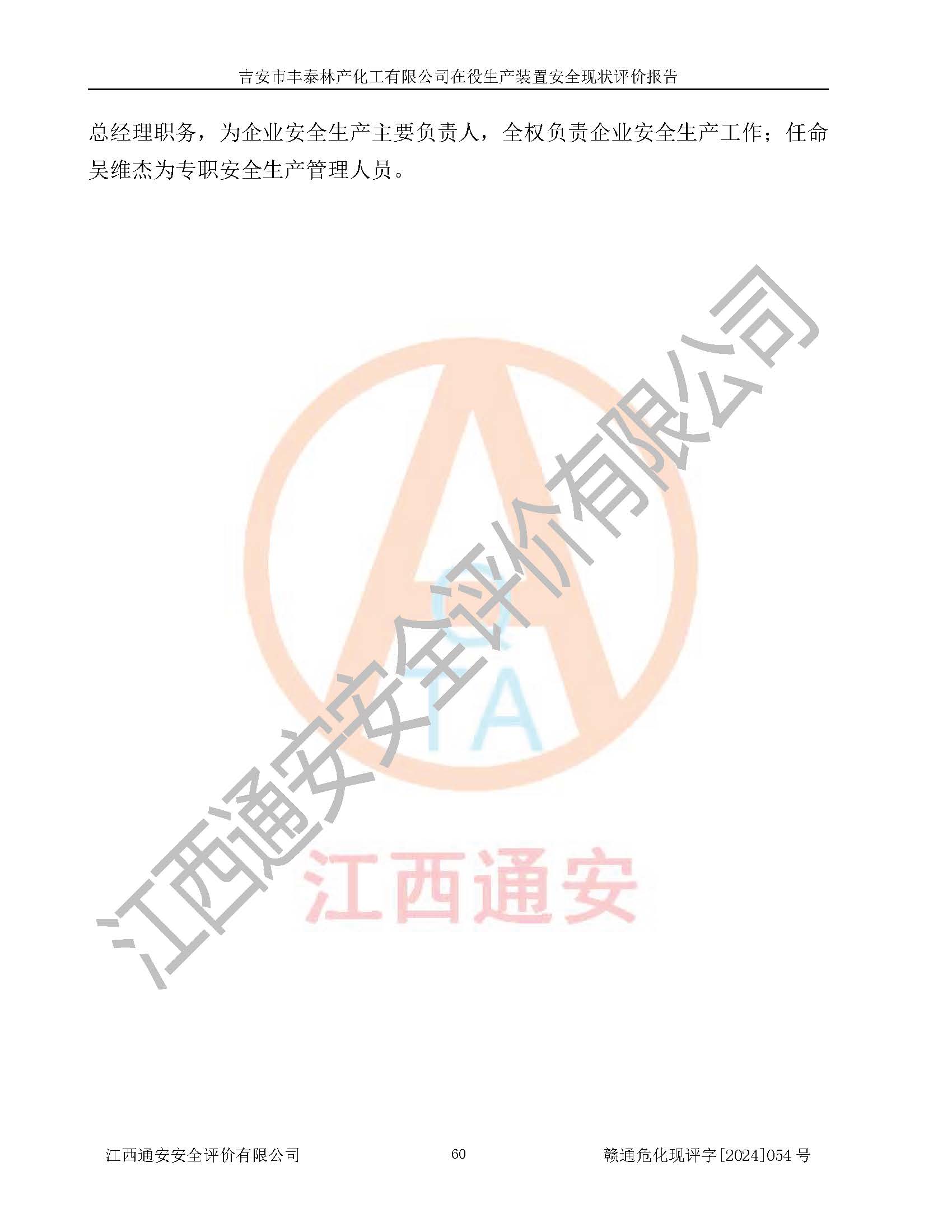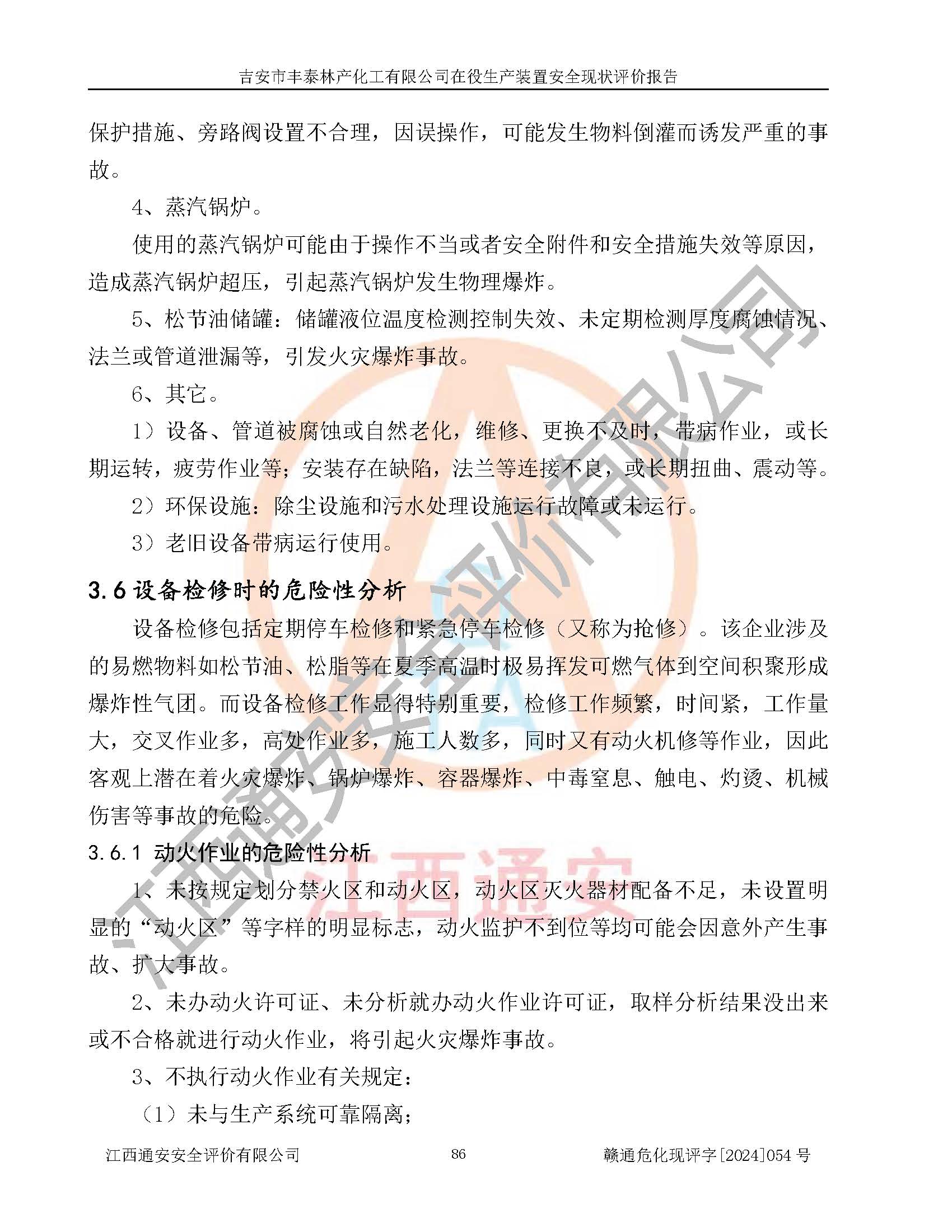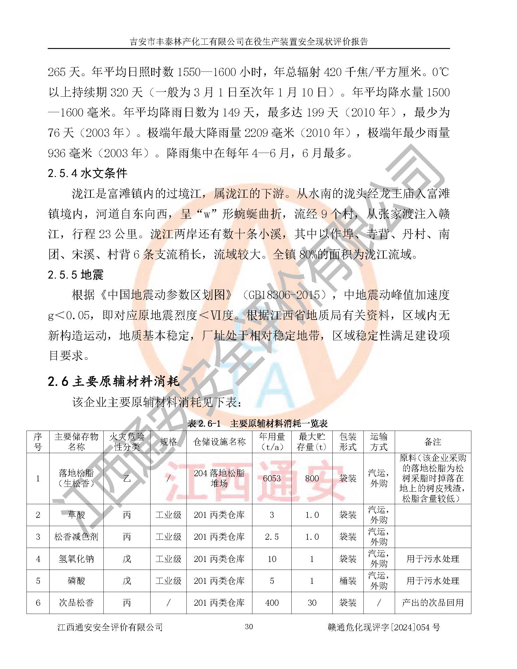 评价结论 | 评价结论:本报告认为,吉安市丰泰林产化工有限公司在役生产装置现场情况与设计图纸一致,有关从业人员资格符合《江西省危险化学品安全专项整治三年行动实施方案》要求,安全设施及安全管理符合**及有关部门关于安全生产法律法规、标准的要求,安全设施正常投用且运行**,安全风险是可以控制的,其风险程度是可以接受的,安全现状符合安全生产条件,能够满足安全生产的要求。 | |||