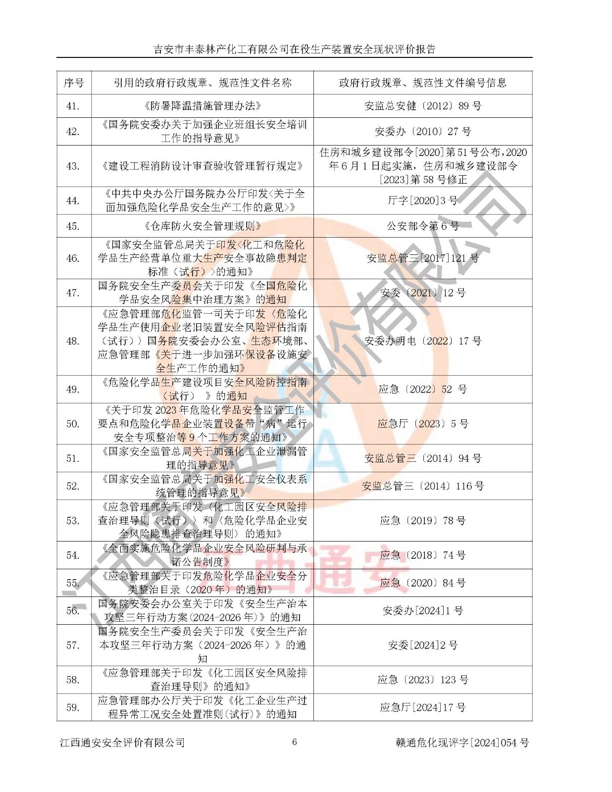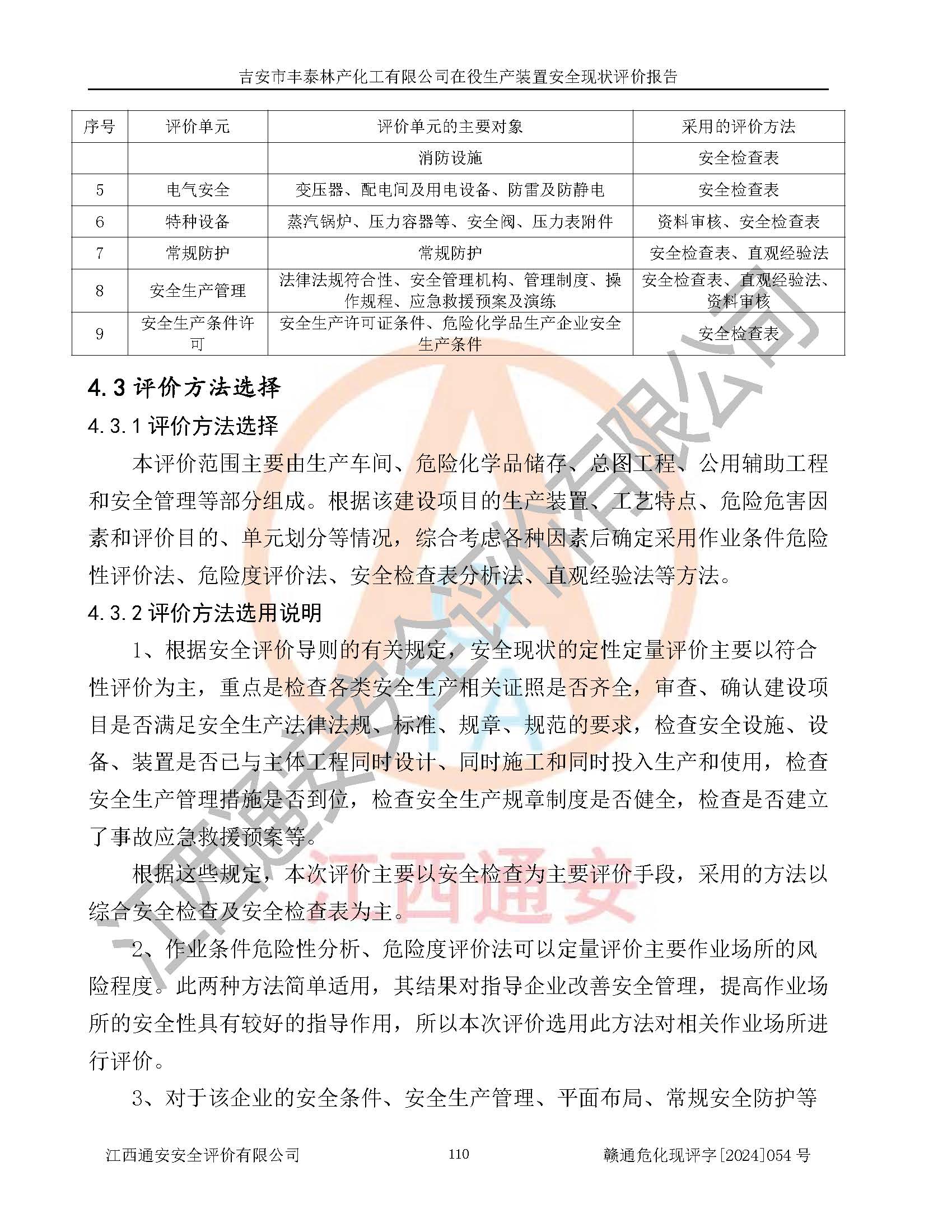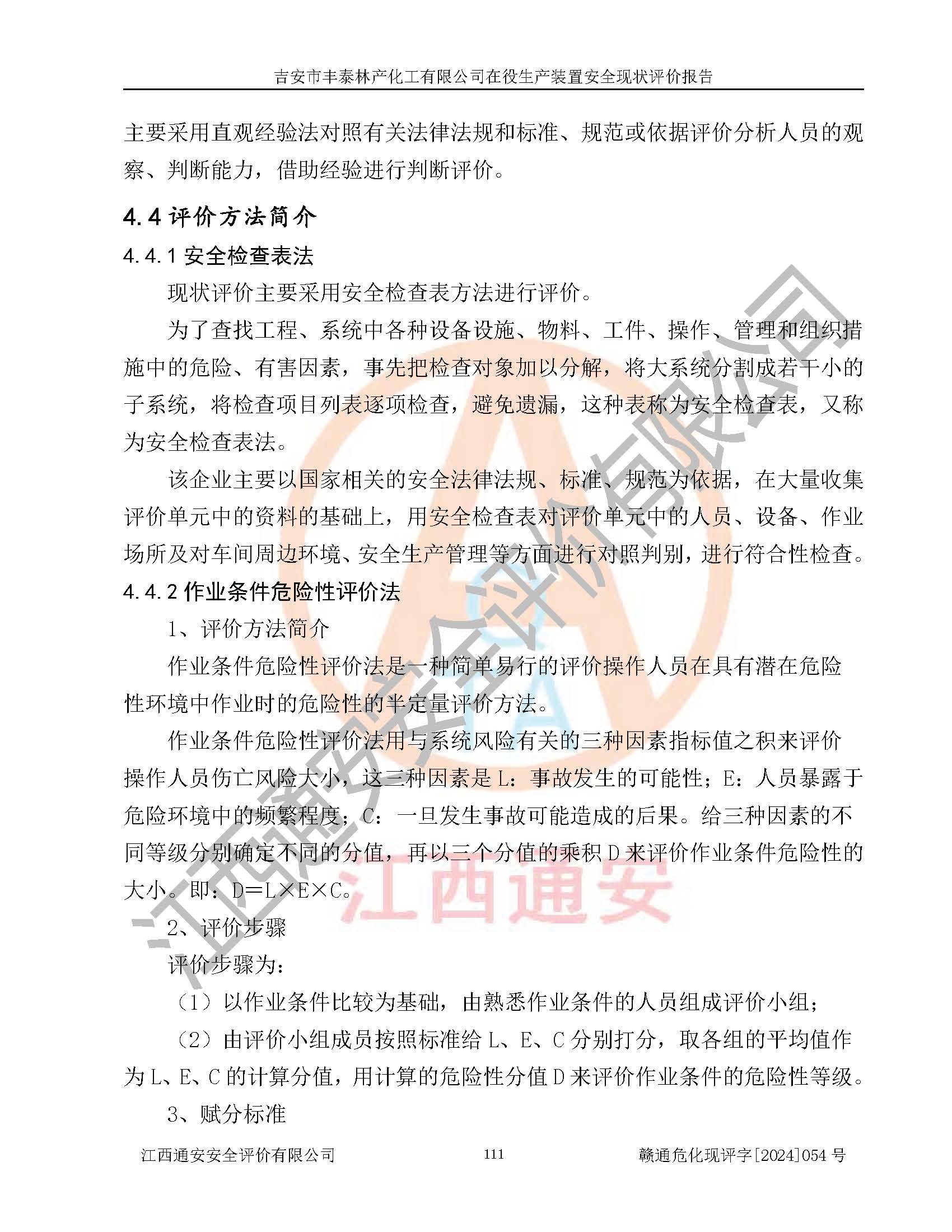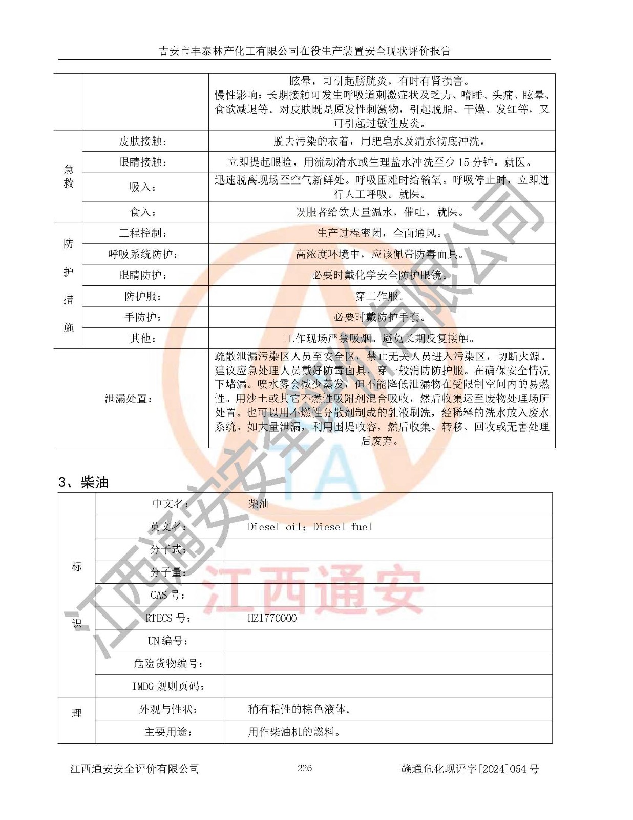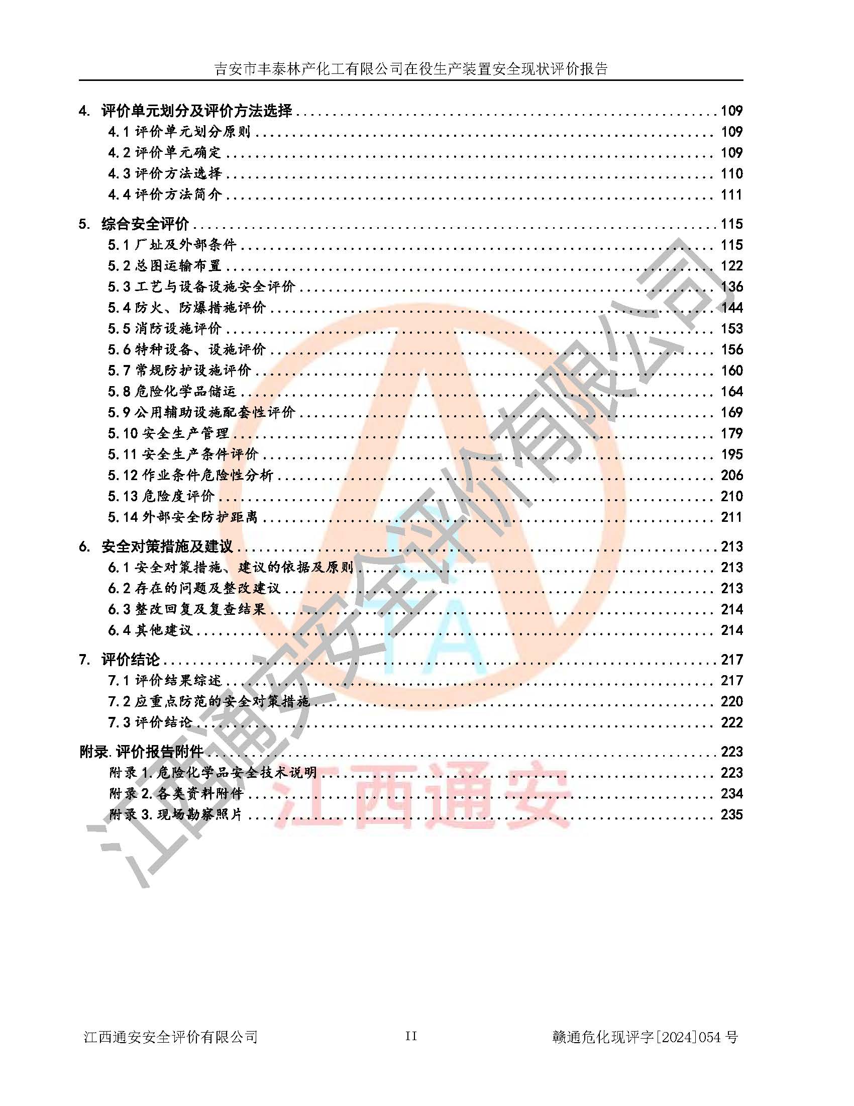 评价结论 | 评价结论:本报告认为,吉安市丰泰林产化工有限公司在役生产装置现场情况与设计图纸一致,有关从业人员资格符合《江西省危险化学品安全专项整治三年行动实施方案》要求,安全设施及安全管理符合**及有关部门关于安全生产法律法规、标准的要求,安全设施正常投用且运行**,安全风险是可以控制的,其风险程度是可以接受的,安全现状符合安全生产条件,能够满足安全生产的要求。 | |||