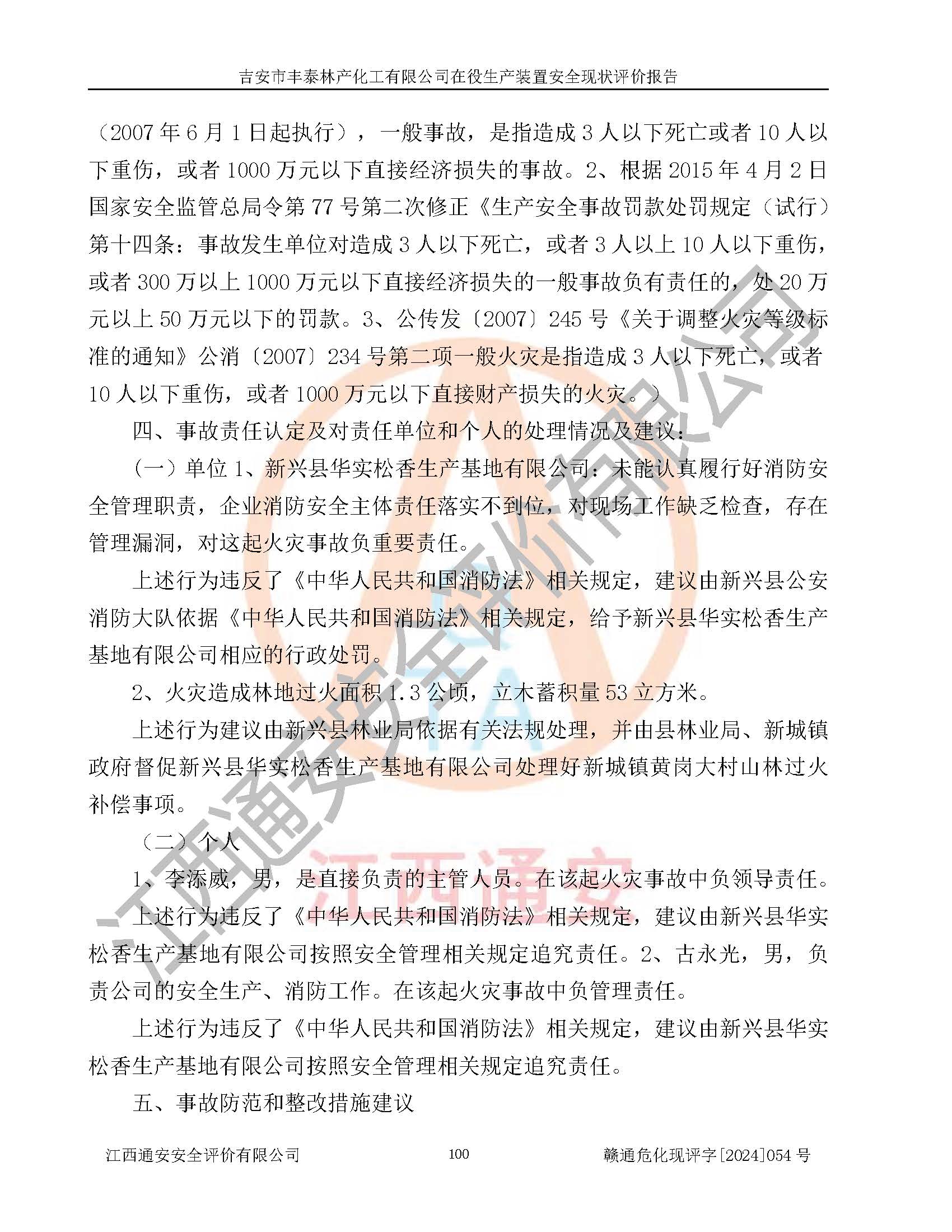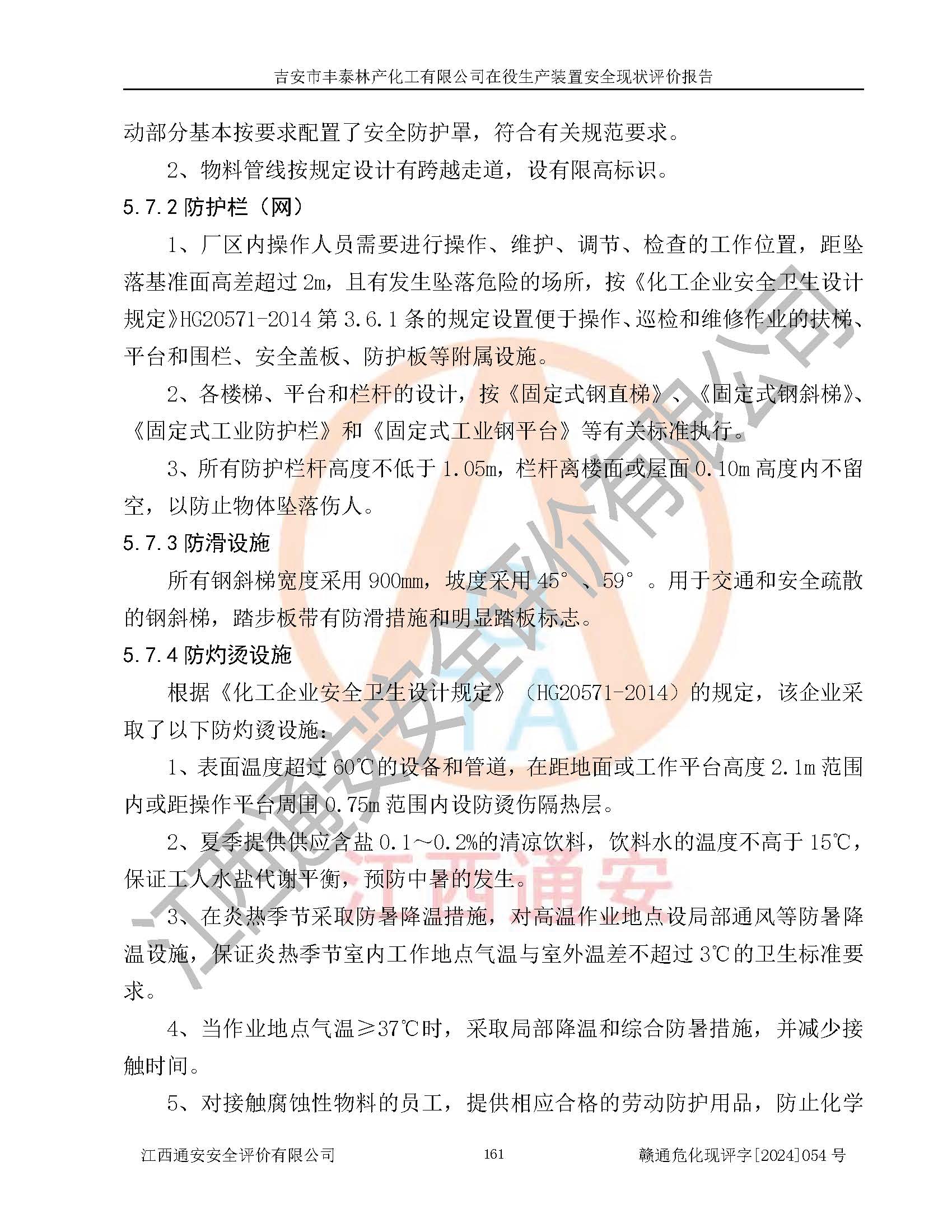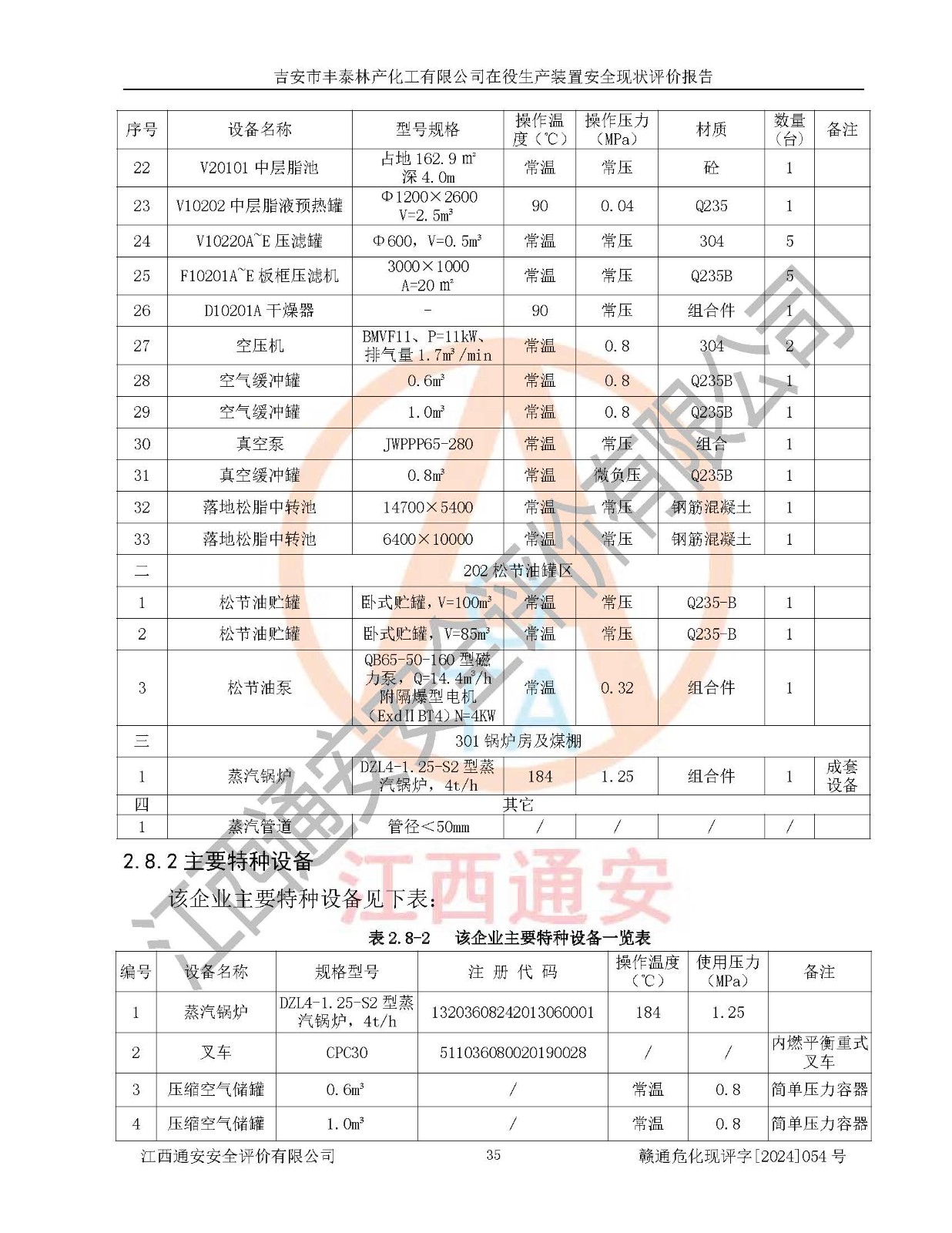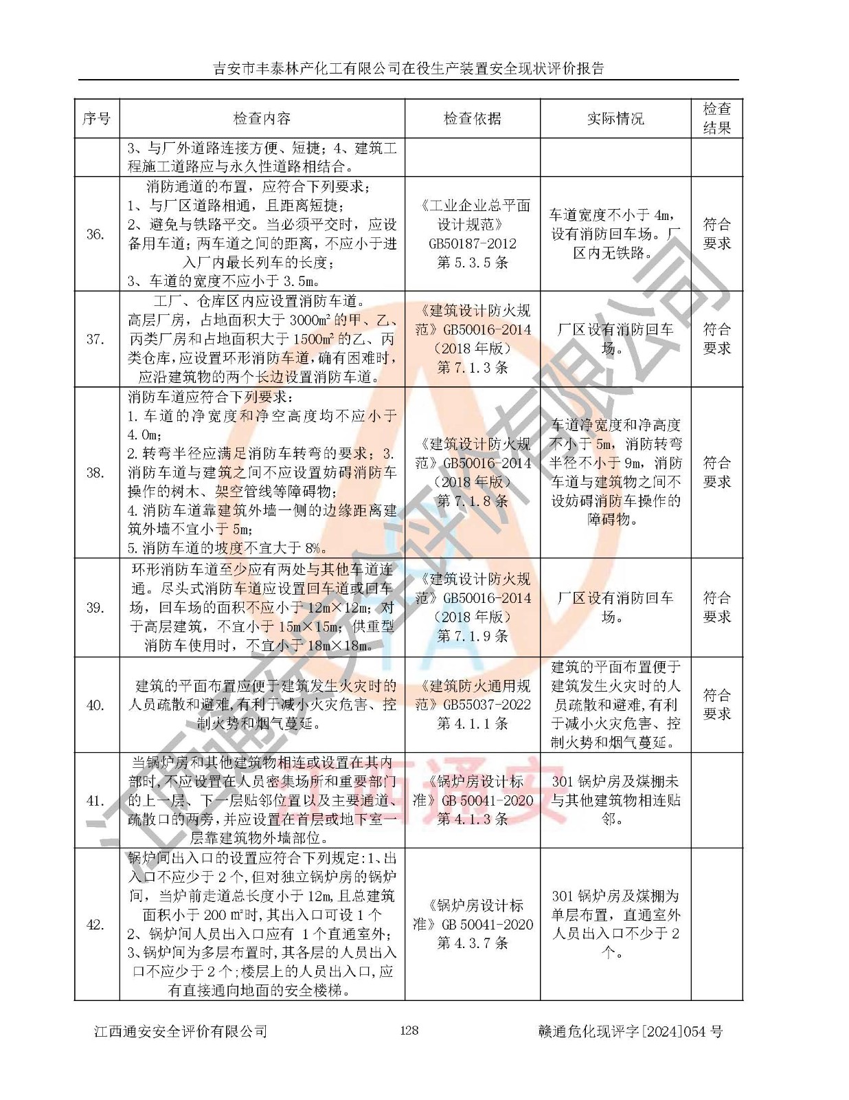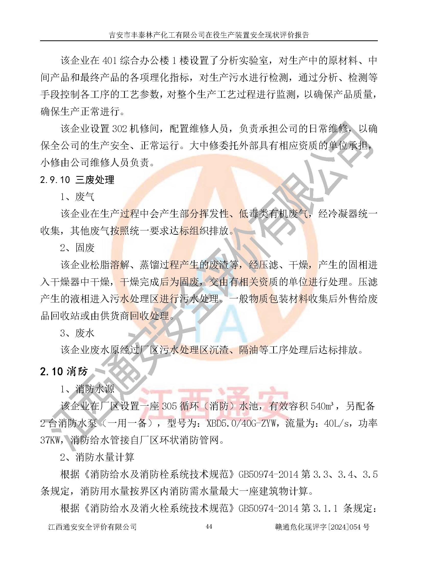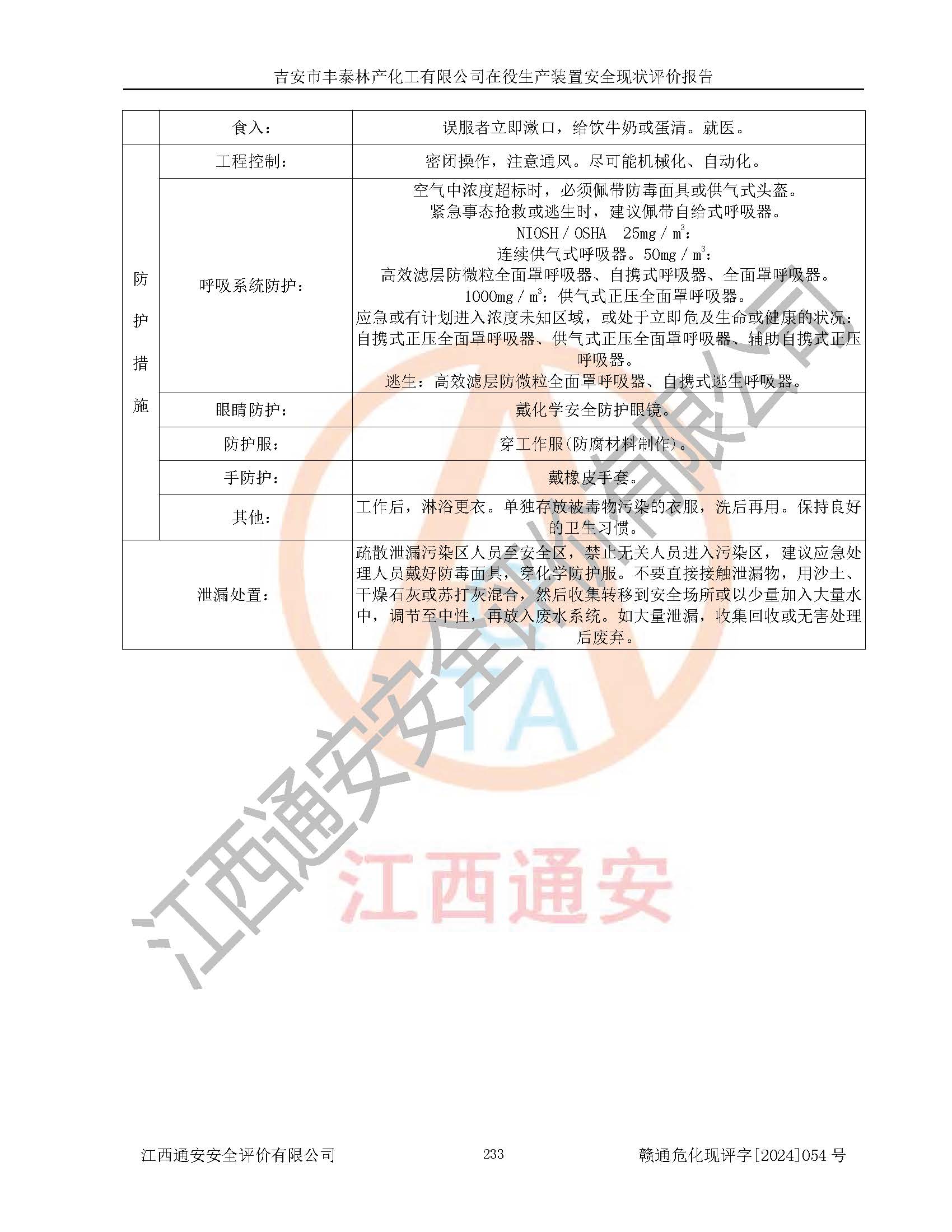 评价结论 | 评价结论:本报告认为,吉安市丰泰林产化工有限公司在役生产装置现场情况与设计图纸一致,有关从业人员资格符合《江西省危险化学品安全专项整治三年行动实施方案》要求,安全设施及安全管理符合**及有关部门关于安全生产法律法规、标准的要求,安全设施正常投用且运行**,安全风险是可以控制的,其风险程度是可以接受的,安全现状符合安全生产条件,能够满足安全生产的要求。 | |||
