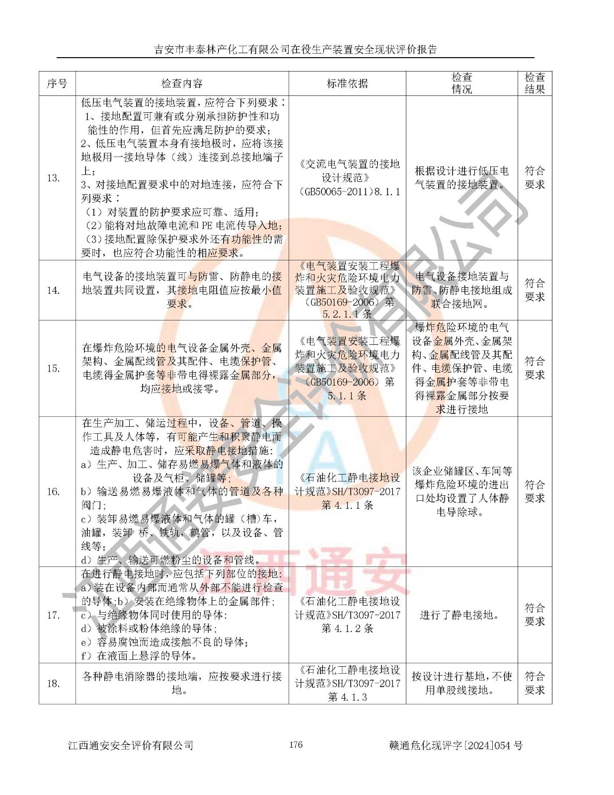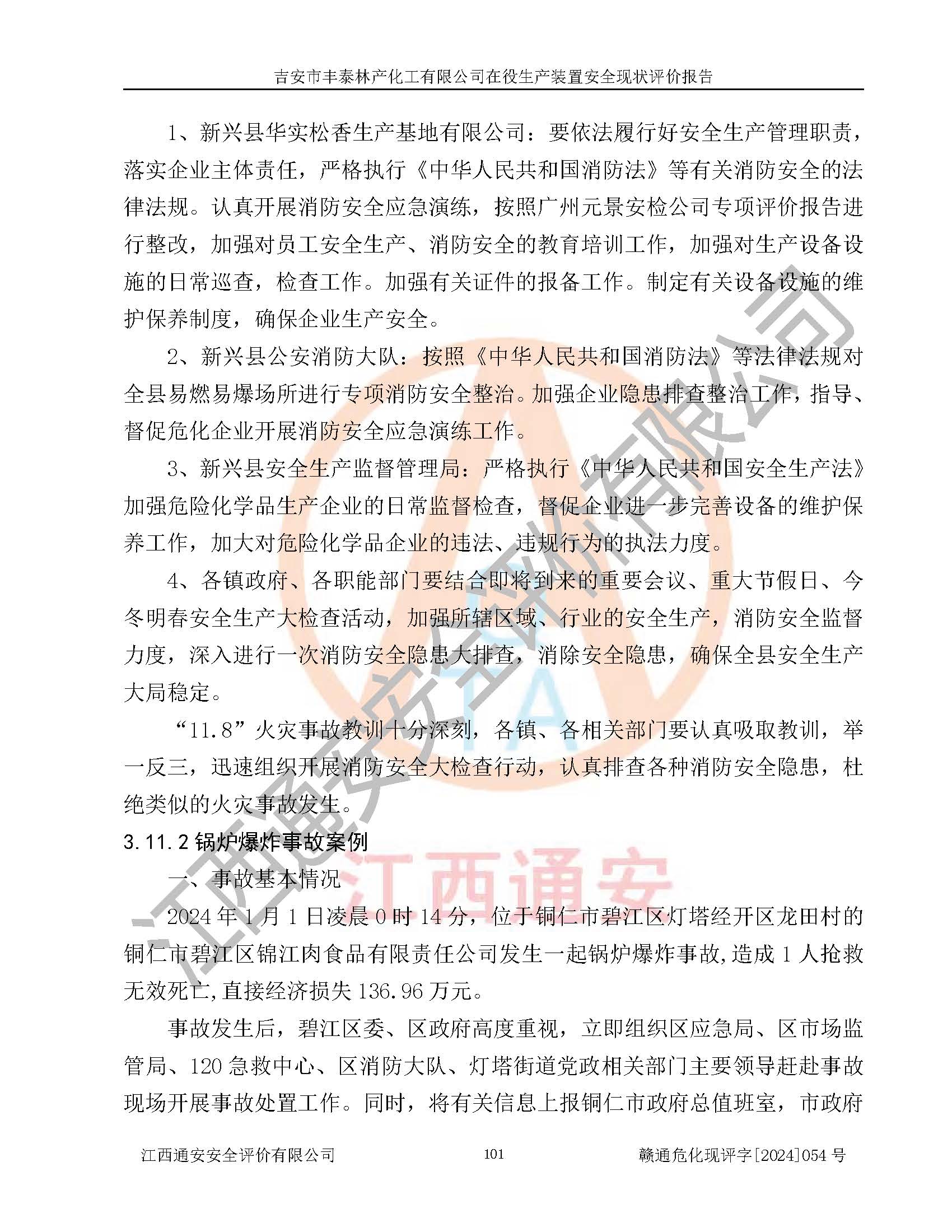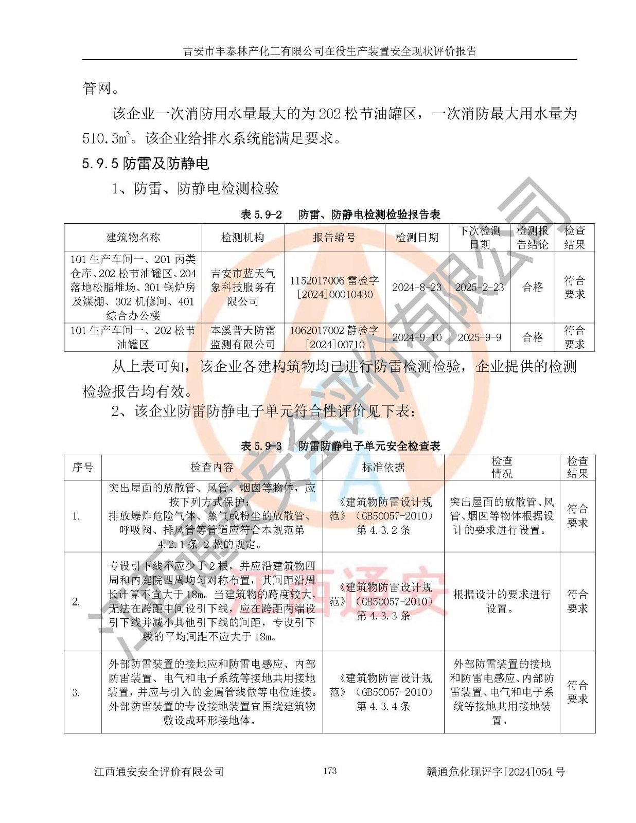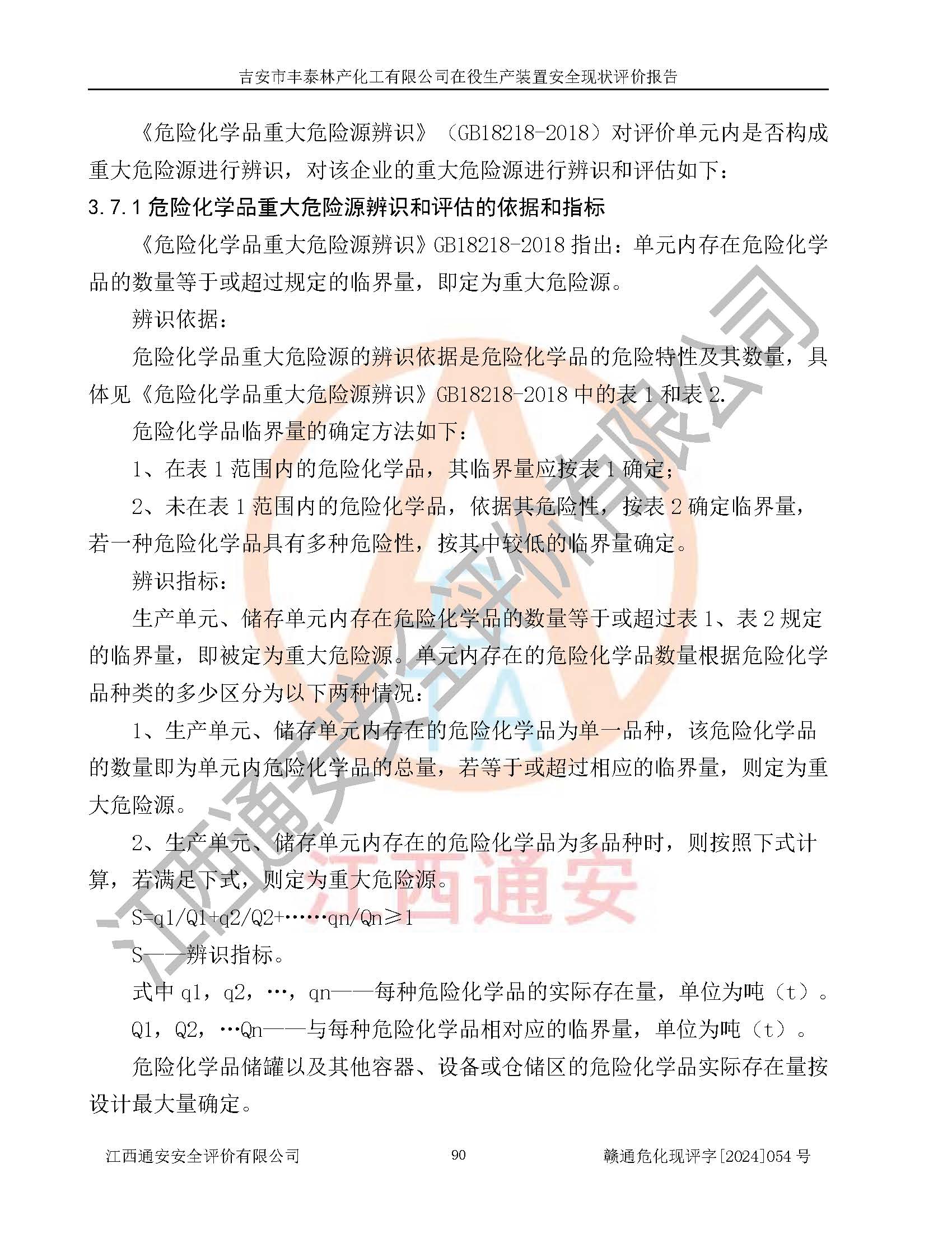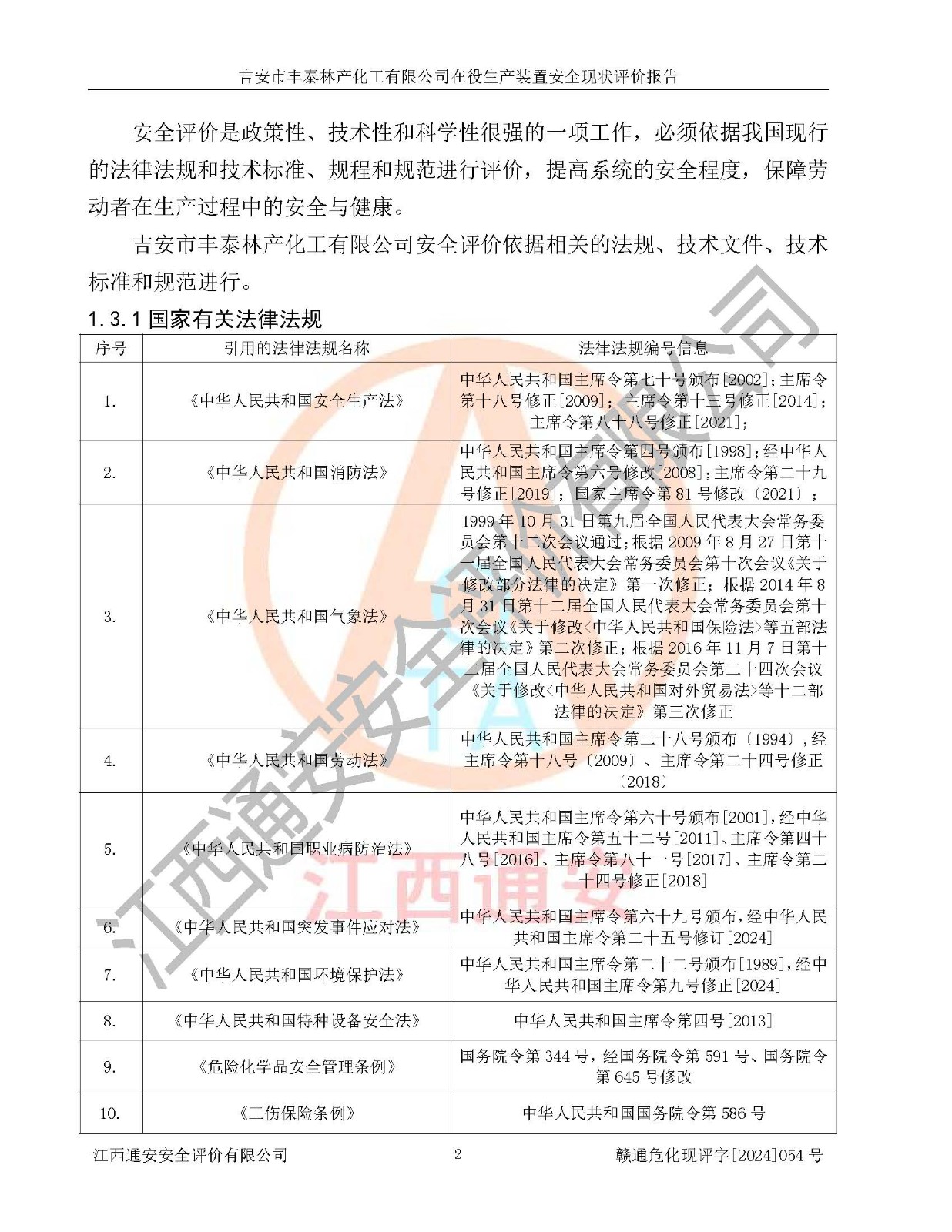 评价结论 | 评价结论:本报告认为,吉安市丰泰林产化工有限公司在役生产装置现场情况与设计图纸一致,有关从业人员资格符合《江西省危险化学品安全专项整治三年行动实施方案》要求,安全设施及安全管理符合**及有关部门关于安全生产法律法规、标准的要求,安全设施正常投用且运行**,安全风险是可以控制的,其风险程度是可以接受的,安全现状符合安全生产条件,能够满足安全生产的要求。 | |||