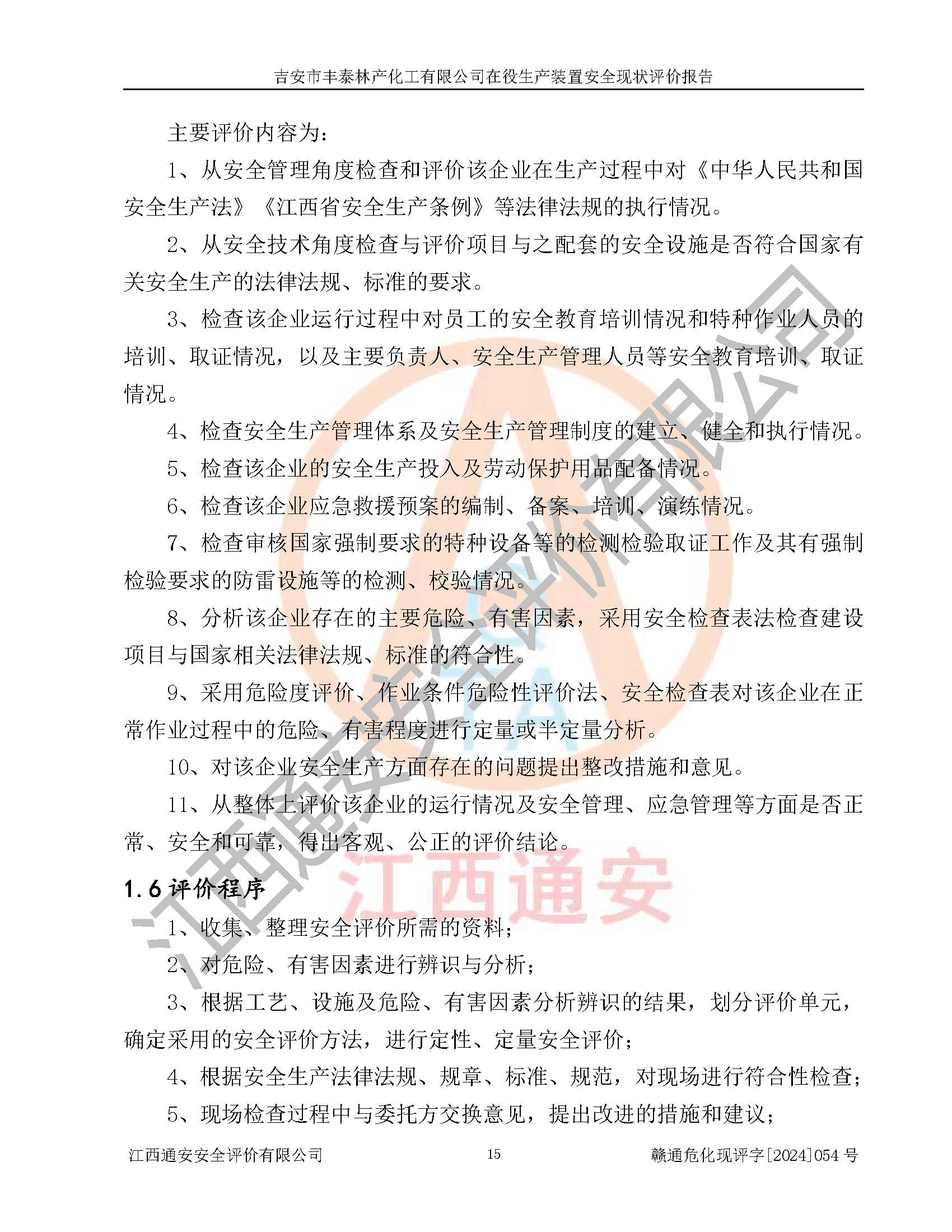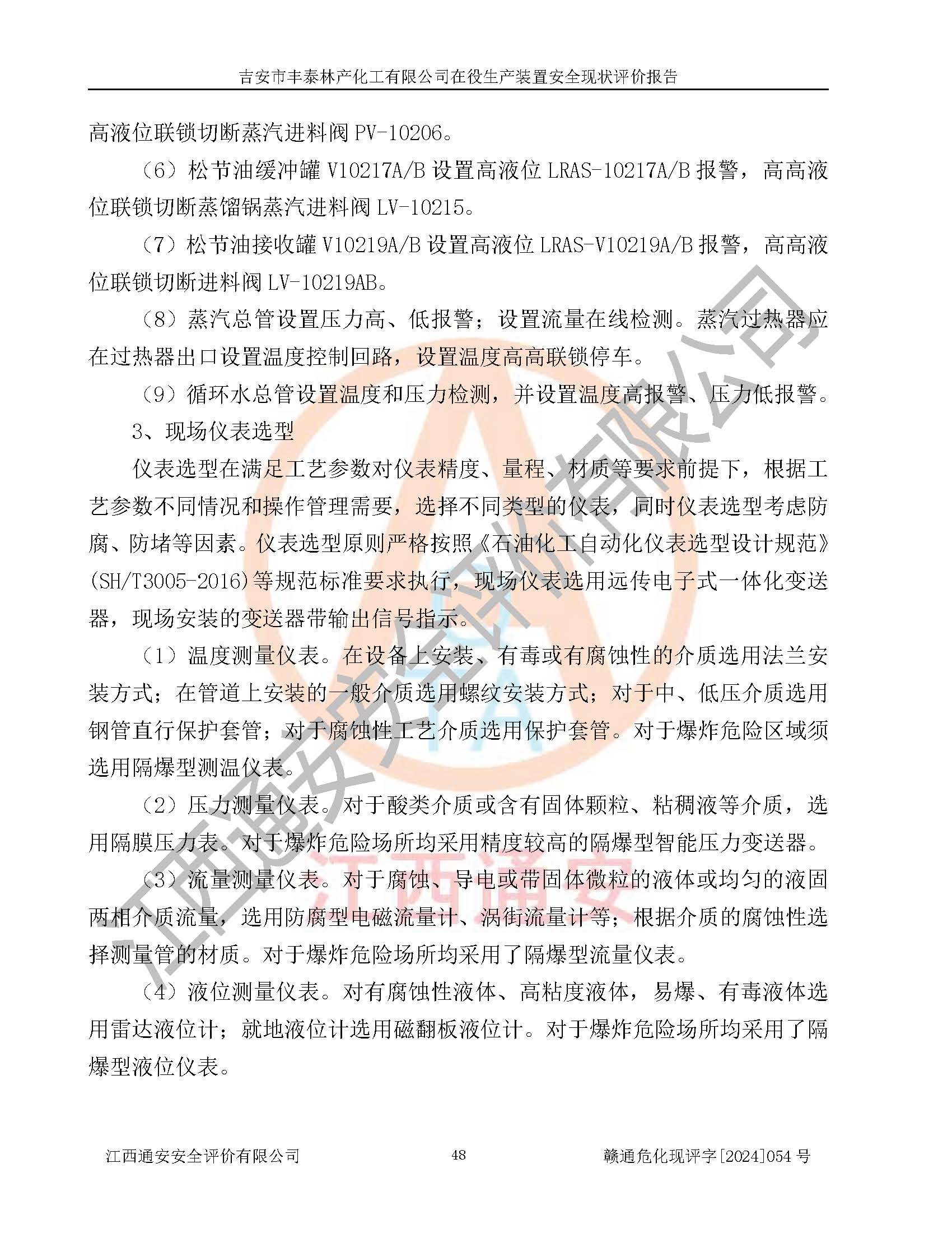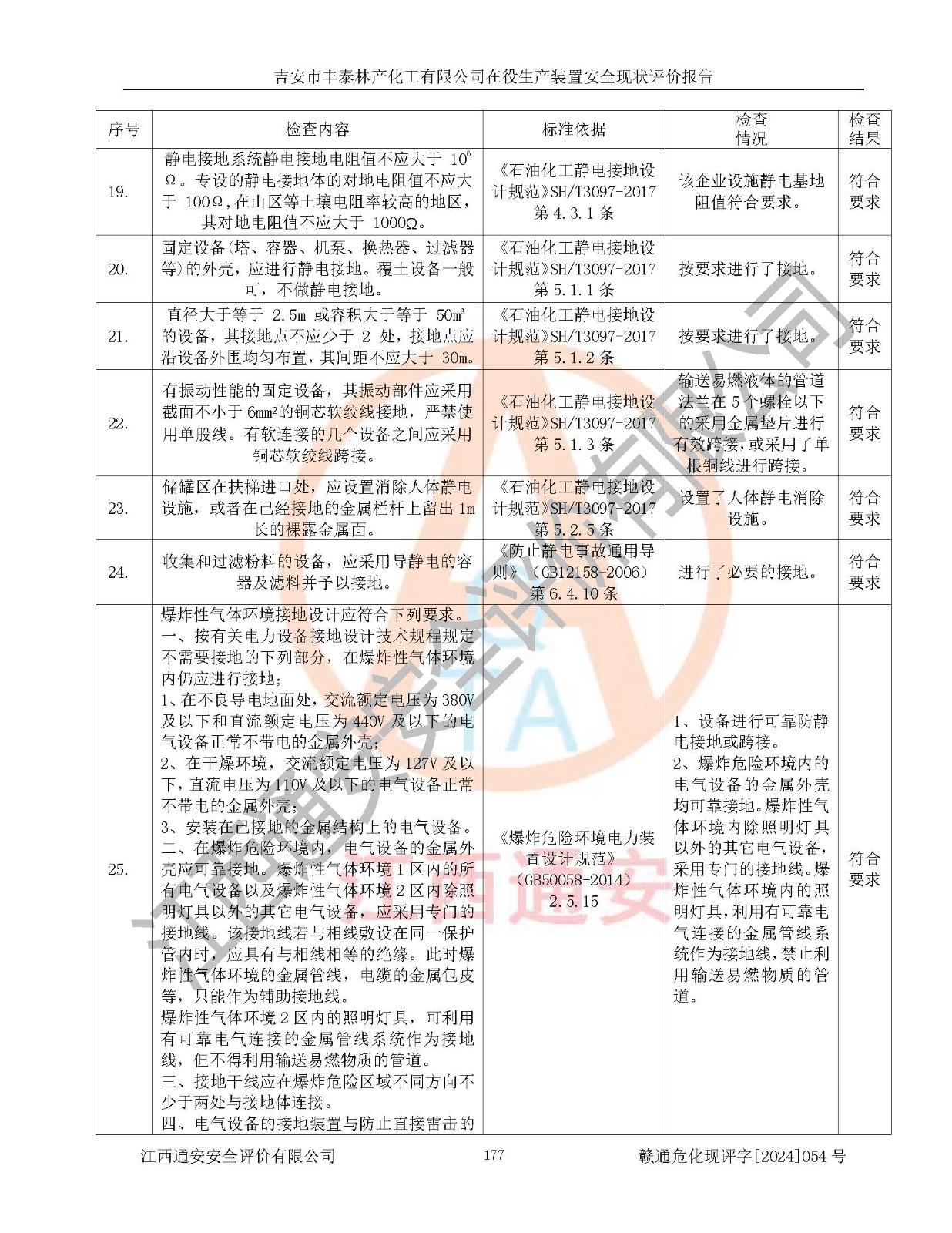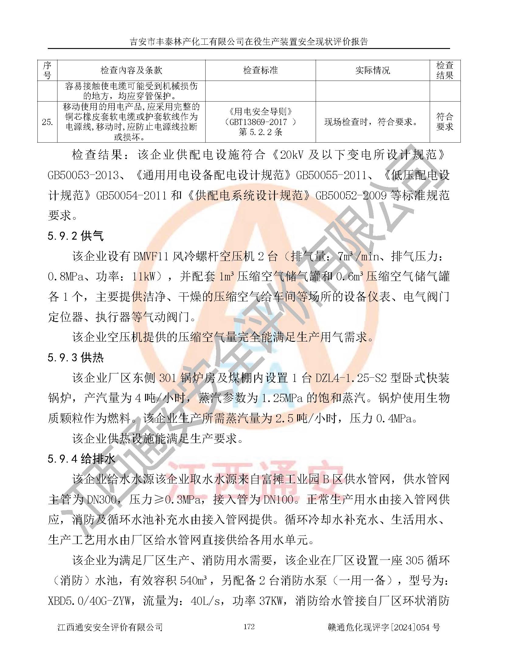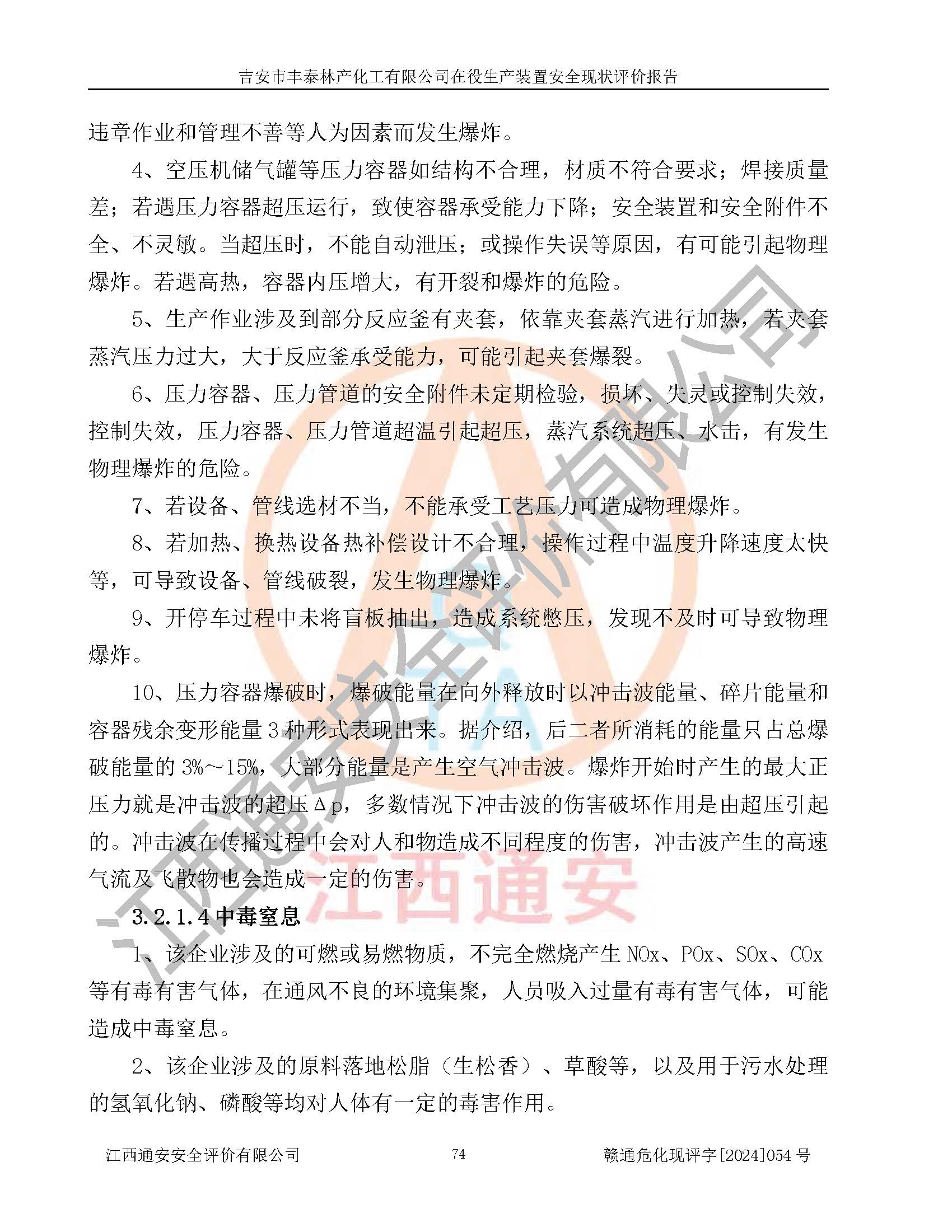 评价结论 | 评价结论:本报告认为,吉安市丰泰林产化工有限公司在役生产装置现场情况与设计图纸一致,有关从业人员资格符合《江西省危险化学品安全专项整治三年行动实施方案》要求,安全设施及安全管理符合**及有关部门关于安全生产法律法规、标准的要求,安全设施正常投用且运行**,安全风险是可以控制的,其风险程度是可以接受的,安全现状符合安全生产条件,能够满足安全生产的要求。 | |||