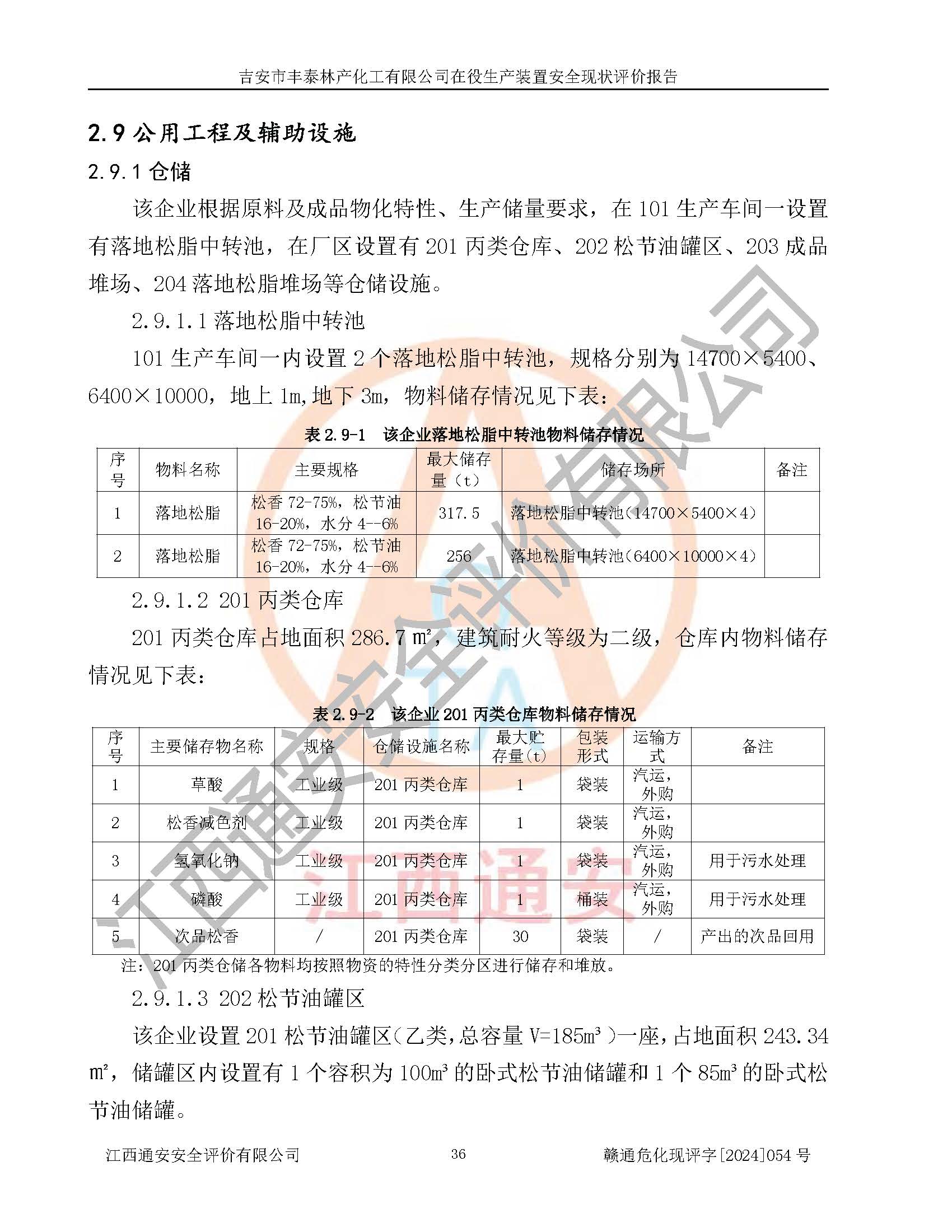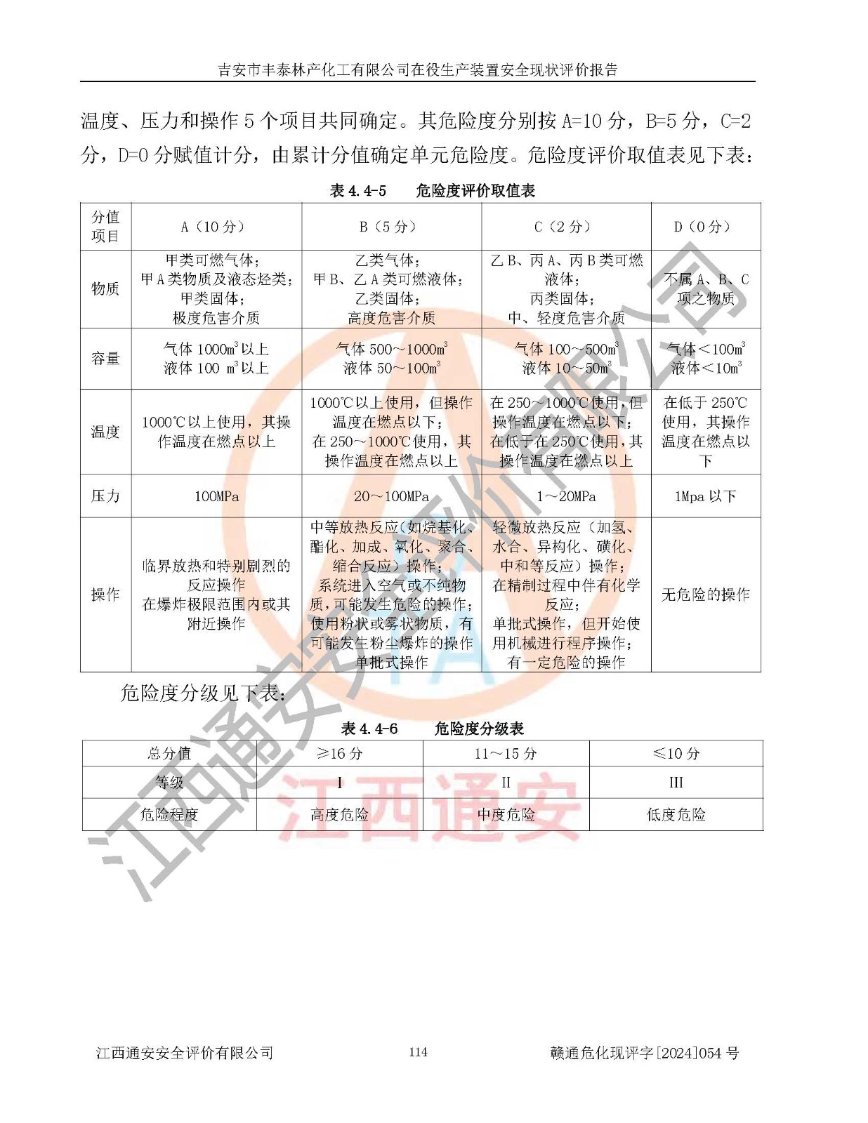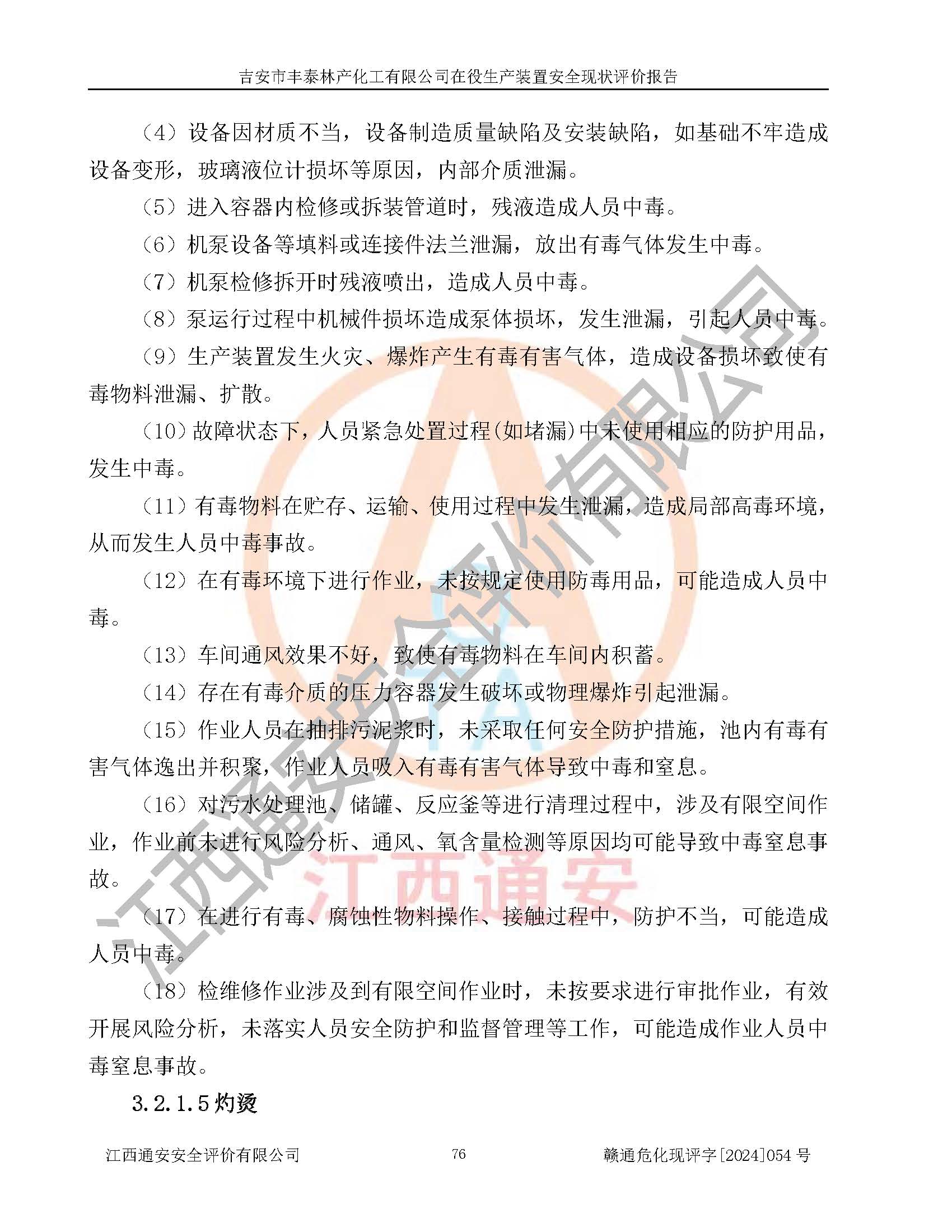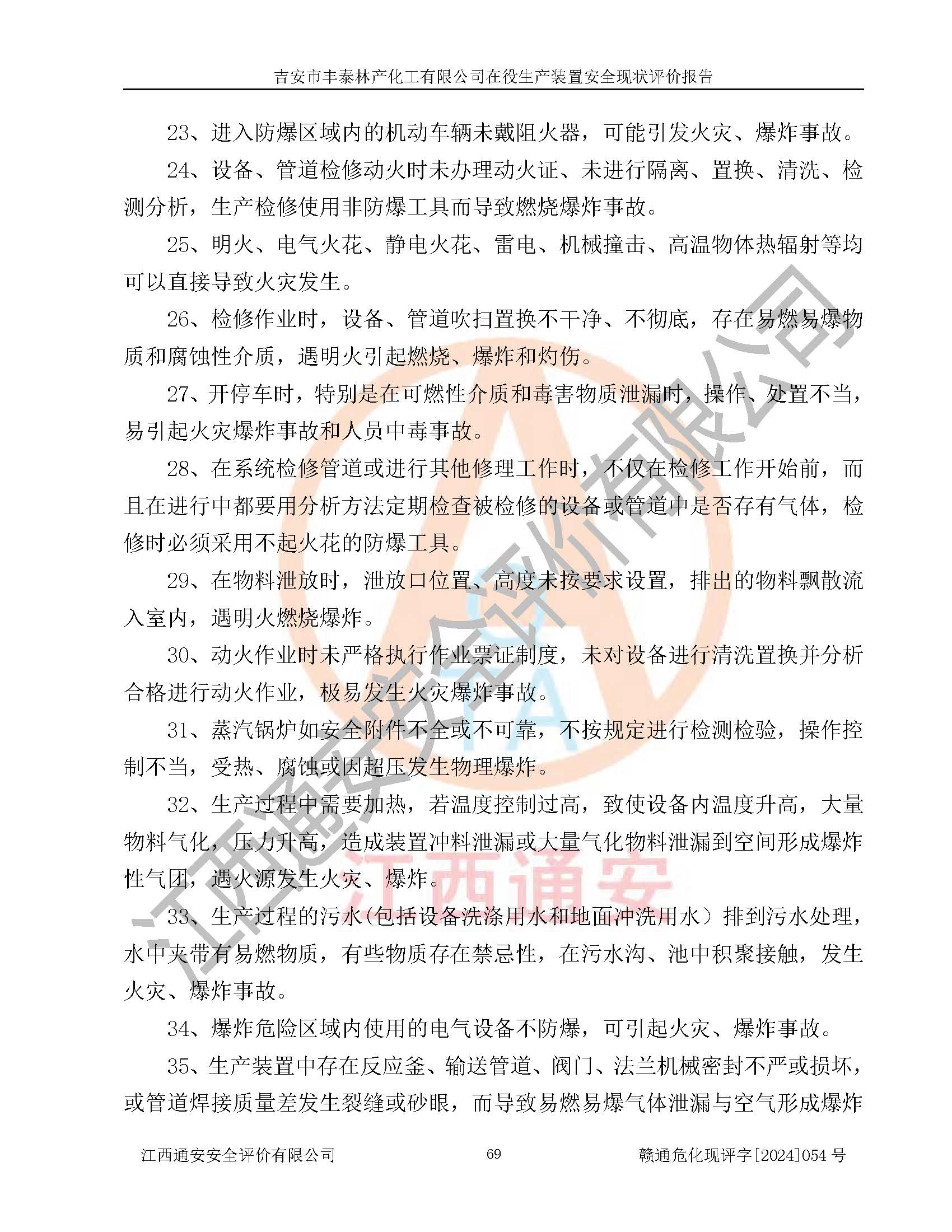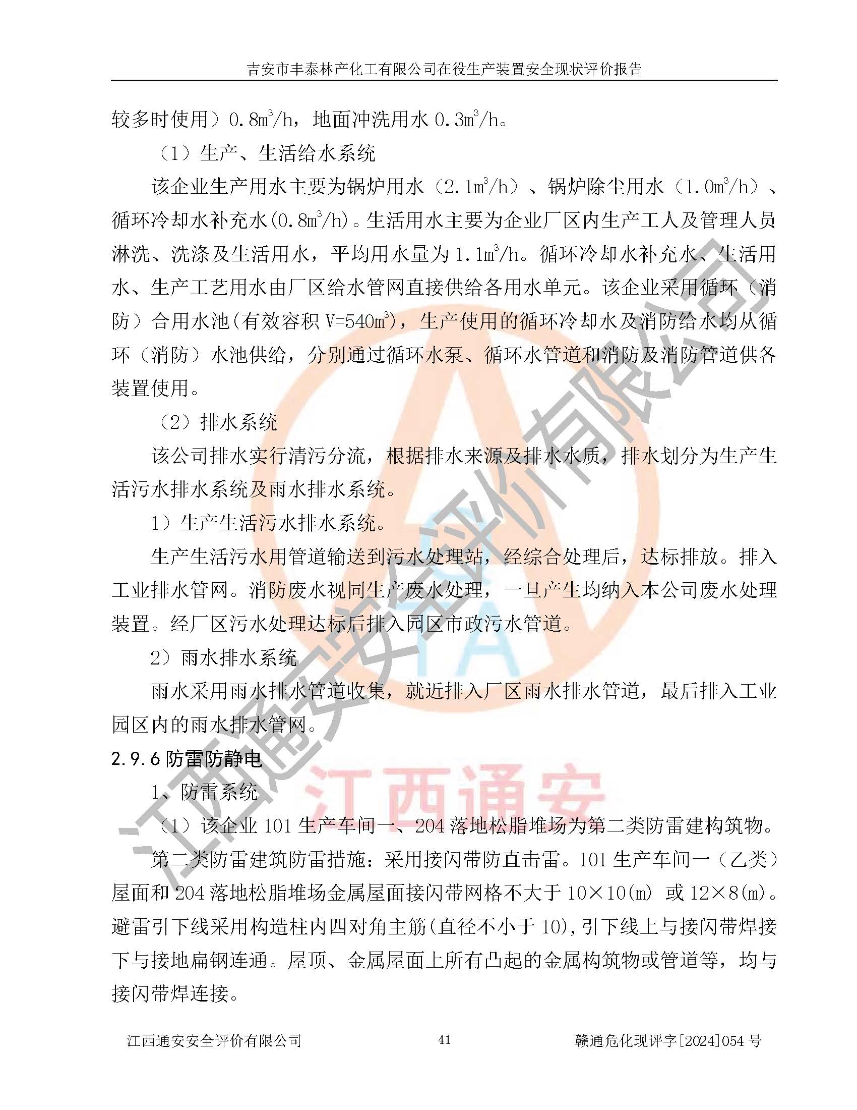 评价结论 | 评价结论:本报告认为,吉安市丰泰林产化工有限公司在役生产装置现场情况与设计图纸一致,有关从业人员资格符合《江西省危险化学品安全专项整治三年行动实施方案》要求,安全设施及安全管理符合**及有关部门关于安全生产法律法规、标准的要求,安全设施正常投用且运行**,安全风险是可以控制的,其风险程度是可以接受的,安全现状符合安全生产条件,能够满足安全生产的要求。 | |||