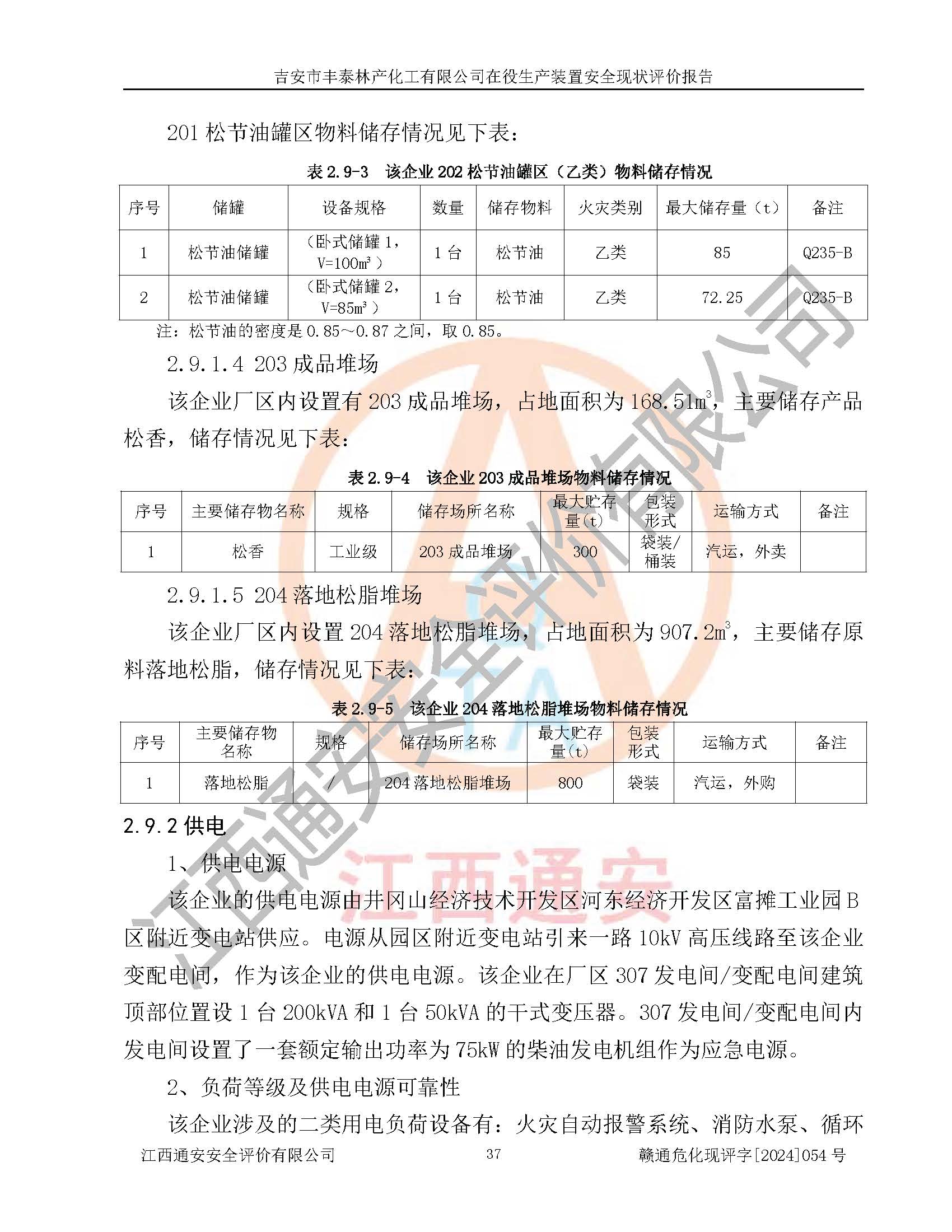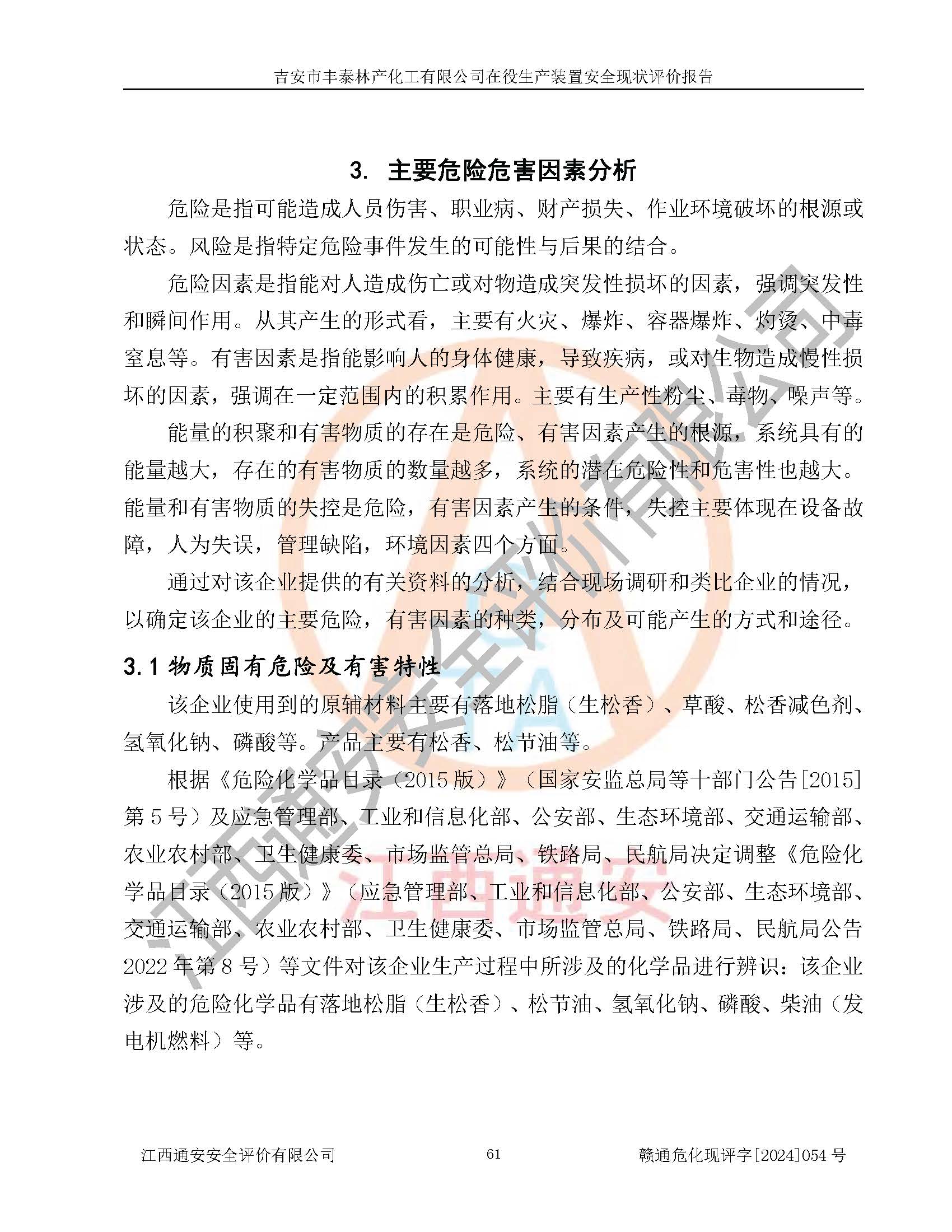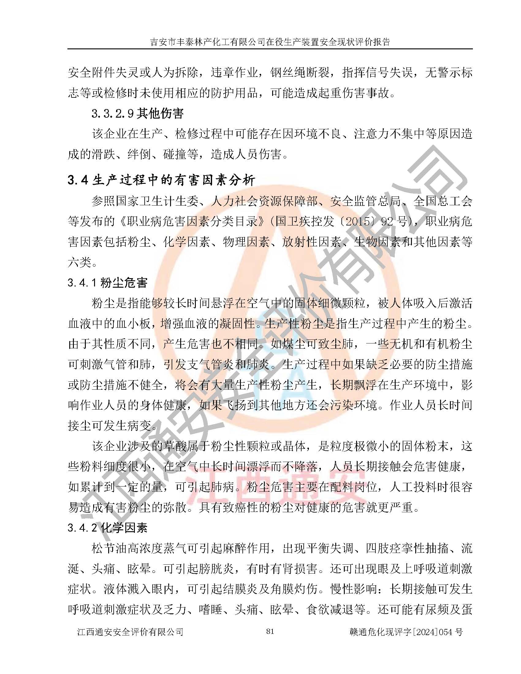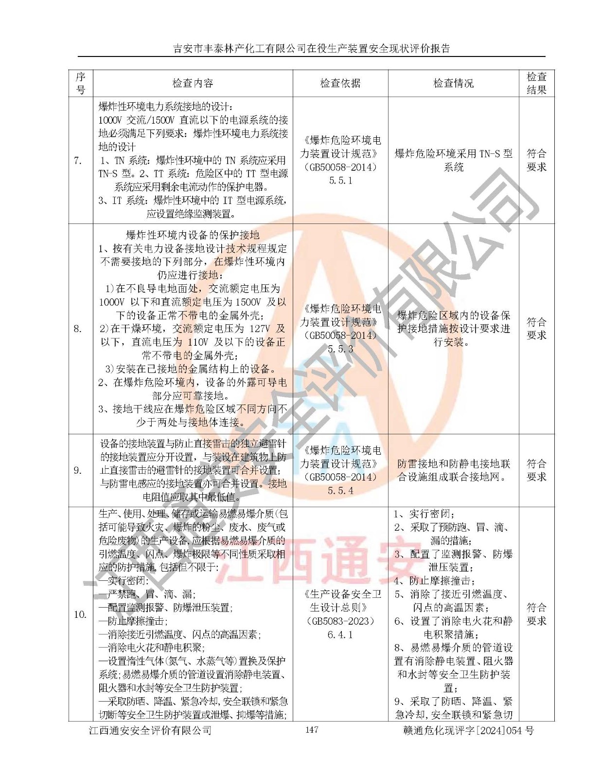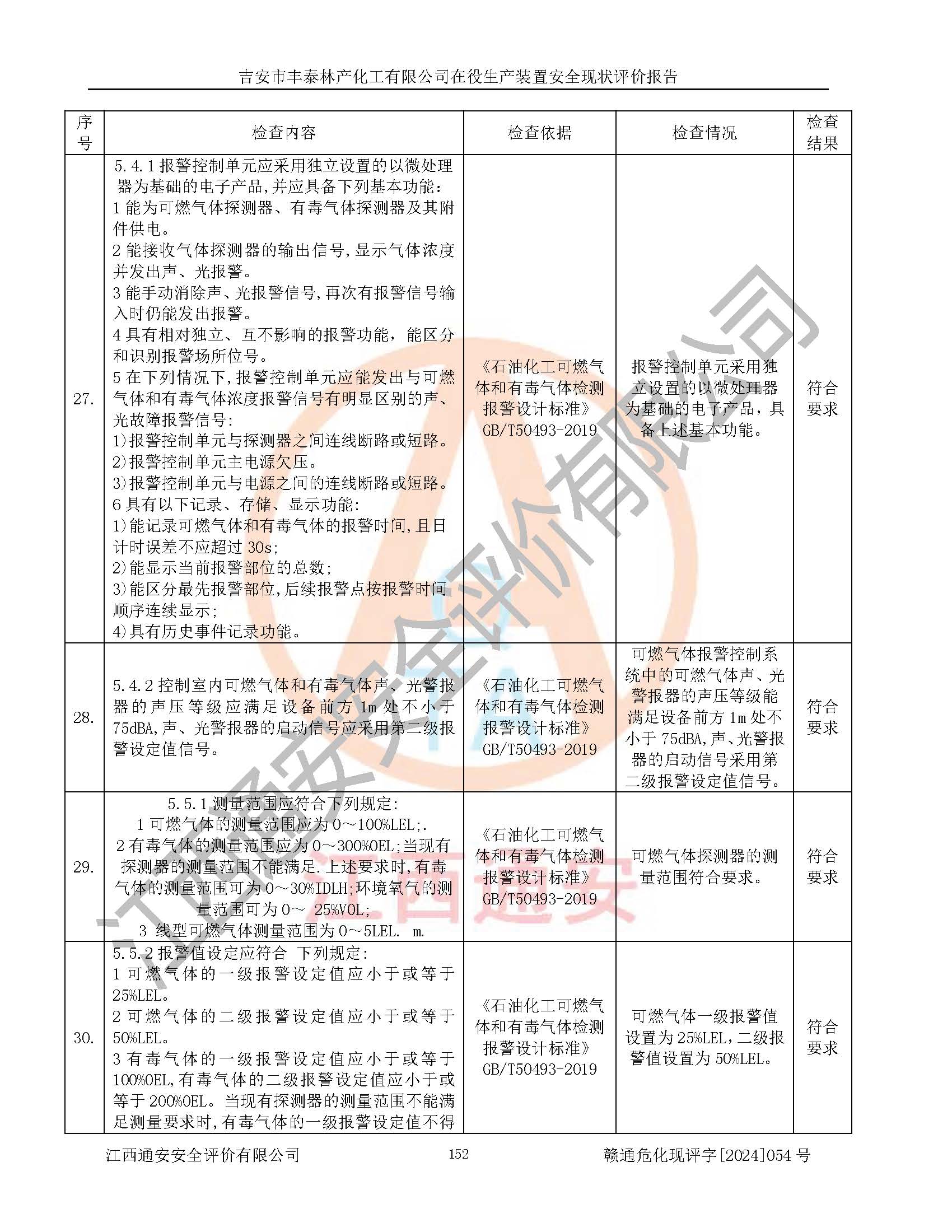 评价结论 | 评价结论:本报告认为,吉安市丰泰林产化工有限公司在役生产装置现场情况与设计图纸一致,有关从业人员资格符合《江西省危险化学品安全专项整治三年行动实施方案》要求,安全设施及安全管理符合**及有关部门关于安全生产法律法规、标准的要求,安全设施正常投用且运行**,安全风险是可以控制的,其风险程度是可以接受的,安全现状符合安全生产条件,能够满足安全生产的要求。 | |||