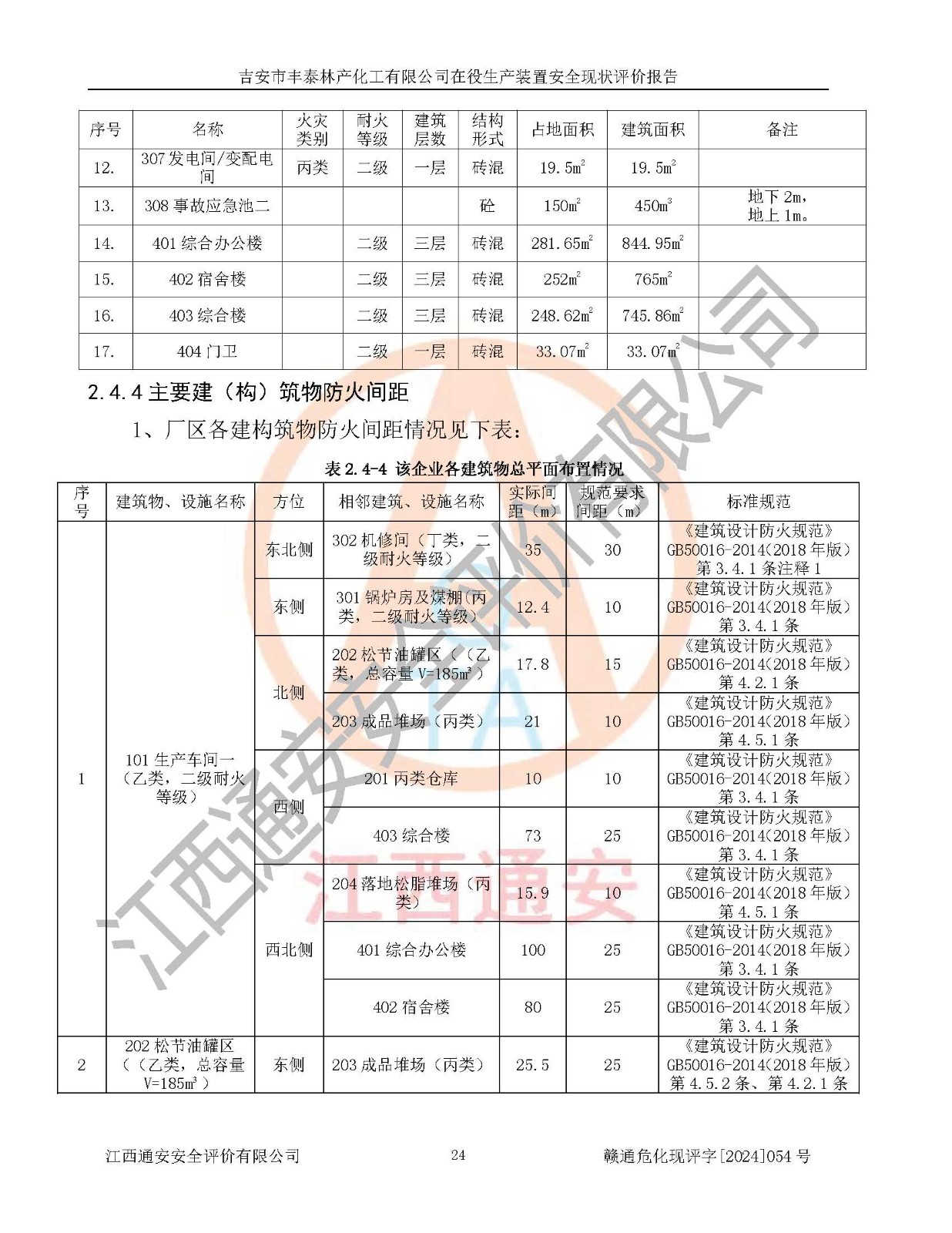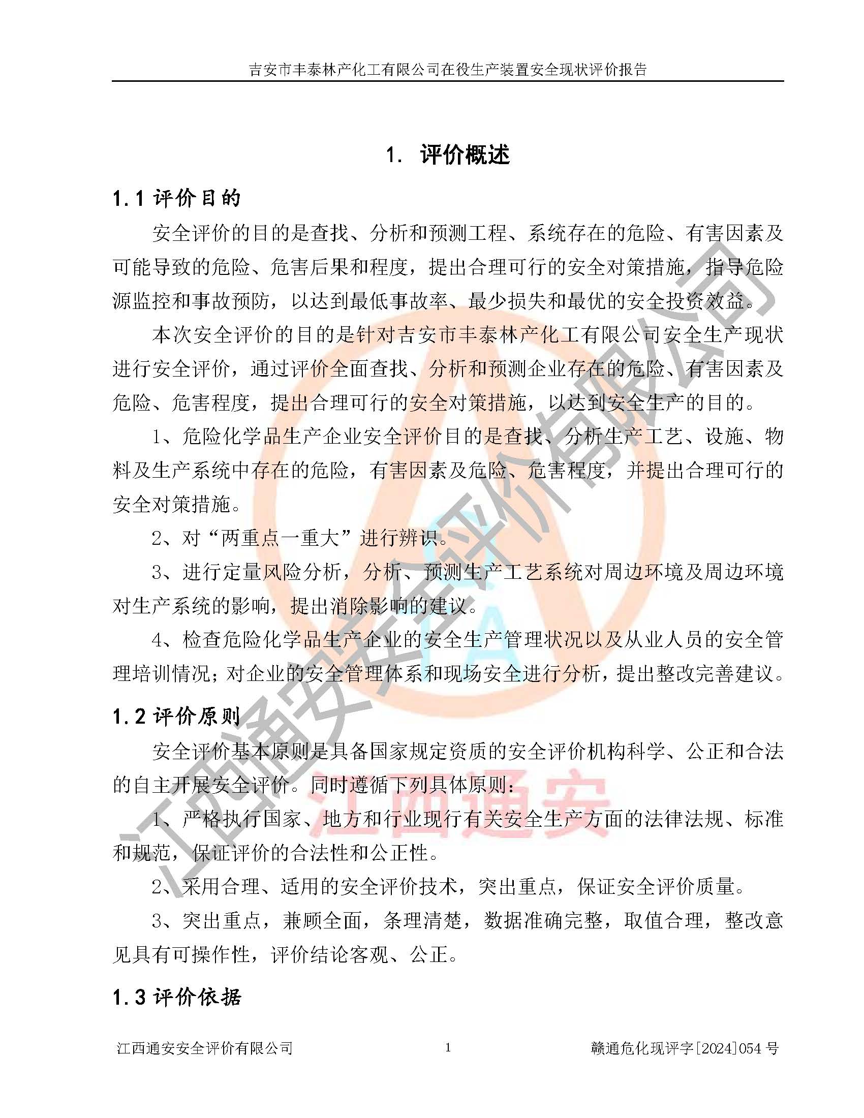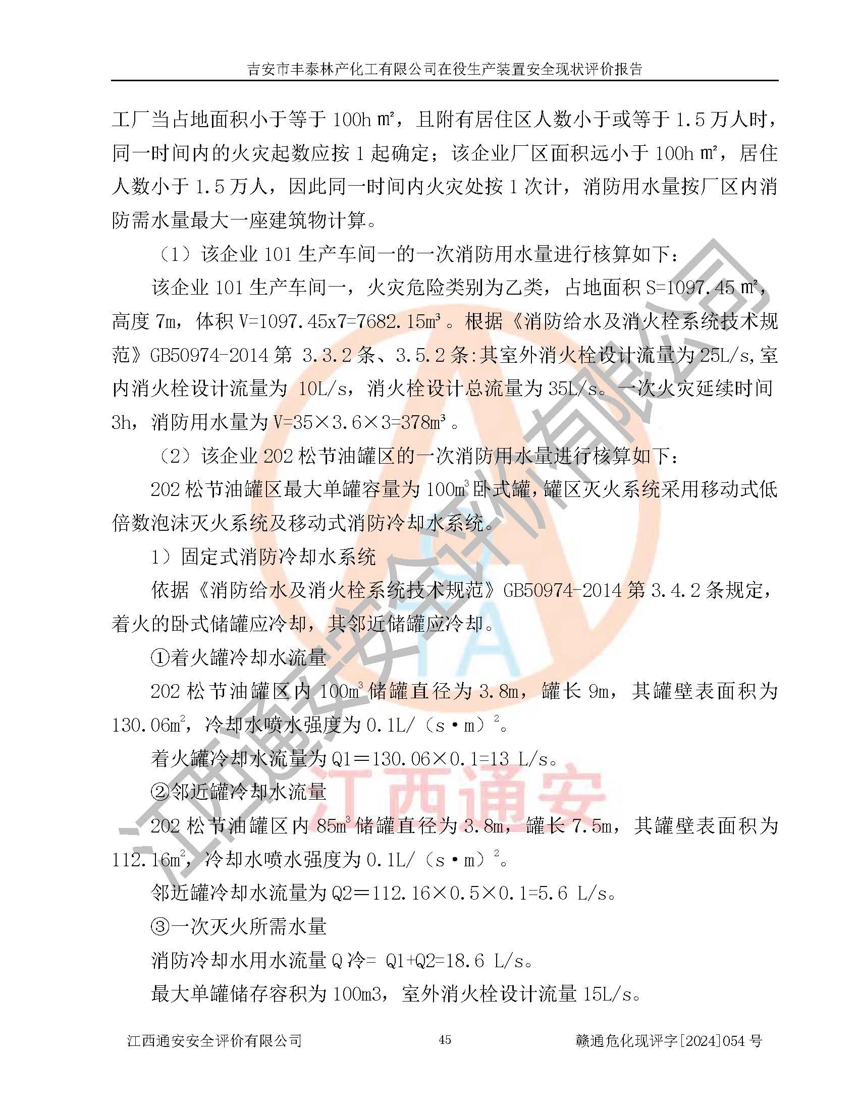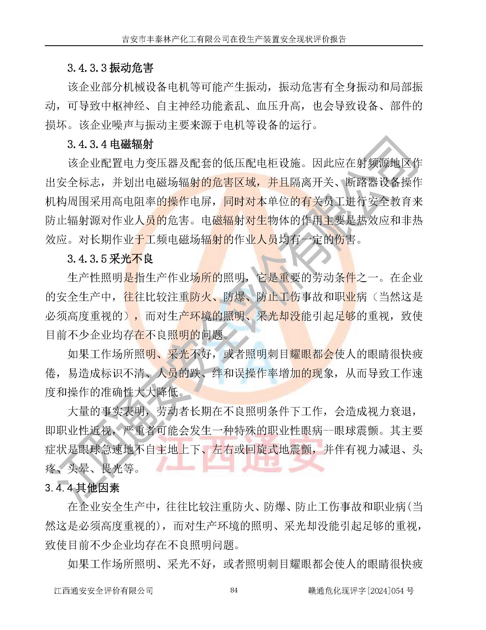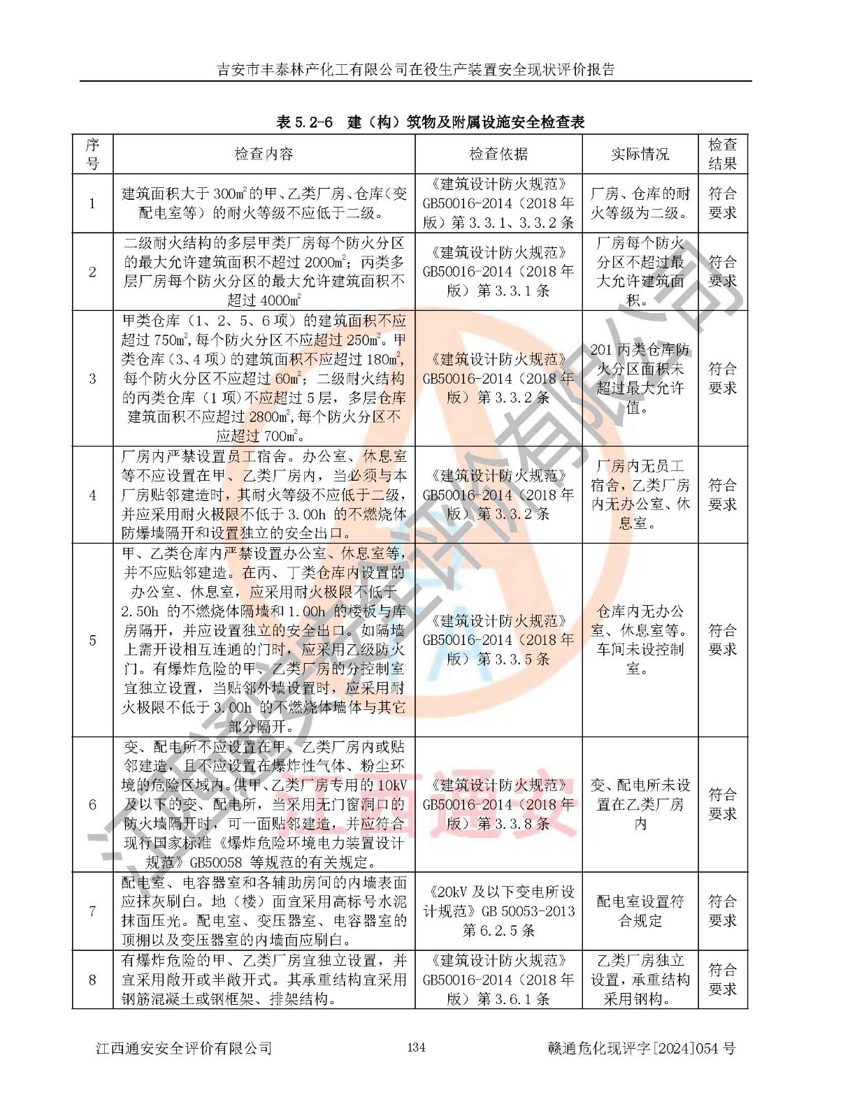 评价结论 | 评价结论:本报告认为,吉安市丰泰林产化工有限公司在役生产装置现场情况与设计图纸一致,有关从业人员资格符合《江西省危险化学品安全专项整治三年行动实施方案》要求,安全设施及安全管理符合**及有关部门关于安全生产法律法规、标准的要求,安全设施正常投用且运行**,安全风险是可以控制的,其风险程度是可以接受的,安全现状符合安全生产条件,能够满足安全生产的要求。 | |||