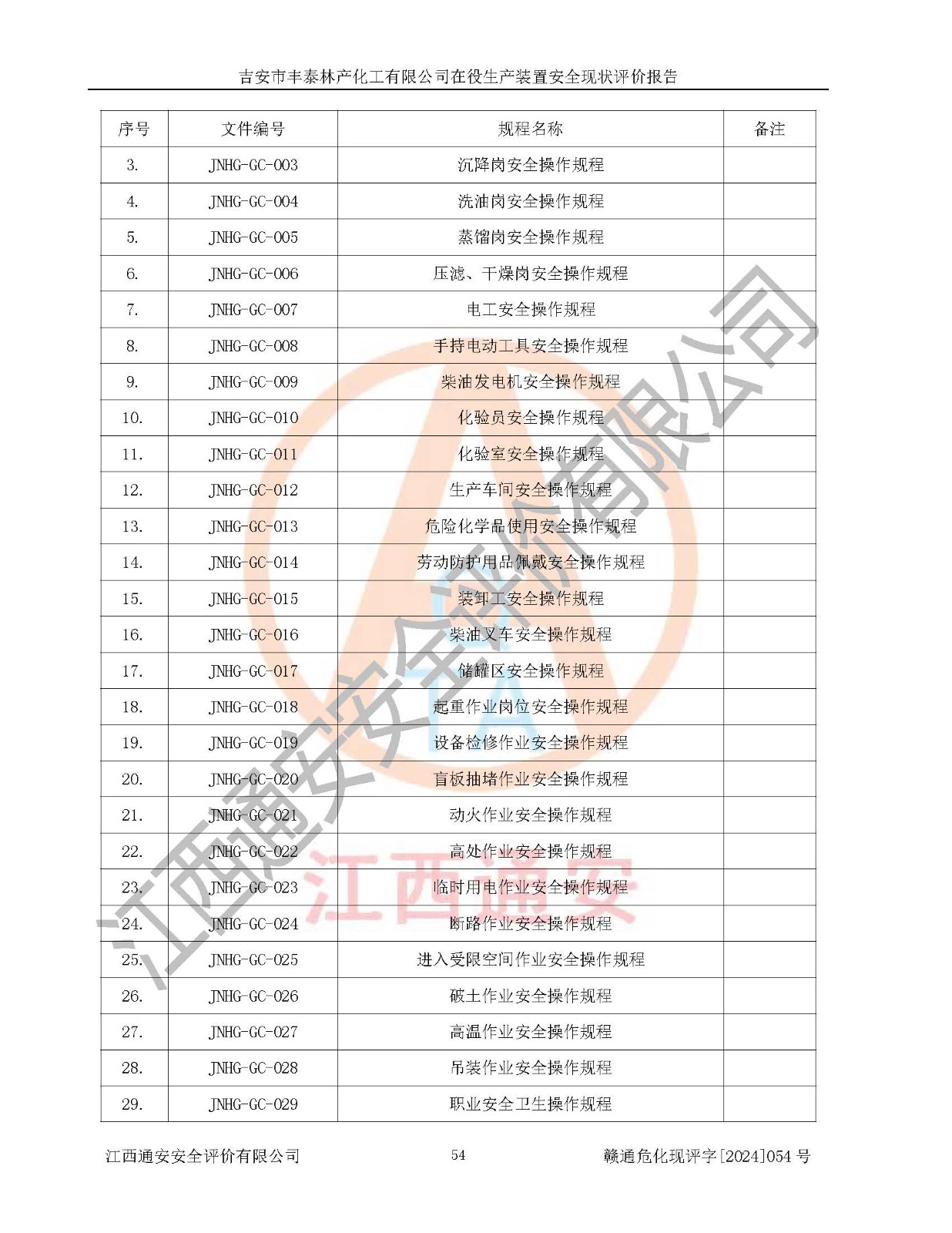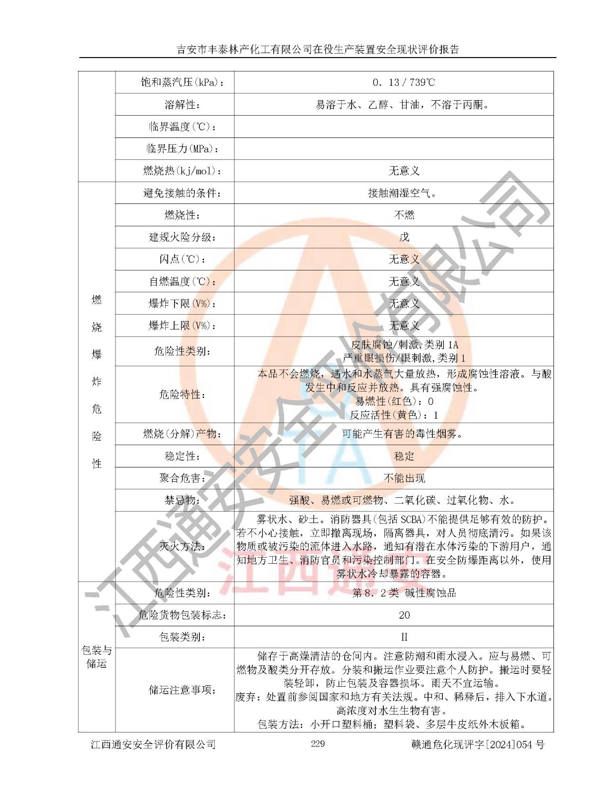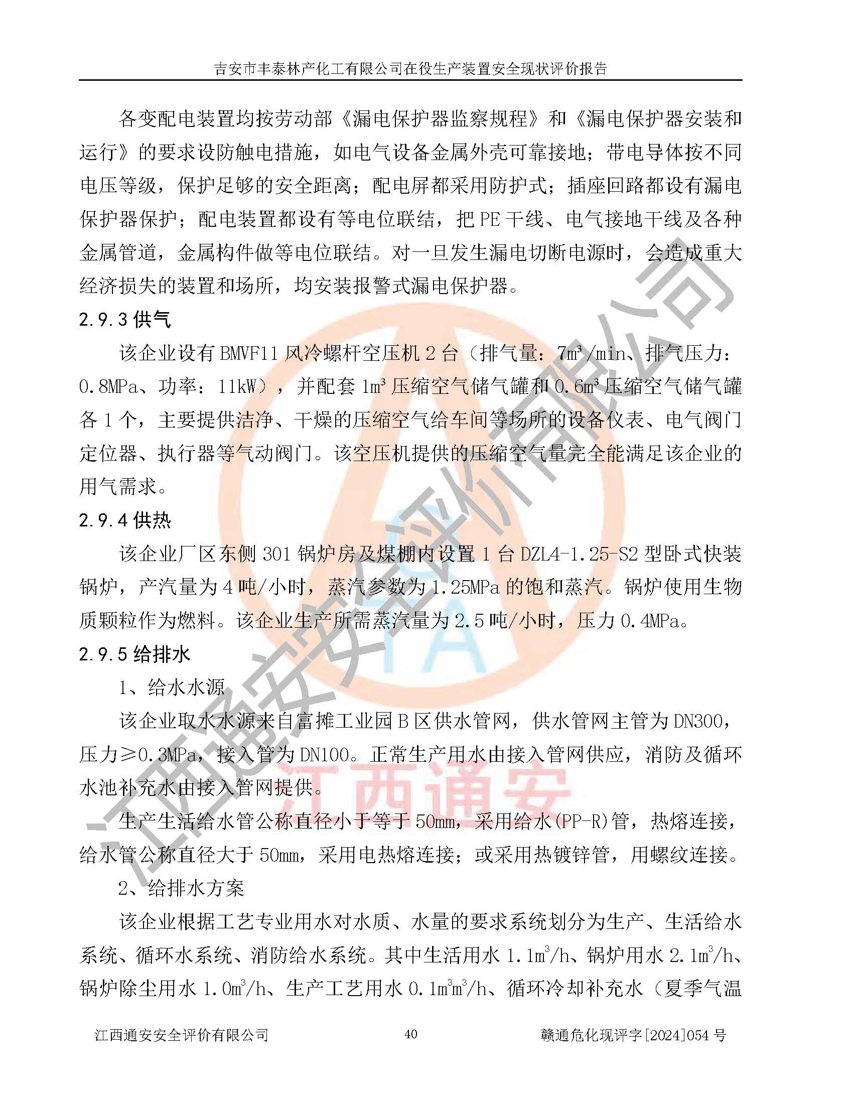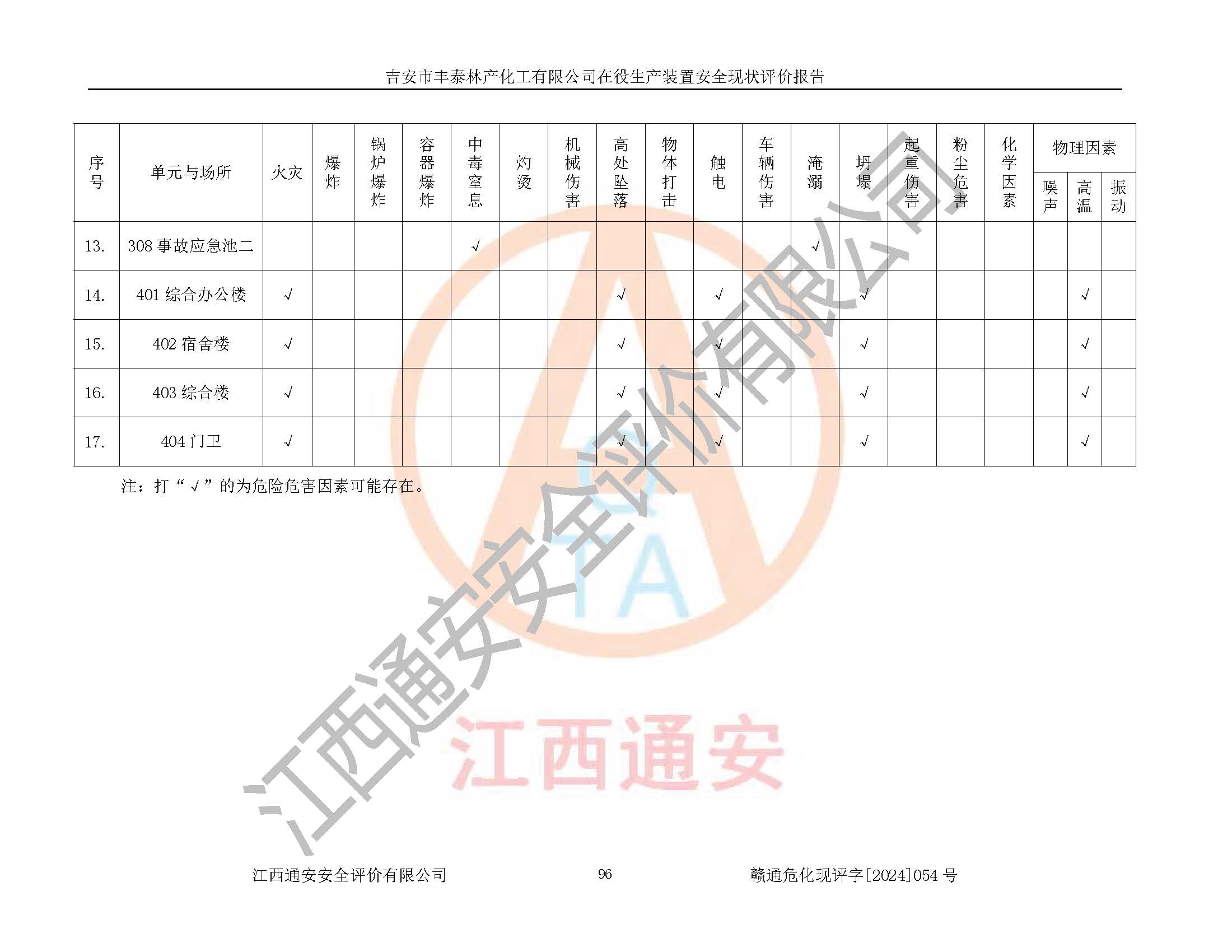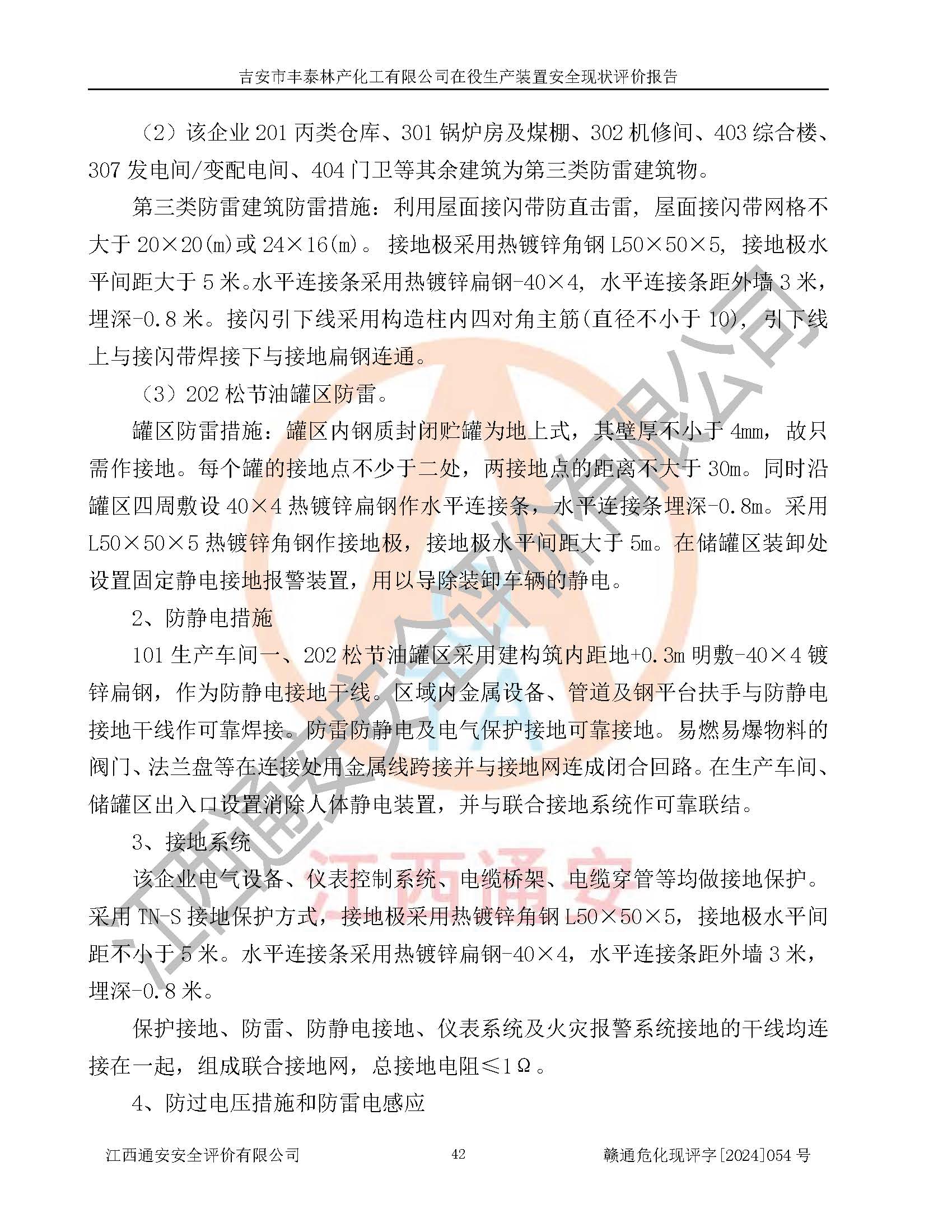 评价结论 | 评价结论:本报告认为,吉安市丰泰林产化工有限公司在役生产装置现场情况与设计图纸一致,有关从业人员资格符合《江西省危险化学品安全专项整治三年行动实施方案》要求,安全设施及安全管理符合**及有关部门关于安全生产法律法规、标准的要求,安全设施正常投用且运行**,安全风险是可以控制的,其风险程度是可以接受的,安全现状符合安全生产条件,能够满足安全生产的要求。 | |||