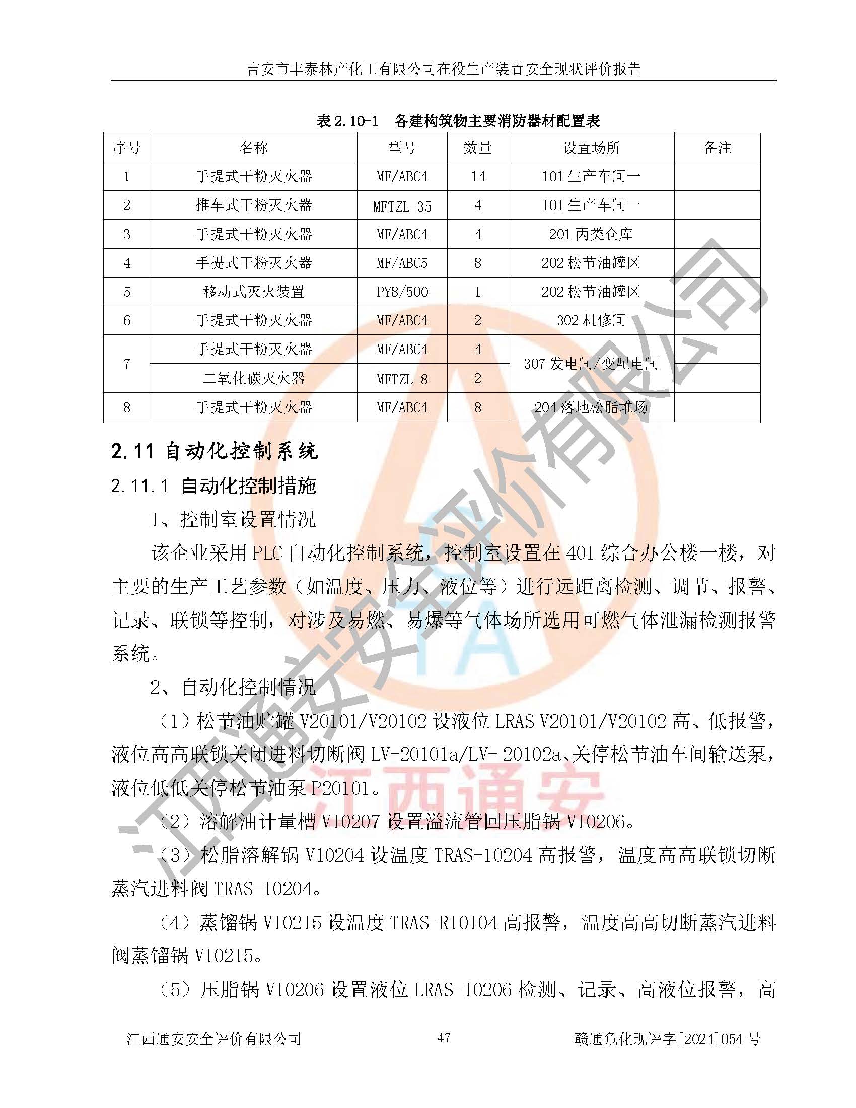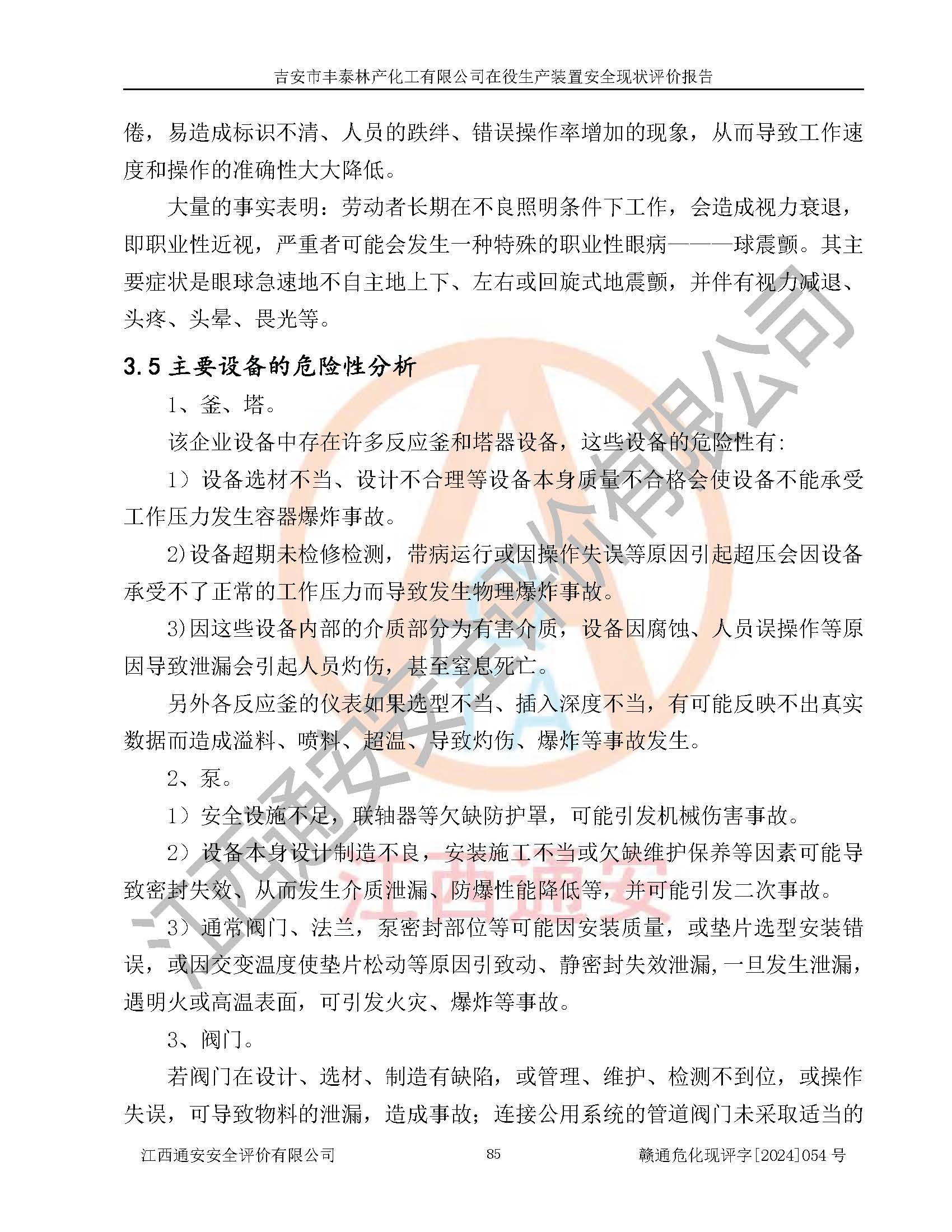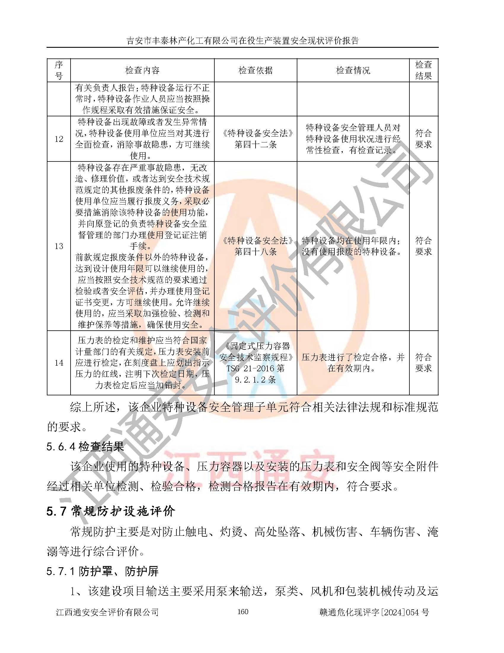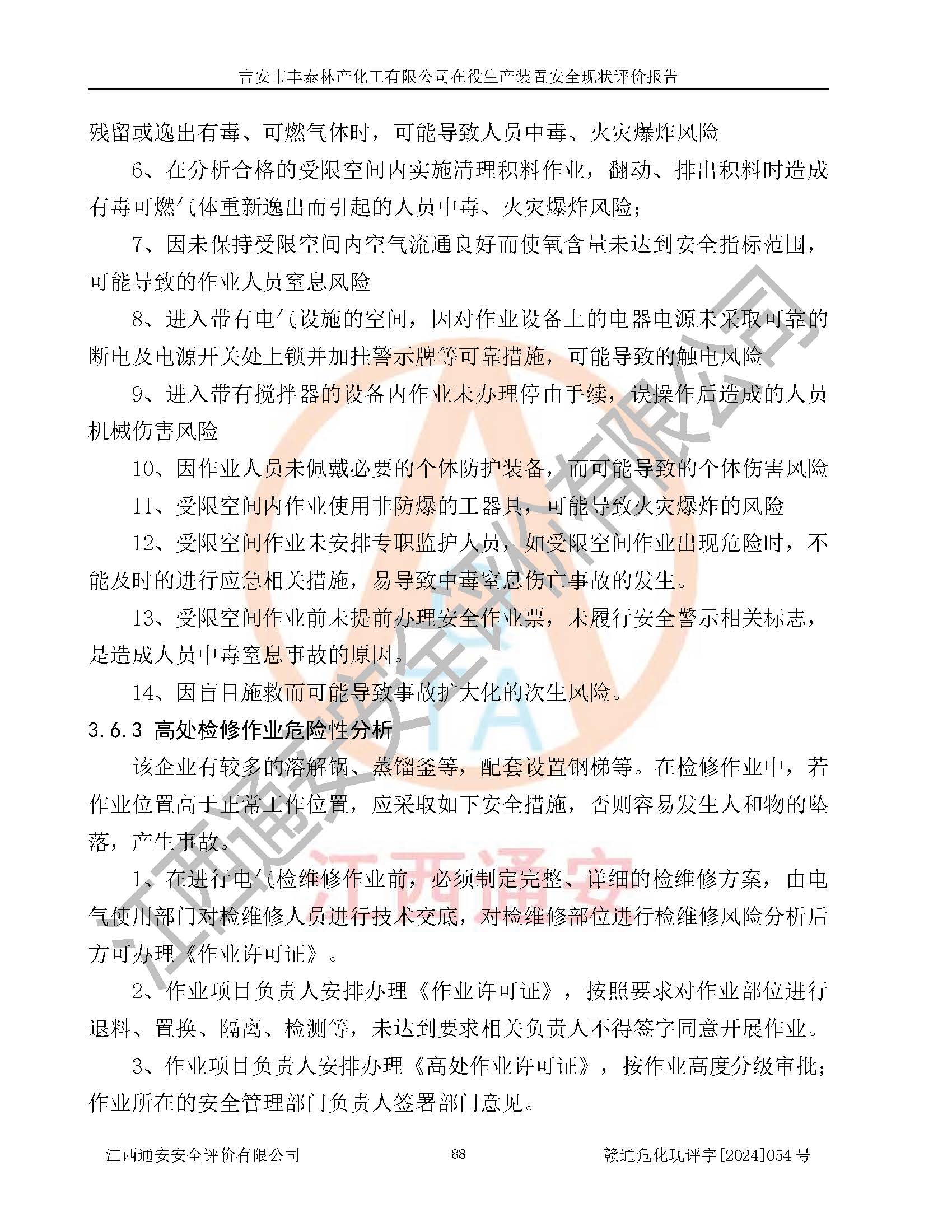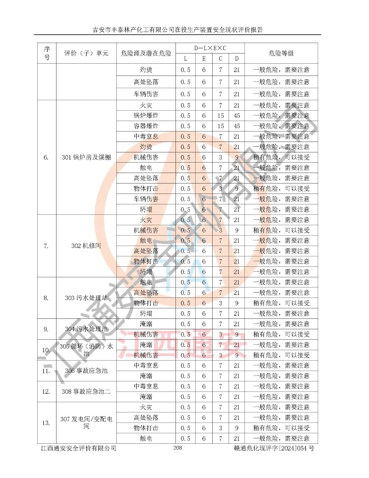 评价结论 | 评价结论:本报告认为,吉安市丰泰林产化工有限公司在役生产装置现场情况与设计图纸一致,有关从业人员资格符合《江西省危险化学品安全专项整治三年行动实施方案》要求,安全设施及安全管理符合**及有关部门关于安全生产法律法规、标准的要求,安全设施正常投用且运行**,安全风险是可以控制的,其风险程度是可以接受的,安全现状符合安全生产条件,能够满足安全生产的要求。 | |||