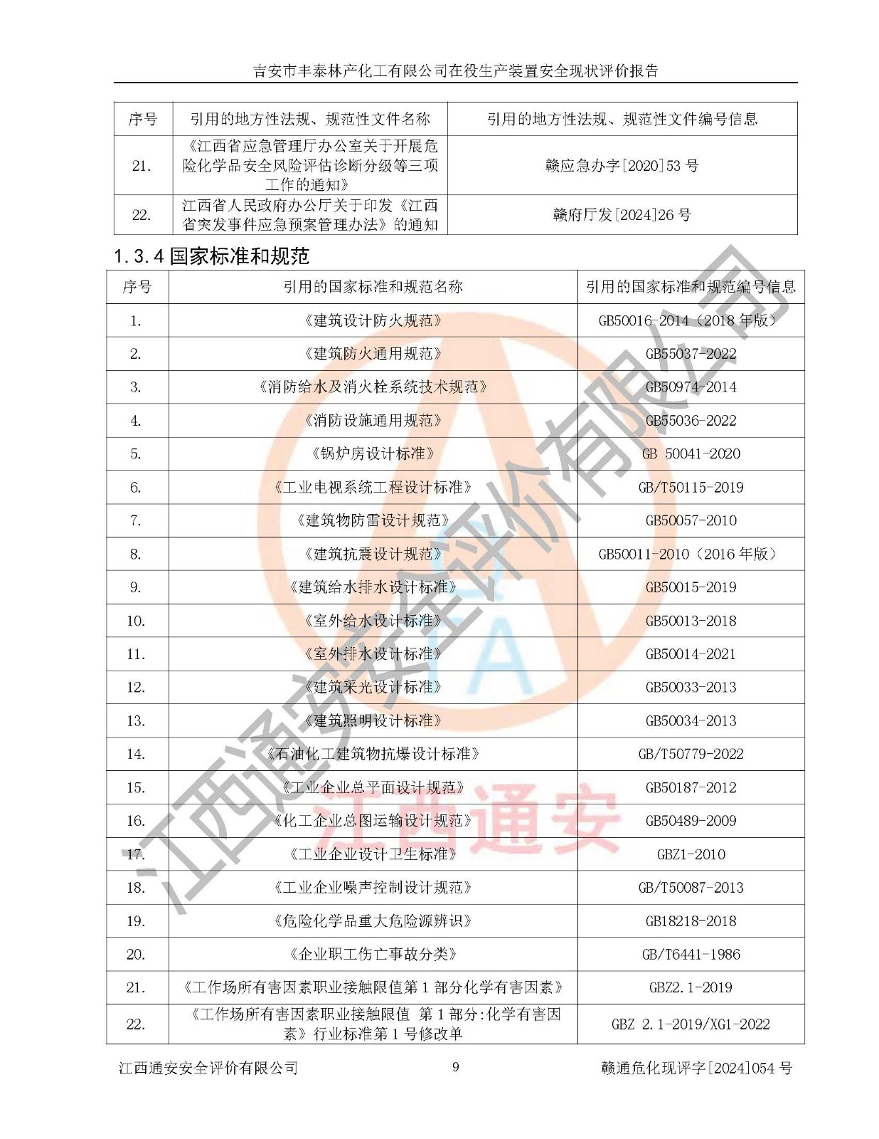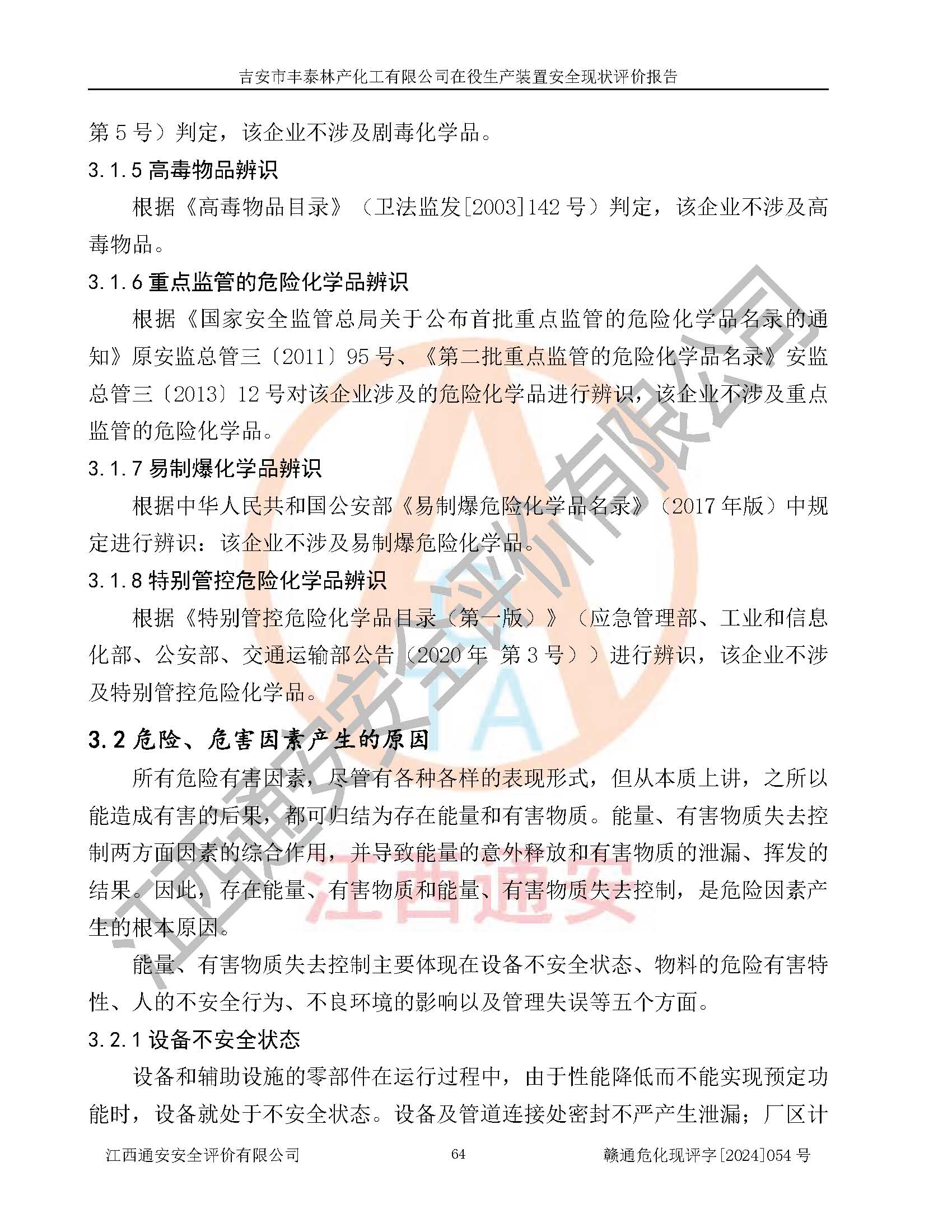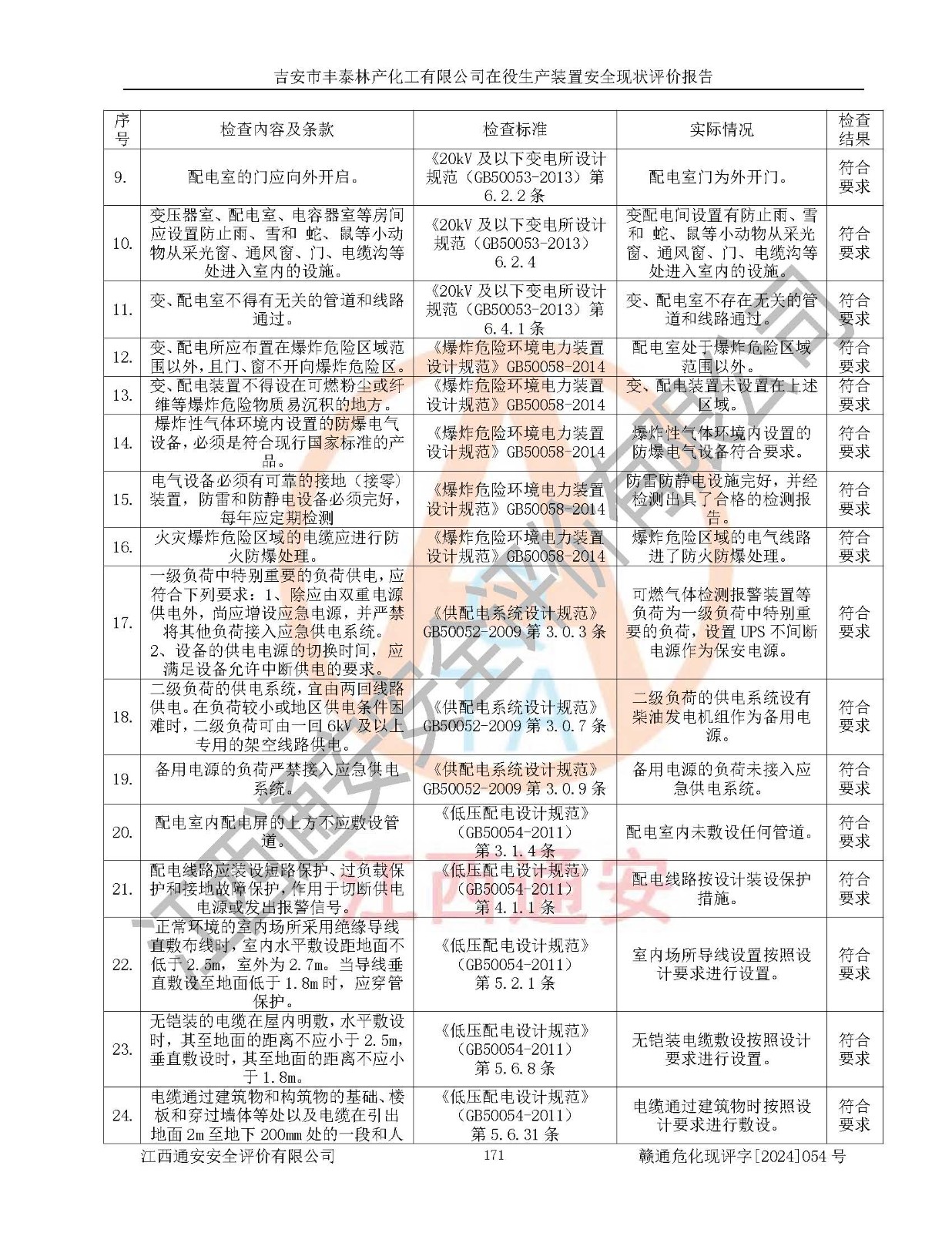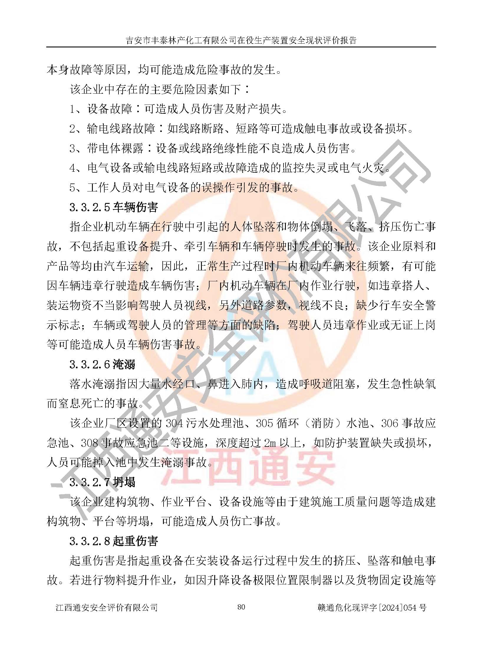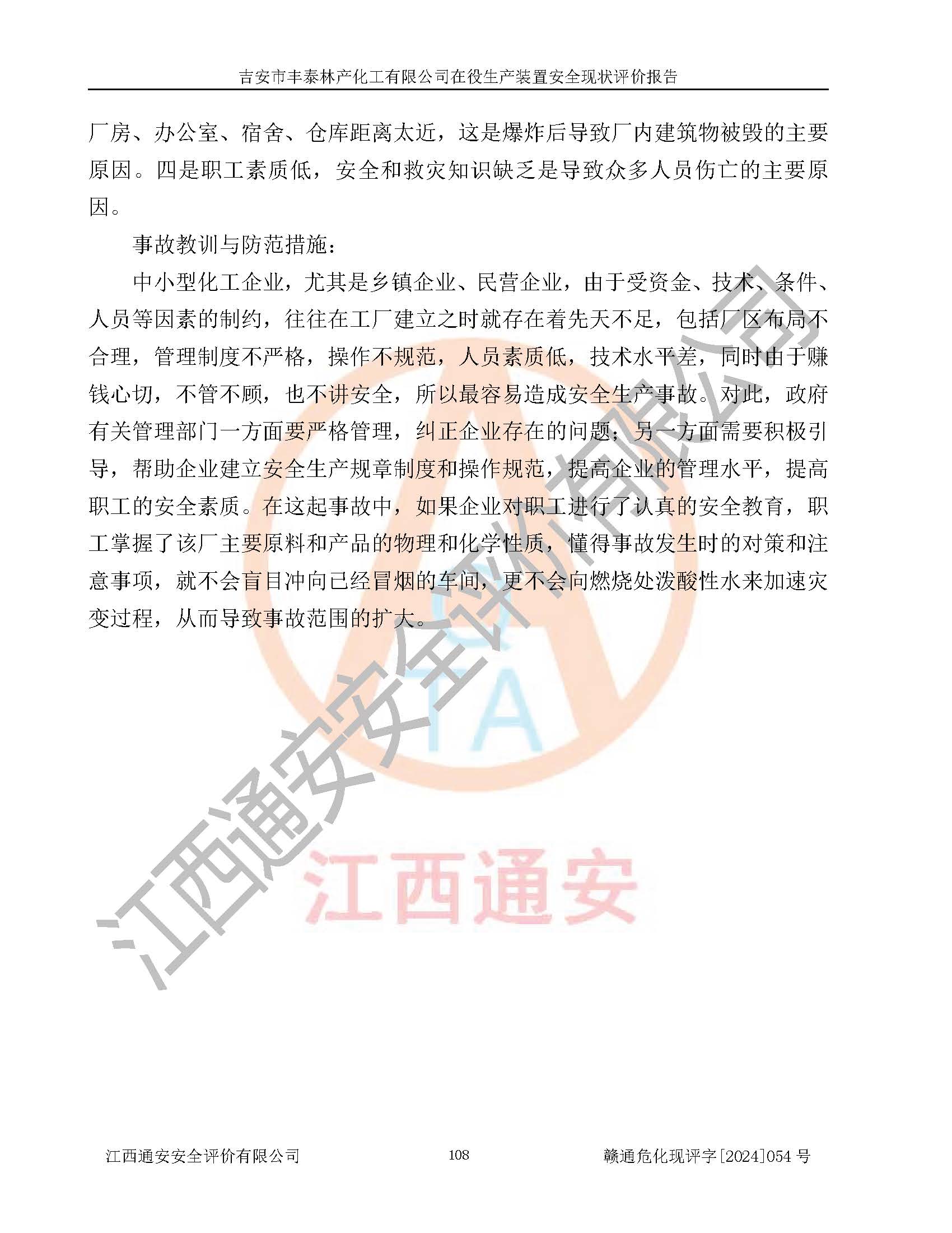 评价结论 | 评价结论:本报告认为,吉安市丰泰林产化工有限公司在役生产装置现场情况与设计图纸一致,有关从业人员资格符合《江西省危险化学品安全专项整治三年行动实施方案》要求,安全设施及安全管理符合**及有关部门关于安全生产法律法规、标准的要求,安全设施正常投用且运行**,安全风险是可以控制的,其风险程度是可以接受的,安全现状符合安全生产条件,能够满足安全生产的要求。 | |||