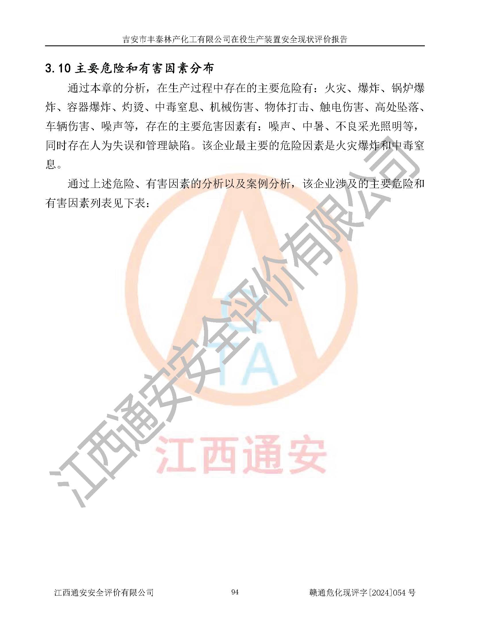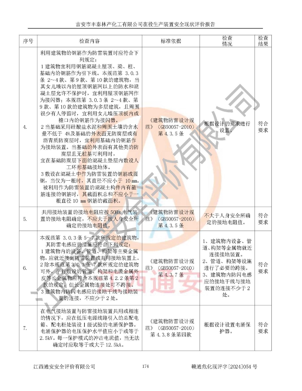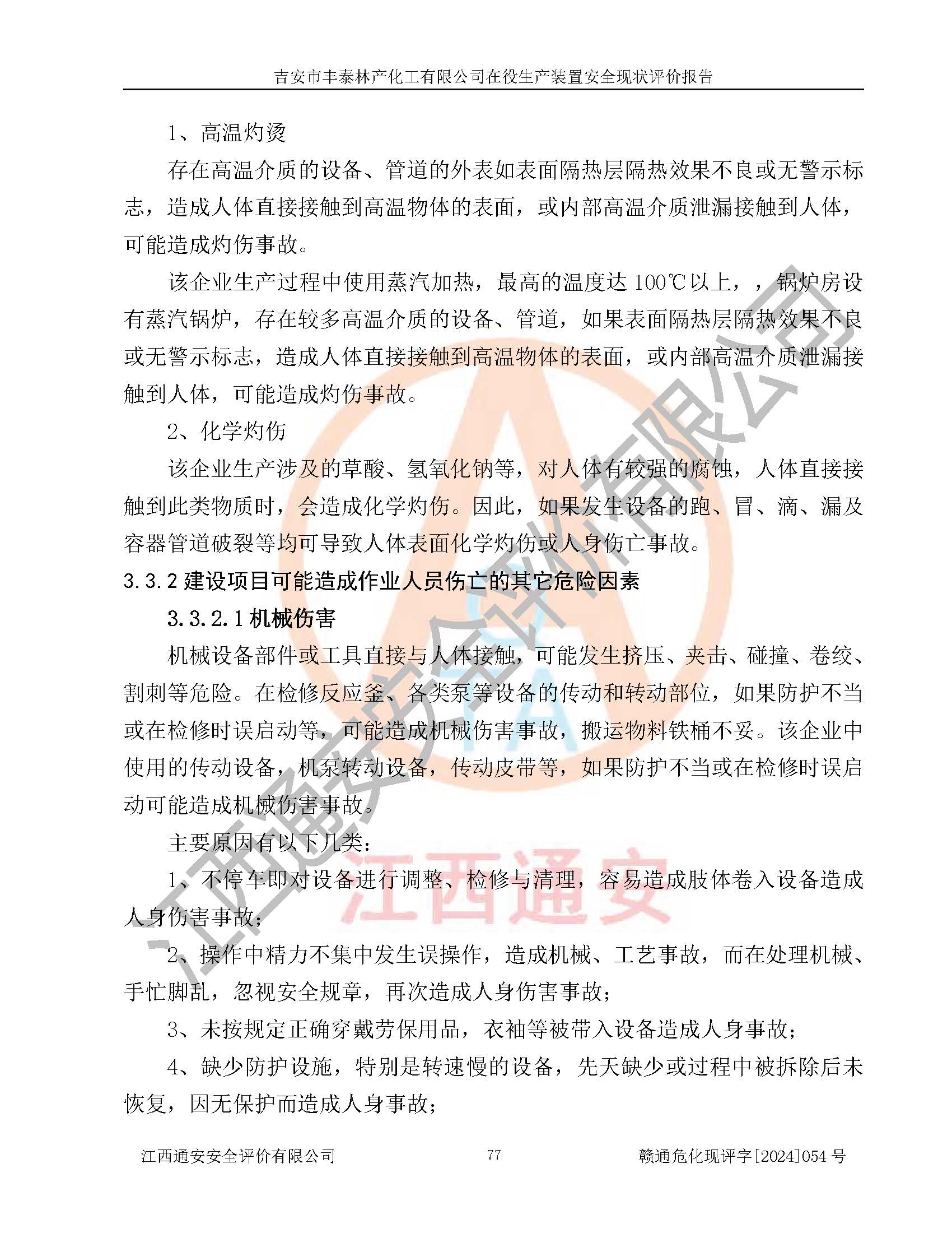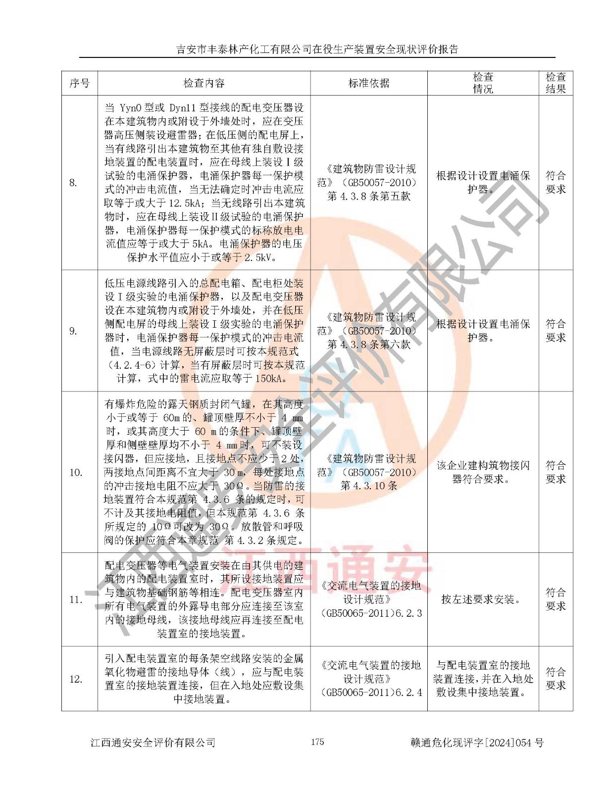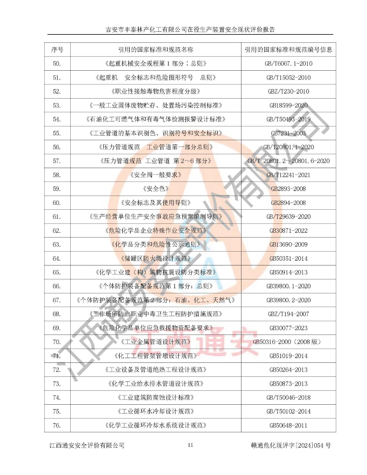 评价结论 | 评价结论:本报告认为,吉安市丰泰林产化工有限公司在役生产装置现场情况与设计图纸一致,有关从业人员资格符合《江西省危险化学品安全专项整治三年行动实施方案》要求,安全设施及安全管理符合**及有关部门关于安全生产法律法规、标准的要求,安全设施正常投用且运行**,安全风险是可以控制的,其风险程度是可以接受的,安全现状符合安全生产条件,能够满足安全生产的要求。 | |||
