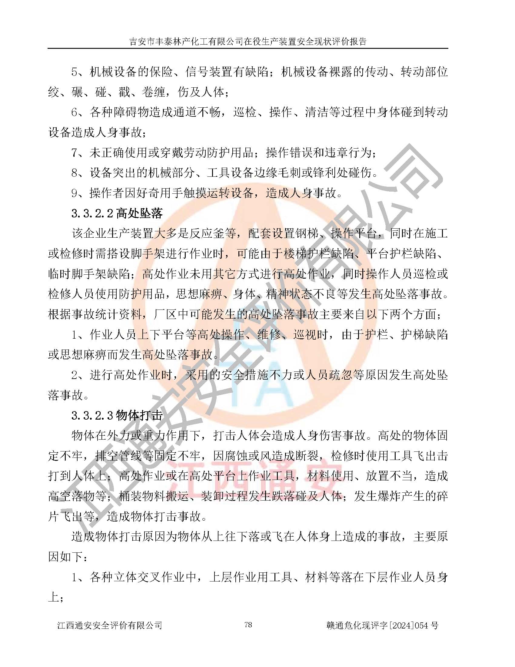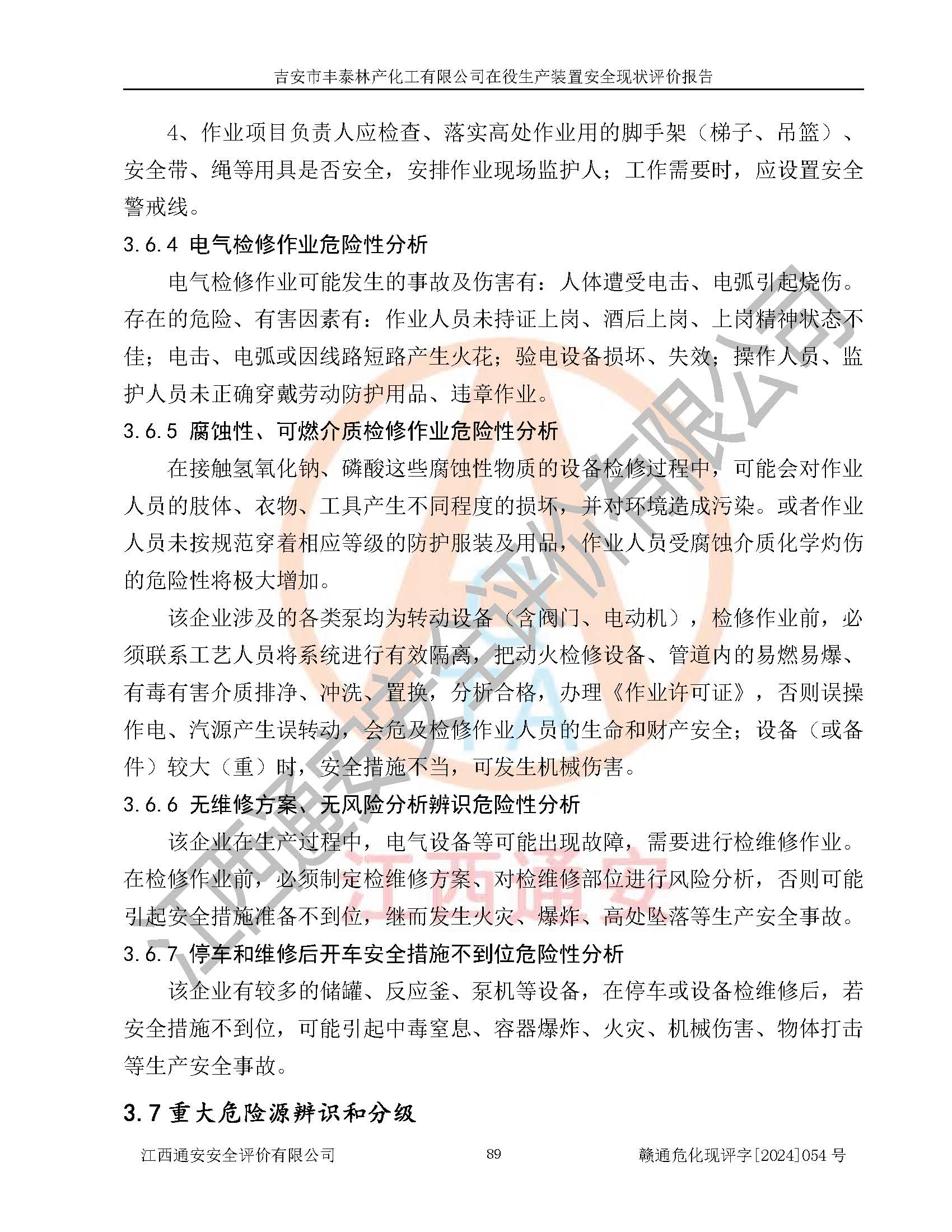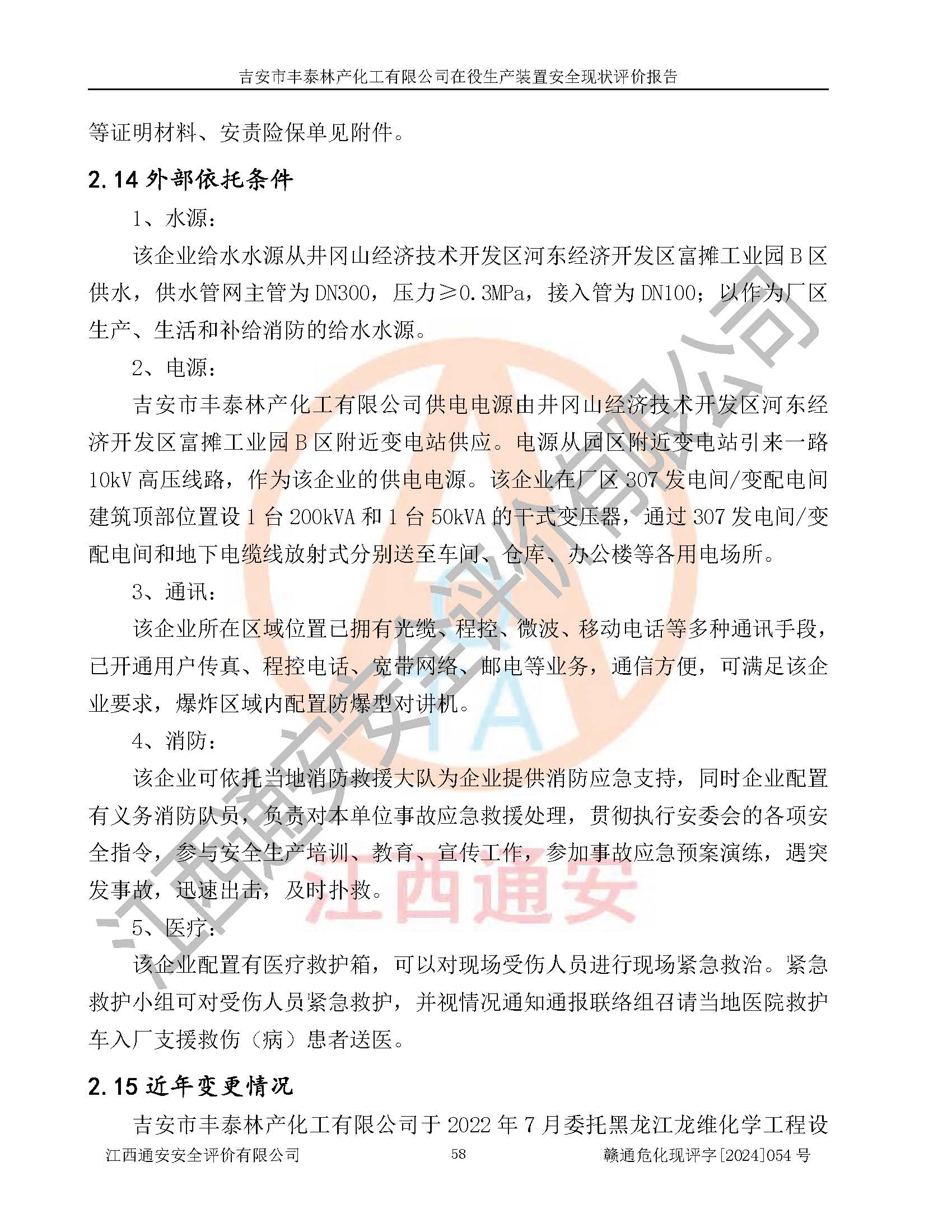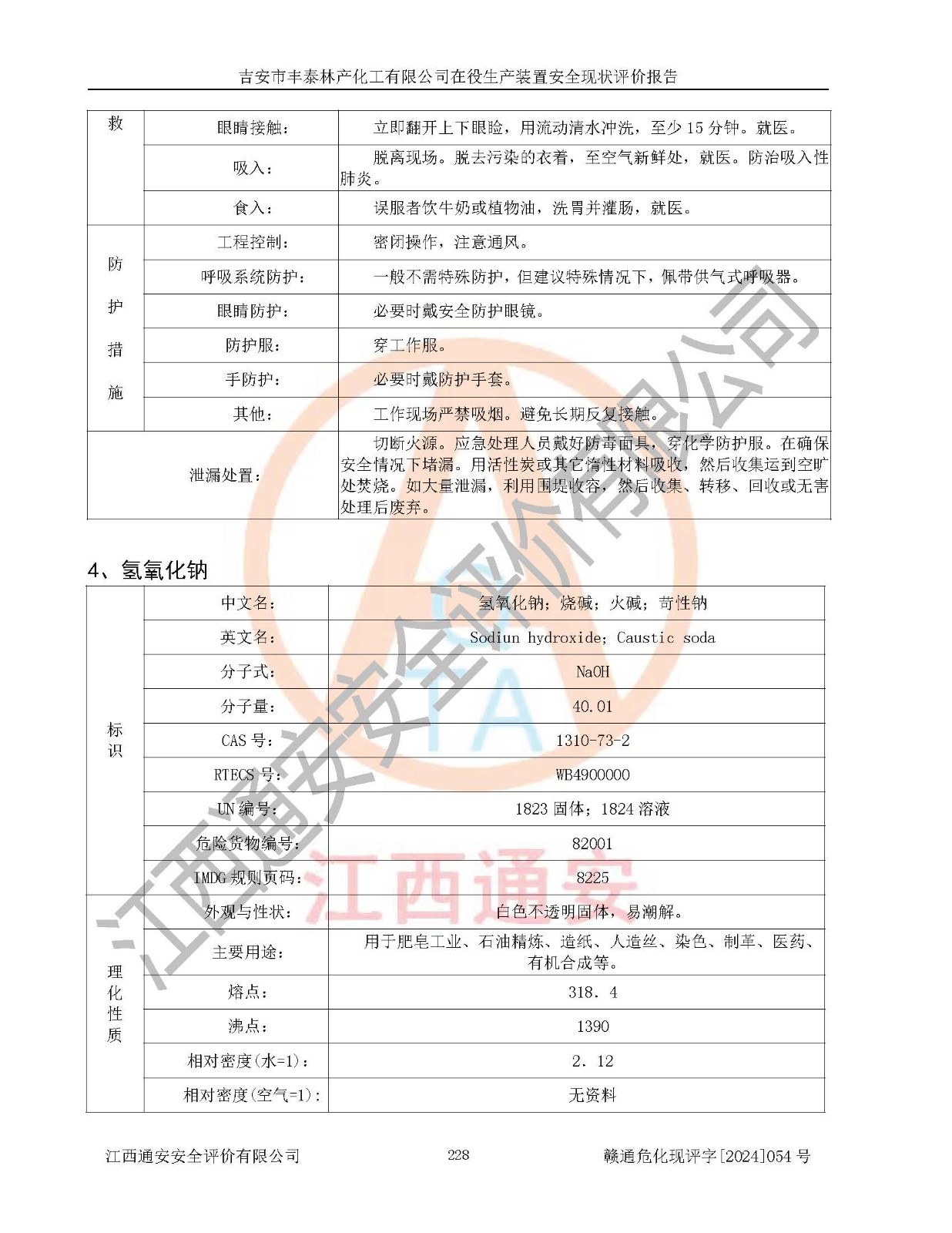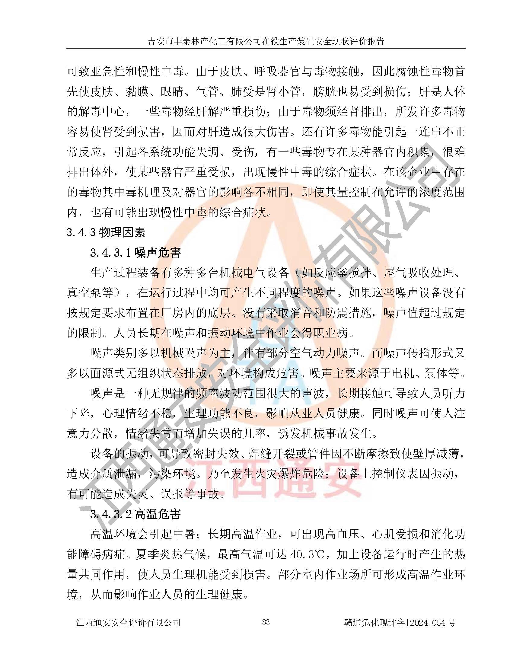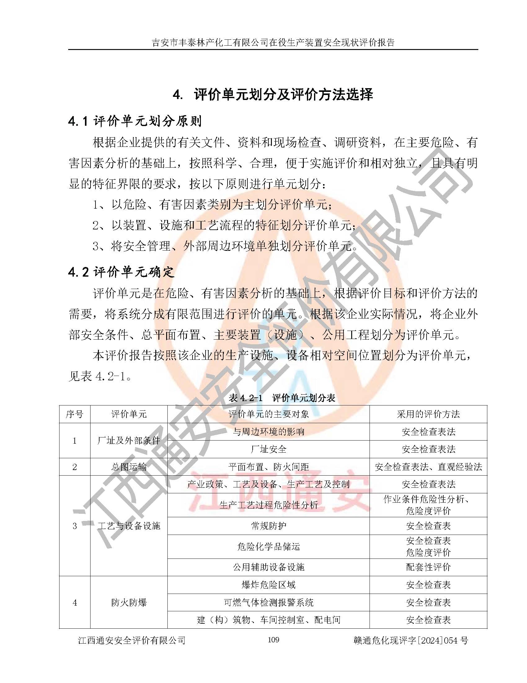 评价结论 | 评价结论:本报告认为,吉安市丰泰林产化工有限公司在役生产装置现场情况与设计图纸一致,有关从业人员资格符合《江西省危险化学品安全专项整治三年行动实施方案》要求,安全设施及安全管理符合**及有关部门关于安全生产法律法规、标准的要求,安全设施正常投用且运行**,安全风险是可以控制的,其风险程度是可以接受的,安全现状符合安全生产条件,能够满足安全生产的要求。 | |||