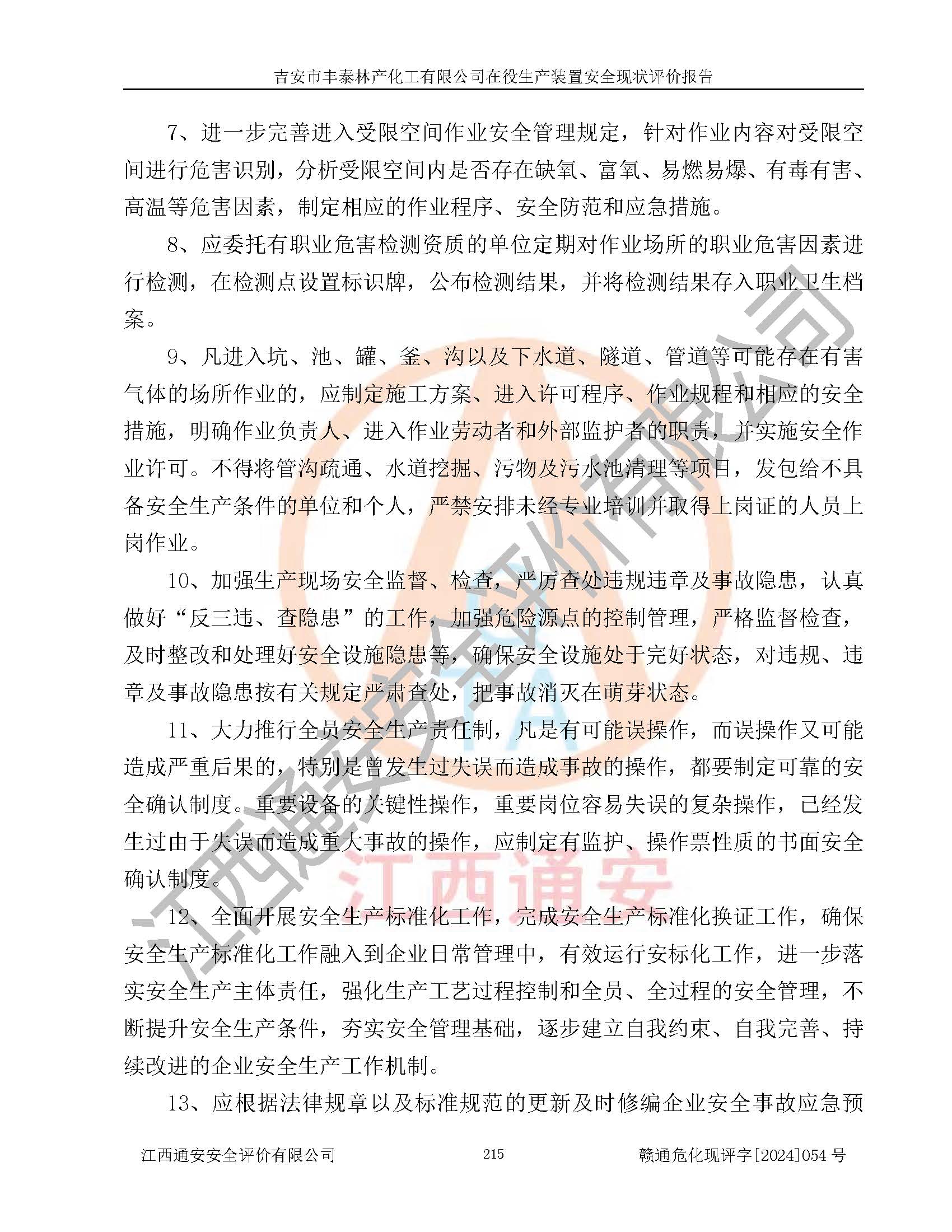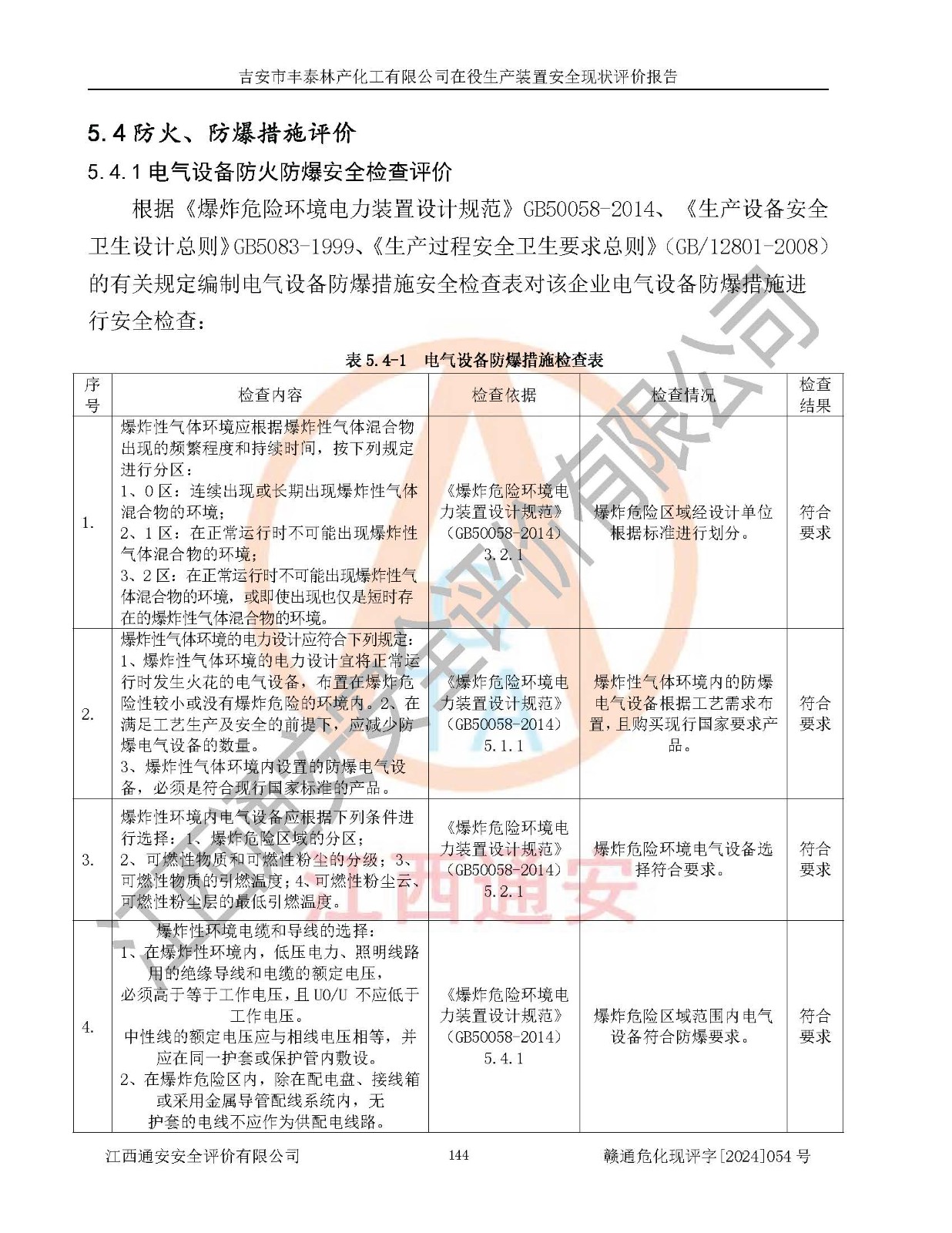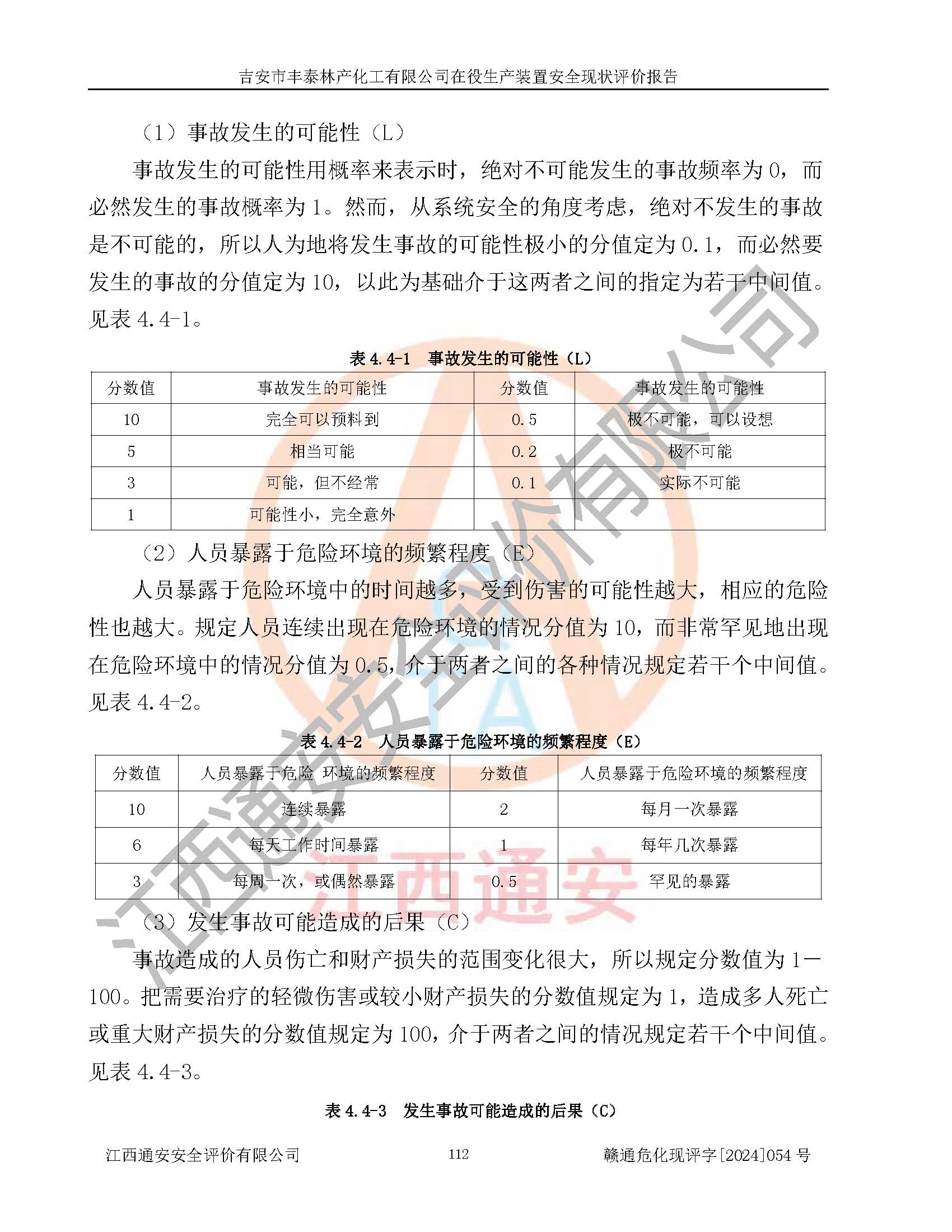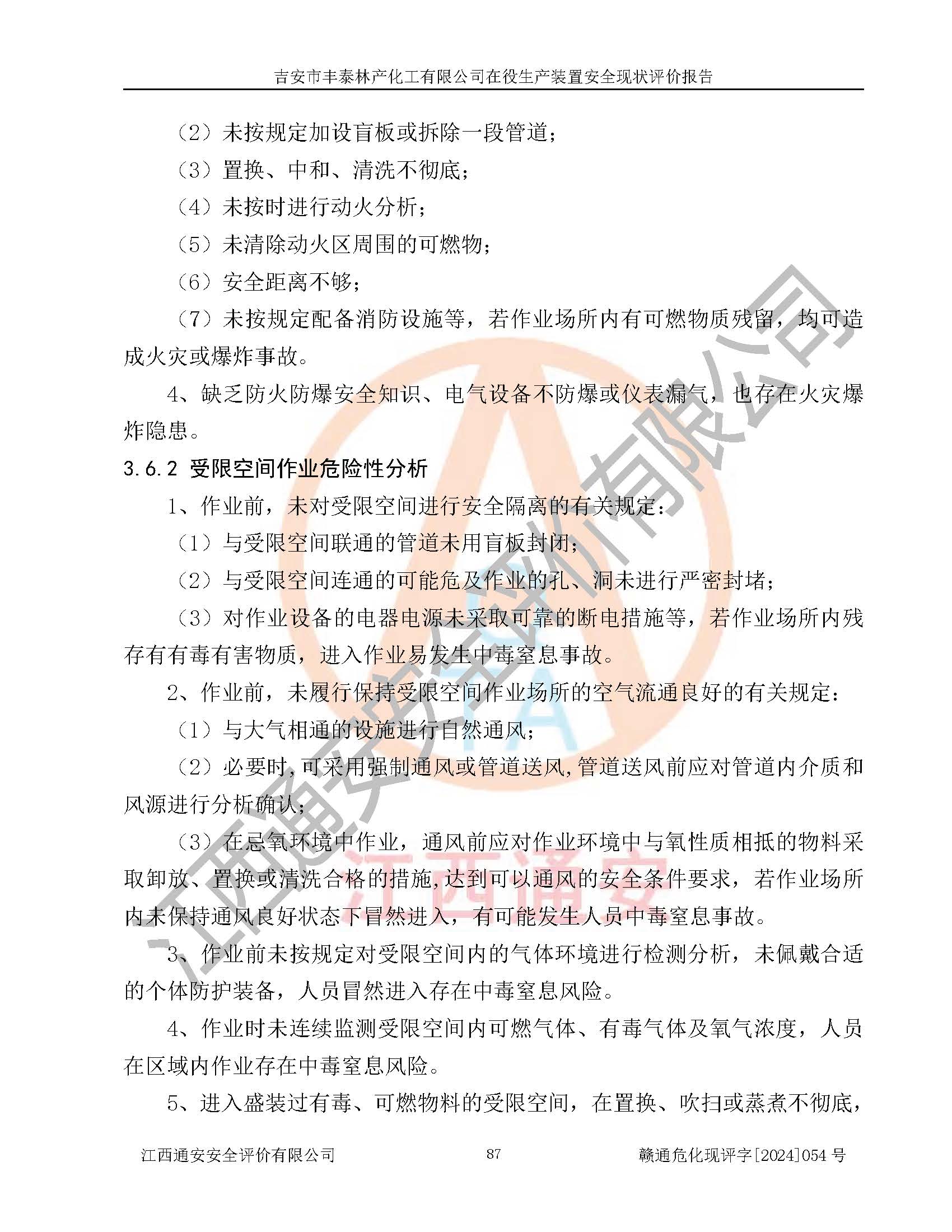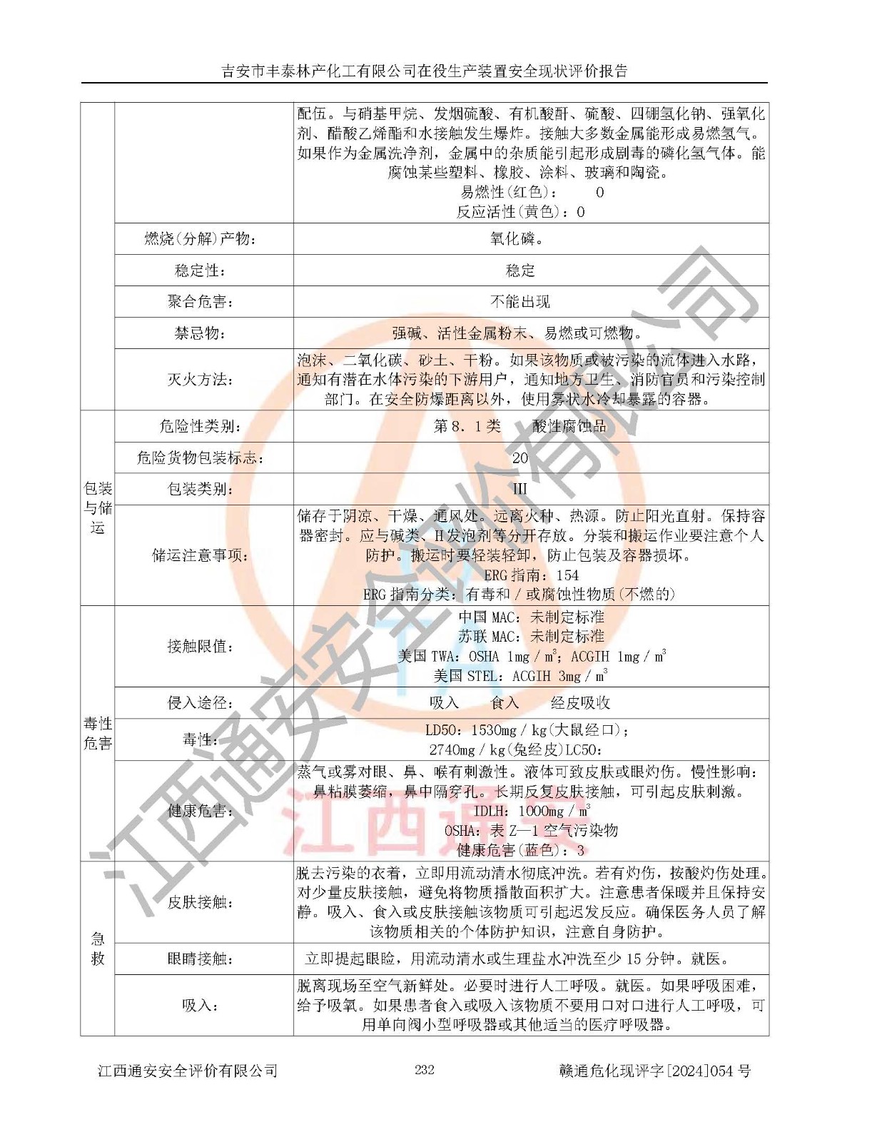 评价结论 | 评价结论:本报告认为,吉安市丰泰林产化工有限公司在役生产装置现场情况与设计图纸一致,有关从业人员资格符合《江西省危险化学品安全专项整治三年行动实施方案》要求,安全设施及安全管理符合**及有关部门关于安全生产法律法规、标准的要求,安全设施正常投用且运行**,安全风险是可以控制的,其风险程度是可以接受的,安全现状符合安全生产条件,能够满足安全生产的要求。 | |||