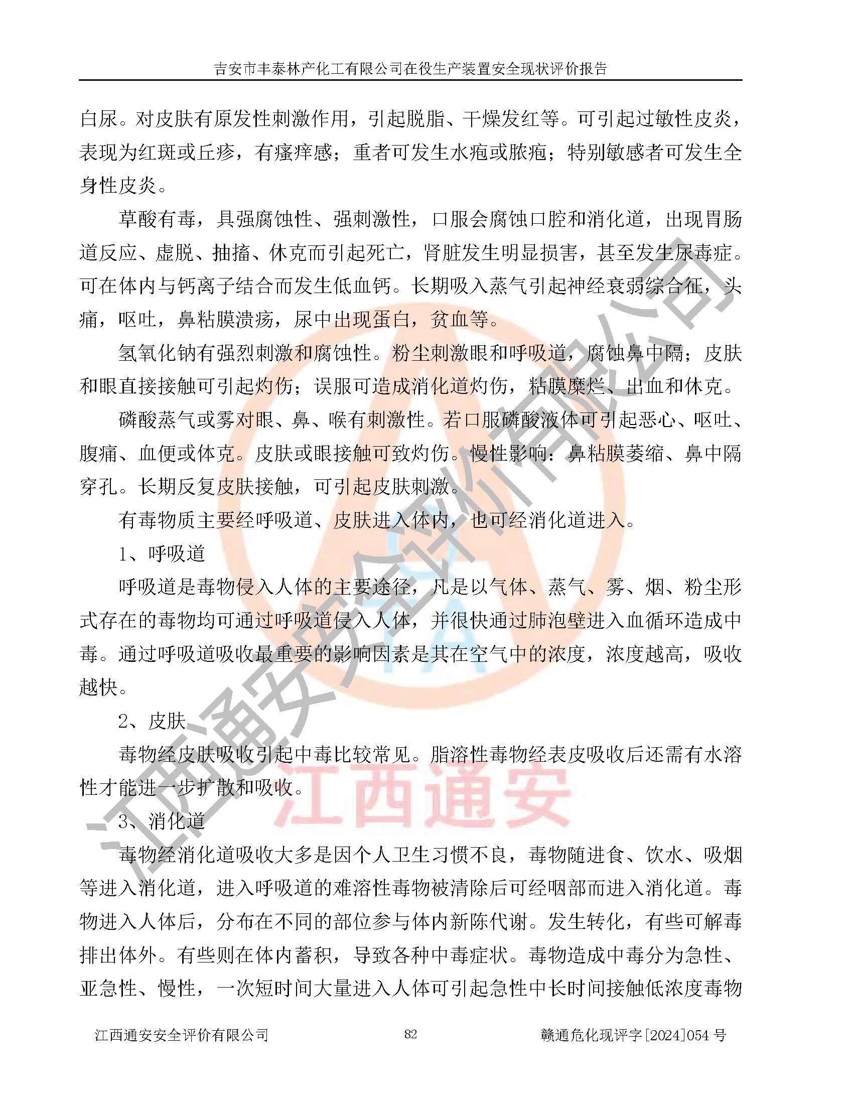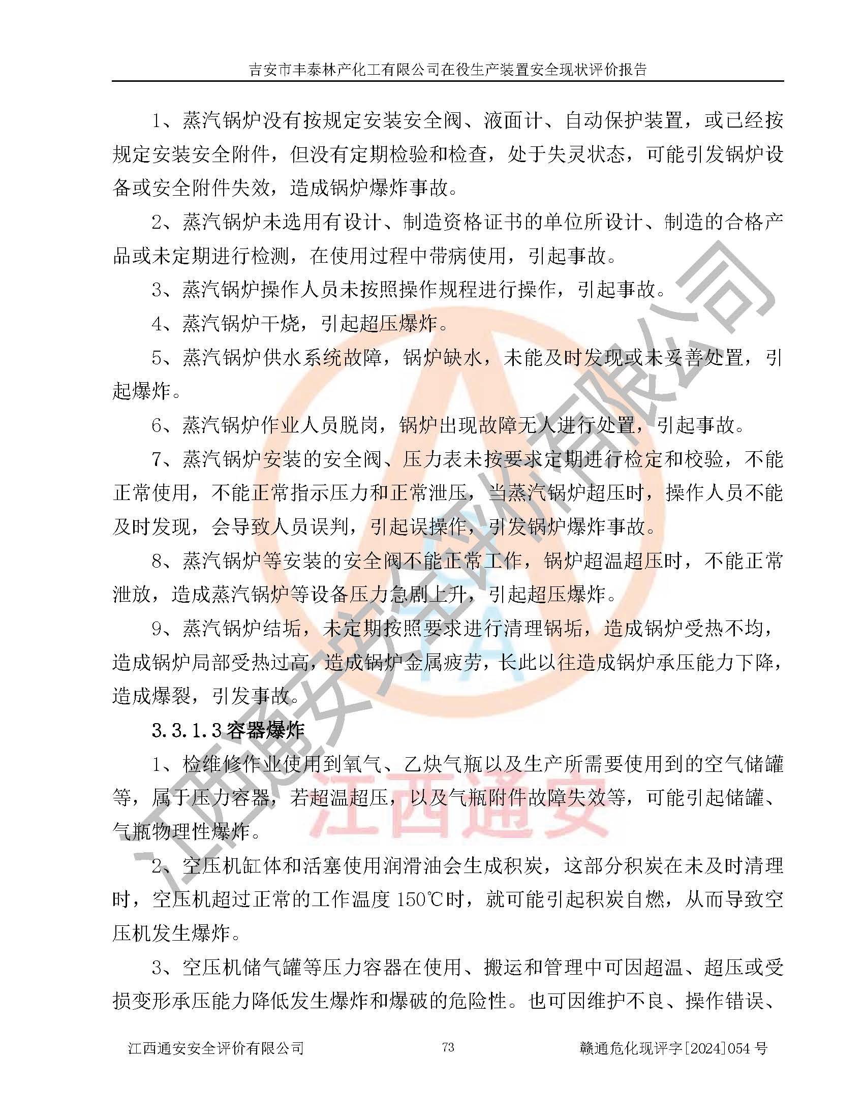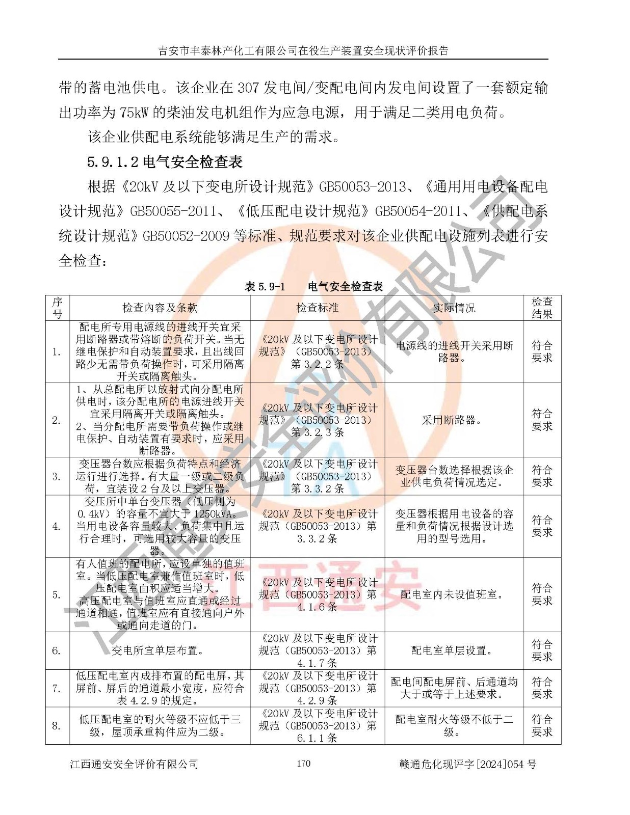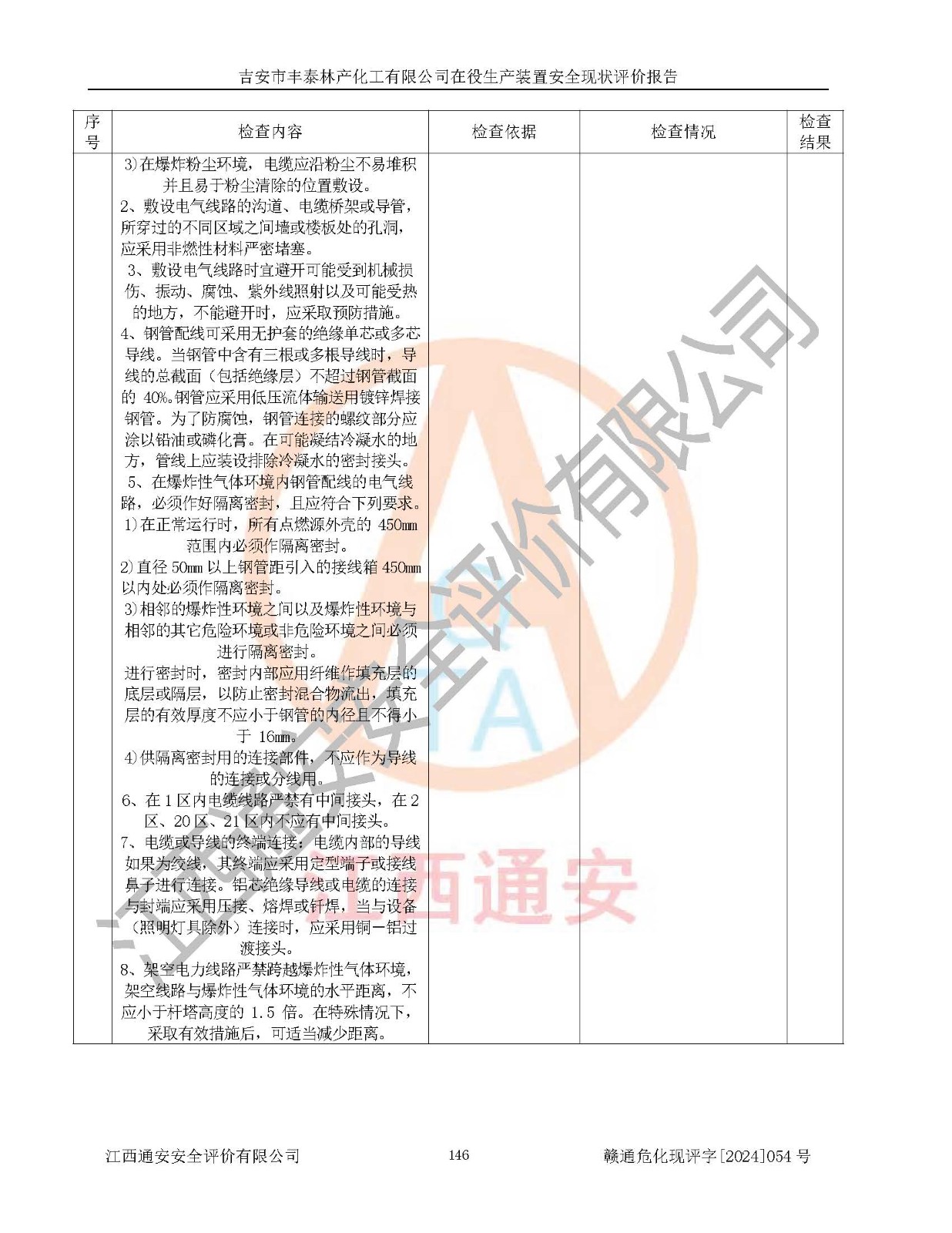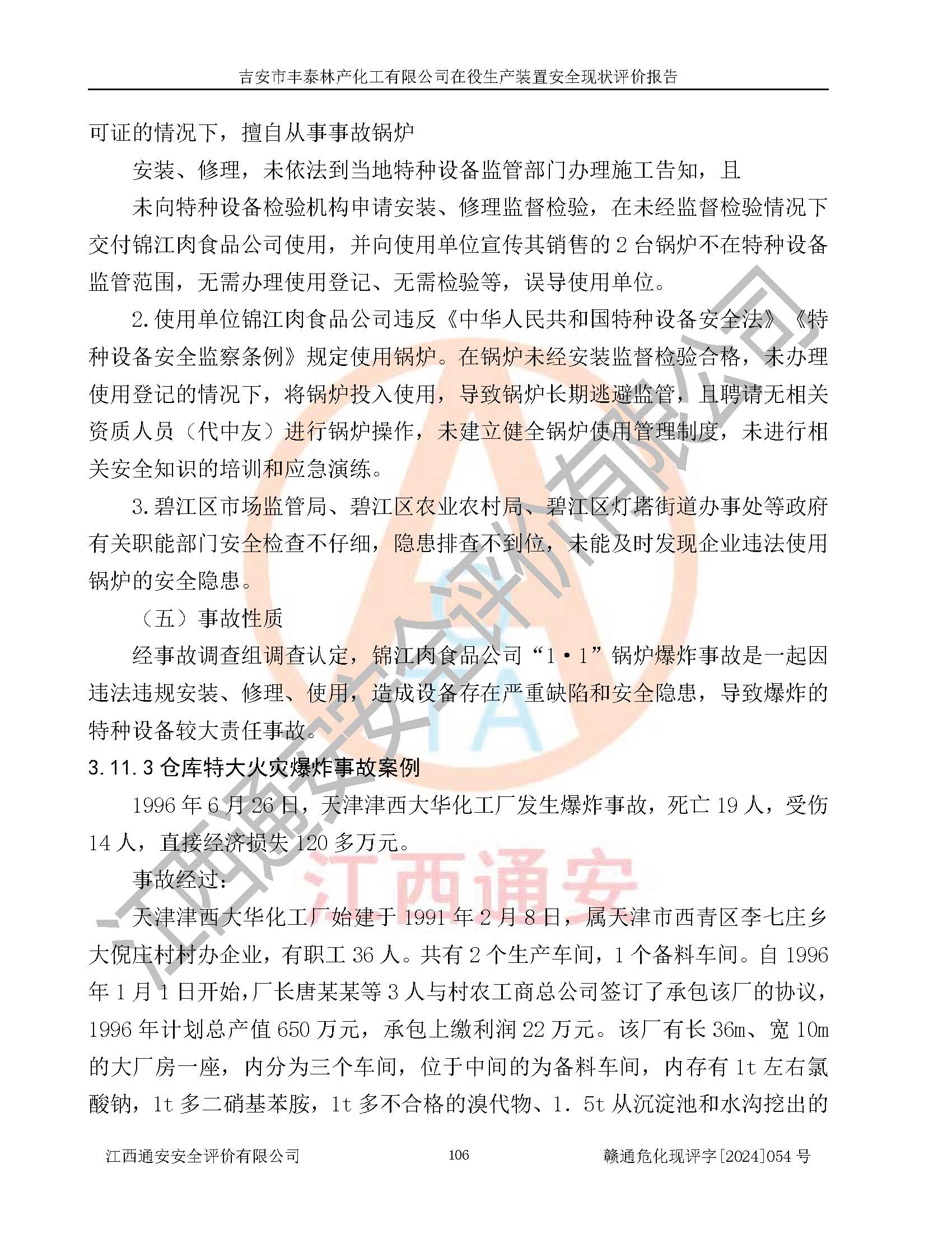 评价结论 | 评价结论:本报告认为,吉安市丰泰林产化工有限公司在役生产装置现场情况与设计图纸一致,有关从业人员资格符合《江西省危险化学品安全专项整治三年行动实施方案》要求,安全设施及安全管理符合**及有关部门关于安全生产法律法规、标准的要求,安全设施正常投用且运行**,安全风险是可以控制的,其风险程度是可以接受的,安全现状符合安全生产条件,能够满足安全生产的要求。 | |||