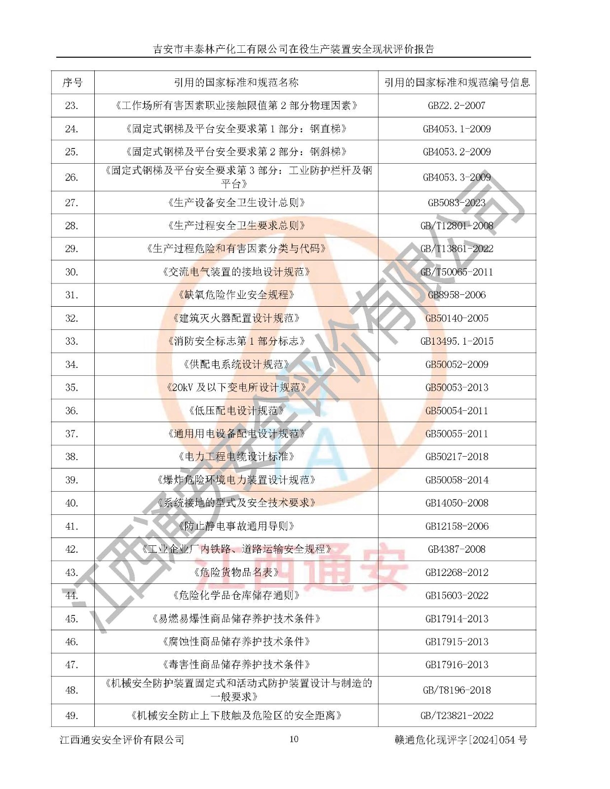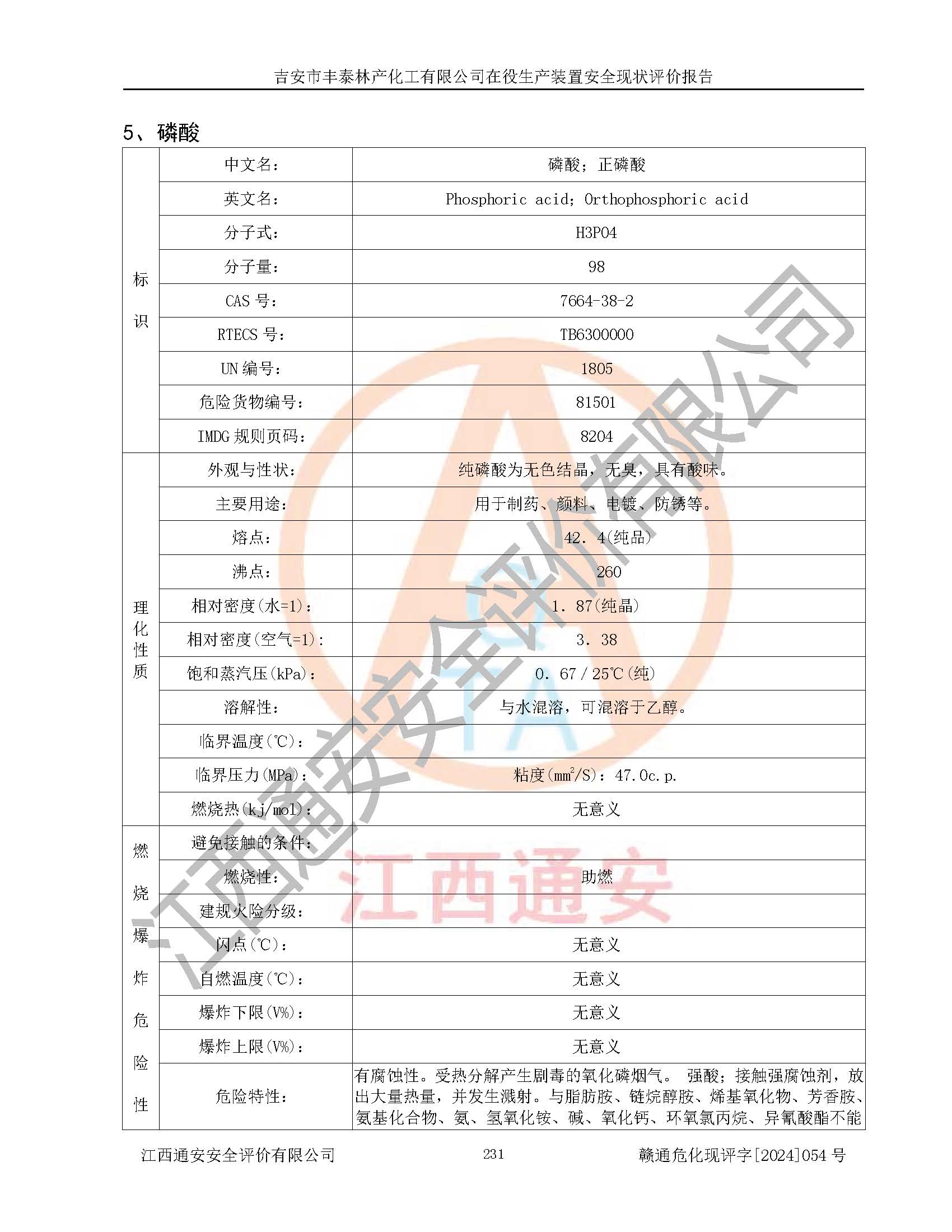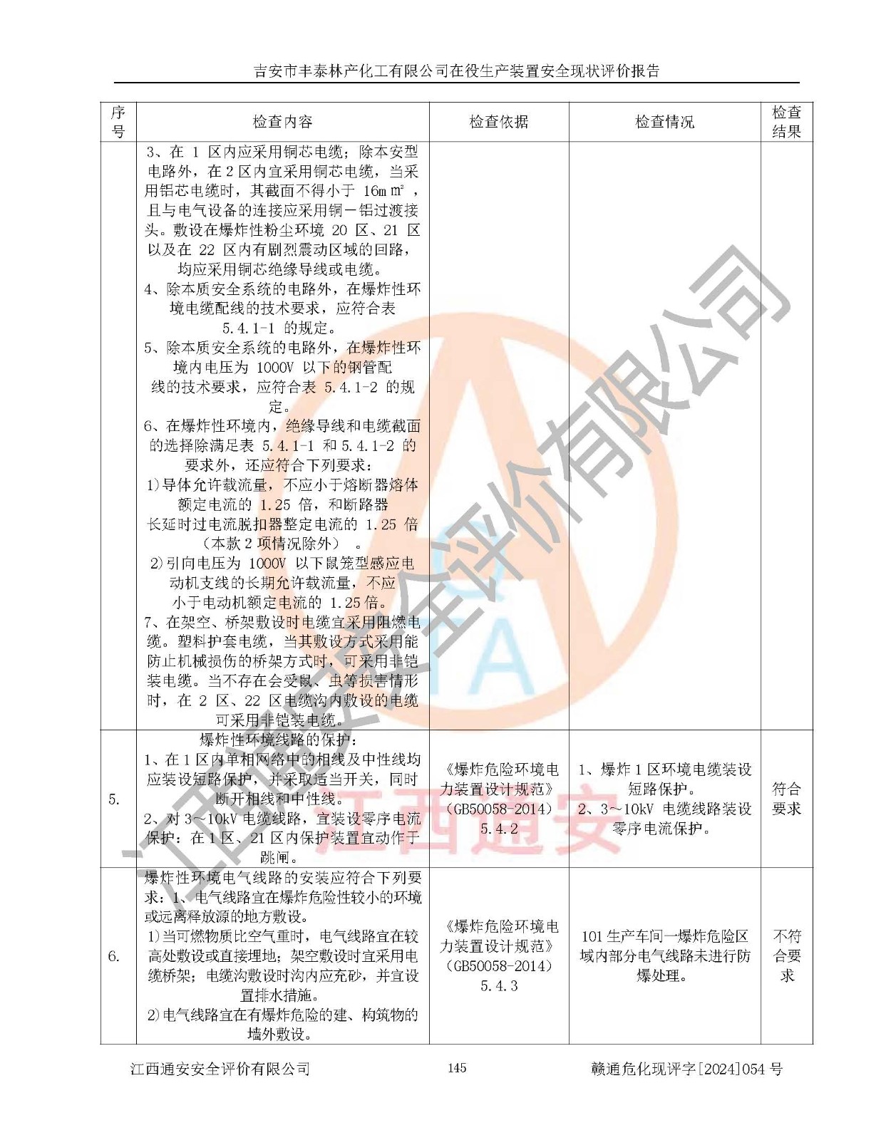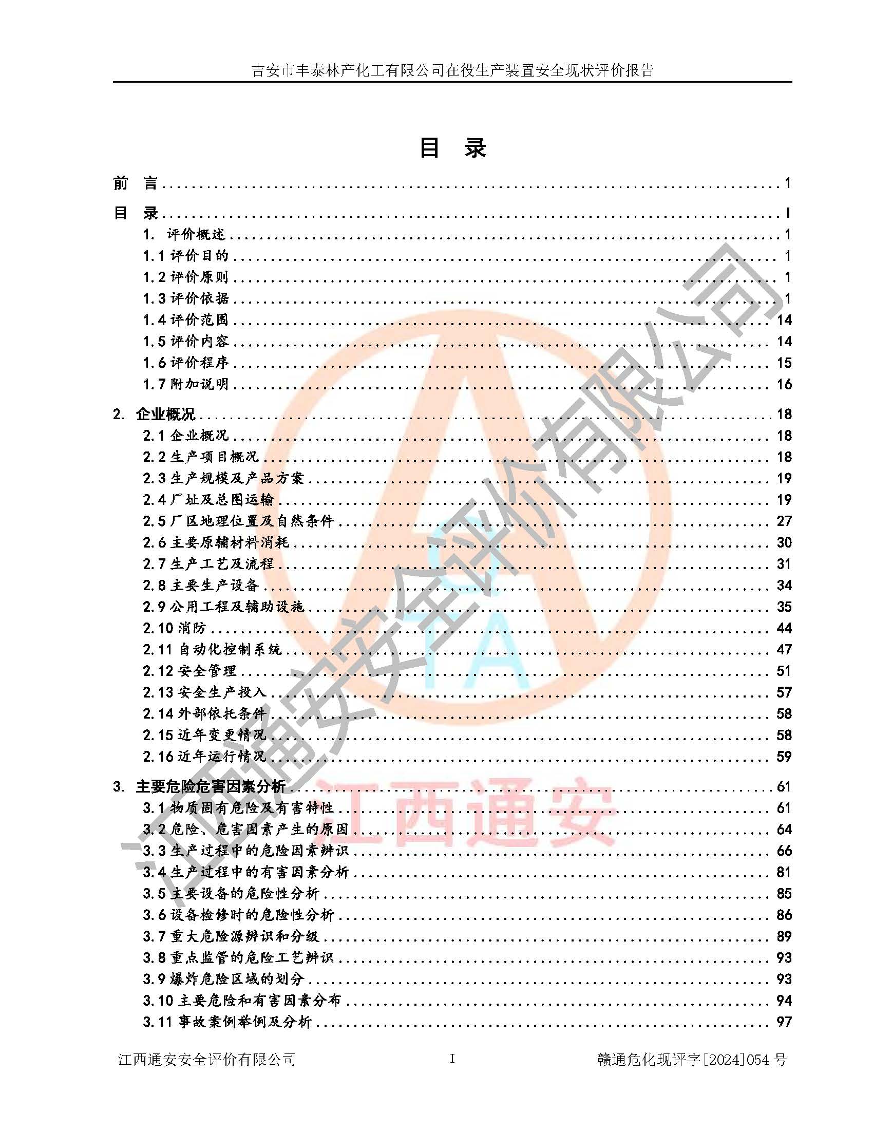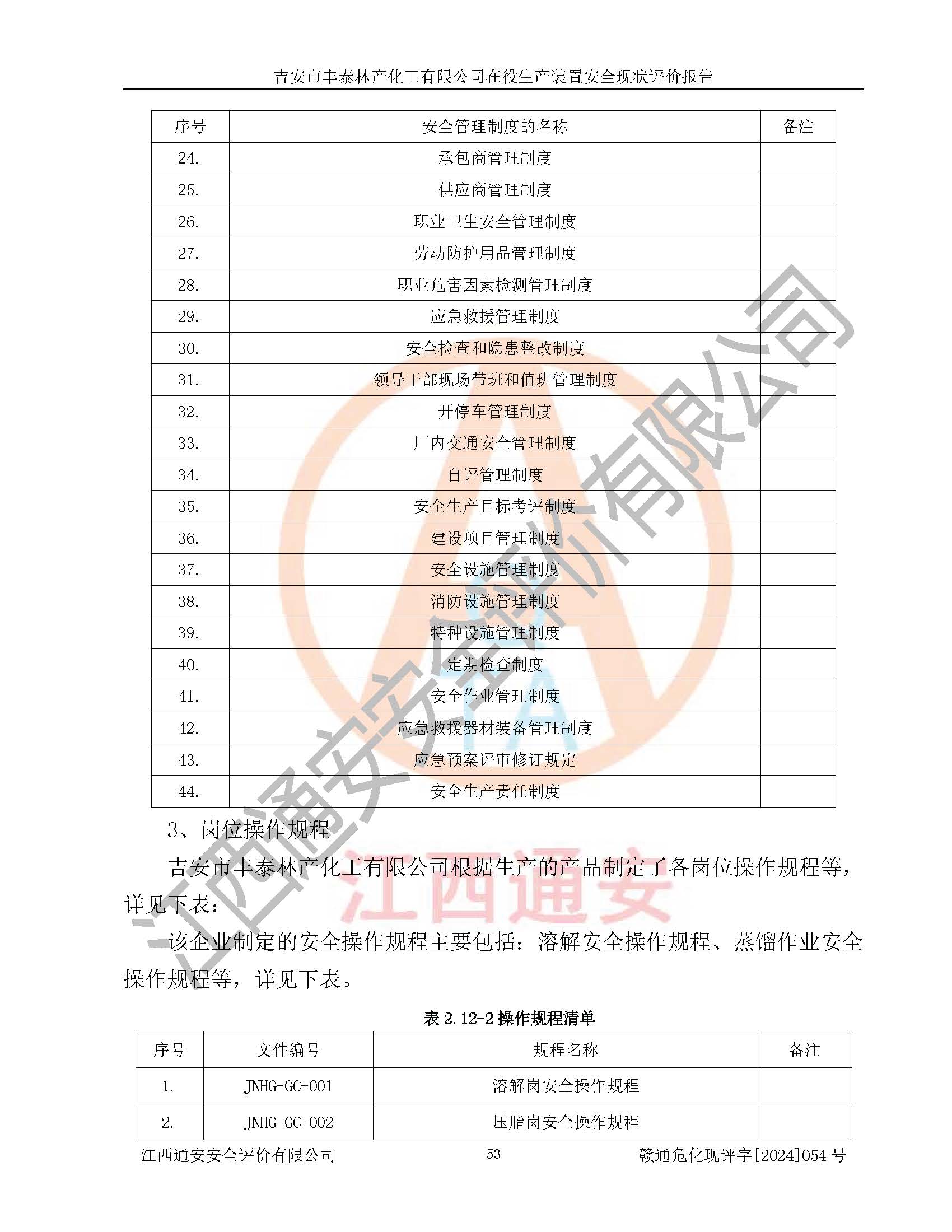 评价结论 | 评价结论:本报告认为,吉安市丰泰林产化工有限公司在役生产装置现场情况与设计图纸一致,有关从业人员资格符合《江西省危险化学品安全专项整治三年行动实施方案》要求,安全设施及安全管理符合**及有关部门关于安全生产法律法规、标准的要求,安全设施正常投用且运行**,安全风险是可以控制的,其风险程度是可以接受的,安全现状符合安全生产条件,能够满足安全生产的要求。 | |||