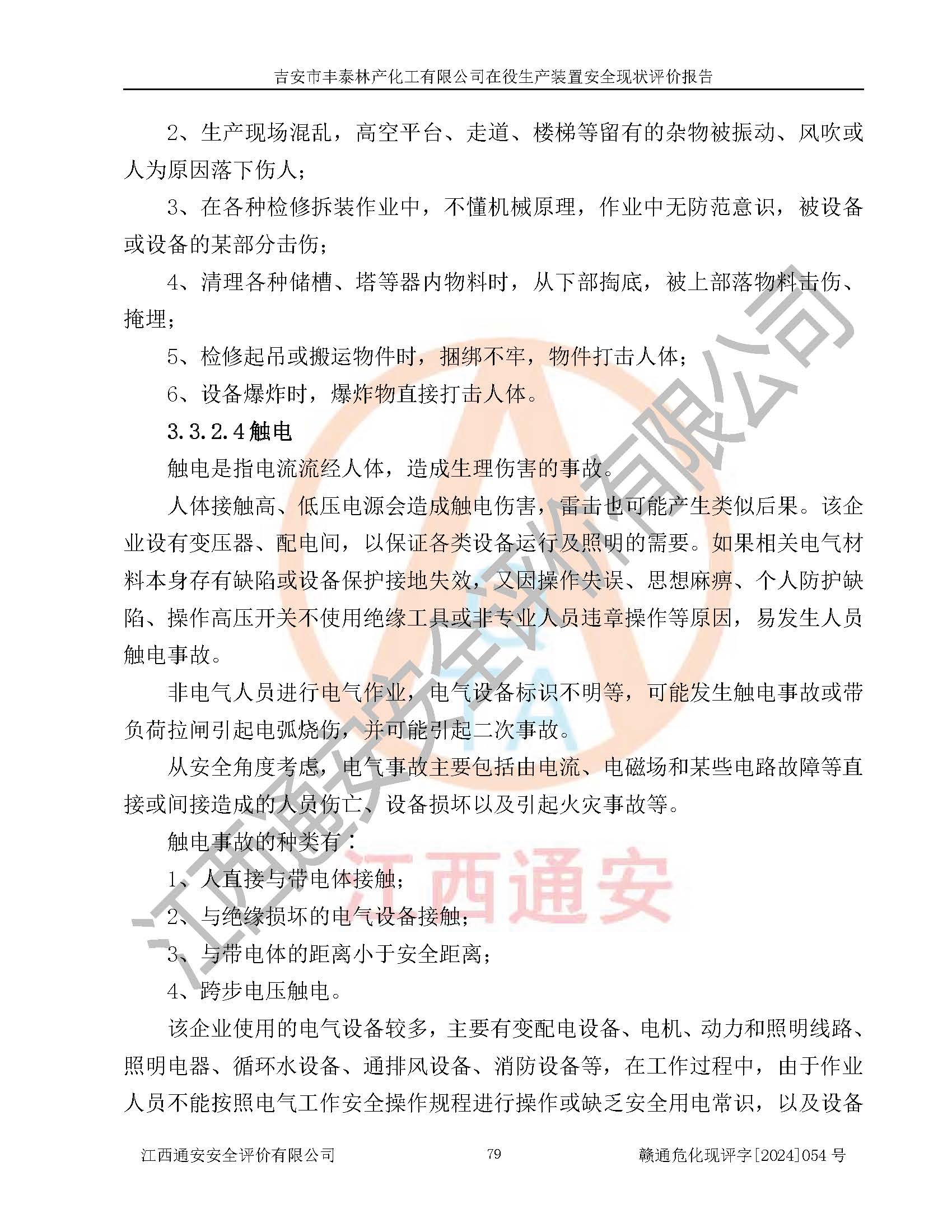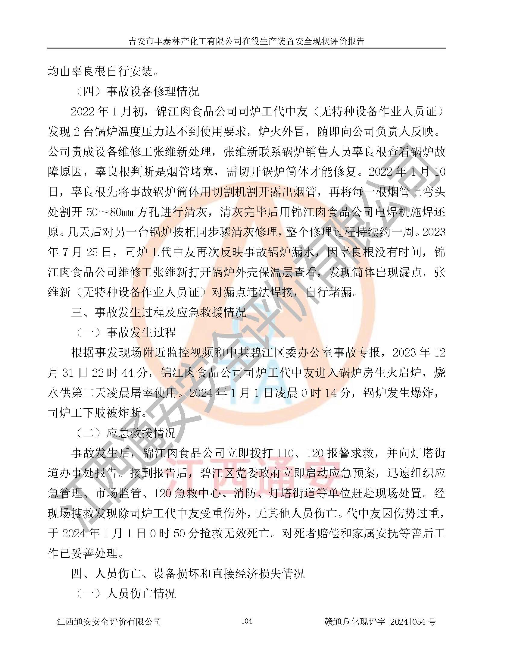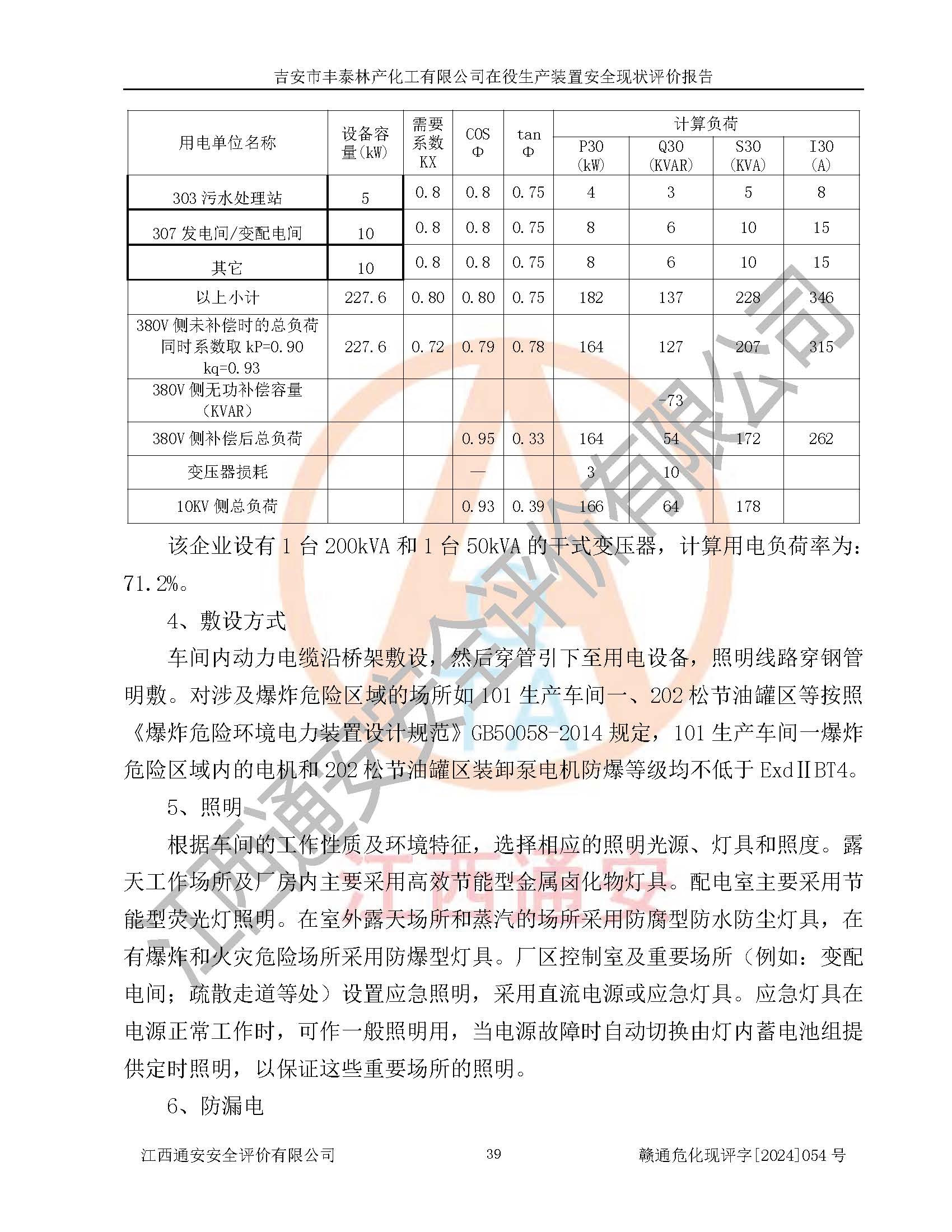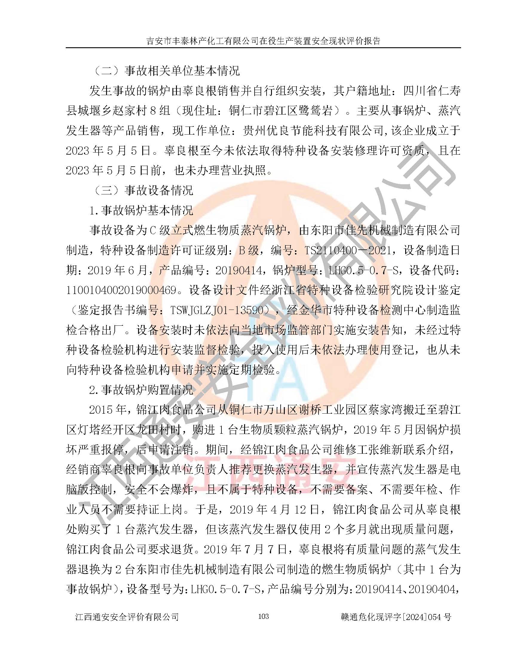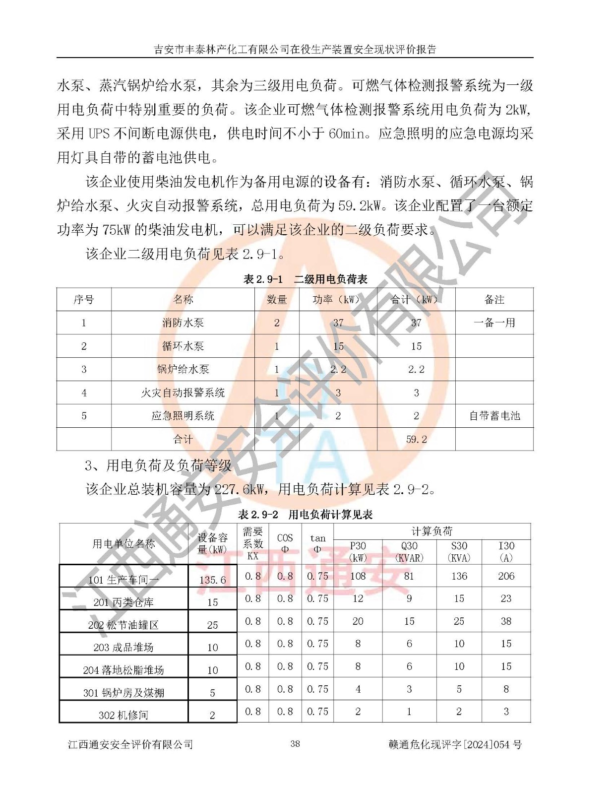 评价结论 | 评价结论:本报告认为,吉安市丰泰林产化工有限公司在役生产装置现场情况与设计图纸一致,有关从业人员资格符合《江西省危险化学品安全专项整治三年行动实施方案》要求,安全设施及安全管理符合**及有关部门关于安全生产法律法规、标准的要求,安全设施正常投用且运行**,安全风险是可以控制的,其风险程度是可以接受的,安全现状符合安全生产条件,能够满足安全生产的要求。 | |||