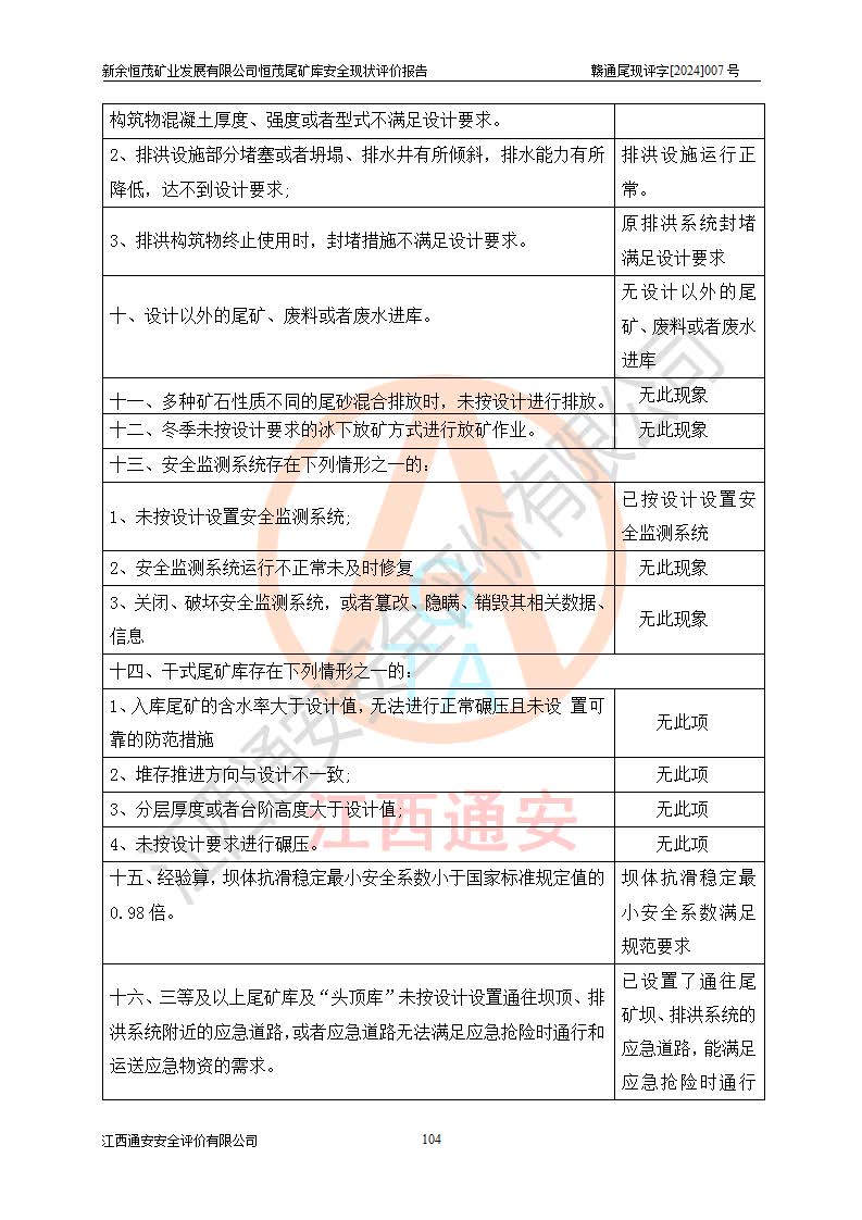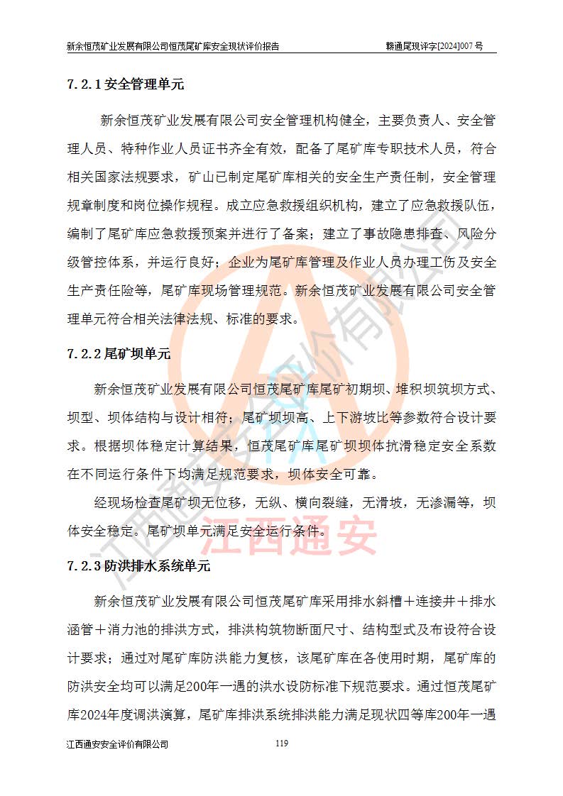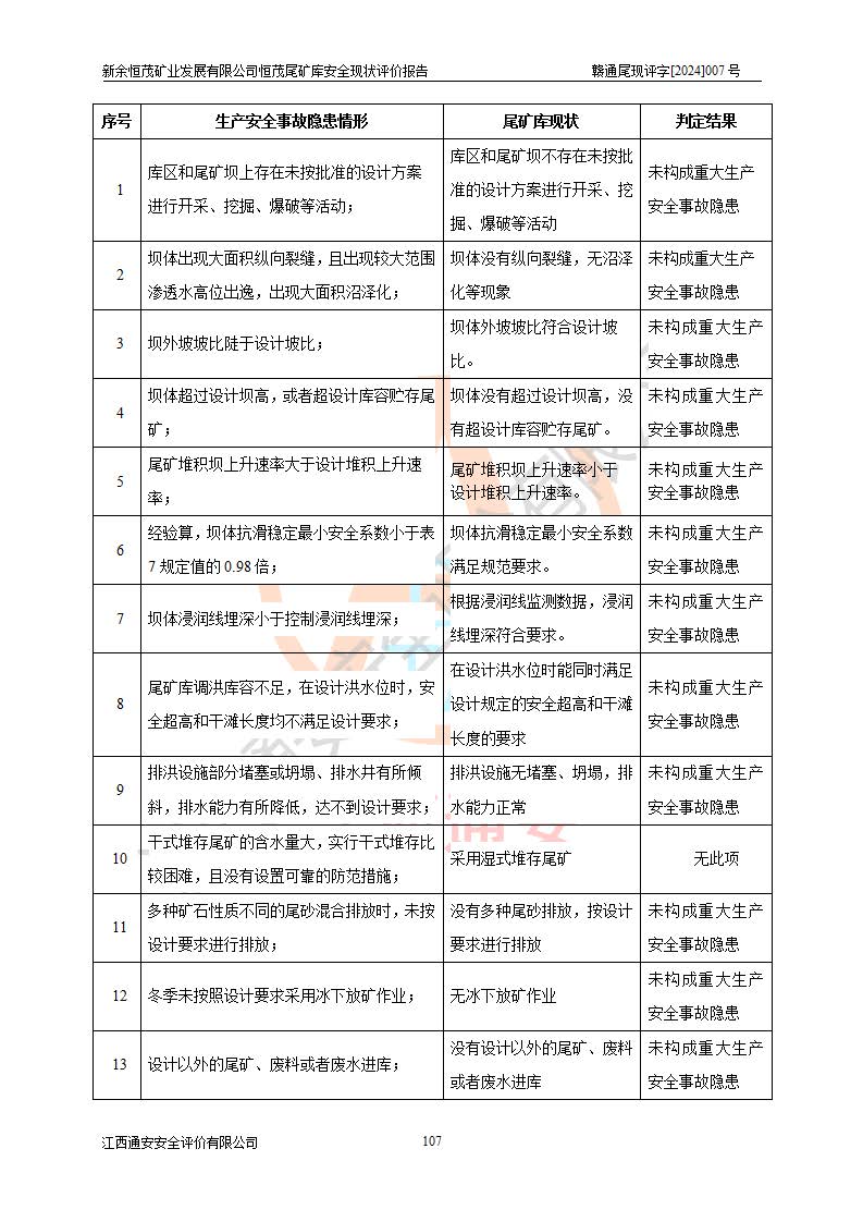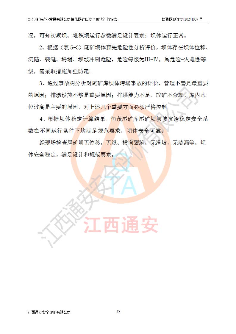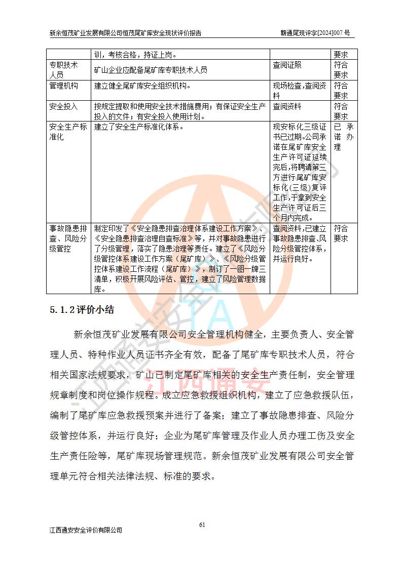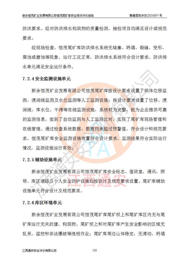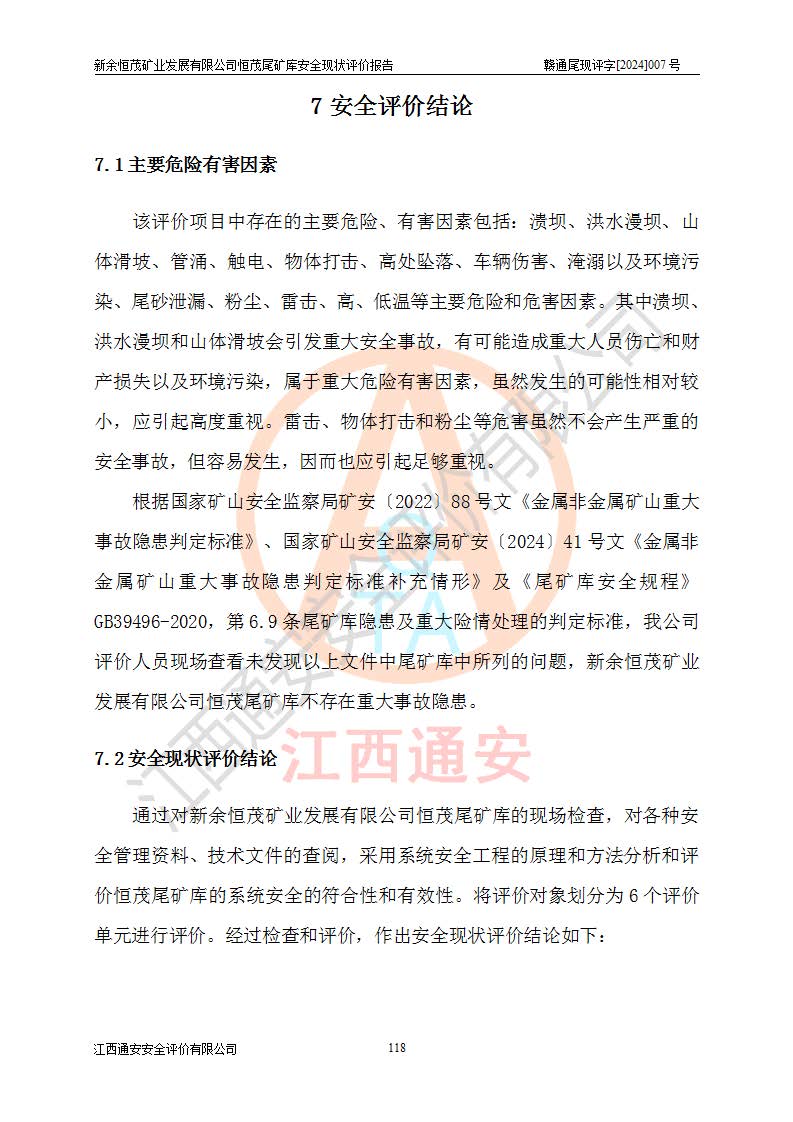 评价结论 | 新余恒茂矿业发展有限公司恒茂尾矿库为正常库,具备继续生产运行的安全生产条件。 | |||