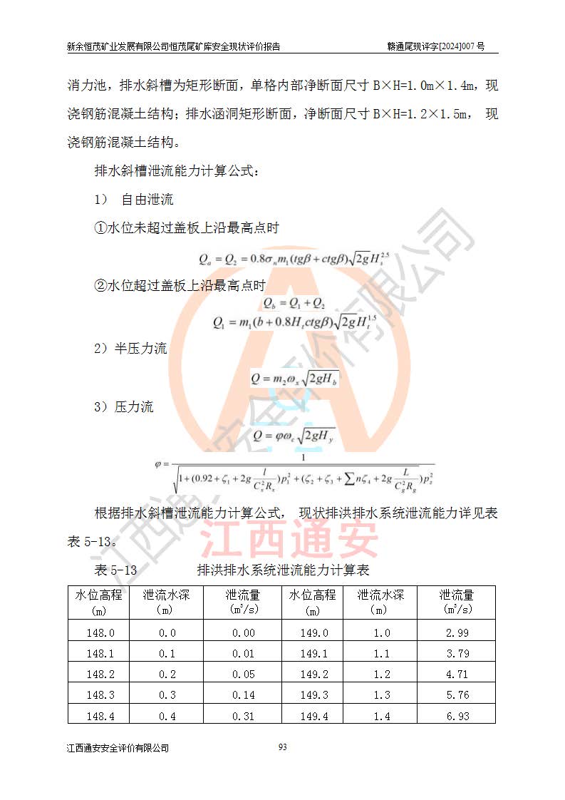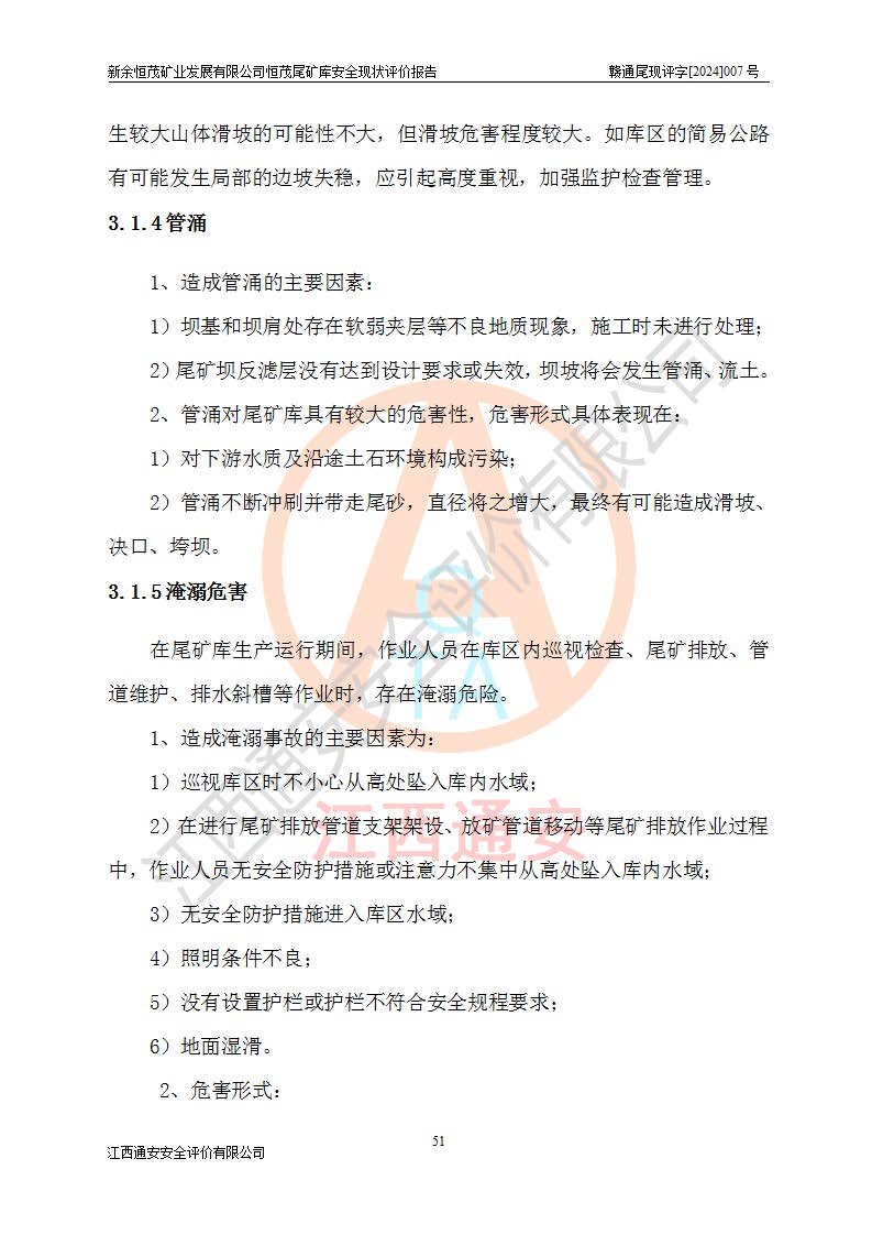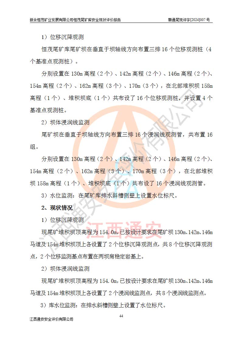 勘察现场发现的问题及安全对策措施 | 存在的问题:1、尾矿坝下游坡面有杂草、杂物。2、坝面、坝肩排水沟局部有杂物和泥土淤积,初期坝脚排水沟被杂草覆盖。3、现堆积坝坝顶为154m标高,无位移监测、浸润线监测设施。4、堆积坝坝顶、排水斜槽处无照明设施。5、排水斜槽侧无踏步,水位标尺不清晰,排水斜槽盖板堆放不规范,部分拱盖板破损。6、库区警示标志偏少。 整改措施:1、清除尾矿坝下游坡面杂草、杂物。2、清除坝面坝肩排水沟的杂物和泥土,清除初期坝脚排水沟的杂草。3、在堆积坝坝顶154m高程设置位移监测、浸润线监测设施。4、在堆积坝坝顶、排水斜槽处设置照明设施。5、在排水斜槽侧设置踏步,更换水位标尺,排水斜槽盖板规范堆放,清理破损的盖板。6、库区增设安全警示标志。 | |||