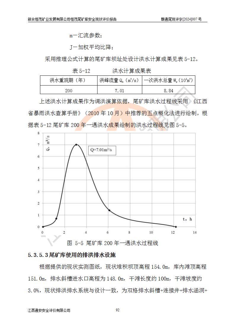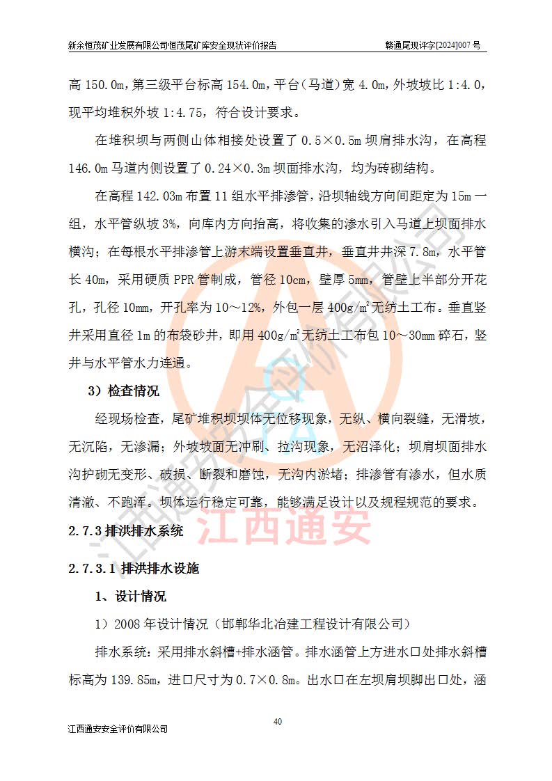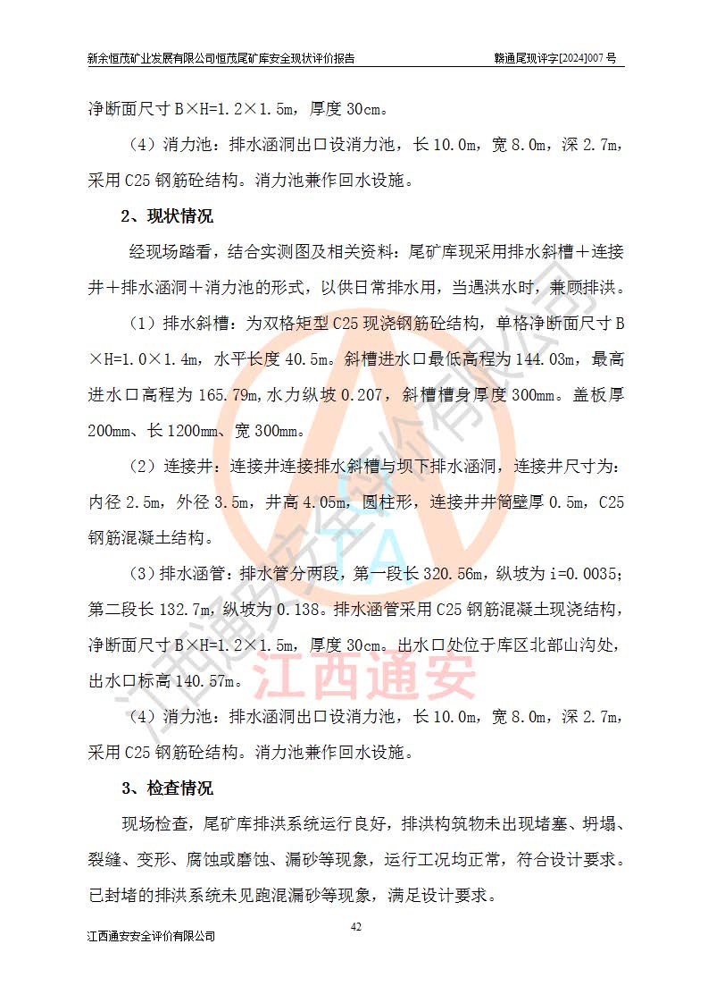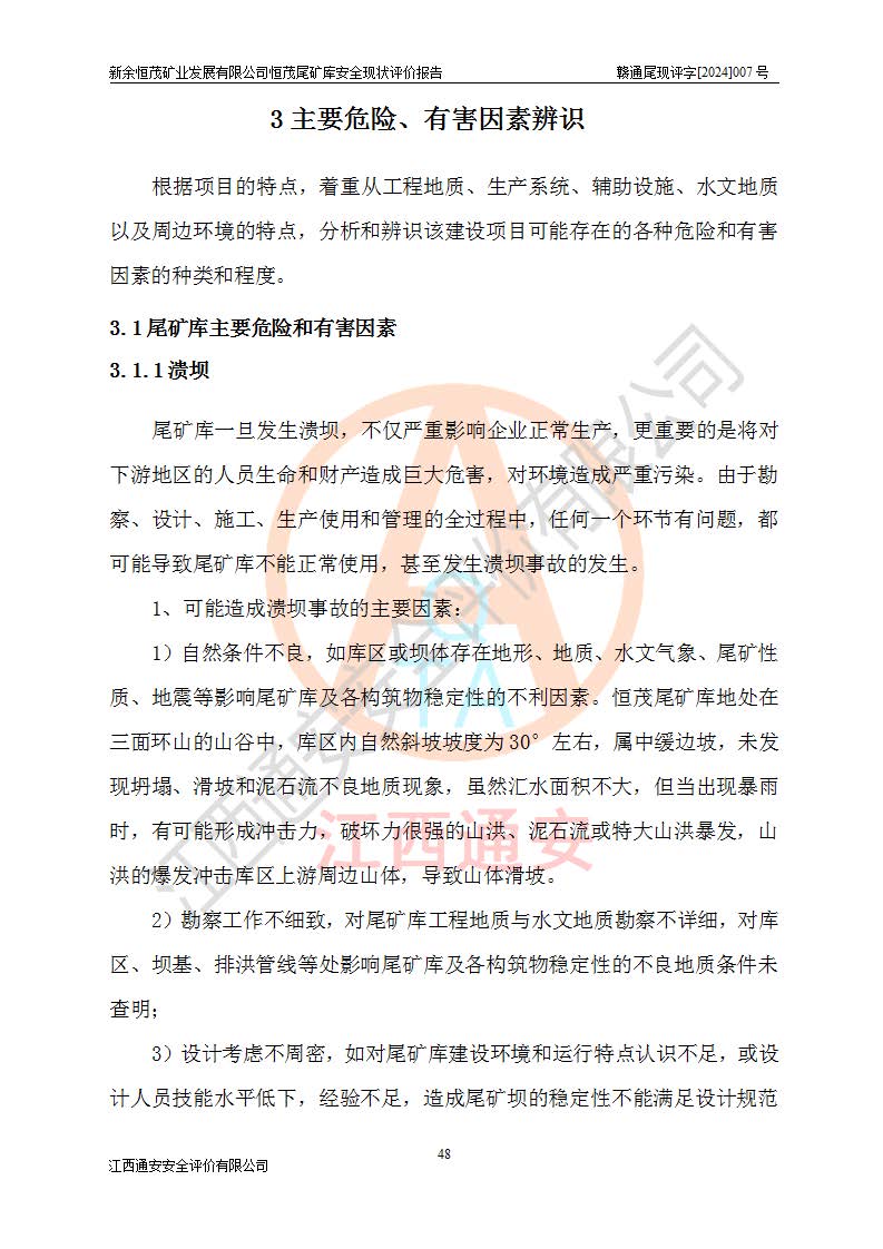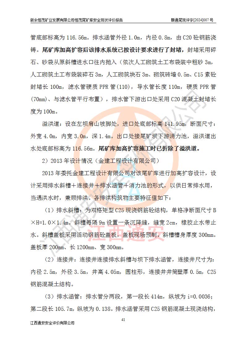 项目简介 | 新余恒茂矿业发展有限公司恒茂尾矿库位于江西省新余市渝水区良山镇周宇村境内,属良山镇管辖范围。尾矿库尾矿坝顶中心点地理坐标为X:3059955.317,Y:38587956.581,H:141.89m。附近有吉安~新余公路通过,新余~周宇铁路直达境内,交通方便。 新余恒茂矿业发展有限公司恒茂尾矿库设计尾矿坝坝基底高程121.94m,堆积坝顶高程为170m,尾矿坝总坝高48.06m,总库容为437.2×104m3,根据《规范》,该尾矿库为四等库,采用排水斜槽+连接井+排水涵管形式排洪,库内主要水工构筑物等级为4级。相应尾矿库防洪标准为:洪水重现期100~200年,尾矿库*小安全**0.5m(考虑到风浪等因素,设计取0.7m),干滩长度不小于70m。 恒茂尾矿库于2021年7月28日取得江西省应急管理厅换发的安全生产许可证,证书编号(赣)FM安许证字[2011]M1493号,**期从2021年5月22日到2024年5月21日,为三年期,现已过期。依照《非煤矿矿山企业安全生产许可证延期换证工作》的通知,根据***《安全生产许可证条例》、《江西省安全生产条例》、《非煤矿山安全生产许可证实施办法》、《江西省非煤矿矿山企业安全生产许可证办法》规定的要求,受新余恒茂矿业发展有限公司委托,我公司承担了恒茂尾矿库延期换证安全现状评价工作。 | |||