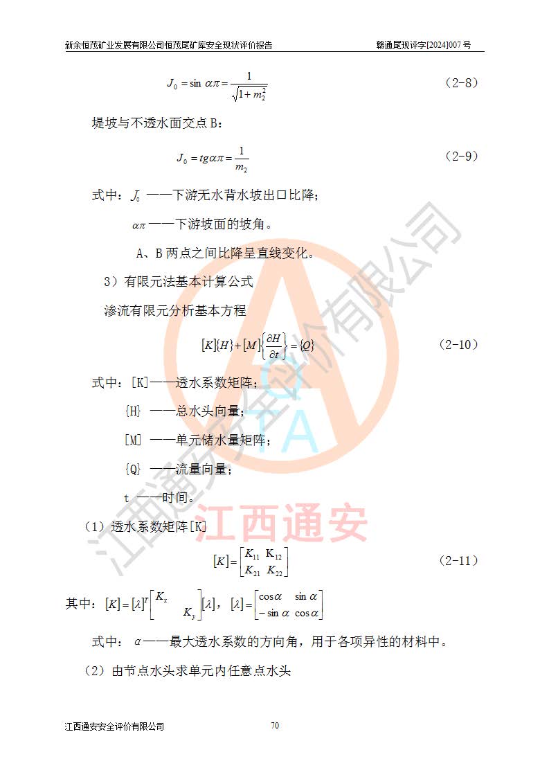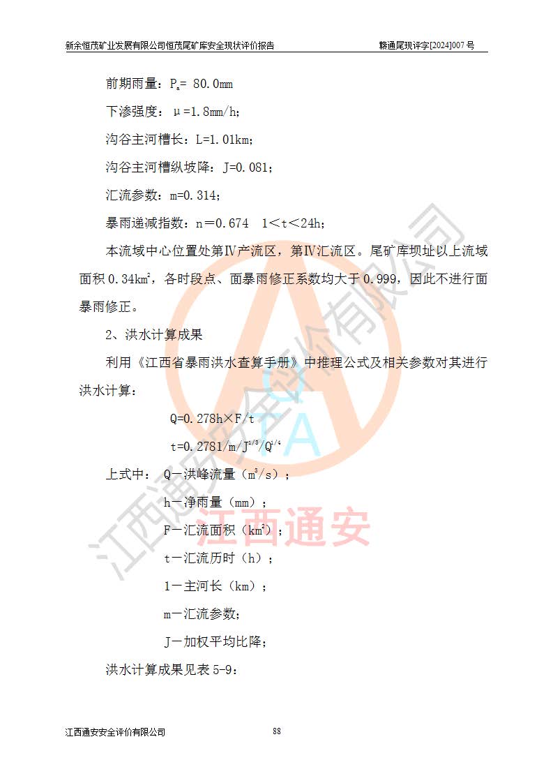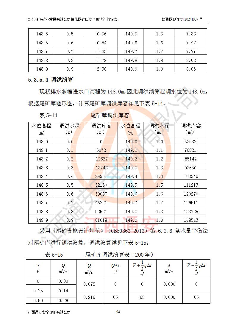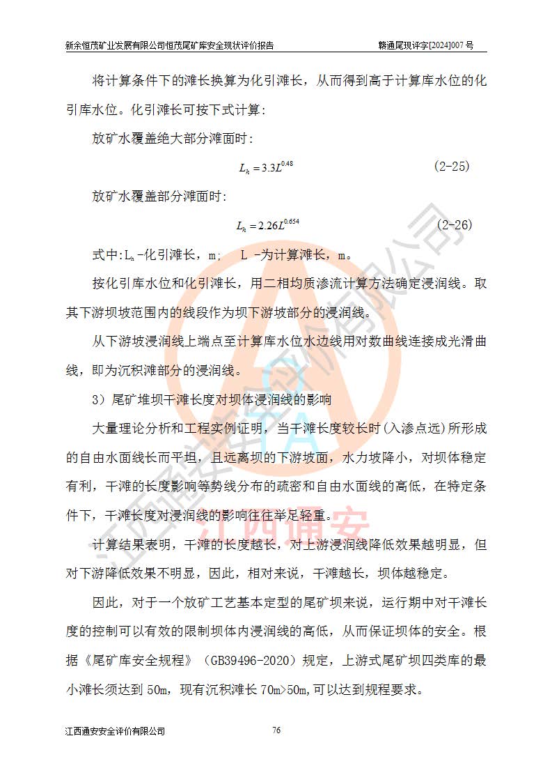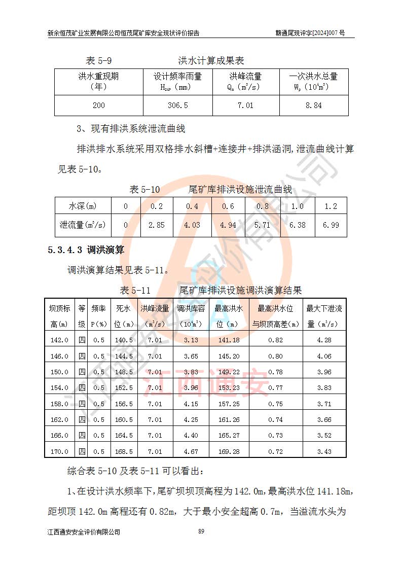 项目简介 | 新余恒茂矿业发展有限公司恒茂尾矿库位于江西省新余市渝水区良山镇周宇村境内,属良山镇管辖范围。尾矿库尾矿坝顶中心点地理坐标为X:3059955.317,Y:38587956.581,H:141.89m。附近有吉安~新余公路通过,新余~周宇铁路直达境内,交通方便。 新余恒茂矿业发展有限公司恒茂尾矿库设计尾矿坝坝基底高程121.94m,堆积坝顶高程为170m,尾矿坝总坝高48.06m,总库容为437.2×104m3,根据《规范》,该尾矿库为四等库,采用排水斜槽+连接井+排水涵管形式排洪,库内主要水工构筑物等级为4级。相应尾矿库防洪标准为:洪水重现期100~200年,尾矿库*小安全**0.5m(考虑到风浪等因素,设计取0.7m),干滩长度不小于70m。 恒茂尾矿库于2021年7月28日取得江西省应急管理厅换发的安全生产许可证,证书编号(赣)FM安许证字[2011]M1493号,**期从2021年5月22日到2024年5月21日,为三年期,现已过期。依照《非煤矿矿山企业安全生产许可证延期换证工作》的通知,根据***《安全生产许可证条例》、《江西省安全生产条例》、《非煤矿山安全生产许可证实施办法》、《江西省非煤矿矿山企业安全生产许可证办法》规定的要求,受新余恒茂矿业发展有限公司委托,我公司承担了恒茂尾矿库延期换证安全现状评价工作。 | |||