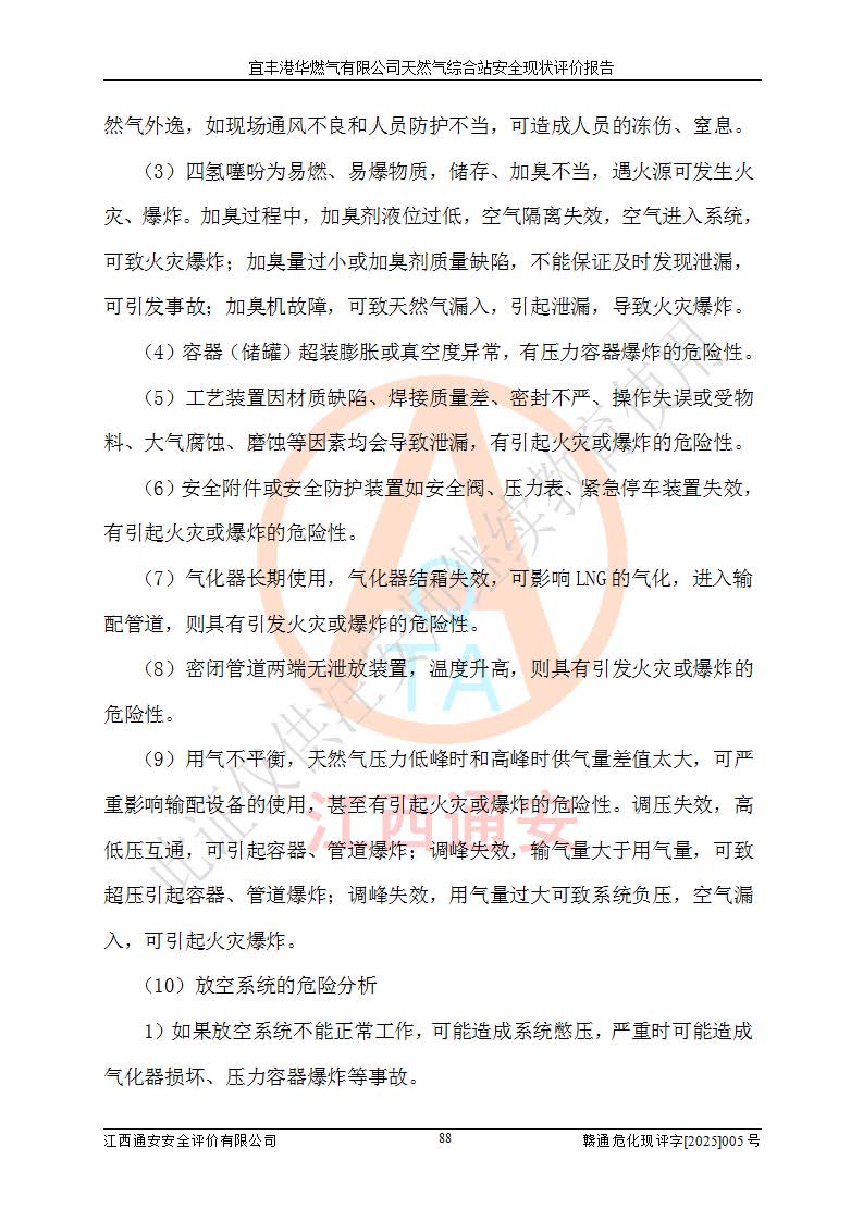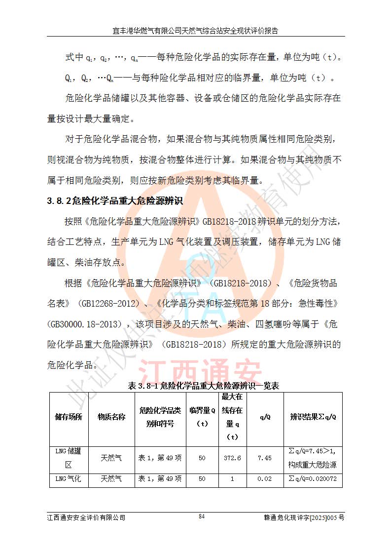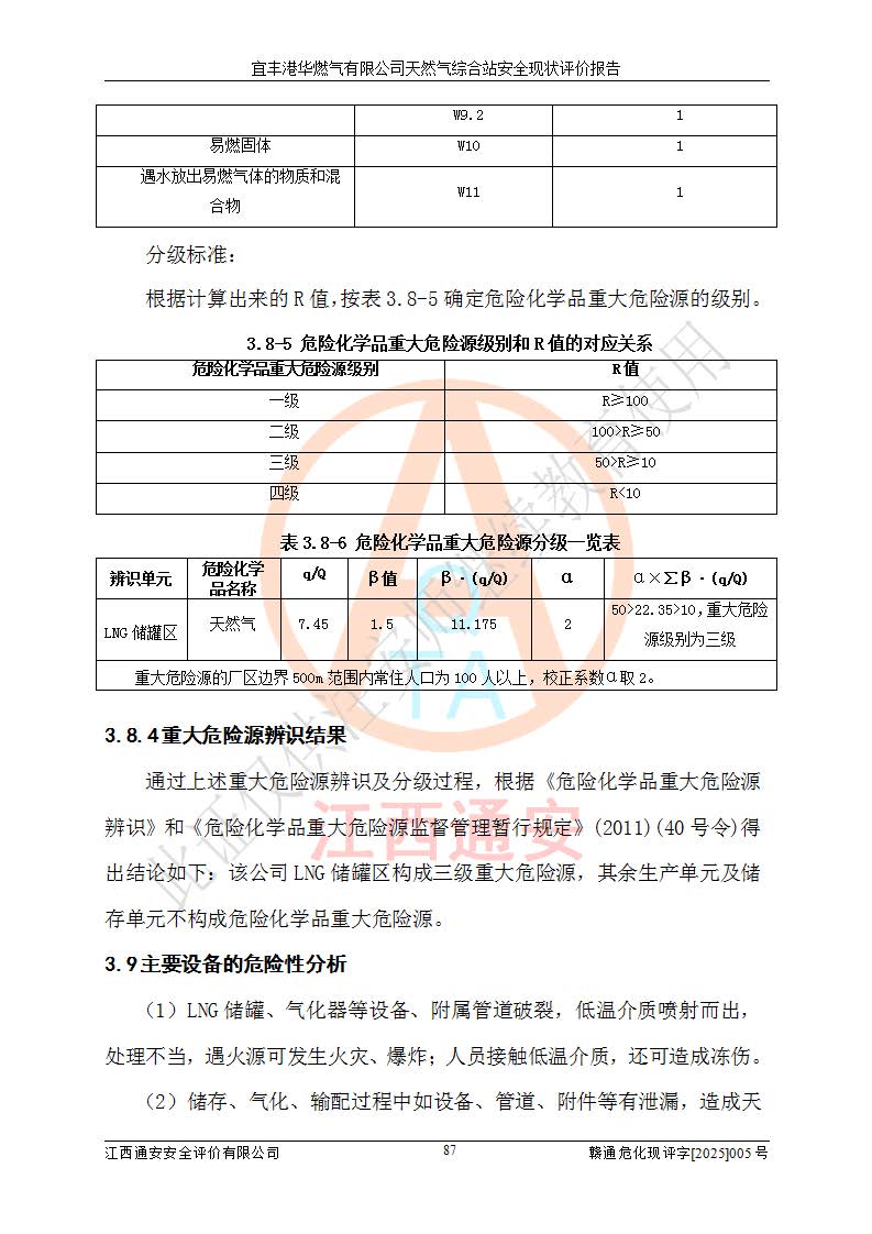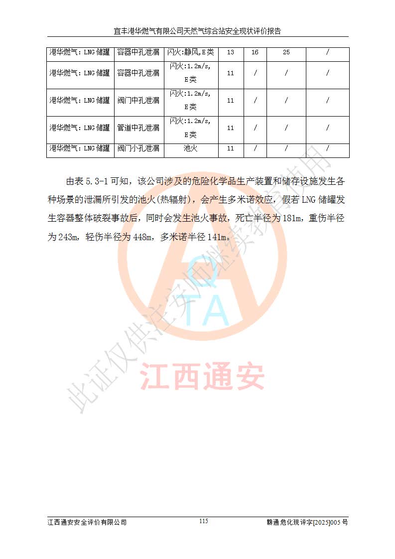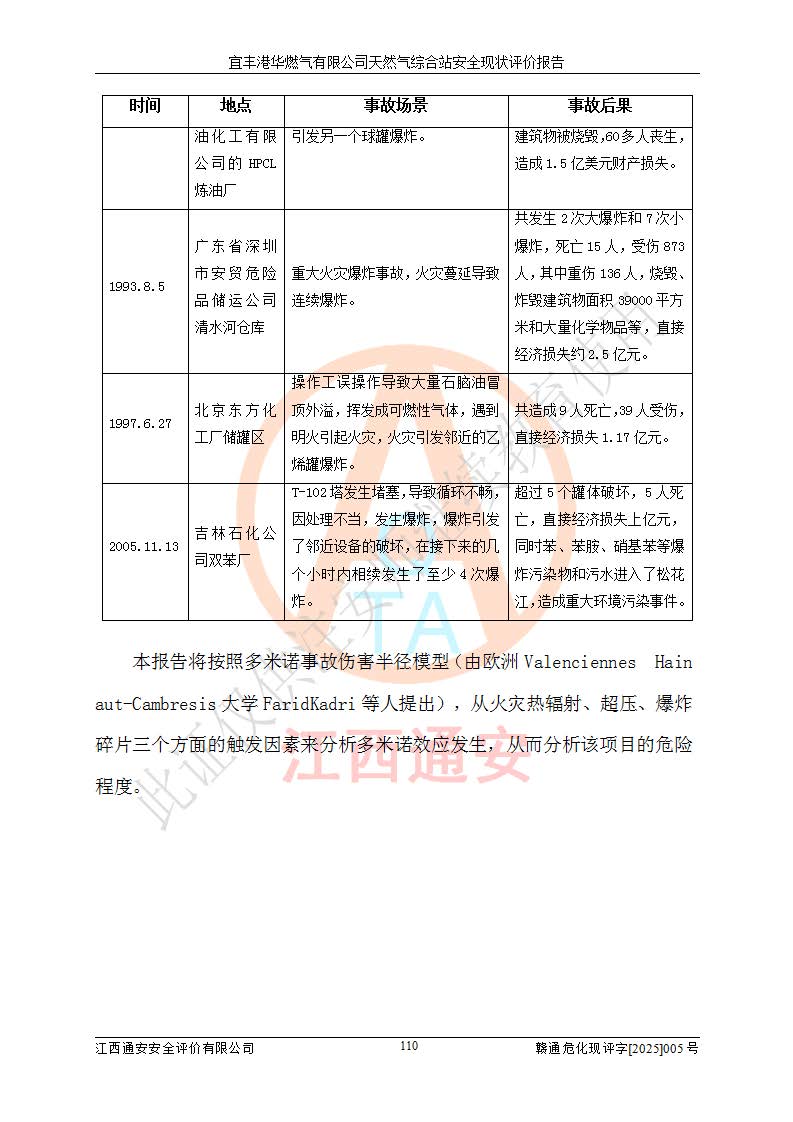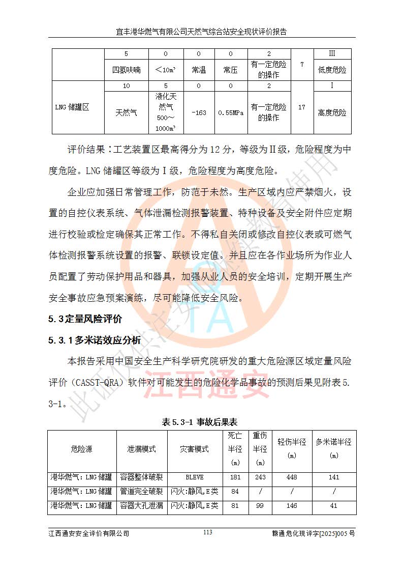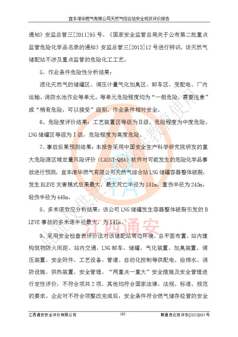 1、主要危险、危害因素辨识结果 宜丰港华燃气有限公司天然气综合站在生产经营过程中存在的主要危险有:火灾与爆炸、中毒窒息、触电、机械伤害、物体打击、**伤害、高处坠落、灼烫、低温冻伤、容器爆炸、淹溺等,存在的主要危害因素有:化学因素、物理因素(噪声、高温等)等,同时存在人为失误和管理缺陷。应重点防范的主要危险为火灾与爆炸、容器爆炸。 2、危险化学品辨识结果 经辨识,该储配站涉及的天然气、四氢噻吩及柴油属于危险化学品,天然气属于重点监管的危险化学品和特别管控危险化学品,不涉及监控化学品、易制毒化学品、易制爆危险化学品、剧毒化学品和高毒物品等危险化学品。 3、危险化学品重大危险源辨识结果 根据《危险化学品重大危险源辨识》(GB18218-2018)和《危险化学品重大危险源监督管理暂行规定》(2011)(40号令)(2015年 **安监总局令第79号修订)得出结论如下:该公司LNG储罐区构成三级重大危险源,其余生产单元及储存单元不构成危险化学品重大危险源。 4、重点监管危险化工工艺辨识结果 根据《**安全监管总局关于公布首批重点监管的危险化学品名录的通知》安监总管三[2011]95号、《**安全监管总局关于公布第二批重点监管危险化学品名录的通知》安监总管三[2013]12号进行辨识,该天然气储配站不涉及重点监管的危险化工工艺。 5、作业条件危险性分析结果: 液化天然气的储罐区、调压计量气化加臭区、卸车区、变配电、厂内运输、消防水池作业等单元。等单元危险程度均为“一般危险,需要注意”或“稍有危险,可以接受”级别。作业条件相对安全。 6、危险度评价结果:工艺装置区等级为Ⅱ级,危险程度为中度危险。LNG储罐区等级为Ⅰ级,危险程度为**危险。 7、事故后果预测结果:本报告采用中国安全生产科学研究院研发的重大危险源区域定量风险评价(CASST-QRA)软件对可能发生的危险化学品事故进行预测,宜丰港华燃气有限公司天然气综合站LNG储罐容器整体破裂,发生BLEVE灾害模式后果*大,*大死亡半径为181m,重伤半径为243m,轻伤半径为448m。 8、多米诺效应分析结果:该公司LNG储罐发生容器整体破裂引发的BLEVE事故的多米诺半径*大,为141m。 9、采用安全检查表评价法对该储配站周边环境、总平面布置、站内建构筑物防火间距、站内交通、LNG卸车、储罐、气化装置、加臭装置、调压装置、安全附件、工艺设备、管道、自动化控制等供配电、给排水、消防设施、供热装置、安全管理、“两重点一重大”安全措施及安全管理进行定性评价,不符合项共2项,其他均符合**法律、法规、标准、规范的要求。 (1)企业对不符合项整改完成后,安全条件符合燃气储存经营的安全要求。 (2)该储配站涉及“两重点一重大”,采取了首批重点监管的危险化学品安全措施和应急处置措施,站内LNG罐区构成三级重大危险源,采取的重大危险源安全技术和监控措施符合相关要求。 (3)根据《燃气经营许可管理办法》(建城〔2014〕167号发布,建城规〔2019〕2号修改)制成安全检查表对该单位的经营条件逐一检查,检查结果符合要求。 (4)根据《住房城乡建设部关于印发《城镇燃气经营安全重大隐患判定标准》的通知》(建城规[2023]4号)要求,对该项目重大隐患情况进行检查,该站LNG罐完成整改后不涉及重大隐患。 评价结论 综上所述,宜丰港华燃气有限公司天然气综合站选址和总平面布置合理,建构筑物间的防火间距、耐火等级等符合标准规范的要求,LNG卸车、储存、加臭、气化调压计量等装置采用成熟的工艺和设备,本质安全程度较高;公司制定了安全管理制度和操作规程,人员经培训合格后上岗,主要负责人、安全管理人员及特种作业人员均取得了相应的考核合格资格证书,能按照法律法规要求开展安全生产管理工作。公司对现场存在事故危险的设施和场所采取了合理可行的防护措施和科学的管理,使生产过程中的危险有害因素能得到**控制。该项目安全设施符合**现行有关法律、法规、标准的要求。企业对现场存在的安全问题进行了整改,主要的安全缺陷消除。 综合结论:宜丰港华燃气有限公司天然气综合站的安全条件符合燃气安全运行要求。 |