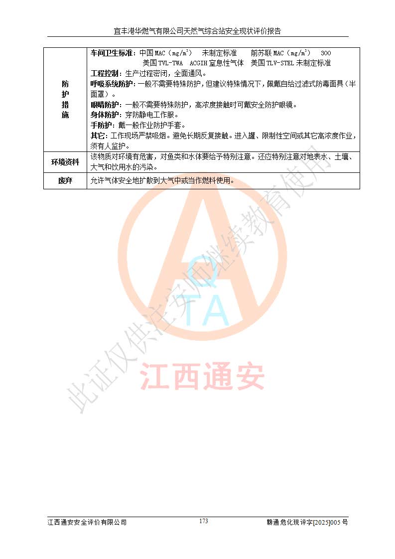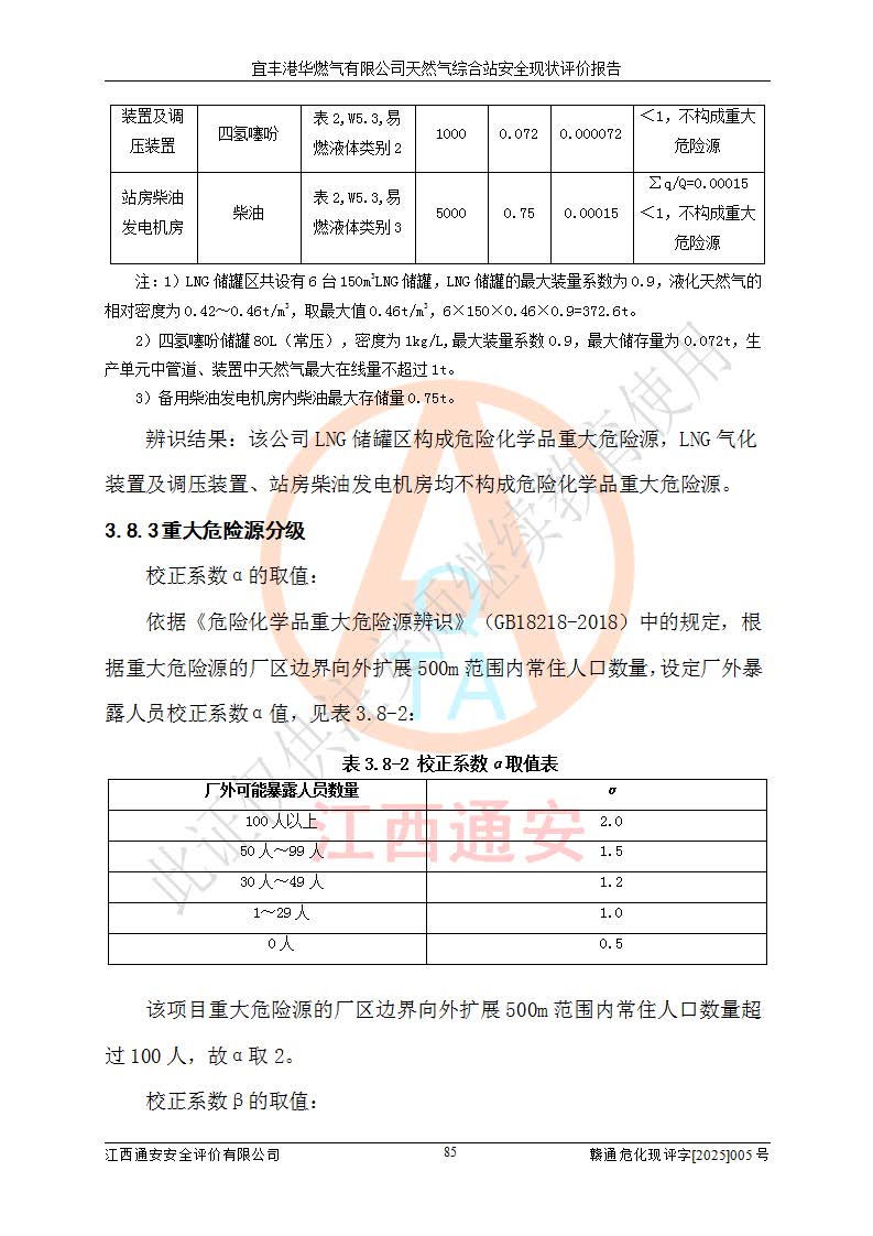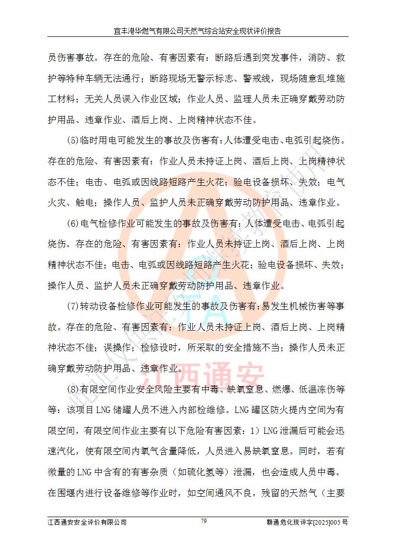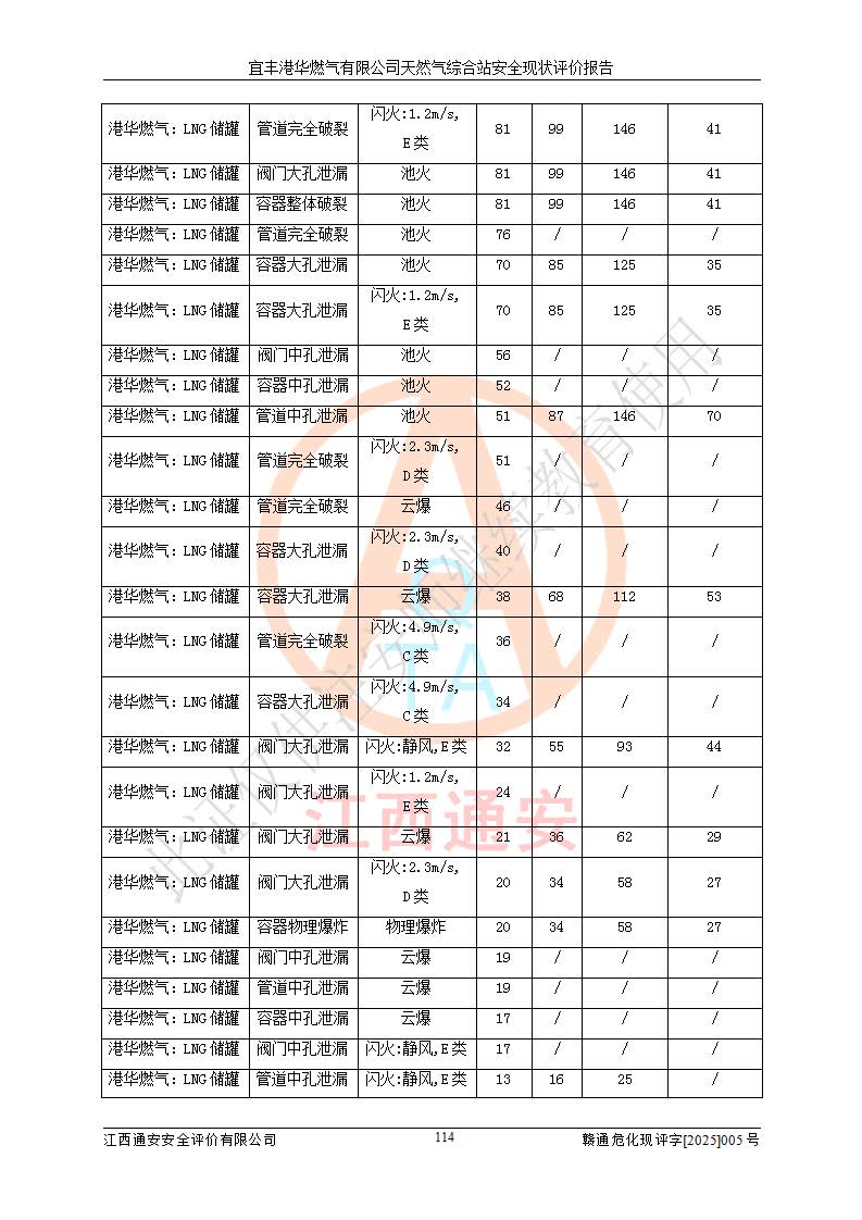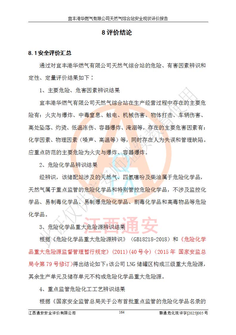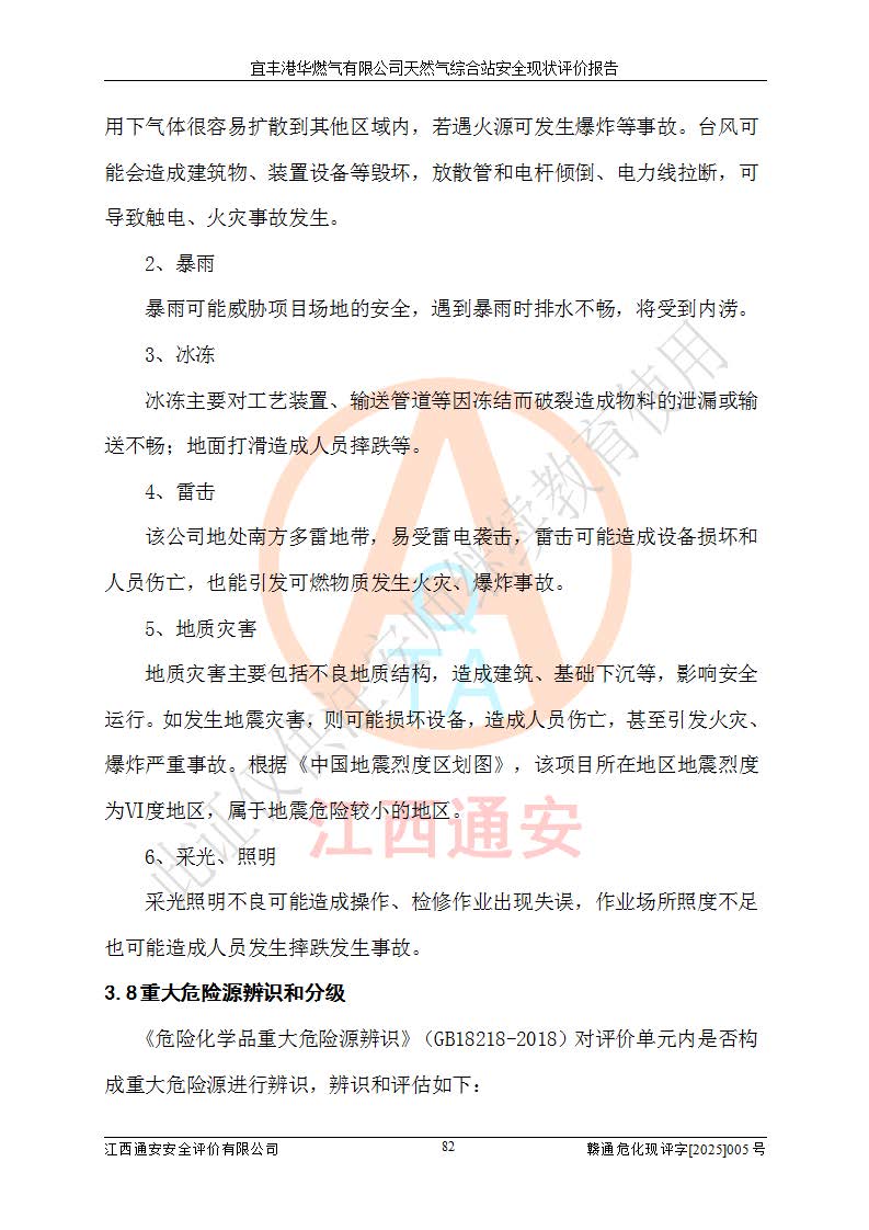 1、主要危险、危害因素辨识结果 宜丰港华燃气有限公司天然气综合站在生产经营过程中存在的主要危险有:火灾与爆炸、中毒窒息、触电、机械伤害、物体打击、**伤害、高处坠落、灼烫、低温冻伤、容器爆炸、淹溺等,存在的主要危害因素有:化学因素、物理因素(噪声、高温等)等,同时存在人为失误和管理缺陷。应重点防范的主要危险为火灾与爆炸、容器爆炸。 2、危险化学品辨识结果 经辨识,该储配站涉及的天然气、四氢噻吩及柴油属于危险化学品,天然气属于重点监管的危险化学品和特别管控危险化学品,不涉及监控化学品、易制毒化学品、易制爆危险化学品、剧毒化学品和高毒物品等危险化学品。 3、危险化学品重大危险源辨识结果 根据《危险化学品重大危险源辨识》(GB18218-2018)和《危险化学品重大危险源监督管理暂行规定》(2011)(40号令)(2015年 **安监总局令第79号修订)得出结论如下:该公司LNG储罐区构成三级重大危险源,其余生产单元及储存单元不构成危险化学品重大危险源。 4、重点监管危险化工工艺辨识结果 根据《**安全监管总局关于公布首批重点监管的危险化学品名录的通知》安监总管三[2011]95号、《**安全监管总局关于公布第二批重点监管危险化学品名录的通知》安监总管三[2013]12号进行辨识,该天然气储配站不涉及重点监管的危险化工工艺。 5、作业条件危险性分析结果: 液化天然气的储罐区、调压计量气化加臭区、卸车区、变配电、厂内运输、消防水池作业等单元。等单元危险程度均为“一般危险,需要注意”或“稍有危险,可以接受”级别。作业条件相对安全。 6、危险度评价结果:工艺装置区等级为Ⅱ级,危险程度为中度危险。LNG储罐区等级为Ⅰ级,危险程度为**危险。 7、事故后果预测结果:本报告采用中国安全生产科学研究院研发的重大危险源区域定量风险评价(CASST-QRA)软件对可能发生的危险化学品事故进行预测,宜丰港华燃气有限公司天然气综合站LNG储罐容器整体破裂,发生BLEVE灾害模式后果*大,*大死亡半径为181m,重伤半径为243m,轻伤半径为448m。 8、多米诺效应分析结果:该公司LNG储罐发生容器整体破裂引发的BLEVE事故的多米诺半径*大,为141m。 9、采用安全检查表评价法对该储配站周边环境、总平面布置、站内建构筑物防火间距、站内交通、LNG卸车、储罐、气化装置、加臭装置、调压装置、安全附件、工艺设备、管道、自动化控制等供配电、给排水、消防设施、供热装置、安全管理、“两重点一重大”安全措施及安全管理进行定性评价,不符合项共2项,其他均符合**法律、法规、标准、规范的要求。 (1)企业对不符合项整改完成后,安全条件符合燃气储存经营的安全要求。 (2)该储配站涉及“两重点一重大”,采取了首批重点监管的危险化学品安全措施和应急处置措施,站内LNG罐区构成三级重大危险源,采取的重大危险源安全技术和监控措施符合相关要求。 (3)根据《燃气经营许可管理办法》(建城〔2014〕167号发布,建城规〔2019〕2号修改)制成安全检查表对该单位的经营条件逐一检查,检查结果符合要求。 (4)根据《住房城乡建设部关于印发《城镇燃气经营安全重大隐患判定标准》的通知》(建城规[2023]4号)要求,对该项目重大隐患情况进行检查,该站LNG罐完成整改后不涉及重大隐患。 评价结论 综上所述,宜丰港华燃气有限公司天然气综合站选址和总平面布置合理,建构筑物间的防火间距、耐火等级等符合标准规范的要求,LNG卸车、储存、加臭、气化调压计量等装置采用成熟的工艺和设备,本质安全程度较高;公司制定了安全管理制度和操作规程,人员经培训合格后上岗,主要负责人、安全管理人员及特种作业人员均取得了相应的考核合格资格证书,能按照法律法规要求开展安全生产管理工作。公司对现场存在事故危险的设施和场所采取了合理可行的防护措施和科学的管理,使生产过程中的危险有害因素能得到**控制。该项目安全设施符合**现行有关法律、法规、标准的要求。企业对现场存在的安全问题进行了整改,主要的安全缺陷消除。 综合结论:宜丰港华燃气有限公司天然气综合站的安全条件符合燃气安全运行要求。 |