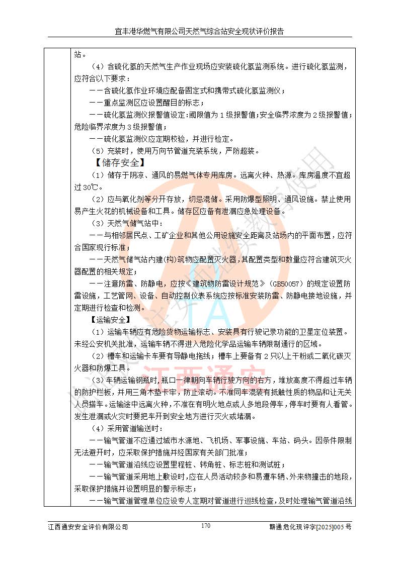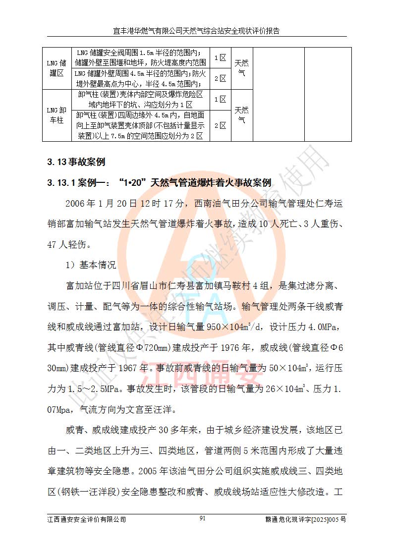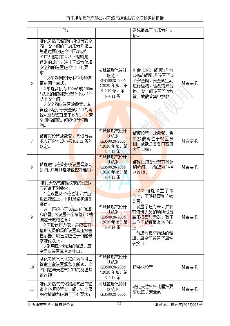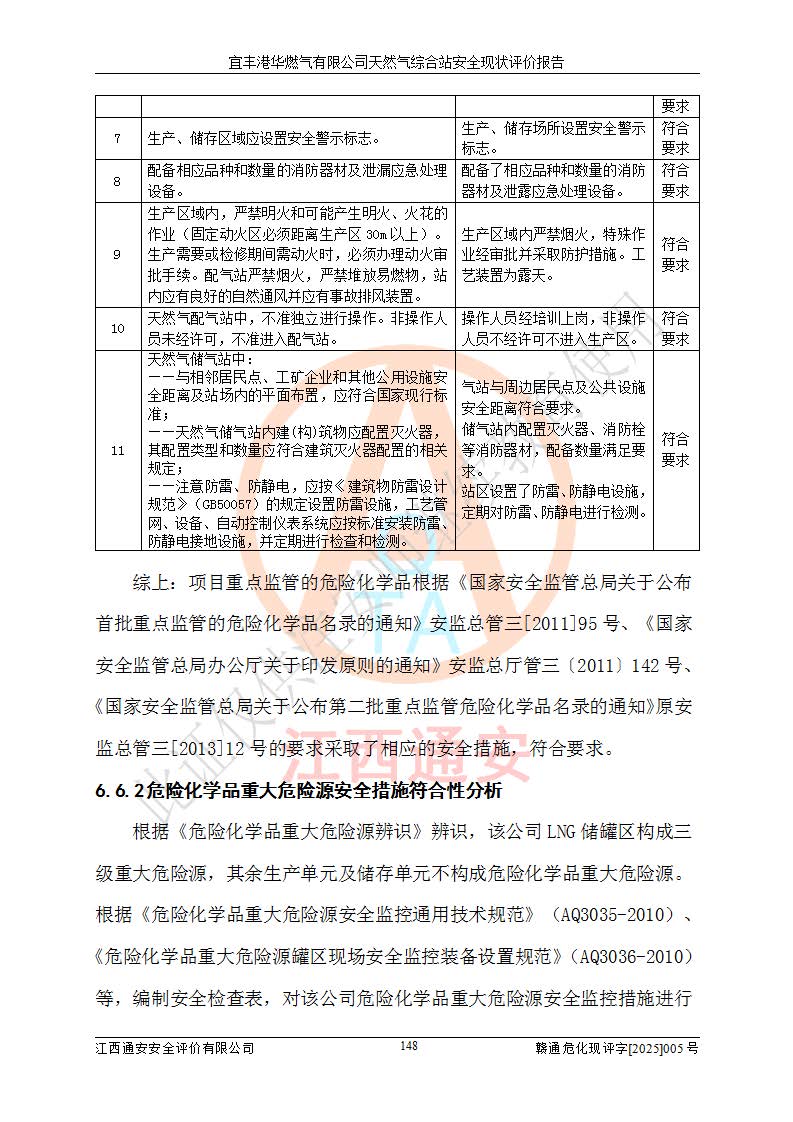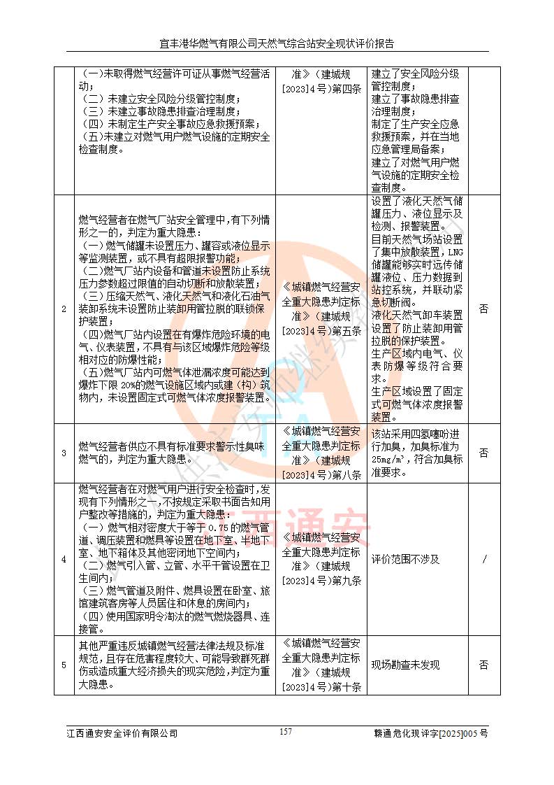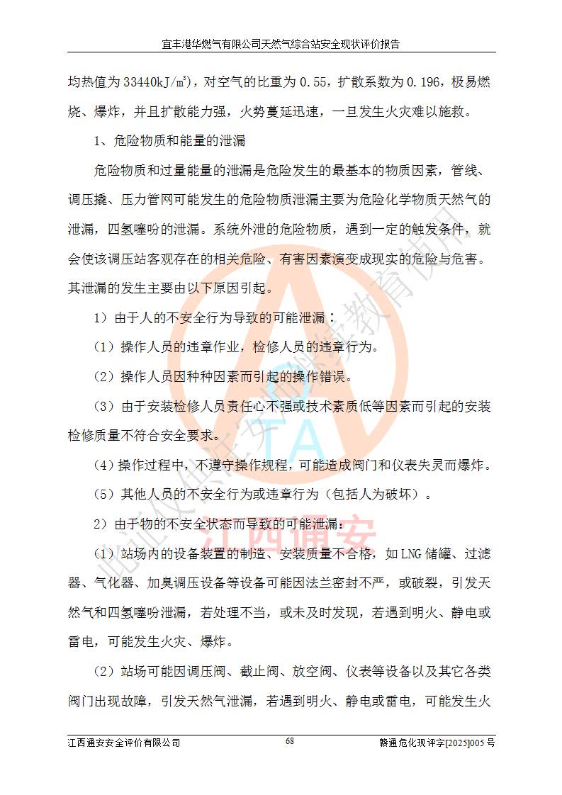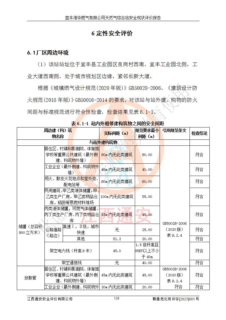 1、主要危险、危害因素辨识结果 宜丰港华燃气有限公司天然气综合站在生产经营过程中存在的主要危险有:火灾与爆炸、中毒窒息、触电、机械伤害、物体打击、**伤害、高处坠落、灼烫、低温冻伤、容器爆炸、淹溺等,存在的主要危害因素有:化学因素、物理因素(噪声、高温等)等,同时存在人为失误和管理缺陷。应重点防范的主要危险为火灾与爆炸、容器爆炸。 2、危险化学品辨识结果 经辨识,该储配站涉及的天然气、四氢噻吩及柴油属于危险化学品,天然气属于重点监管的危险化学品和特别管控危险化学品,不涉及监控化学品、易制毒化学品、易制爆危险化学品、剧毒化学品和高毒物品等危险化学品。 3、危险化学品重大危险源辨识结果 根据《危险化学品重大危险源辨识》(GB18218-2018)和《危险化学品重大危险源监督管理暂行规定》(2011)(40号令)(2015年 **安监总局令第79号修订)得出结论如下:该公司LNG储罐区构成三级重大危险源,其余生产单元及储存单元不构成危险化学品重大危险源。 4、重点监管危险化工工艺辨识结果 根据《**安全监管总局关于公布首批重点监管的危险化学品名录的通知》安监总管三[2011]95号、《**安全监管总局关于公布第二批重点监管危险化学品名录的通知》安监总管三[2013]12号进行辨识,该天然气储配站不涉及重点监管的危险化工工艺。 5、作业条件危险性分析结果: 液化天然气的储罐区、调压计量气化加臭区、卸车区、变配电、厂内运输、消防水池作业等单元。等单元危险程度均为“一般危险,需要注意”或“稍有危险,可以接受”级别。作业条件相对安全。 6、危险度评价结果:工艺装置区等级为Ⅱ级,危险程度为中度危险。LNG储罐区等级为Ⅰ级,危险程度为**危险。 7、事故后果预测结果:本报告采用中国安全生产科学研究院研发的重大危险源区域定量风险评价(CASST-QRA)软件对可能发生的危险化学品事故进行预测,宜丰港华燃气有限公司天然气综合站LNG储罐容器整体破裂,发生BLEVE灾害模式后果*大,*大死亡半径为181m,重伤半径为243m,轻伤半径为448m。 8、多米诺效应分析结果:该公司LNG储罐发生容器整体破裂引发的BLEVE事故的多米诺半径*大,为141m。 9、采用安全检查表评价法对该储配站周边环境、总平面布置、站内建构筑物防火间距、站内交通、LNG卸车、储罐、气化装置、加臭装置、调压装置、安全附件、工艺设备、管道、自动化控制等供配电、给排水、消防设施、供热装置、安全管理、“两重点一重大”安全措施及安全管理进行定性评价,不符合项共2项,其他均符合**法律、法规、标准、规范的要求。 (1)企业对不符合项整改完成后,安全条件符合燃气储存经营的安全要求。 (2)该储配站涉及“两重点一重大”,采取了首批重点监管的危险化学品安全措施和应急处置措施,站内LNG罐区构成三级重大危险源,采取的重大危险源安全技术和监控措施符合相关要求。 (3)根据《燃气经营许可管理办法》(建城〔2014〕167号发布,建城规〔2019〕2号修改)制成安全检查表对该单位的经营条件逐一检查,检查结果符合要求。 (4)根据《住房城乡建设部关于印发《城镇燃气经营安全重大隐患判定标准》的通知》(建城规[2023]4号)要求,对该项目重大隐患情况进行检查,该站LNG罐完成整改后不涉及重大隐患。 评价结论 综上所述,宜丰港华燃气有限公司天然气综合站选址和总平面布置合理,建构筑物间的防火间距、耐火等级等符合标准规范的要求,LNG卸车、储存、加臭、气化调压计量等装置采用成熟的工艺和设备,本质安全程度较高;公司制定了安全管理制度和操作规程,人员经培训合格后上岗,主要负责人、安全管理人员及特种作业人员均取得了相应的考核合格资格证书,能按照法律法规要求开展安全生产管理工作。公司对现场存在事故危险的设施和场所采取了合理可行的防护措施和科学的管理,使生产过程中的危险有害因素能得到**控制。该项目安全设施符合**现行有关法律、法规、标准的要求。企业对现场存在的安全问题进行了整改,主要的安全缺陷消除。 综合结论:宜丰港华燃气有限公司天然气综合站的安全条件符合燃气安全运行要求。 |