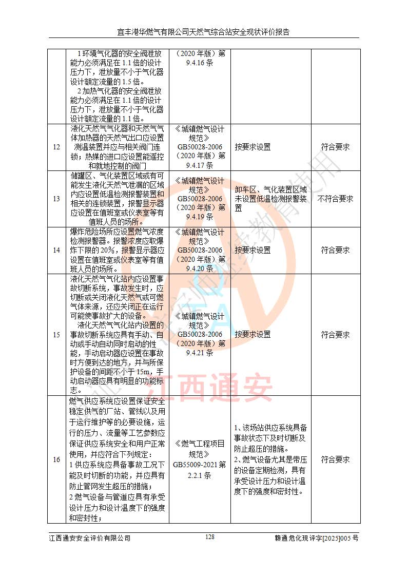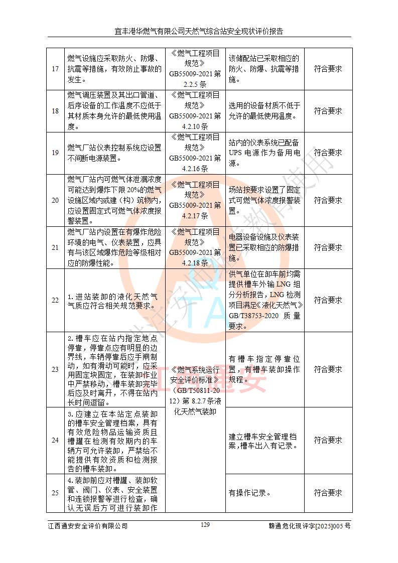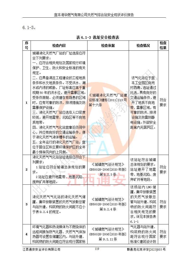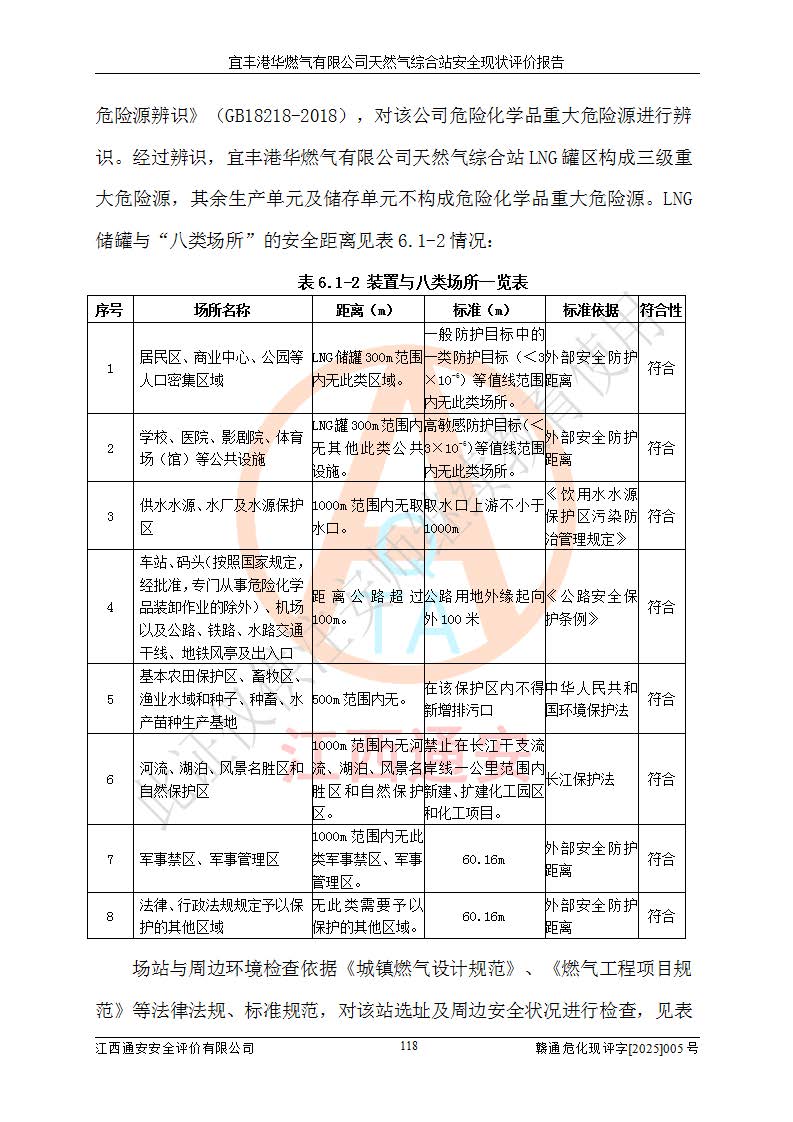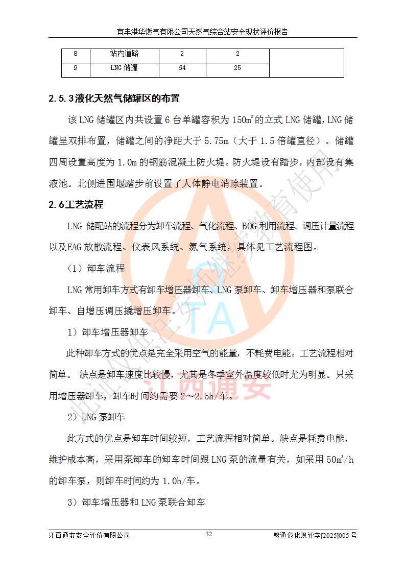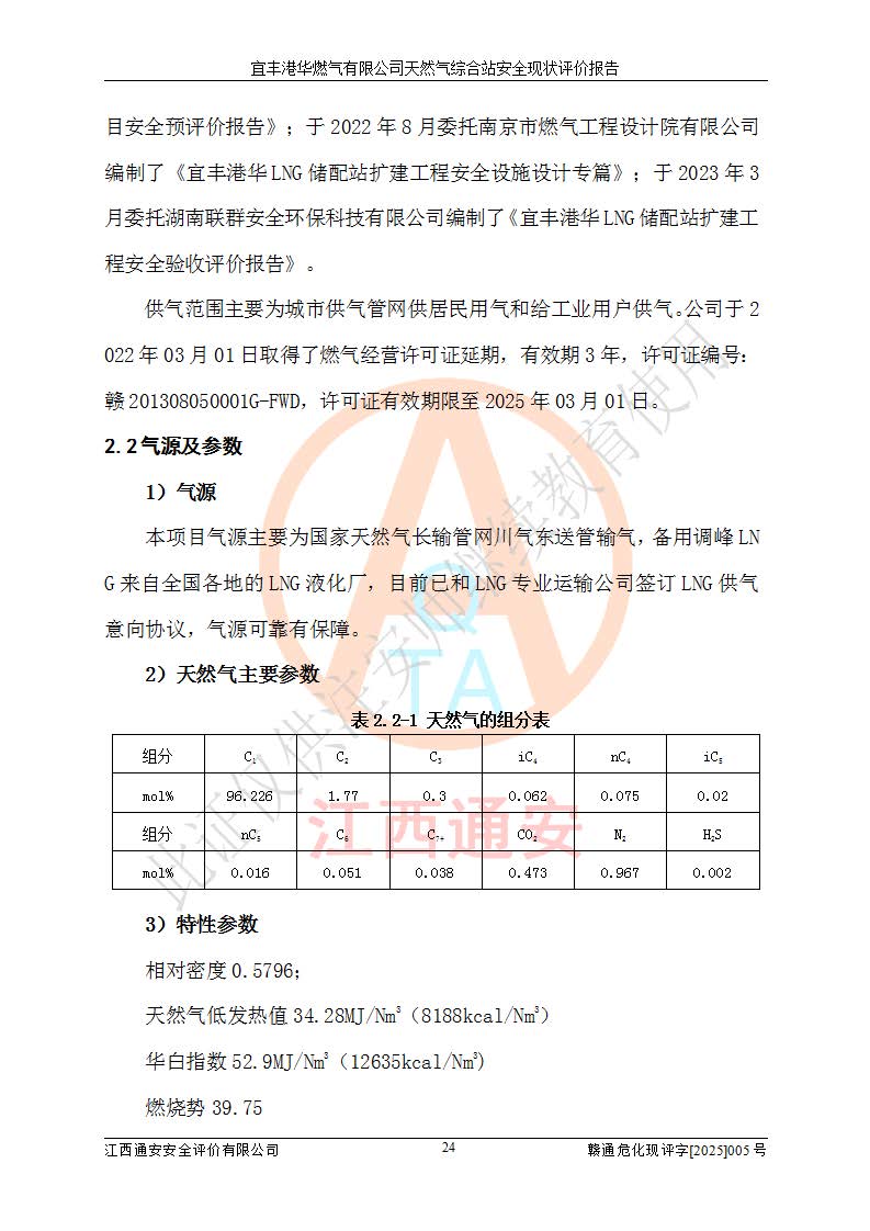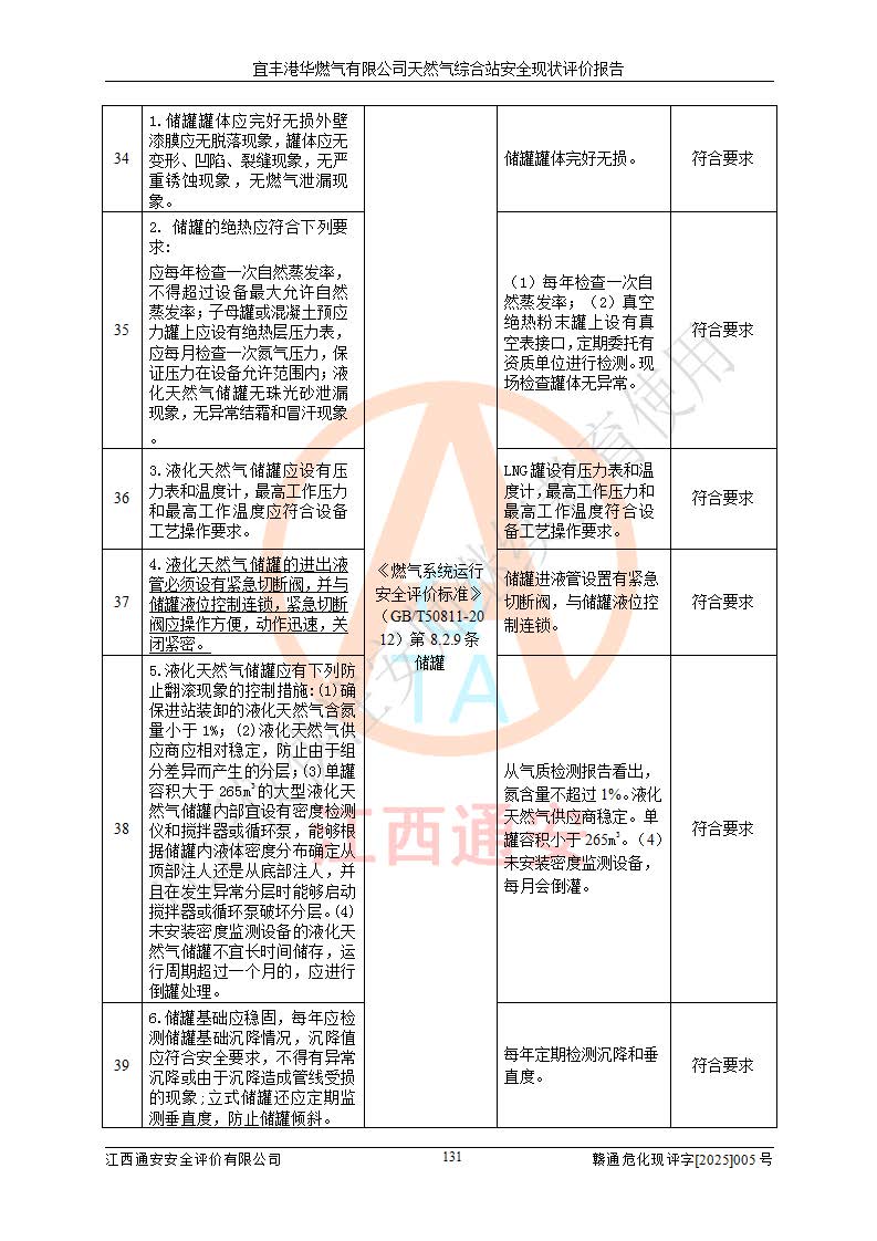 1、主要危险、危害因素辨识结果 宜丰港华燃气有限公司天然气综合站在生产经营过程中存在的主要危险有:火灾与爆炸、中毒窒息、触电、机械伤害、物体打击、**伤害、高处坠落、灼烫、低温冻伤、容器爆炸、淹溺等,存在的主要危害因素有:化学因素、物理因素(噪声、高温等)等,同时存在人为失误和管理缺陷。应重点防范的主要危险为火灾与爆炸、容器爆炸。 2、危险化学品辨识结果 经辨识,该储配站涉及的天然气、四氢噻吩及柴油属于危险化学品,天然气属于重点监管的危险化学品和特别管控危险化学品,不涉及监控化学品、易制毒化学品、易制爆危险化学品、剧毒化学品和高毒物品等危险化学品。 3、危险化学品重大危险源辨识结果 根据《危险化学品重大危险源辨识》(GB18218-2018)和《危险化学品重大危险源监督管理暂行规定》(2011)(40号令)(2015年 **安监总局令第79号修订)得出结论如下:该公司LNG储罐区构成三级重大危险源,其余生产单元及储存单元不构成危险化学品重大危险源。 4、重点监管危险化工工艺辨识结果 根据《**安全监管总局关于公布首批重点监管的危险化学品名录的通知》安监总管三[2011]95号、《**安全监管总局关于公布第二批重点监管危险化学品名录的通知》安监总管三[2013]12号进行辨识,该天然气储配站不涉及重点监管的危险化工工艺。 5、作业条件危险性分析结果: 液化天然气的储罐区、调压计量气化加臭区、卸车区、变配电、厂内运输、消防水池作业等单元。等单元危险程度均为“一般危险,需要注意”或“稍有危险,可以接受”级别。作业条件相对安全。 6、危险度评价结果:工艺装置区等级为Ⅱ级,危险程度为中度危险。LNG储罐区等级为Ⅰ级,危险程度为**危险。 7、事故后果预测结果:本报告采用中国安全生产科学研究院研发的重大危险源区域定量风险评价(CASST-QRA)软件对可能发生的危险化学品事故进行预测,宜丰港华燃气有限公司天然气综合站LNG储罐容器整体破裂,发生BLEVE灾害模式后果*大,*大死亡半径为181m,重伤半径为243m,轻伤半径为448m。 8、多米诺效应分析结果:该公司LNG储罐发生容器整体破裂引发的BLEVE事故的多米诺半径*大,为141m。 9、采用安全检查表评价法对该储配站周边环境、总平面布置、站内建构筑物防火间距、站内交通、LNG卸车、储罐、气化装置、加臭装置、调压装置、安全附件、工艺设备、管道、自动化控制等供配电、给排水、消防设施、供热装置、安全管理、“两重点一重大”安全措施及安全管理进行定性评价,不符合项共2项,其他均符合**法律、法规、标准、规范的要求。 (1)企业对不符合项整改完成后,安全条件符合燃气储存经营的安全要求。 (2)该储配站涉及“两重点一重大”,采取了首批重点监管的危险化学品安全措施和应急处置措施,站内LNG罐区构成三级重大危险源,采取的重大危险源安全技术和监控措施符合相关要求。 (3)根据《燃气经营许可管理办法》(建城〔2014〕167号发布,建城规〔2019〕2号修改)制成安全检查表对该单位的经营条件逐一检查,检查结果符合要求。 (4)根据《住房城乡建设部关于印发《城镇燃气经营安全重大隐患判定标准》的通知》(建城规[2023]4号)要求,对该项目重大隐患情况进行检查,该站LNG罐完成整改后不涉及重大隐患。 评价结论 综上所述,宜丰港华燃气有限公司天然气综合站选址和总平面布置合理,建构筑物间的防火间距、耐火等级等符合标准规范的要求,LNG卸车、储存、加臭、气化调压计量等装置采用成熟的工艺和设备,本质安全程度较高;公司制定了安全管理制度和操作规程,人员经培训合格后上岗,主要负责人、安全管理人员及特种作业人员均取得了相应的考核合格资格证书,能按照法律法规要求开展安全生产管理工作。公司对现场存在事故危险的设施和场所采取了合理可行的防护措施和科学的管理,使生产过程中的危险有害因素能得到**控制。该项目安全设施符合**现行有关法律、法规、标准的要求。企业对现场存在的安全问题进行了整改,主要的安全缺陷消除。 综合结论:宜丰港华燃气有限公司天然气综合站的安全条件符合燃气安全运行要求。 |