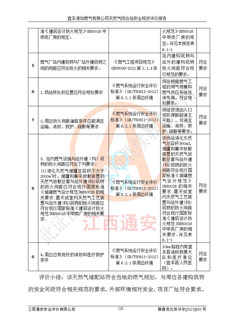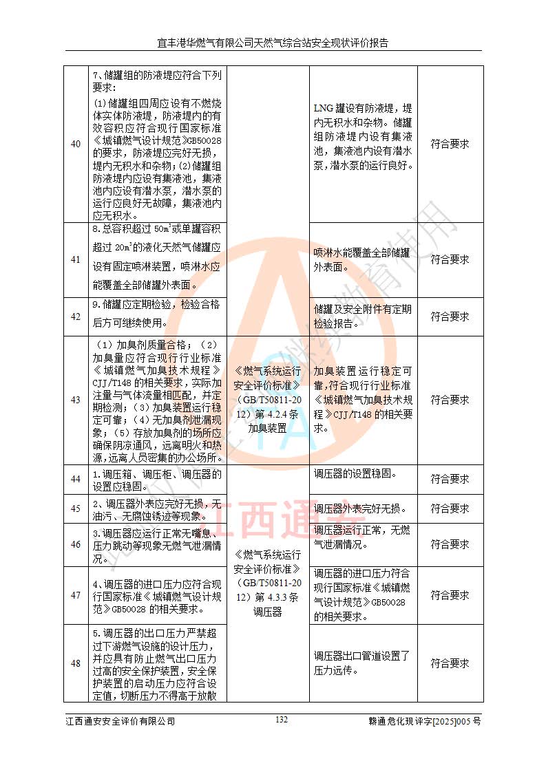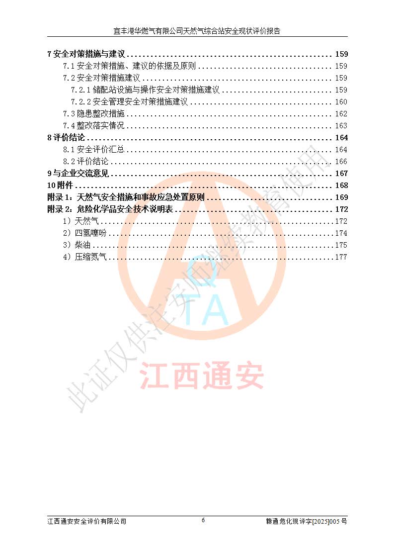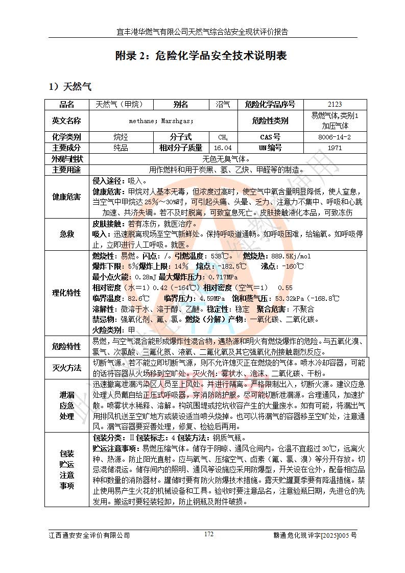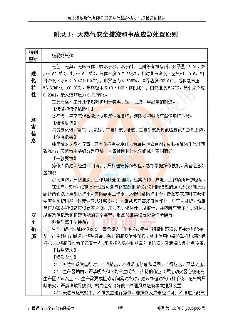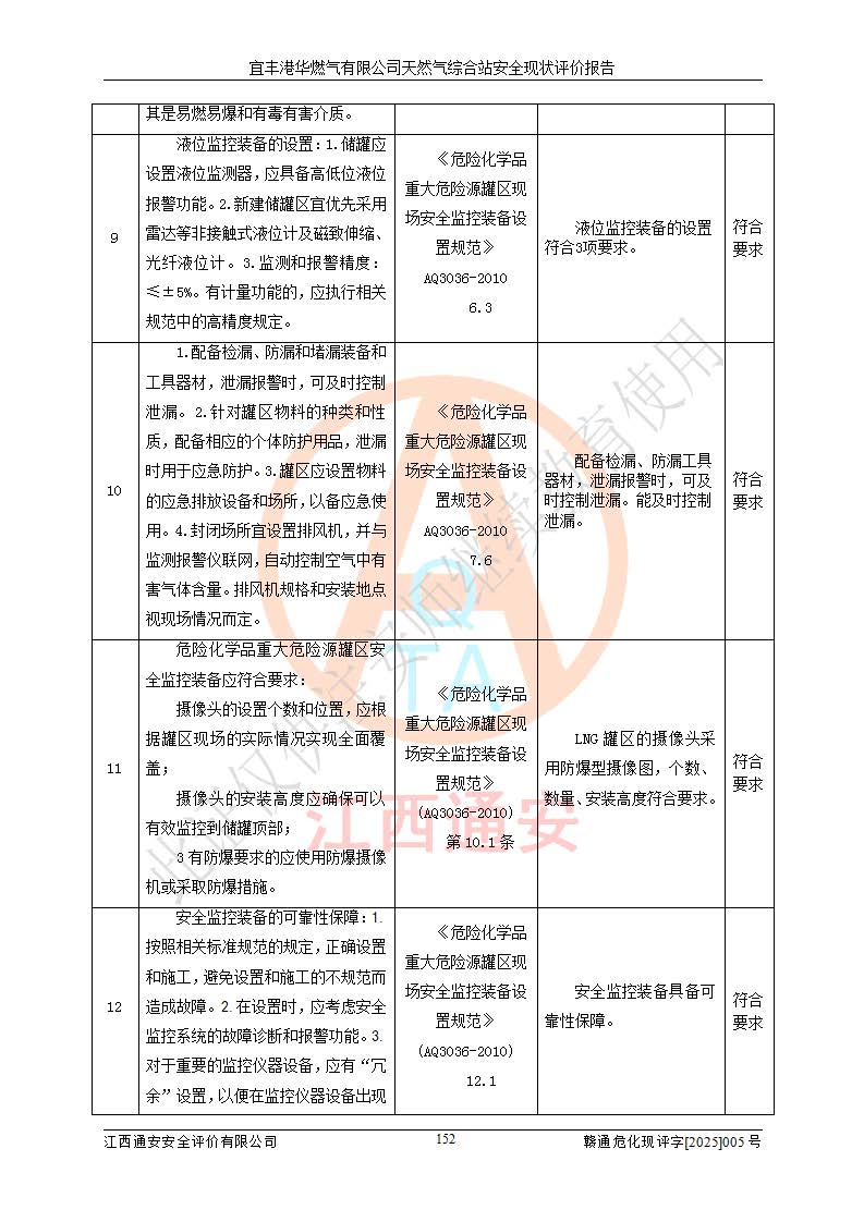 1、主要危险、危害因素辨识结果 宜丰港华燃气有限公司天然气综合站在生产经营过程中存在的主要危险有:火灾与爆炸、中毒窒息、触电、机械伤害、物体打击、**伤害、高处坠落、灼烫、低温冻伤、容器爆炸、淹溺等,存在的主要危害因素有:化学因素、物理因素(噪声、高温等)等,同时存在人为失误和管理缺陷。应重点防范的主要危险为火灾与爆炸、容器爆炸。 2、危险化学品辨识结果 经辨识,该储配站涉及的天然气、四氢噻吩及柴油属于危险化学品,天然气属于重点监管的危险化学品和特别管控危险化学品,不涉及监控化学品、易制毒化学品、易制爆危险化学品、剧毒化学品和高毒物品等危险化学品。 3、危险化学品重大危险源辨识结果 根据《危险化学品重大危险源辨识》(GB18218-2018)和《危险化学品重大危险源监督管理暂行规定》(2011)(40号令)(2015年 **安监总局令第79号修订)得出结论如下:该公司LNG储罐区构成三级重大危险源,其余生产单元及储存单元不构成危险化学品重大危险源。 4、重点监管危险化工工艺辨识结果 根据《**安全监管总局关于公布首批重点监管的危险化学品名录的通知》安监总管三[2011]95号、《**安全监管总局关于公布第二批重点监管危险化学品名录的通知》安监总管三[2013]12号进行辨识,该天然气储配站不涉及重点监管的危险化工工艺。 5、作业条件危险性分析结果: 液化天然气的储罐区、调压计量气化加臭区、卸车区、变配电、厂内运输、消防水池作业等单元。等单元危险程度均为“一般危险,需要注意”或“稍有危险,可以接受”级别。作业条件相对安全。 6、危险度评价结果:工艺装置区等级为Ⅱ级,危险程度为中度危险。LNG储罐区等级为Ⅰ级,危险程度为**危险。 7、事故后果预测结果:本报告采用中国安全生产科学研究院研发的重大危险源区域定量风险评价(CASST-QRA)软件对可能发生的危险化学品事故进行预测,宜丰港华燃气有限公司天然气综合站LNG储罐容器整体破裂,发生BLEVE灾害模式后果*大,*大死亡半径为181m,重伤半径为243m,轻伤半径为448m。 8、多米诺效应分析结果:该公司LNG储罐发生容器整体破裂引发的BLEVE事故的多米诺半径*大,为141m。 9、采用安全检查表评价法对该储配站周边环境、总平面布置、站内建构筑物防火间距、站内交通、LNG卸车、储罐、气化装置、加臭装置、调压装置、安全附件、工艺设备、管道、自动化控制等供配电、给排水、消防设施、供热装置、安全管理、“两重点一重大”安全措施及安全管理进行定性评价,不符合项共2项,其他均符合**法律、法规、标准、规范的要求。 (1)企业对不符合项整改完成后,安全条件符合燃气储存经营的安全要求。 (2)该储配站涉及“两重点一重大”,采取了首批重点监管的危险化学品安全措施和应急处置措施,站内LNG罐区构成三级重大危险源,采取的重大危险源安全技术和监控措施符合相关要求。 (3)根据《燃气经营许可管理办法》(建城〔2014〕167号发布,建城规〔2019〕2号修改)制成安全检查表对该单位的经营条件逐一检查,检查结果符合要求。 (4)根据《住房城乡建设部关于印发《城镇燃气经营安全重大隐患判定标准》的通知》(建城规[2023]4号)要求,对该项目重大隐患情况进行检查,该站LNG罐完成整改后不涉及重大隐患。 评价结论 综上所述,宜丰港华燃气有限公司天然气综合站选址和总平面布置合理,建构筑物间的防火间距、耐火等级等符合标准规范的要求,LNG卸车、储存、加臭、气化调压计量等装置采用成熟的工艺和设备,本质安全程度较高;公司制定了安全管理制度和操作规程,人员经培训合格后上岗,主要负责人、安全管理人员及特种作业人员均取得了相应的考核合格资格证书,能按照法律法规要求开展安全生产管理工作。公司对现场存在事故危险的设施和场所采取了合理可行的防护措施和科学的管理,使生产过程中的危险有害因素能得到**控制。该项目安全设施符合**现行有关法律、法规、标准的要求。企业对现场存在的安全问题进行了整改,主要的安全缺陷消除。 综合结论:宜丰港华燃气有限公司天然气综合站的安全条件符合燃气安全运行要求。 |