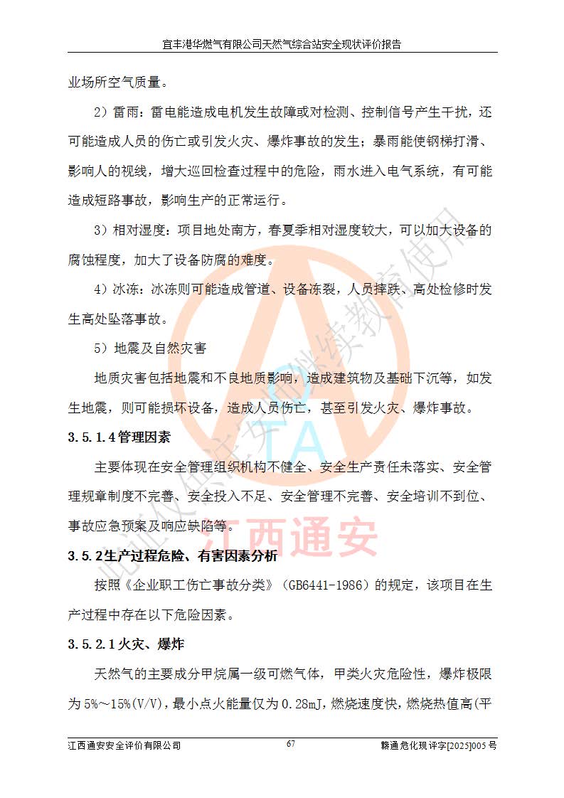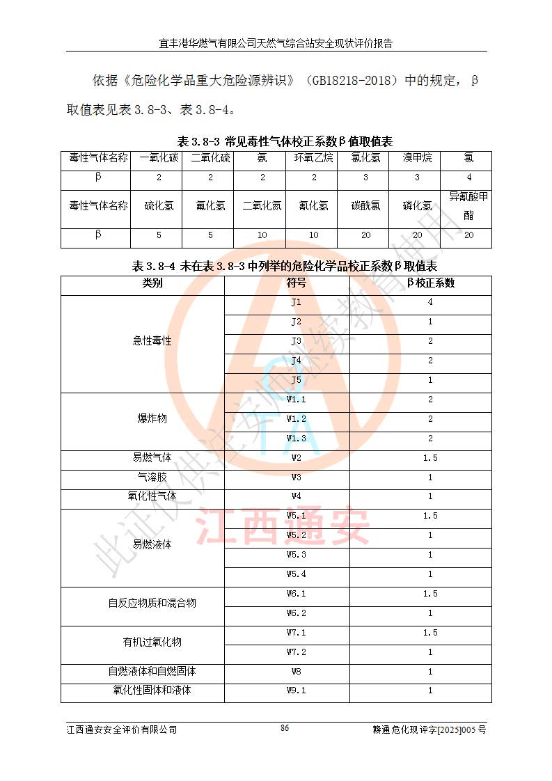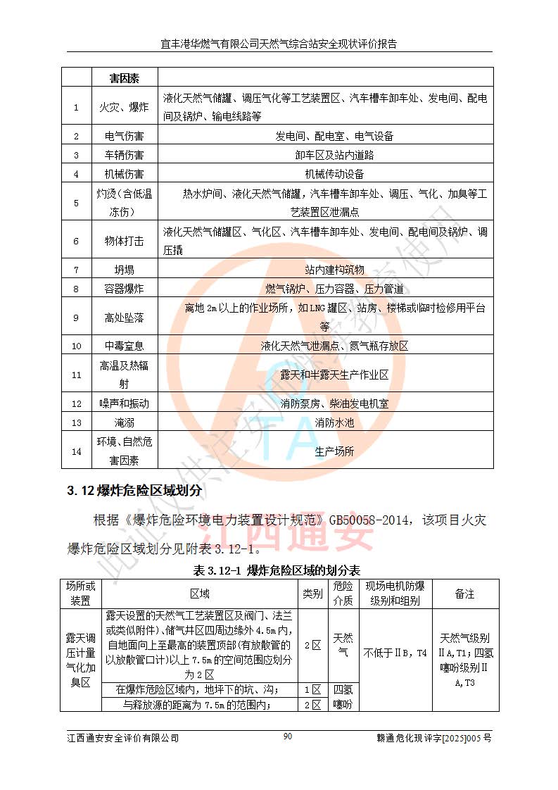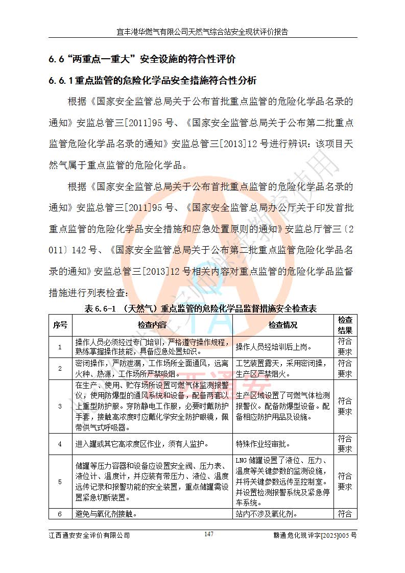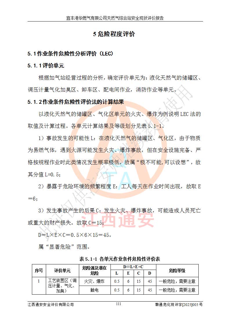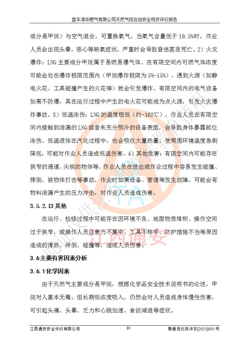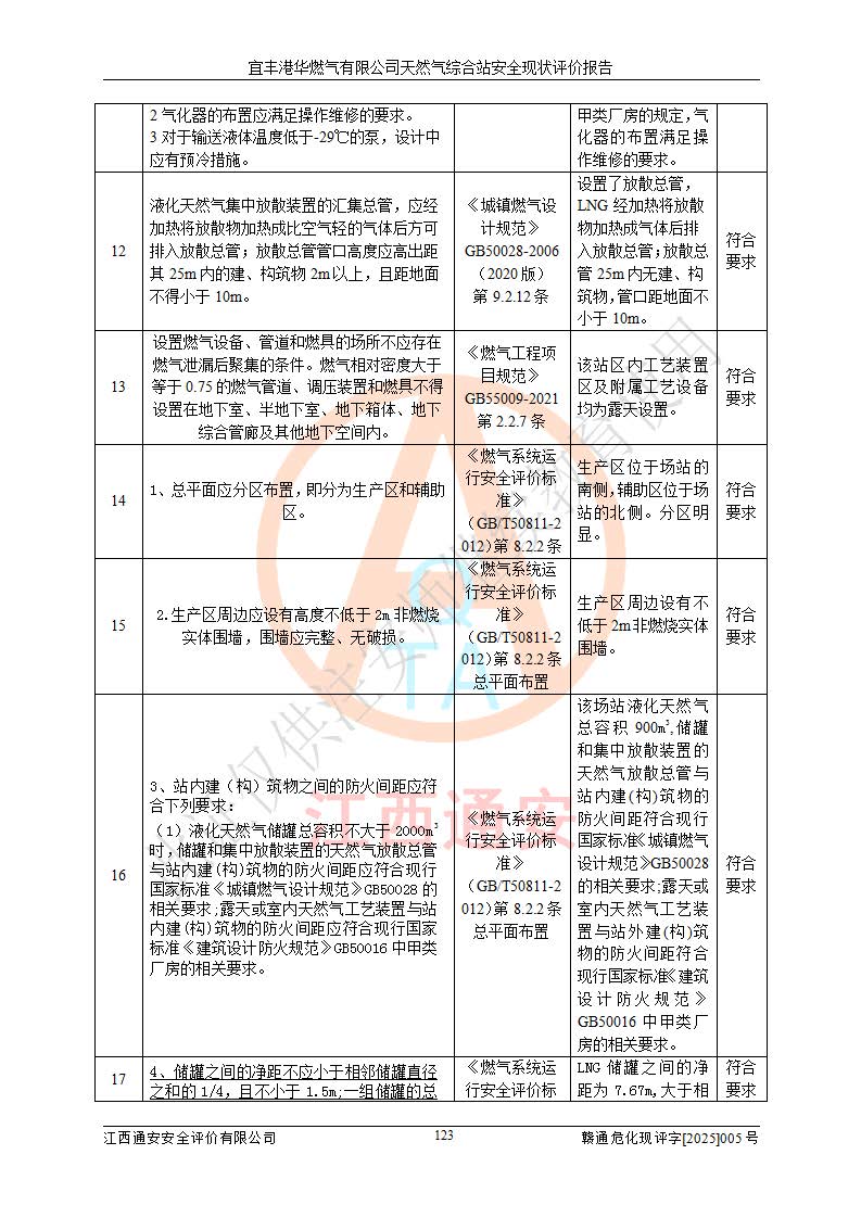 1、主要危险、危害因素辨识结果 宜丰港华燃气有限公司天然气综合站在生产经营过程中存在的主要危险有:火灾与爆炸、中毒窒息、触电、机械伤害、物体打击、**伤害、高处坠落、灼烫、低温冻伤、容器爆炸、淹溺等,存在的主要危害因素有:化学因素、物理因素(噪声、高温等)等,同时存在人为失误和管理缺陷。应重点防范的主要危险为火灾与爆炸、容器爆炸。 2、危险化学品辨识结果 经辨识,该储配站涉及的天然气、四氢噻吩及柴油属于危险化学品,天然气属于重点监管的危险化学品和特别管控危险化学品,不涉及监控化学品、易制毒化学品、易制爆危险化学品、剧毒化学品和高毒物品等危险化学品。 3、危险化学品重大危险源辨识结果 根据《危险化学品重大危险源辨识》(GB18218-2018)和《危险化学品重大危险源监督管理暂行规定》(2011)(40号令)(2015年 **安监总局令第79号修订)得出结论如下:该公司LNG储罐区构成三级重大危险源,其余生产单元及储存单元不构成危险化学品重大危险源。 4、重点监管危险化工工艺辨识结果 根据《**安全监管总局关于公布首批重点监管的危险化学品名录的通知》安监总管三[2011]95号、《**安全监管总局关于公布第二批重点监管危险化学品名录的通知》安监总管三[2013]12号进行辨识,该天然气储配站不涉及重点监管的危险化工工艺。 5、作业条件危险性分析结果: 液化天然气的储罐区、调压计量气化加臭区、卸车区、变配电、厂内运输、消防水池作业等单元。等单元危险程度均为“一般危险,需要注意”或“稍有危险,可以接受”级别。作业条件相对安全。 6、危险度评价结果:工艺装置区等级为Ⅱ级,危险程度为中度危险。LNG储罐区等级为Ⅰ级,危险程度为**危险。 7、事故后果预测结果:本报告采用中国安全生产科学研究院研发的重大危险源区域定量风险评价(CASST-QRA)软件对可能发生的危险化学品事故进行预测,宜丰港华燃气有限公司天然气综合站LNG储罐容器整体破裂,发生BLEVE灾害模式后果*大,*大死亡半径为181m,重伤半径为243m,轻伤半径为448m。 8、多米诺效应分析结果:该公司LNG储罐发生容器整体破裂引发的BLEVE事故的多米诺半径*大,为141m。 9、采用安全检查表评价法对该储配站周边环境、总平面布置、站内建构筑物防火间距、站内交通、LNG卸车、储罐、气化装置、加臭装置、调压装置、安全附件、工艺设备、管道、自动化控制等供配电、给排水、消防设施、供热装置、安全管理、“两重点一重大”安全措施及安全管理进行定性评价,不符合项共2项,其他均符合**法律、法规、标准、规范的要求。 (1)企业对不符合项整改完成后,安全条件符合燃气储存经营的安全要求。 (2)该储配站涉及“两重点一重大”,采取了首批重点监管的危险化学品安全措施和应急处置措施,站内LNG罐区构成三级重大危险源,采取的重大危险源安全技术和监控措施符合相关要求。 (3)根据《燃气经营许可管理办法》(建城〔2014〕167号发布,建城规〔2019〕2号修改)制成安全检查表对该单位的经营条件逐一检查,检查结果符合要求。 (4)根据《住房城乡建设部关于印发《城镇燃气经营安全重大隐患判定标准》的通知》(建城规[2023]4号)要求,对该项目重大隐患情况进行检查,该站LNG罐完成整改后不涉及重大隐患。 评价结论 综上所述,宜丰港华燃气有限公司天然气综合站选址和总平面布置合理,建构筑物间的防火间距、耐火等级等符合标准规范的要求,LNG卸车、储存、加臭、气化调压计量等装置采用成熟的工艺和设备,本质安全程度较高;公司制定了安全管理制度和操作规程,人员经培训合格后上岗,主要负责人、安全管理人员及特种作业人员均取得了相应的考核合格资格证书,能按照法律法规要求开展安全生产管理工作。公司对现场存在事故危险的设施和场所采取了合理可行的防护措施和科学的管理,使生产过程中的危险有害因素能得到**控制。该项目安全设施符合**现行有关法律、法规、标准的要求。企业对现场存在的安全问题进行了整改,主要的安全缺陷消除。 综合结论:宜丰港华燃气有限公司天然气综合站的安全条件符合燃气安全运行要求。 |