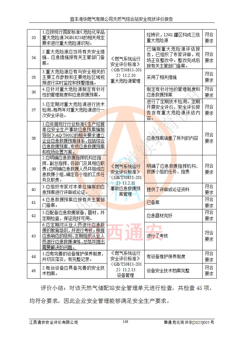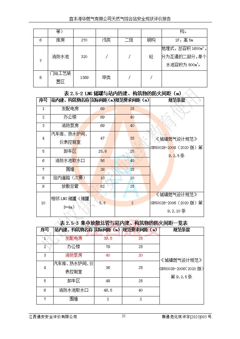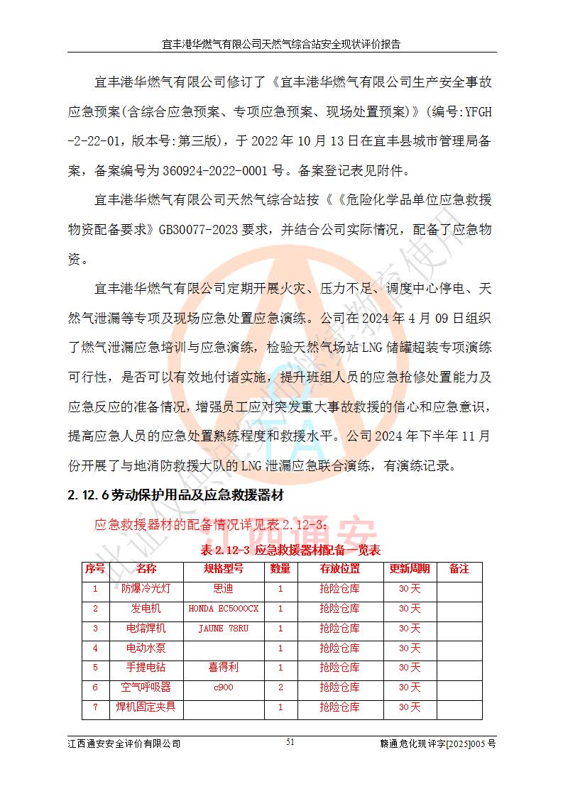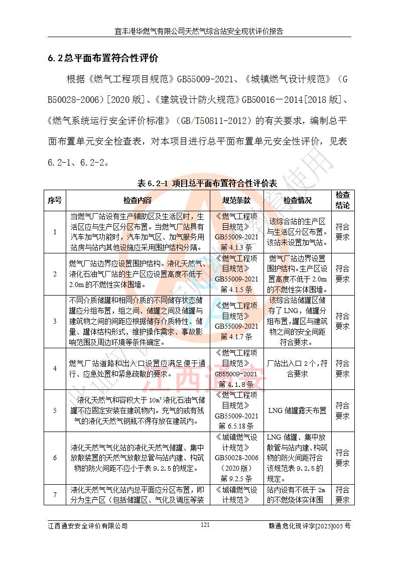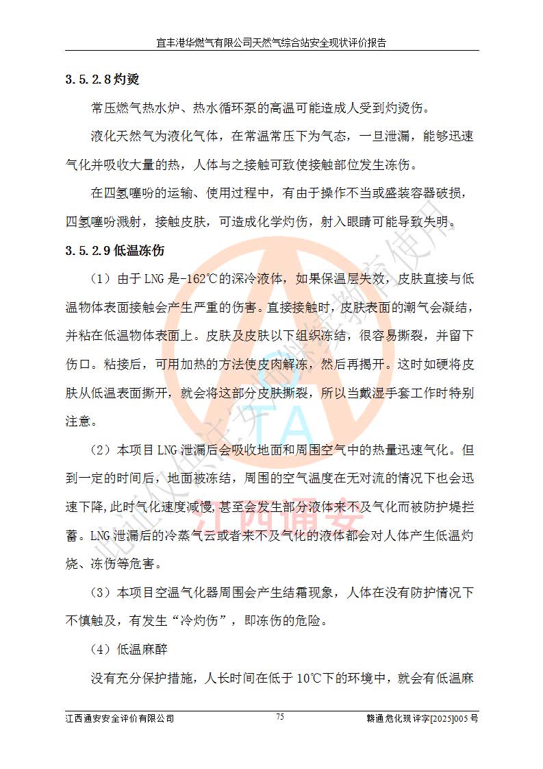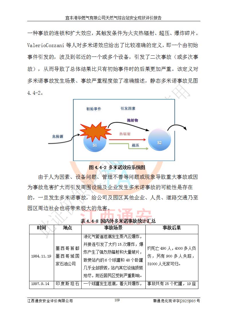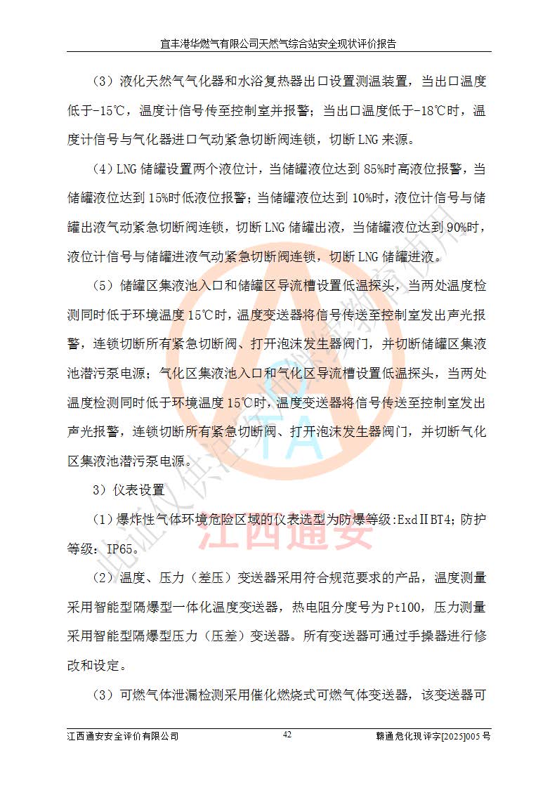 1、主要危险、危害因素辨识结果 宜丰港华燃气有限公司天然气综合站在生产经营过程中存在的主要危险有:火灾与爆炸、中毒窒息、触电、机械伤害、物体打击、**伤害、高处坠落、灼烫、低温冻伤、容器爆炸、淹溺等,存在的主要危害因素有:化学因素、物理因素(噪声、高温等)等,同时存在人为失误和管理缺陷。应重点防范的主要危险为火灾与爆炸、容器爆炸。 2、危险化学品辨识结果 经辨识,该储配站涉及的天然气、四氢噻吩及柴油属于危险化学品,天然气属于重点监管的危险化学品和特别管控危险化学品,不涉及监控化学品、易制毒化学品、易制爆危险化学品、剧毒化学品和高毒物品等危险化学品。 3、危险化学品重大危险源辨识结果 根据《危险化学品重大危险源辨识》(GB18218-2018)和《危险化学品重大危险源监督管理暂行规定》(2011)(40号令)(2015年 **安监总局令第79号修订)得出结论如下:该公司LNG储罐区构成三级重大危险源,其余生产单元及储存单元不构成危险化学品重大危险源。 4、重点监管危险化工工艺辨识结果 根据《**安全监管总局关于公布首批重点监管的危险化学品名录的通知》安监总管三[2011]95号、《**安全监管总局关于公布第二批重点监管危险化学品名录的通知》安监总管三[2013]12号进行辨识,该天然气储配站不涉及重点监管的危险化工工艺。 5、作业条件危险性分析结果: 液化天然气的储罐区、调压计量气化加臭区、卸车区、变配电、厂内运输、消防水池作业等单元。等单元危险程度均为“一般危险,需要注意”或“稍有危险,可以接受”级别。作业条件相对安全。 6、危险度评价结果:工艺装置区等级为Ⅱ级,危险程度为中度危险。LNG储罐区等级为Ⅰ级,危险程度为**危险。 7、事故后果预测结果:本报告采用中国安全生产科学研究院研发的重大危险源区域定量风险评价(CASST-QRA)软件对可能发生的危险化学品事故进行预测,宜丰港华燃气有限公司天然气综合站LNG储罐容器整体破裂,发生BLEVE灾害模式后果*大,*大死亡半径为181m,重伤半径为243m,轻伤半径为448m。 8、多米诺效应分析结果:该公司LNG储罐发生容器整体破裂引发的BLEVE事故的多米诺半径*大,为141m。 9、采用安全检查表评价法对该储配站周边环境、总平面布置、站内建构筑物防火间距、站内交通、LNG卸车、储罐、气化装置、加臭装置、调压装置、安全附件、工艺设备、管道、自动化控制等供配电、给排水、消防设施、供热装置、安全管理、“两重点一重大”安全措施及安全管理进行定性评价,不符合项共2项,其他均符合**法律、法规、标准、规范的要求。 (1)企业对不符合项整改完成后,安全条件符合燃气储存经营的安全要求。 (2)该储配站涉及“两重点一重大”,采取了首批重点监管的危险化学品安全措施和应急处置措施,站内LNG罐区构成三级重大危险源,采取的重大危险源安全技术和监控措施符合相关要求。 (3)根据《燃气经营许可管理办法》(建城〔2014〕167号发布,建城规〔2019〕2号修改)制成安全检查表对该单位的经营条件逐一检查,检查结果符合要求。 (4)根据《住房城乡建设部关于印发《城镇燃气经营安全重大隐患判定标准》的通知》(建城规[2023]4号)要求,对该项目重大隐患情况进行检查,该站LNG罐完成整改后不涉及重大隐患。 评价结论 综上所述,宜丰港华燃气有限公司天然气综合站选址和总平面布置合理,建构筑物间的防火间距、耐火等级等符合标准规范的要求,LNG卸车、储存、加臭、气化调压计量等装置采用成熟的工艺和设备,本质安全程度较高;公司制定了安全管理制度和操作规程,人员经培训合格后上岗,主要负责人、安全管理人员及特种作业人员均取得了相应的考核合格资格证书,能按照法律法规要求开展安全生产管理工作。公司对现场存在事故危险的设施和场所采取了合理可行的防护措施和科学的管理,使生产过程中的危险有害因素能得到**控制。该项目安全设施符合**现行有关法律、法规、标准的要求。企业对现场存在的安全问题进行了整改,主要的安全缺陷消除。 综合结论:宜丰港华燃气有限公司天然气综合站的安全条件符合燃气安全运行要求。 |