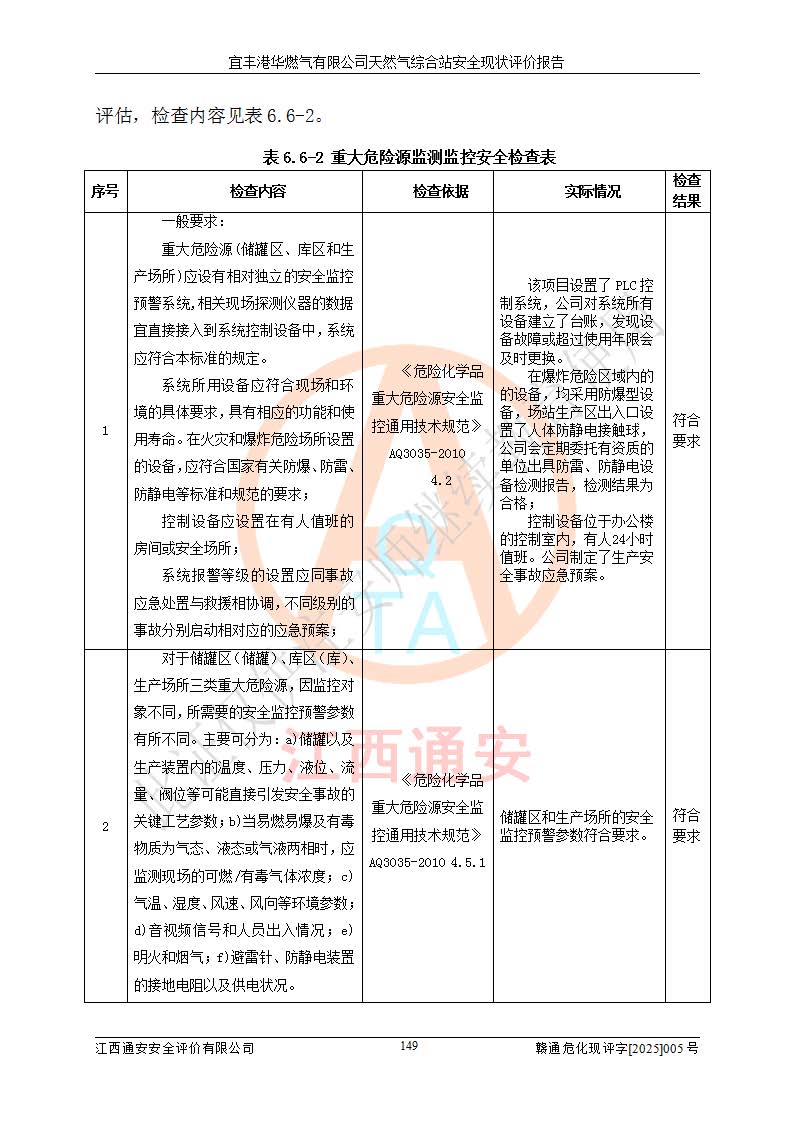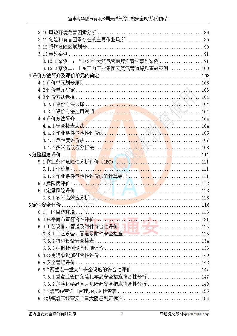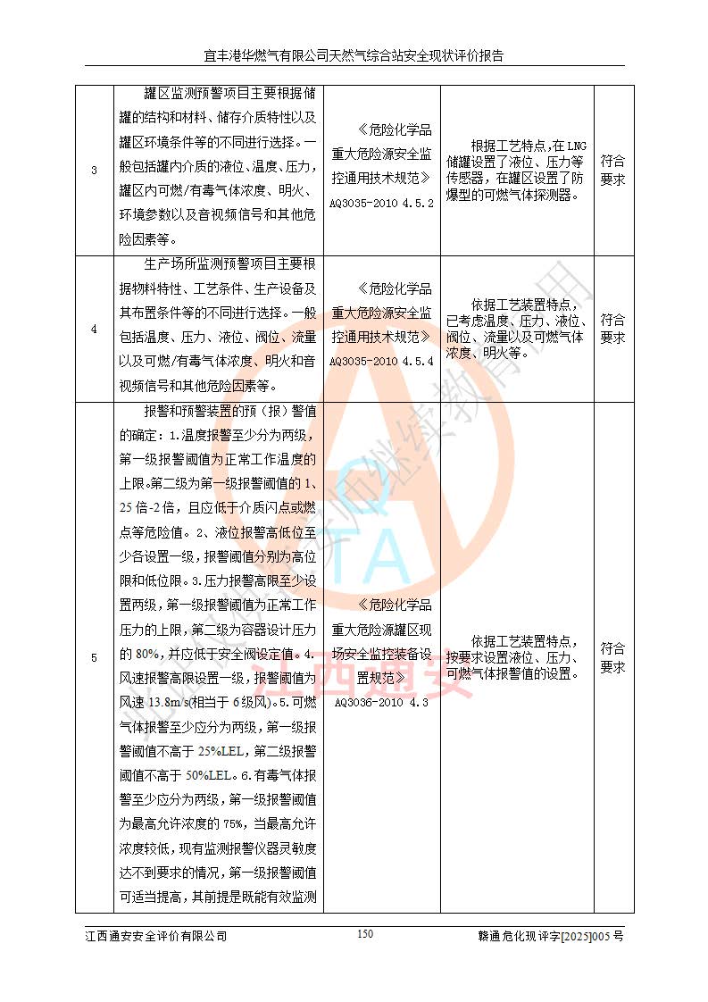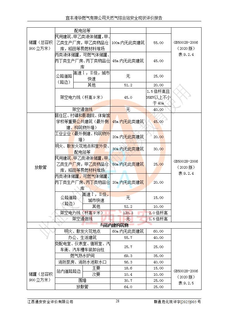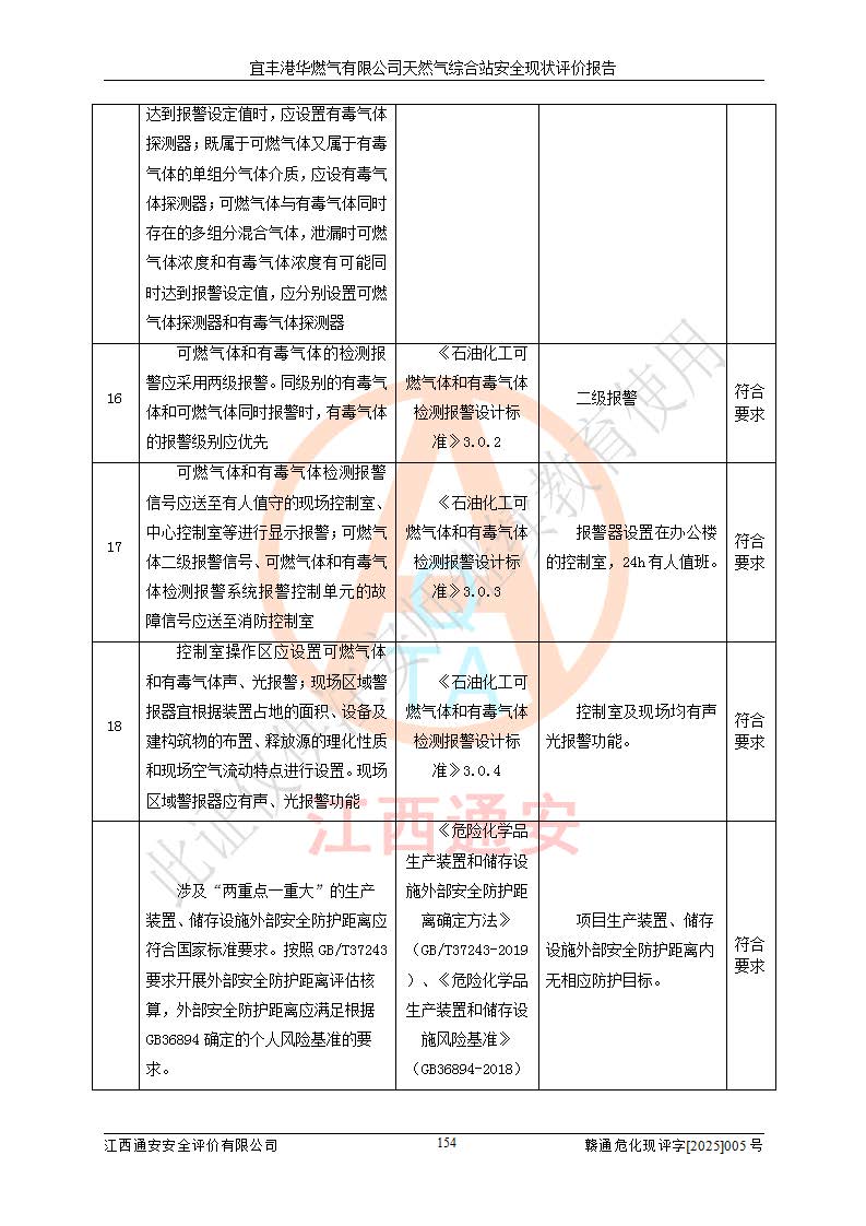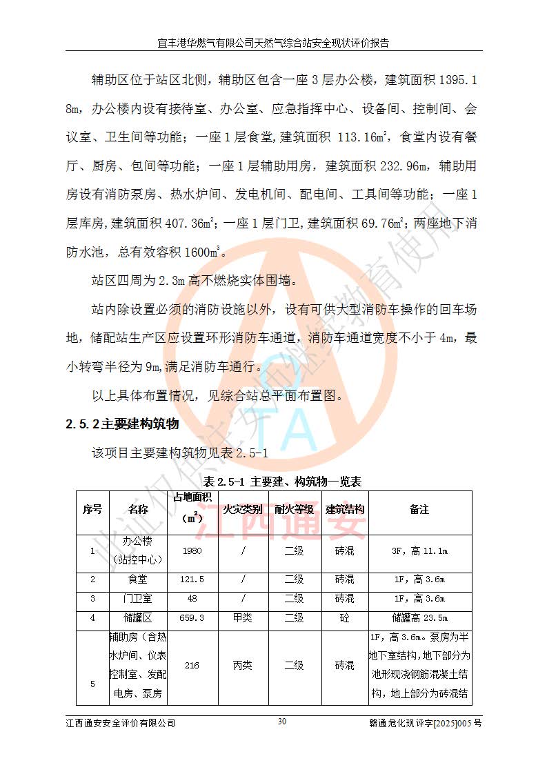 1、主要危险、危害因素辨识结果 宜丰港华燃气有限公司天然气综合站在生产经营过程中存在的主要危险有:火灾与爆炸、中毒窒息、触电、机械伤害、物体打击、**伤害、高处坠落、灼烫、低温冻伤、容器爆炸、淹溺等,存在的主要危害因素有:化学因素、物理因素(噪声、高温等)等,同时存在人为失误和管理缺陷。应重点防范的主要危险为火灾与爆炸、容器爆炸。 2、危险化学品辨识结果 经辨识,该储配站涉及的天然气、四氢噻吩及柴油属于危险化学品,天然气属于重点监管的危险化学品和特别管控危险化学品,不涉及监控化学品、易制毒化学品、易制爆危险化学品、剧毒化学品和高毒物品等危险化学品。 3、危险化学品重大危险源辨识结果 根据《危险化学品重大危险源辨识》(GB18218-2018)和《危险化学品重大危险源监督管理暂行规定》(2011)(40号令)(2015年 **安监总局令第79号修订)得出结论如下:该公司LNG储罐区构成三级重大危险源,其余生产单元及储存单元不构成危险化学品重大危险源。 4、重点监管危险化工工艺辨识结果 根据《**安全监管总局关于公布首批重点监管的危险化学品名录的通知》安监总管三[2011]95号、《**安全监管总局关于公布第二批重点监管危险化学品名录的通知》安监总管三[2013]12号进行辨识,该天然气储配站不涉及重点监管的危险化工工艺。 5、作业条件危险性分析结果: 液化天然气的储罐区、调压计量气化加臭区、卸车区、变配电、厂内运输、消防水池作业等单元。等单元危险程度均为“一般危险,需要注意”或“稍有危险,可以接受”级别。作业条件相对安全。 6、危险度评价结果:工艺装置区等级为Ⅱ级,危险程度为中度危险。LNG储罐区等级为Ⅰ级,危险程度为**危险。 7、事故后果预测结果:本报告采用中国安全生产科学研究院研发的重大危险源区域定量风险评价(CASST-QRA)软件对可能发生的危险化学品事故进行预测,宜丰港华燃气有限公司天然气综合站LNG储罐容器整体破裂,发生BLEVE灾害模式后果*大,*大死亡半径为181m,重伤半径为243m,轻伤半径为448m。 8、多米诺效应分析结果:该公司LNG储罐发生容器整体破裂引发的BLEVE事故的多米诺半径*大,为141m。 9、采用安全检查表评价法对该储配站周边环境、总平面布置、站内建构筑物防火间距、站内交通、LNG卸车、储罐、气化装置、加臭装置、调压装置、安全附件、工艺设备、管道、自动化控制等供配电、给排水、消防设施、供热装置、安全管理、“两重点一重大”安全措施及安全管理进行定性评价,不符合项共2项,其他均符合**法律、法规、标准、规范的要求。 (1)企业对不符合项整改完成后,安全条件符合燃气储存经营的安全要求。 (2)该储配站涉及“两重点一重大”,采取了首批重点监管的危险化学品安全措施和应急处置措施,站内LNG罐区构成三级重大危险源,采取的重大危险源安全技术和监控措施符合相关要求。 (3)根据《燃气经营许可管理办法》(建城〔2014〕167号发布,建城规〔2019〕2号修改)制成安全检查表对该单位的经营条件逐一检查,检查结果符合要求。 (4)根据《住房城乡建设部关于印发《城镇燃气经营安全重大隐患判定标准》的通知》(建城规[2023]4号)要求,对该项目重大隐患情况进行检查,该站LNG罐完成整改后不涉及重大隐患。 评价结论 综上所述,宜丰港华燃气有限公司天然气综合站选址和总平面布置合理,建构筑物间的防火间距、耐火等级等符合标准规范的要求,LNG卸车、储存、加臭、气化调压计量等装置采用成熟的工艺和设备,本质安全程度较高;公司制定了安全管理制度和操作规程,人员经培训合格后上岗,主要负责人、安全管理人员及特种作业人员均取得了相应的考核合格资格证书,能按照法律法规要求开展安全生产管理工作。公司对现场存在事故危险的设施和场所采取了合理可行的防护措施和科学的管理,使生产过程中的危险有害因素能得到**控制。该项目安全设施符合**现行有关法律、法规、标准的要求。企业对现场存在的安全问题进行了整改,主要的安全缺陷消除。 综合结论:宜丰港华燃气有限公司天然气综合站的安全条件符合燃气安全运行要求。 |