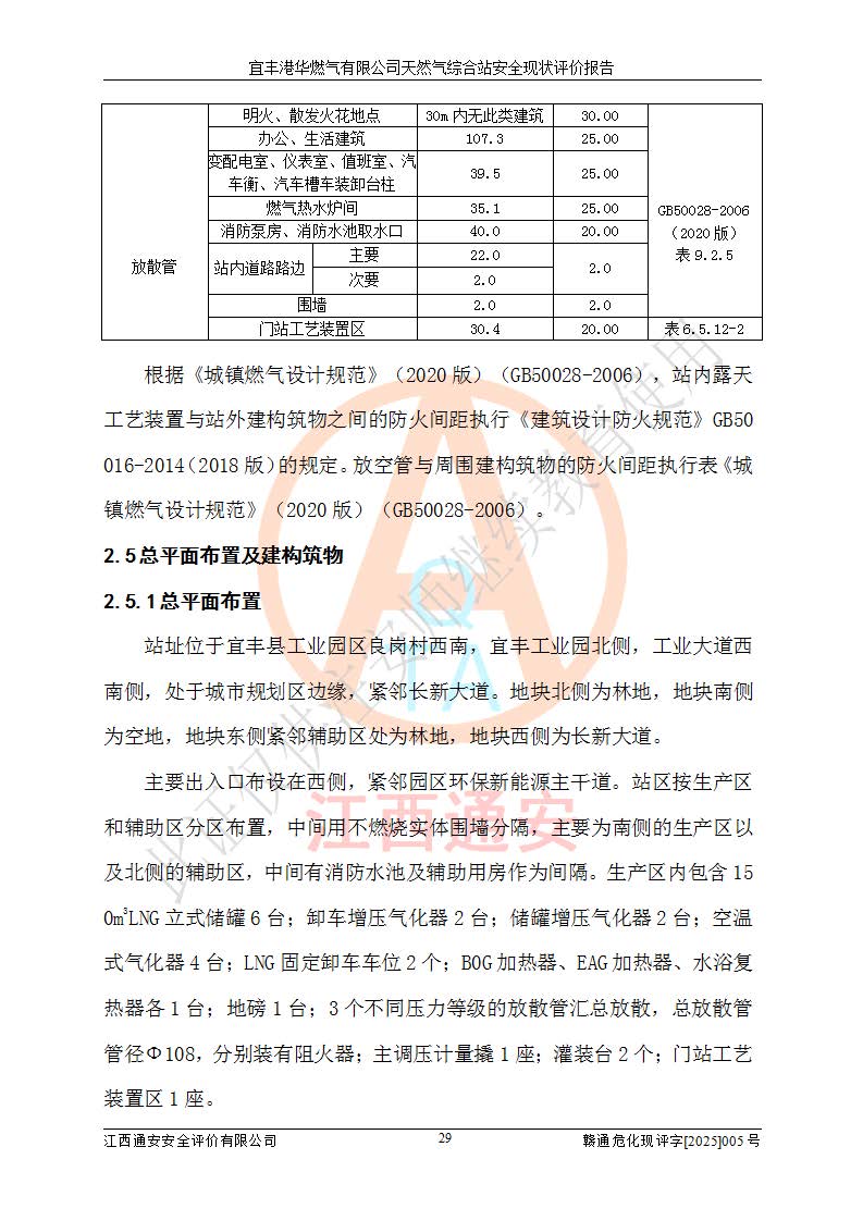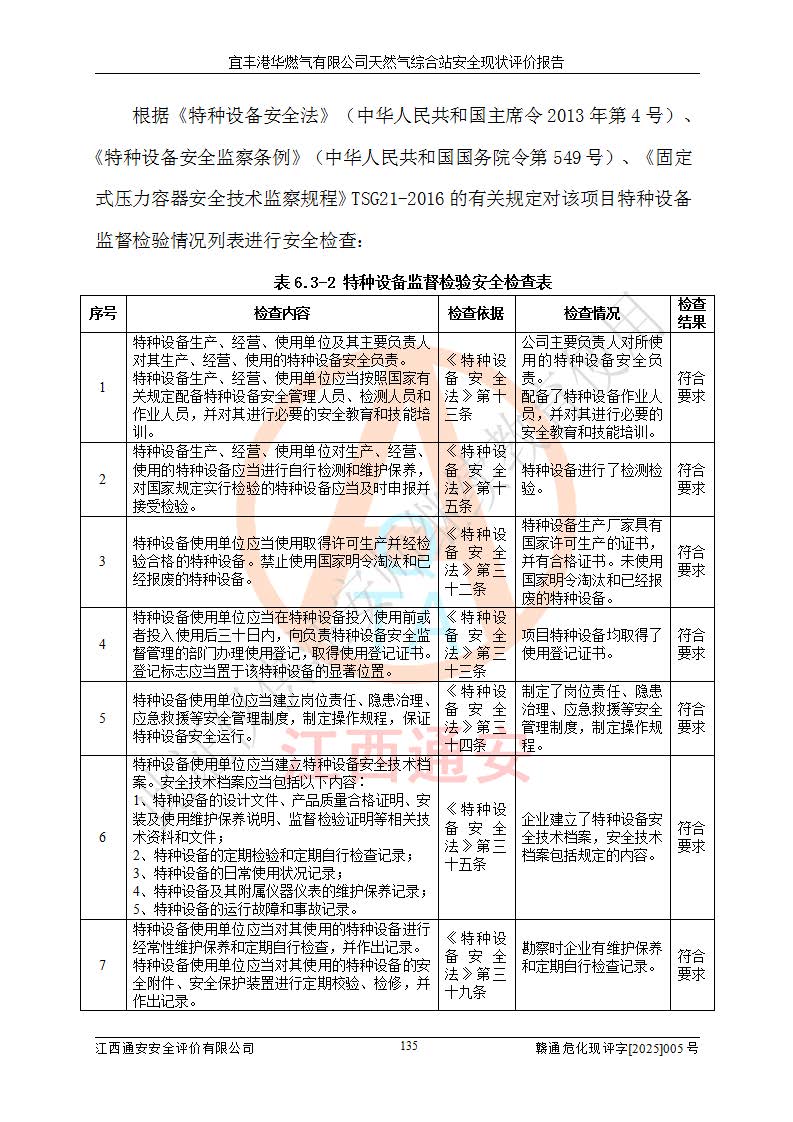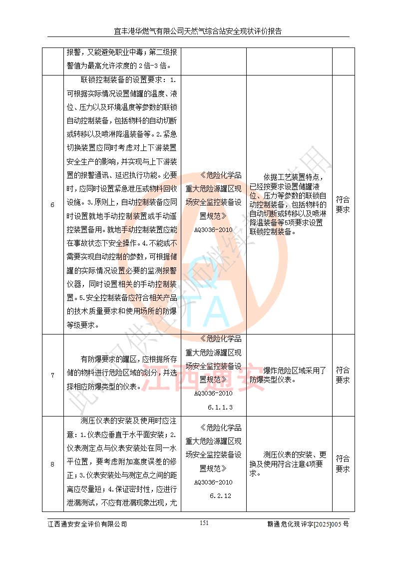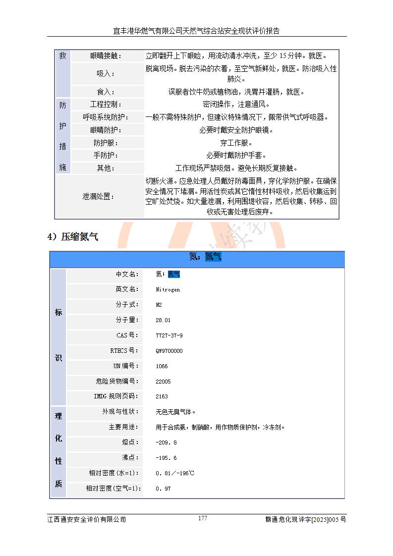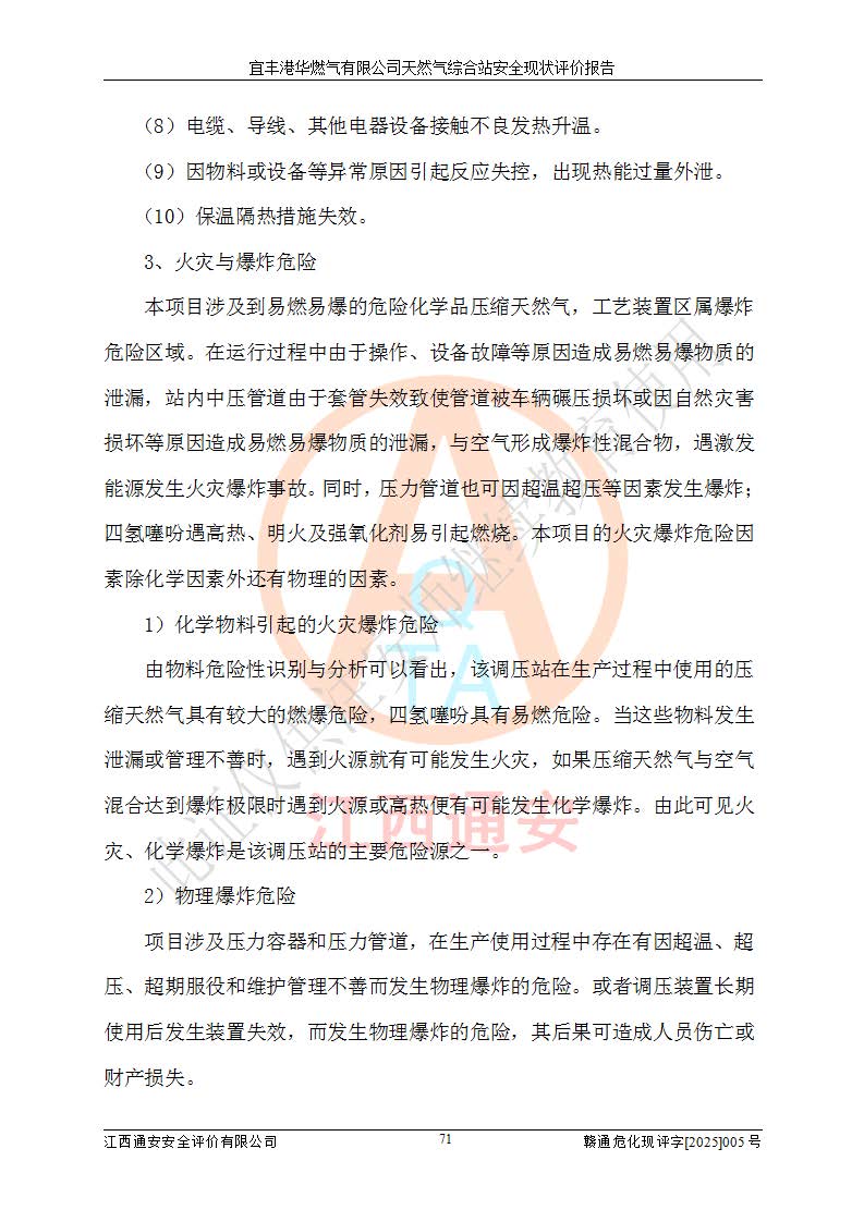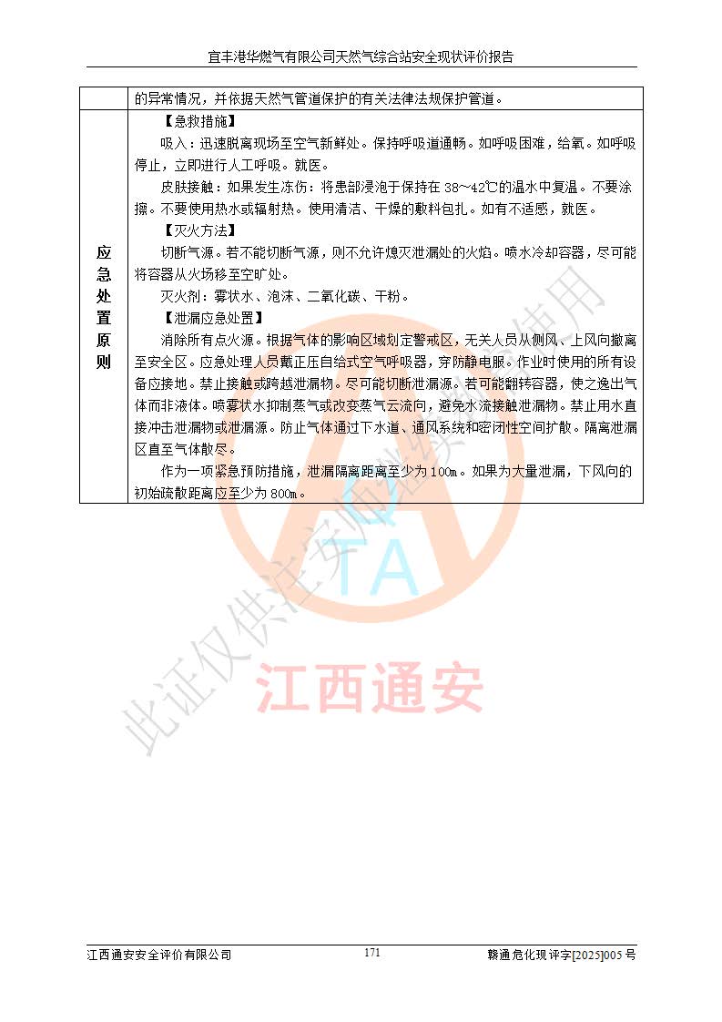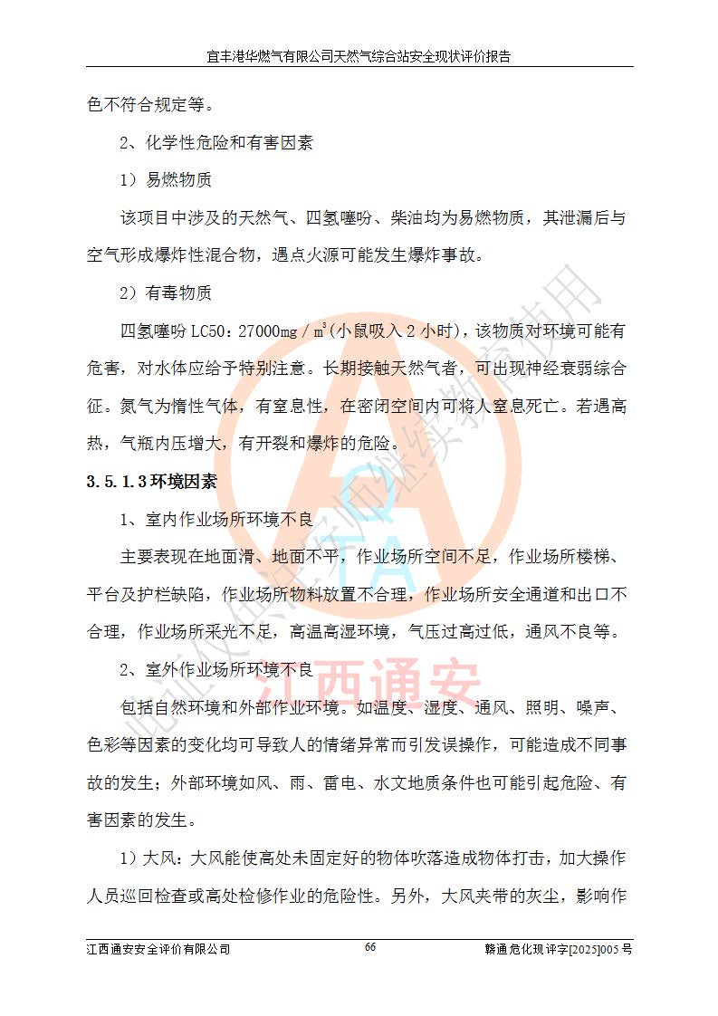 1、主要危险、危害因素辨识结果 宜丰港华燃气有限公司天然气综合站在生产经营过程中存在的主要危险有:火灾与爆炸、中毒窒息、触电、机械伤害、物体打击、**伤害、高处坠落、灼烫、低温冻伤、容器爆炸、淹溺等,存在的主要危害因素有:化学因素、物理因素(噪声、高温等)等,同时存在人为失误和管理缺陷。应重点防范的主要危险为火灾与爆炸、容器爆炸。 2、危险化学品辨识结果 经辨识,该储配站涉及的天然气、四氢噻吩及柴油属于危险化学品,天然气属于重点监管的危险化学品和特别管控危险化学品,不涉及监控化学品、易制毒化学品、易制爆危险化学品、剧毒化学品和高毒物品等危险化学品。 3、危险化学品重大危险源辨识结果 根据《危险化学品重大危险源辨识》(GB18218-2018)和《危险化学品重大危险源监督管理暂行规定》(2011)(40号令)(2015年 **安监总局令第79号修订)得出结论如下:该公司LNG储罐区构成三级重大危险源,其余生产单元及储存单元不构成危险化学品重大危险源。 4、重点监管危险化工工艺辨识结果 根据《**安全监管总局关于公布首批重点监管的危险化学品名录的通知》安监总管三[2011]95号、《**安全监管总局关于公布第二批重点监管危险化学品名录的通知》安监总管三[2013]12号进行辨识,该天然气储配站不涉及重点监管的危险化工工艺。 5、作业条件危险性分析结果: 液化天然气的储罐区、调压计量气化加臭区、卸车区、变配电、厂内运输、消防水池作业等单元。等单元危险程度均为“一般危险,需要注意”或“稍有危险,可以接受”级别。作业条件相对安全。 6、危险度评价结果:工艺装置区等级为Ⅱ级,危险程度为中度危险。LNG储罐区等级为Ⅰ级,危险程度为**危险。 7、事故后果预测结果:本报告采用中国安全生产科学研究院研发的重大危险源区域定量风险评价(CASST-QRA)软件对可能发生的危险化学品事故进行预测,宜丰港华燃气有限公司天然气综合站LNG储罐容器整体破裂,发生BLEVE灾害模式后果*大,*大死亡半径为181m,重伤半径为243m,轻伤半径为448m。 8、多米诺效应分析结果:该公司LNG储罐发生容器整体破裂引发的BLEVE事故的多米诺半径*大,为141m。 9、采用安全检查表评价法对该储配站周边环境、总平面布置、站内建构筑物防火间距、站内交通、LNG卸车、储罐、气化装置、加臭装置、调压装置、安全附件、工艺设备、管道、自动化控制等供配电、给排水、消防设施、供热装置、安全管理、“两重点一重大”安全措施及安全管理进行定性评价,不符合项共2项,其他均符合**法律、法规、标准、规范的要求。 (1)企业对不符合项整改完成后,安全条件符合燃气储存经营的安全要求。 (2)该储配站涉及“两重点一重大”,采取了首批重点监管的危险化学品安全措施和应急处置措施,站内LNG罐区构成三级重大危险源,采取的重大危险源安全技术和监控措施符合相关要求。 (3)根据《燃气经营许可管理办法》(建城〔2014〕167号发布,建城规〔2019〕2号修改)制成安全检查表对该单位的经营条件逐一检查,检查结果符合要求。 (4)根据《住房城乡建设部关于印发《城镇燃气经营安全重大隐患判定标准》的通知》(建城规[2023]4号)要求,对该项目重大隐患情况进行检查,该站LNG罐完成整改后不涉及重大隐患。 评价结论 综上所述,宜丰港华燃气有限公司天然气综合站选址和总平面布置合理,建构筑物间的防火间距、耐火等级等符合标准规范的要求,LNG卸车、储存、加臭、气化调压计量等装置采用成熟的工艺和设备,本质安全程度较高;公司制定了安全管理制度和操作规程,人员经培训合格后上岗,主要负责人、安全管理人员及特种作业人员均取得了相应的考核合格资格证书,能按照法律法规要求开展安全生产管理工作。公司对现场存在事故危险的设施和场所采取了合理可行的防护措施和科学的管理,使生产过程中的危险有害因素能得到**控制。该项目安全设施符合**现行有关法律、法规、标准的要求。企业对现场存在的安全问题进行了整改,主要的安全缺陷消除。 综合结论:宜丰港华燃气有限公司天然气综合站的安全条件符合燃气安全运行要求。 |