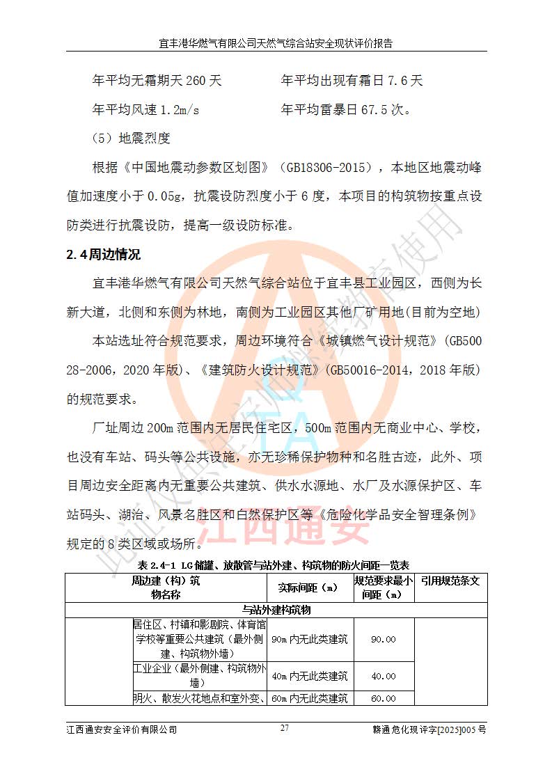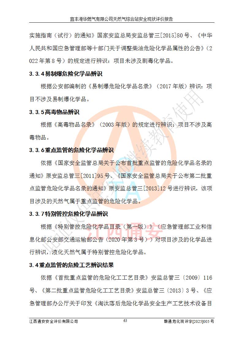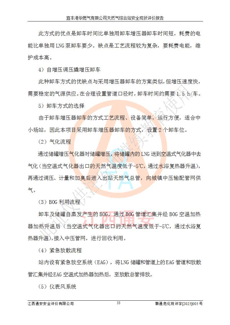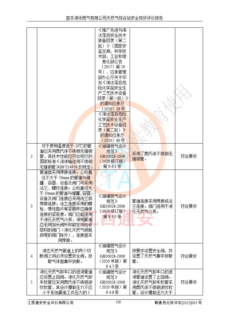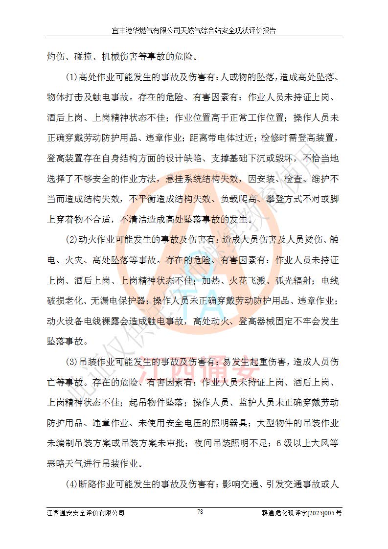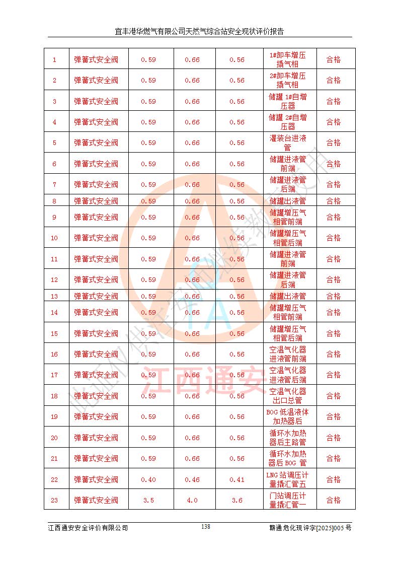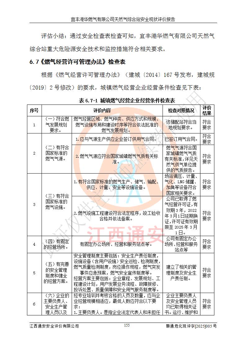 1、主要危险、危害因素辨识结果 宜丰港华燃气有限公司天然气综合站在生产经营过程中存在的主要危险有:火灾与爆炸、中毒窒息、触电、机械伤害、物体打击、**伤害、高处坠落、灼烫、低温冻伤、容器爆炸、淹溺等,存在的主要危害因素有:化学因素、物理因素(噪声、高温等)等,同时存在人为失误和管理缺陷。应重点防范的主要危险为火灾与爆炸、容器爆炸。 2、危险化学品辨识结果 经辨识,该储配站涉及的天然气、四氢噻吩及柴油属于危险化学品,天然气属于重点监管的危险化学品和特别管控危险化学品,不涉及监控化学品、易制毒化学品、易制爆危险化学品、剧毒化学品和高毒物品等危险化学品。 3、危险化学品重大危险源辨识结果 根据《危险化学品重大危险源辨识》(GB18218-2018)和《危险化学品重大危险源监督管理暂行规定》(2011)(40号令)(2015年 **安监总局令第79号修订)得出结论如下:该公司LNG储罐区构成三级重大危险源,其余生产单元及储存单元不构成危险化学品重大危险源。 4、重点监管危险化工工艺辨识结果 根据《**安全监管总局关于公布首批重点监管的危险化学品名录的通知》安监总管三[2011]95号、《**安全监管总局关于公布第二批重点监管危险化学品名录的通知》安监总管三[2013]12号进行辨识,该天然气储配站不涉及重点监管的危险化工工艺。 5、作业条件危险性分析结果: 液化天然气的储罐区、调压计量气化加臭区、卸车区、变配电、厂内运输、消防水池作业等单元。等单元危险程度均为“一般危险,需要注意”或“稍有危险,可以接受”级别。作业条件相对安全。 6、危险度评价结果:工艺装置区等级为Ⅱ级,危险程度为中度危险。LNG储罐区等级为Ⅰ级,危险程度为**危险。 7、事故后果预测结果:本报告采用中国安全生产科学研究院研发的重大危险源区域定量风险评价(CASST-QRA)软件对可能发生的危险化学品事故进行预测,宜丰港华燃气有限公司天然气综合站LNG储罐容器整体破裂,发生BLEVE灾害模式后果*大,*大死亡半径为181m,重伤半径为243m,轻伤半径为448m。 8、多米诺效应分析结果:该公司LNG储罐发生容器整体破裂引发的BLEVE事故的多米诺半径*大,为141m。 9、采用安全检查表评价法对该储配站周边环境、总平面布置、站内建构筑物防火间距、站内交通、LNG卸车、储罐、气化装置、加臭装置、调压装置、安全附件、工艺设备、管道、自动化控制等供配电、给排水、消防设施、供热装置、安全管理、“两重点一重大”安全措施及安全管理进行定性评价,不符合项共2项,其他均符合**法律、法规、标准、规范的要求。 (1)企业对不符合项整改完成后,安全条件符合燃气储存经营的安全要求。 (2)该储配站涉及“两重点一重大”,采取了首批重点监管的危险化学品安全措施和应急处置措施,站内LNG罐区构成三级重大危险源,采取的重大危险源安全技术和监控措施符合相关要求。 (3)根据《燃气经营许可管理办法》(建城〔2014〕167号发布,建城规〔2019〕2号修改)制成安全检查表对该单位的经营条件逐一检查,检查结果符合要求。 (4)根据《住房城乡建设部关于印发《城镇燃气经营安全重大隐患判定标准》的通知》(建城规[2023]4号)要求,对该项目重大隐患情况进行检查,该站LNG罐完成整改后不涉及重大隐患。 评价结论 综上所述,宜丰港华燃气有限公司天然气综合站选址和总平面布置合理,建构筑物间的防火间距、耐火等级等符合标准规范的要求,LNG卸车、储存、加臭、气化调压计量等装置采用成熟的工艺和设备,本质安全程度较高;公司制定了安全管理制度和操作规程,人员经培训合格后上岗,主要负责人、安全管理人员及特种作业人员均取得了相应的考核合格资格证书,能按照法律法规要求开展安全生产管理工作。公司对现场存在事故危险的设施和场所采取了合理可行的防护措施和科学的管理,使生产过程中的危险有害因素能得到**控制。该项目安全设施符合**现行有关法律、法规、标准的要求。企业对现场存在的安全问题进行了整改,主要的安全缺陷消除。 综合结论:宜丰港华燃气有限公司天然气综合站的安全条件符合燃气安全运行要求。 |