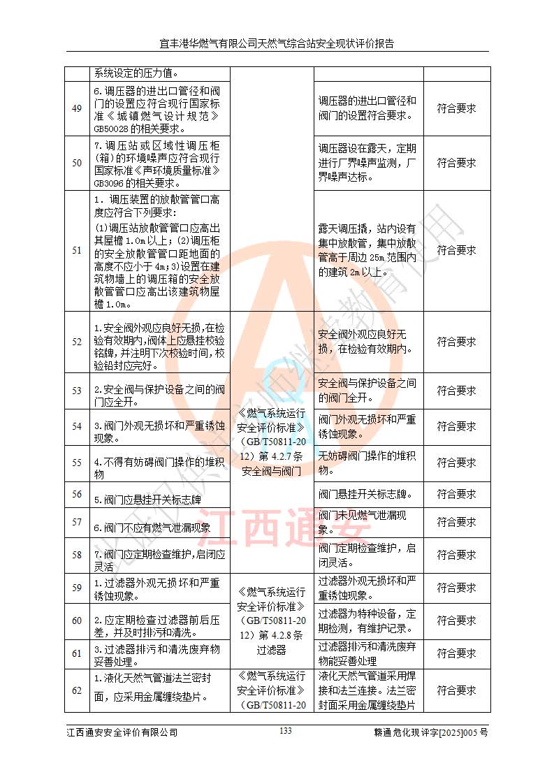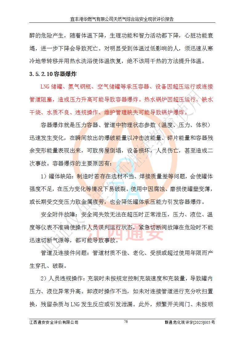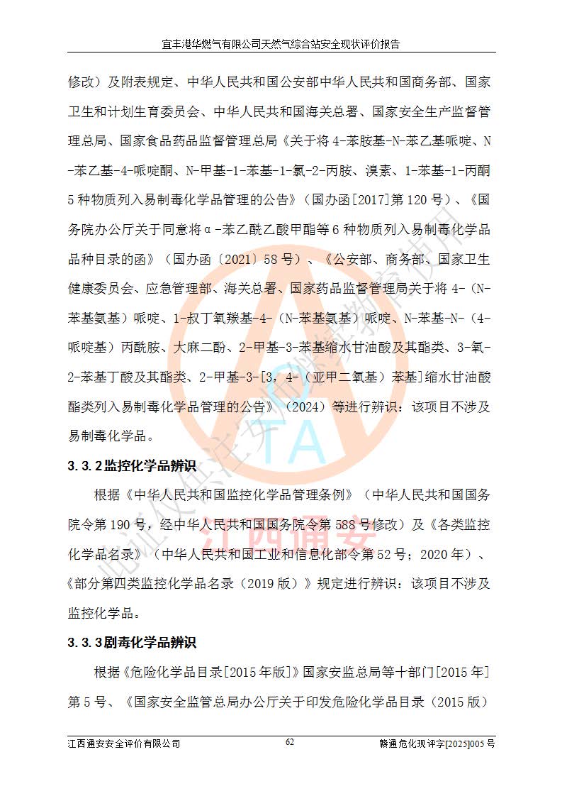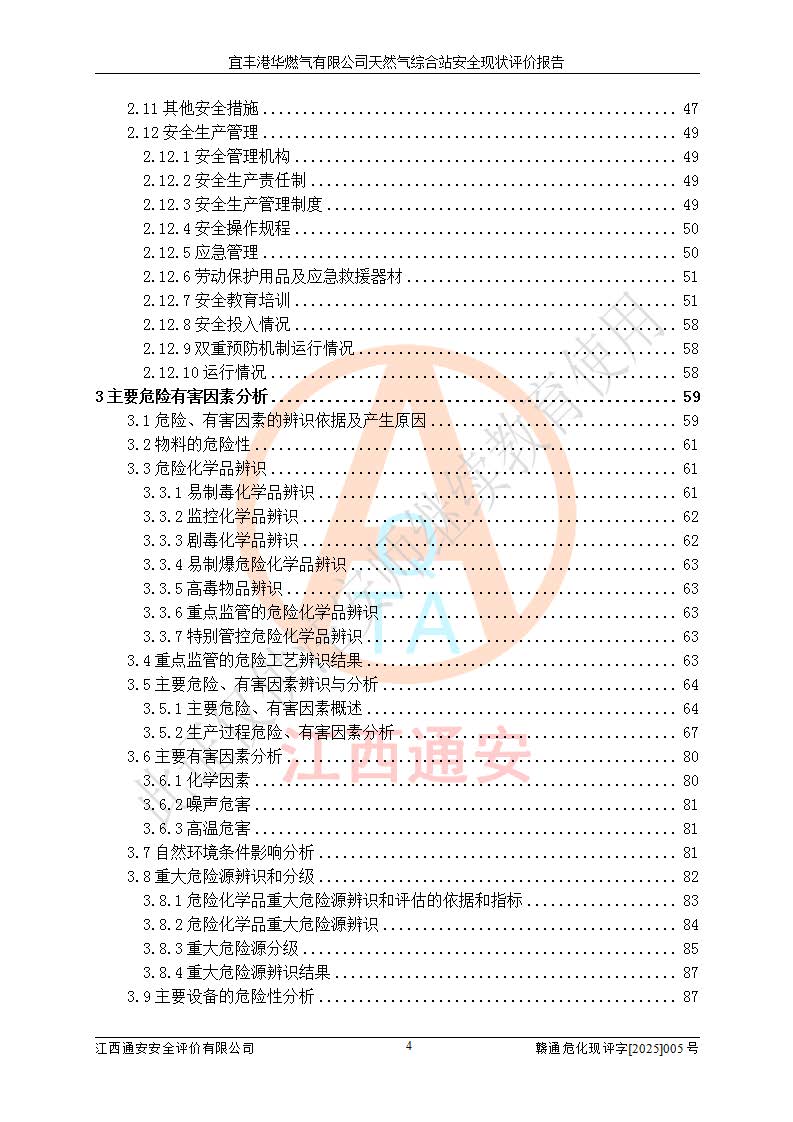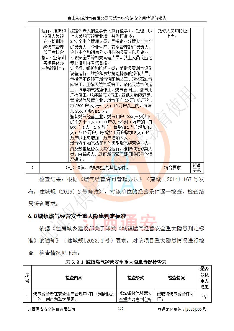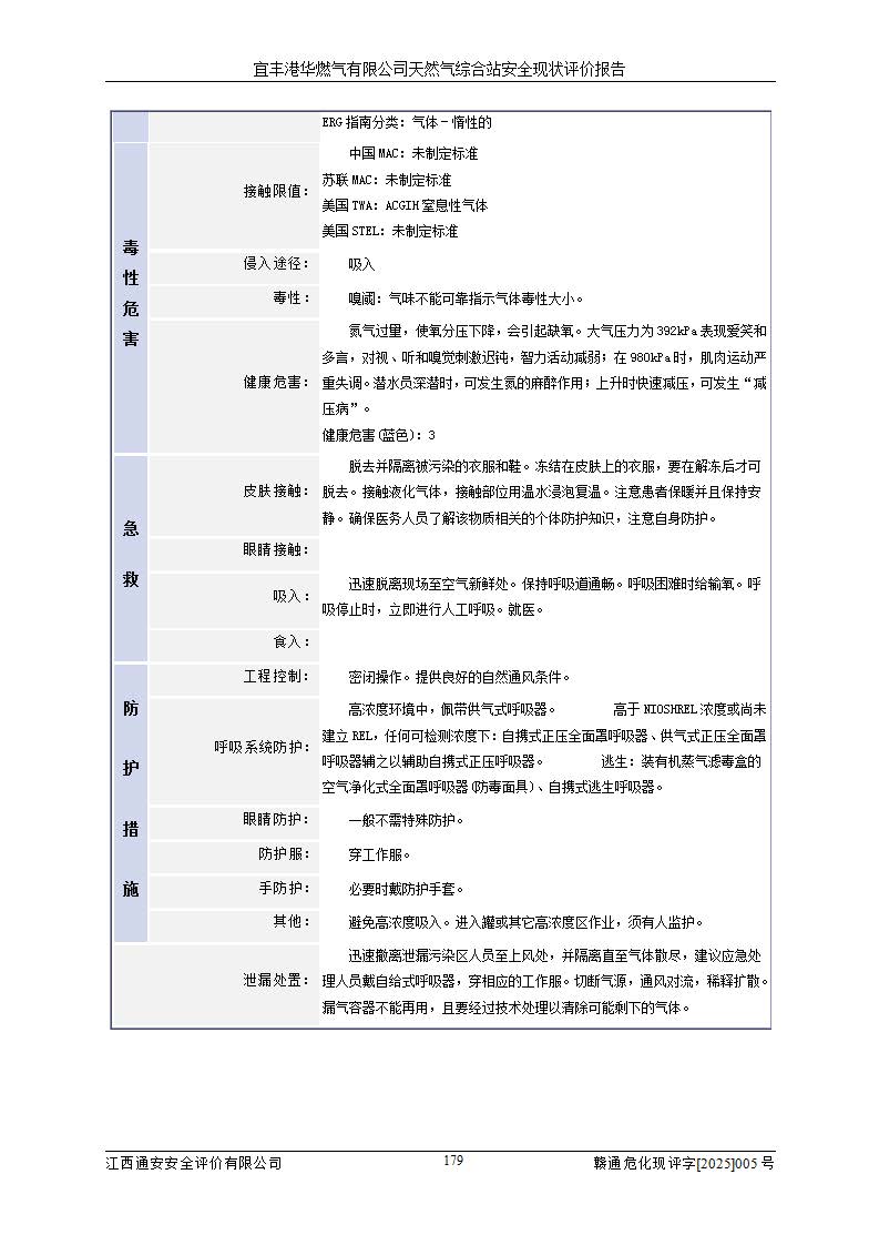 1、主要危险、危害因素辨识结果 宜丰港华燃气有限公司天然气综合站在生产经营过程中存在的主要危险有:火灾与爆炸、中毒窒息、触电、机械伤害、物体打击、**伤害、高处坠落、灼烫、低温冻伤、容器爆炸、淹溺等,存在的主要危害因素有:化学因素、物理因素(噪声、高温等)等,同时存在人为失误和管理缺陷。应重点防范的主要危险为火灾与爆炸、容器爆炸。 2、危险化学品辨识结果 经辨识,该储配站涉及的天然气、四氢噻吩及柴油属于危险化学品,天然气属于重点监管的危险化学品和特别管控危险化学品,不涉及监控化学品、易制毒化学品、易制爆危险化学品、剧毒化学品和高毒物品等危险化学品。 3、危险化学品重大危险源辨识结果 根据《危险化学品重大危险源辨识》(GB18218-2018)和《危险化学品重大危险源监督管理暂行规定》(2011)(40号令)(2015年 **安监总局令第79号修订)得出结论如下:该公司LNG储罐区构成三级重大危险源,其余生产单元及储存单元不构成危险化学品重大危险源。 4、重点监管危险化工工艺辨识结果 根据《**安全监管总局关于公布首批重点监管的危险化学品名录的通知》安监总管三[2011]95号、《**安全监管总局关于公布第二批重点监管危险化学品名录的通知》安监总管三[2013]12号进行辨识,该天然气储配站不涉及重点监管的危险化工工艺。 5、作业条件危险性分析结果: 液化天然气的储罐区、调压计量气化加臭区、卸车区、变配电、厂内运输、消防水池作业等单元。等单元危险程度均为“一般危险,需要注意”或“稍有危险,可以接受”级别。作业条件相对安全。 6、危险度评价结果:工艺装置区等级为Ⅱ级,危险程度为中度危险。LNG储罐区等级为Ⅰ级,危险程度为**危险。 7、事故后果预测结果:本报告采用中国安全生产科学研究院研发的重大危险源区域定量风险评价(CASST-QRA)软件对可能发生的危险化学品事故进行预测,宜丰港华燃气有限公司天然气综合站LNG储罐容器整体破裂,发生BLEVE灾害模式后果*大,*大死亡半径为181m,重伤半径为243m,轻伤半径为448m。 8、多米诺效应分析结果:该公司LNG储罐发生容器整体破裂引发的BLEVE事故的多米诺半径*大,为141m。 9、采用安全检查表评价法对该储配站周边环境、总平面布置、站内建构筑物防火间距、站内交通、LNG卸车、储罐、气化装置、加臭装置、调压装置、安全附件、工艺设备、管道、自动化控制等供配电、给排水、消防设施、供热装置、安全管理、“两重点一重大”安全措施及安全管理进行定性评价,不符合项共2项,其他均符合**法律、法规、标准、规范的要求。 (1)企业对不符合项整改完成后,安全条件符合燃气储存经营的安全要求。 (2)该储配站涉及“两重点一重大”,采取了首批重点监管的危险化学品安全措施和应急处置措施,站内LNG罐区构成三级重大危险源,采取的重大危险源安全技术和监控措施符合相关要求。 (3)根据《燃气经营许可管理办法》(建城〔2014〕167号发布,建城规〔2019〕2号修改)制成安全检查表对该单位的经营条件逐一检查,检查结果符合要求。 (4)根据《住房城乡建设部关于印发《城镇燃气经营安全重大隐患判定标准》的通知》(建城规[2023]4号)要求,对该项目重大隐患情况进行检查,该站LNG罐完成整改后不涉及重大隐患。 评价结论 综上所述,宜丰港华燃气有限公司天然气综合站选址和总平面布置合理,建构筑物间的防火间距、耐火等级等符合标准规范的要求,LNG卸车、储存、加臭、气化调压计量等装置采用成熟的工艺和设备,本质安全程度较高;公司制定了安全管理制度和操作规程,人员经培训合格后上岗,主要负责人、安全管理人员及特种作业人员均取得了相应的考核合格资格证书,能按照法律法规要求开展安全生产管理工作。公司对现场存在事故危险的设施和场所采取了合理可行的防护措施和科学的管理,使生产过程中的危险有害因素能得到**控制。该项目安全设施符合**现行有关法律、法规、标准的要求。企业对现场存在的安全问题进行了整改,主要的安全缺陷消除。 综合结论:宜丰港华燃气有限公司天然气综合站的安全条件符合燃气安全运行要求。 |