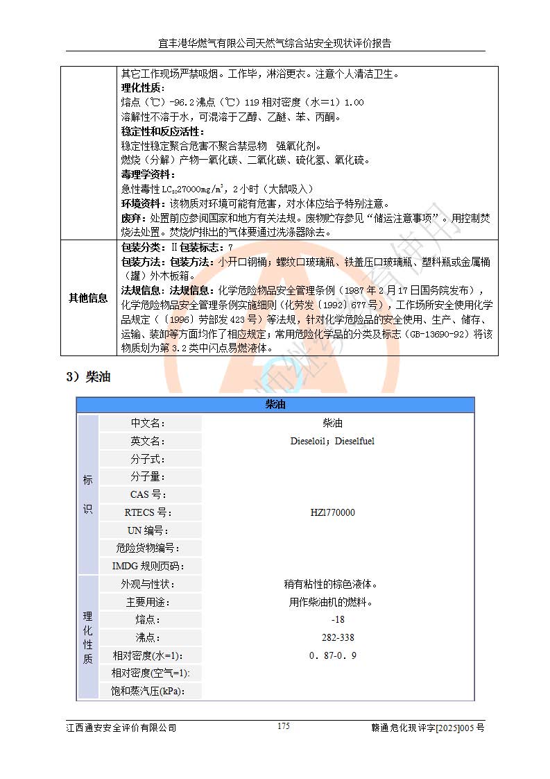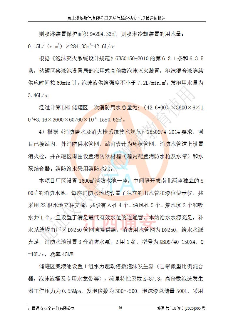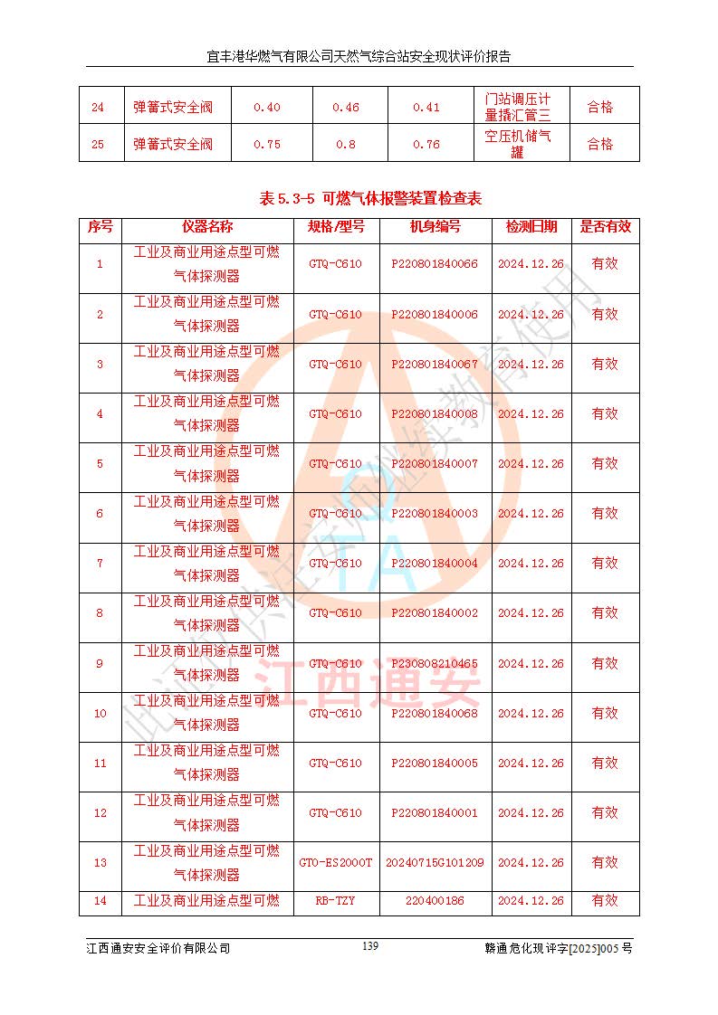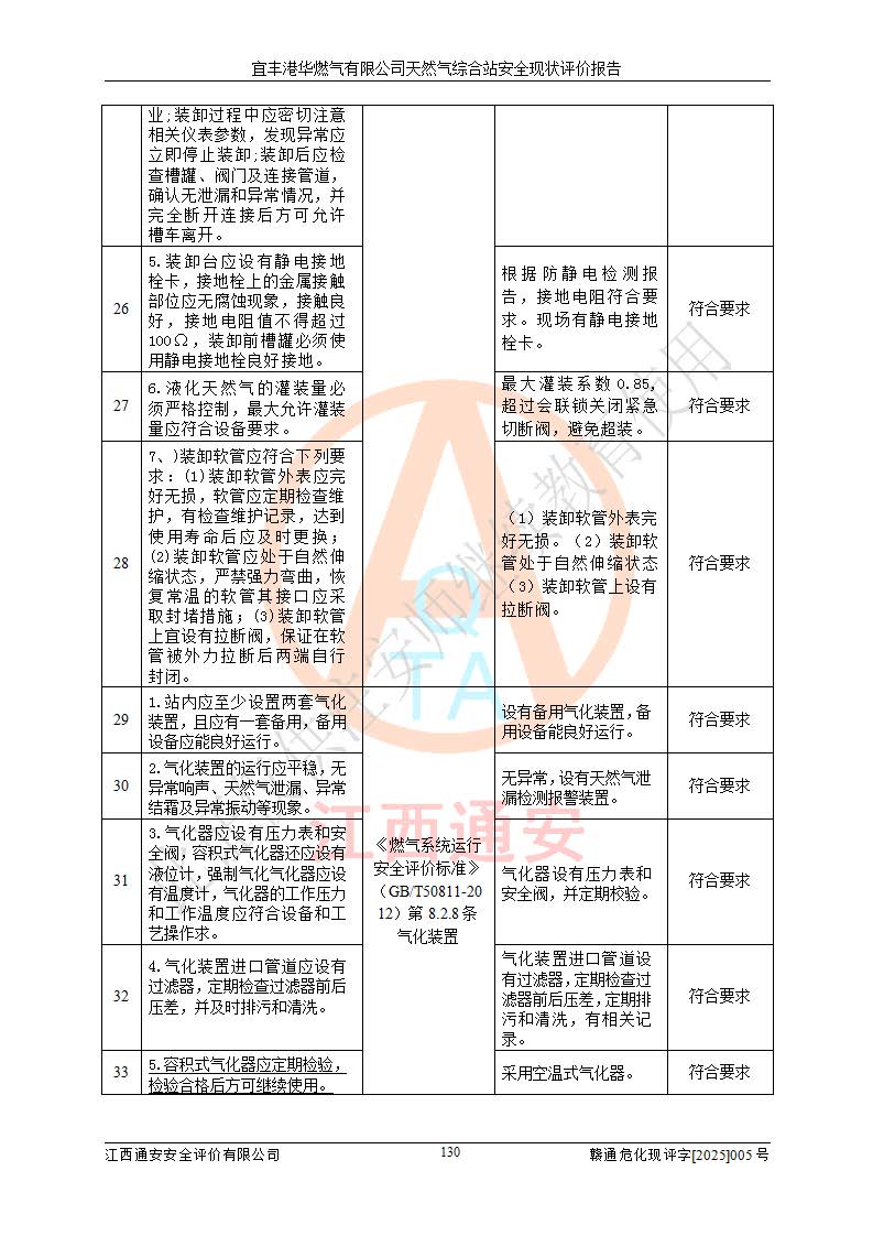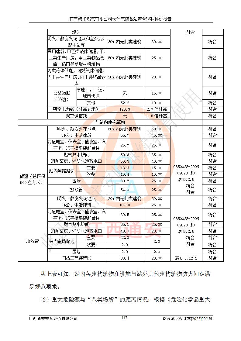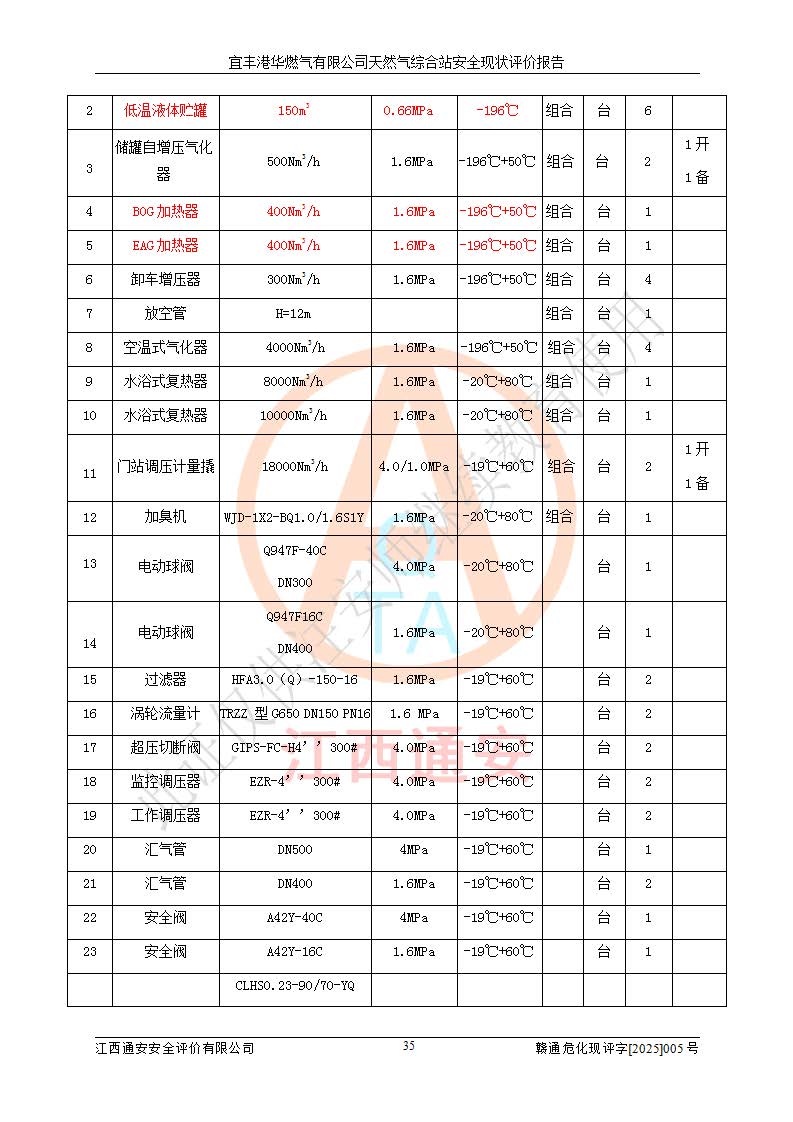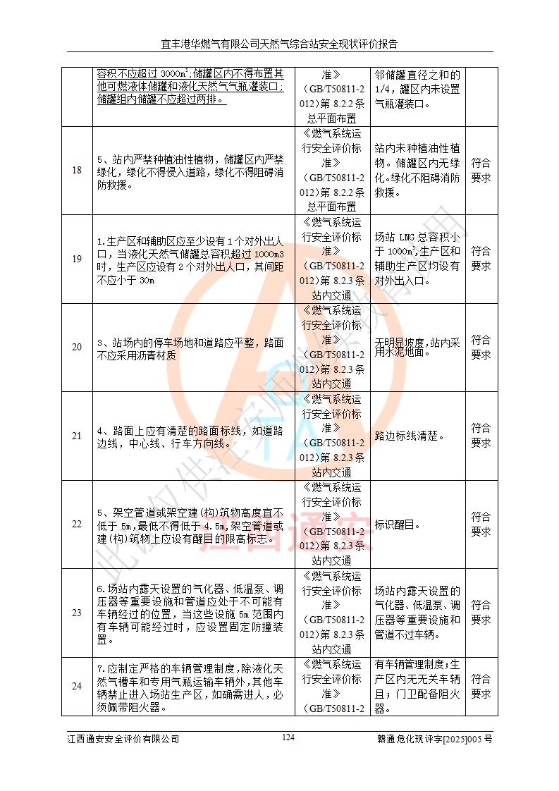 1、主要危险、危害因素辨识结果 宜丰港华燃气有限公司天然气综合站在生产经营过程中存在的主要危险有:火灾与爆炸、中毒窒息、触电、机械伤害、物体打击、**伤害、高处坠落、灼烫、低温冻伤、容器爆炸、淹溺等,存在的主要危害因素有:化学因素、物理因素(噪声、高温等)等,同时存在人为失误和管理缺陷。应重点防范的主要危险为火灾与爆炸、容器爆炸。 2、危险化学品辨识结果 经辨识,该储配站涉及的天然气、四氢噻吩及柴油属于危险化学品,天然气属于重点监管的危险化学品和特别管控危险化学品,不涉及监控化学品、易制毒化学品、易制爆危险化学品、剧毒化学品和高毒物品等危险化学品。 3、危险化学品重大危险源辨识结果 根据《危险化学品重大危险源辨识》(GB18218-2018)和《危险化学品重大危险源监督管理暂行规定》(2011)(40号令)(2015年 **安监总局令第79号修订)得出结论如下:该公司LNG储罐区构成三级重大危险源,其余生产单元及储存单元不构成危险化学品重大危险源。 4、重点监管危险化工工艺辨识结果 根据《**安全监管总局关于公布首批重点监管的危险化学品名录的通知》安监总管三[2011]95号、《**安全监管总局关于公布第二批重点监管危险化学品名录的通知》安监总管三[2013]12号进行辨识,该天然气储配站不涉及重点监管的危险化工工艺。 5、作业条件危险性分析结果: 液化天然气的储罐区、调压计量气化加臭区、卸车区、变配电、厂内运输、消防水池作业等单元。等单元危险程度均为“一般危险,需要注意”或“稍有危险,可以接受”级别。作业条件相对安全。 6、危险度评价结果:工艺装置区等级为Ⅱ级,危险程度为中度危险。LNG储罐区等级为Ⅰ级,危险程度为**危险。 7、事故后果预测结果:本报告采用中国安全生产科学研究院研发的重大危险源区域定量风险评价(CASST-QRA)软件对可能发生的危险化学品事故进行预测,宜丰港华燃气有限公司天然气综合站LNG储罐容器整体破裂,发生BLEVE灾害模式后果*大,*大死亡半径为181m,重伤半径为243m,轻伤半径为448m。 8、多米诺效应分析结果:该公司LNG储罐发生容器整体破裂引发的BLEVE事故的多米诺半径*大,为141m。 9、采用安全检查表评价法对该储配站周边环境、总平面布置、站内建构筑物防火间距、站内交通、LNG卸车、储罐、气化装置、加臭装置、调压装置、安全附件、工艺设备、管道、自动化控制等供配电、给排水、消防设施、供热装置、安全管理、“两重点一重大”安全措施及安全管理进行定性评价,不符合项共2项,其他均符合**法律、法规、标准、规范的要求。 (1)企业对不符合项整改完成后,安全条件符合燃气储存经营的安全要求。 (2)该储配站涉及“两重点一重大”,采取了首批重点监管的危险化学品安全措施和应急处置措施,站内LNG罐区构成三级重大危险源,采取的重大危险源安全技术和监控措施符合相关要求。 (3)根据《燃气经营许可管理办法》(建城〔2014〕167号发布,建城规〔2019〕2号修改)制成安全检查表对该单位的经营条件逐一检查,检查结果符合要求。 (4)根据《住房城乡建设部关于印发《城镇燃气经营安全重大隐患判定标准》的通知》(建城规[2023]4号)要求,对该项目重大隐患情况进行检查,该站LNG罐完成整改后不涉及重大隐患。 评价结论 综上所述,宜丰港华燃气有限公司天然气综合站选址和总平面布置合理,建构筑物间的防火间距、耐火等级等符合标准规范的要求,LNG卸车、储存、加臭、气化调压计量等装置采用成熟的工艺和设备,本质安全程度较高;公司制定了安全管理制度和操作规程,人员经培训合格后上岗,主要负责人、安全管理人员及特种作业人员均取得了相应的考核合格资格证书,能按照法律法规要求开展安全生产管理工作。公司对现场存在事故危险的设施和场所采取了合理可行的防护措施和科学的管理,使生产过程中的危险有害因素能得到**控制。该项目安全设施符合**现行有关法律、法规、标准的要求。企业对现场存在的安全问题进行了整改,主要的安全缺陷消除。 综合结论:宜丰港华燃气有限公司天然气综合站的安全条件符合燃气安全运行要求。 |