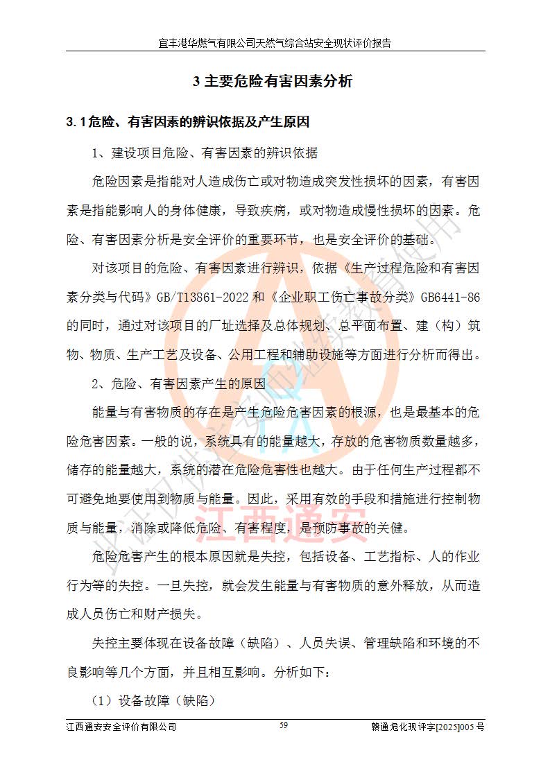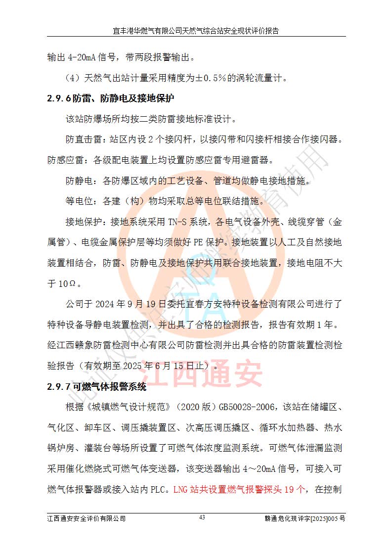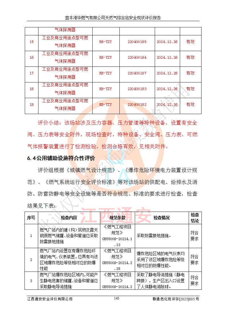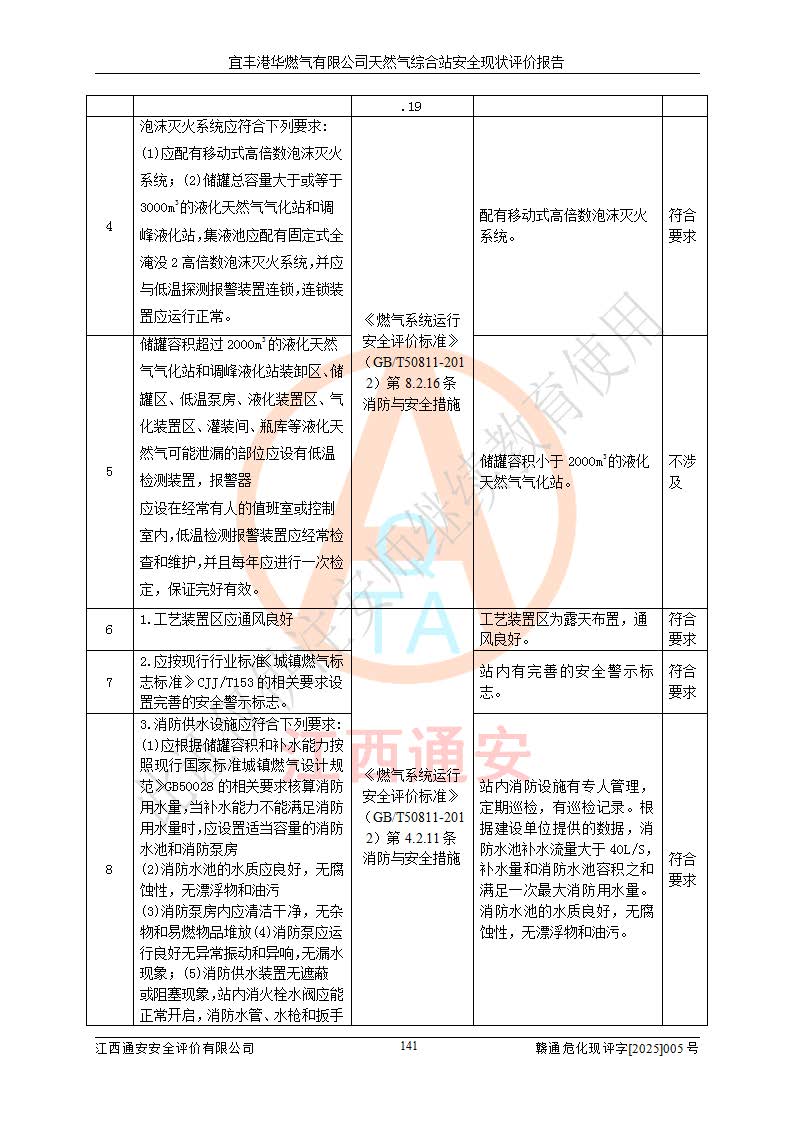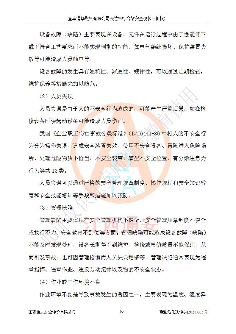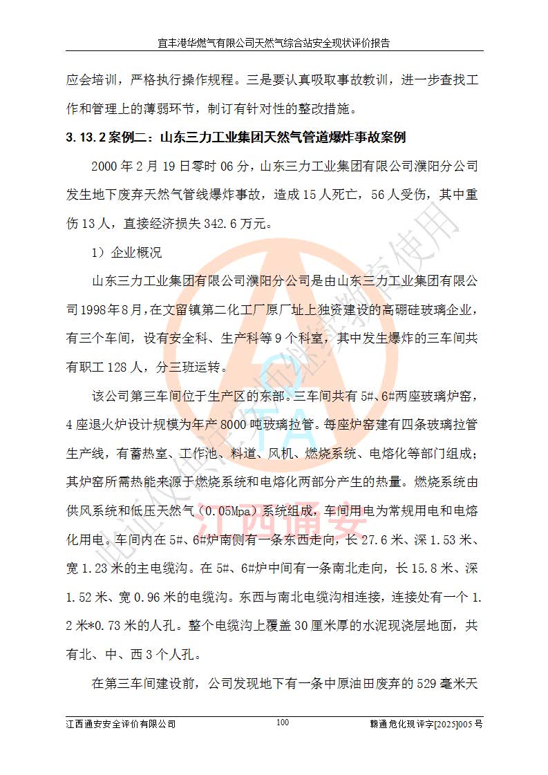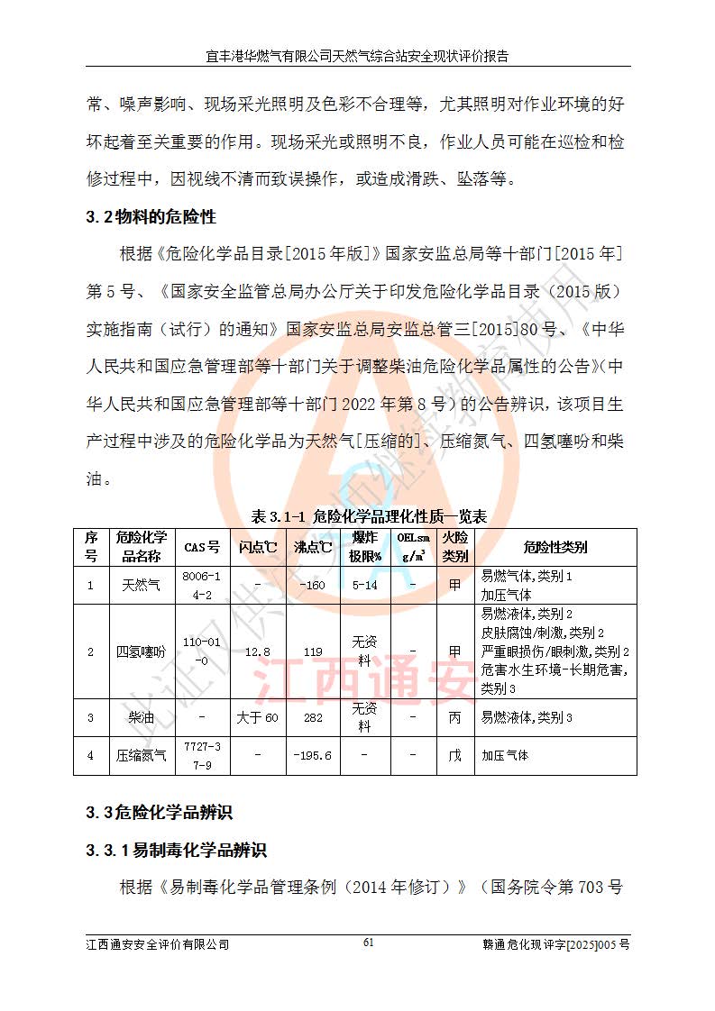 1、主要危险、危害因素辨识结果 宜丰港华燃气有限公司天然气综合站在生产经营过程中存在的主要危险有:火灾与爆炸、中毒窒息、触电、机械伤害、物体打击、**伤害、高处坠落、灼烫、低温冻伤、容器爆炸、淹溺等,存在的主要危害因素有:化学因素、物理因素(噪声、高温等)等,同时存在人为失误和管理缺陷。应重点防范的主要危险为火灾与爆炸、容器爆炸。 2、危险化学品辨识结果 经辨识,该储配站涉及的天然气、四氢噻吩及柴油属于危险化学品,天然气属于重点监管的危险化学品和特别管控危险化学品,不涉及监控化学品、易制毒化学品、易制爆危险化学品、剧毒化学品和高毒物品等危险化学品。 3、危险化学品重大危险源辨识结果 根据《危险化学品重大危险源辨识》(GB18218-2018)和《危险化学品重大危险源监督管理暂行规定》(2011)(40号令)(2015年 **安监总局令第79号修订)得出结论如下:该公司LNG储罐区构成三级重大危险源,其余生产单元及储存单元不构成危险化学品重大危险源。 4、重点监管危险化工工艺辨识结果 根据《**安全监管总局关于公布首批重点监管的危险化学品名录的通知》安监总管三[2011]95号、《**安全监管总局关于公布第二批重点监管危险化学品名录的通知》安监总管三[2013]12号进行辨识,该天然气储配站不涉及重点监管的危险化工工艺。 5、作业条件危险性分析结果: 液化天然气的储罐区、调压计量气化加臭区、卸车区、变配电、厂内运输、消防水池作业等单元。等单元危险程度均为“一般危险,需要注意”或“稍有危险,可以接受”级别。作业条件相对安全。 6、危险度评价结果:工艺装置区等级为Ⅱ级,危险程度为中度危险。LNG储罐区等级为Ⅰ级,危险程度为**危险。 7、事故后果预测结果:本报告采用中国安全生产科学研究院研发的重大危险源区域定量风险评价(CASST-QRA)软件对可能发生的危险化学品事故进行预测,宜丰港华燃气有限公司天然气综合站LNG储罐容器整体破裂,发生BLEVE灾害模式后果*大,*大死亡半径为181m,重伤半径为243m,轻伤半径为448m。 8、多米诺效应分析结果:该公司LNG储罐发生容器整体破裂引发的BLEVE事故的多米诺半径*大,为141m。 9、采用安全检查表评价法对该储配站周边环境、总平面布置、站内建构筑物防火间距、站内交通、LNG卸车、储罐、气化装置、加臭装置、调压装置、安全附件、工艺设备、管道、自动化控制等供配电、给排水、消防设施、供热装置、安全管理、“两重点一重大”安全措施及安全管理进行定性评价,不符合项共2项,其他均符合**法律、法规、标准、规范的要求。 (1)企业对不符合项整改完成后,安全条件符合燃气储存经营的安全要求。 (2)该储配站涉及“两重点一重大”,采取了首批重点监管的危险化学品安全措施和应急处置措施,站内LNG罐区构成三级重大危险源,采取的重大危险源安全技术和监控措施符合相关要求。 (3)根据《燃气经营许可管理办法》(建城〔2014〕167号发布,建城规〔2019〕2号修改)制成安全检查表对该单位的经营条件逐一检查,检查结果符合要求。 (4)根据《住房城乡建设部关于印发《城镇燃气经营安全重大隐患判定标准》的通知》(建城规[2023]4号)要求,对该项目重大隐患情况进行检查,该站LNG罐完成整改后不涉及重大隐患。 评价结论 综上所述,宜丰港华燃气有限公司天然气综合站选址和总平面布置合理,建构筑物间的防火间距、耐火等级等符合标准规范的要求,LNG卸车、储存、加臭、气化调压计量等装置采用成熟的工艺和设备,本质安全程度较高;公司制定了安全管理制度和操作规程,人员经培训合格后上岗,主要负责人、安全管理人员及特种作业人员均取得了相应的考核合格资格证书,能按照法律法规要求开展安全生产管理工作。公司对现场存在事故危险的设施和场所采取了合理可行的防护措施和科学的管理,使生产过程中的危险有害因素能得到**控制。该项目安全设施符合**现行有关法律、法规、标准的要求。企业对现场存在的安全问题进行了整改,主要的安全缺陷消除。 综合结论:宜丰港华燃气有限公司天然气综合站的安全条件符合燃气安全运行要求。 |