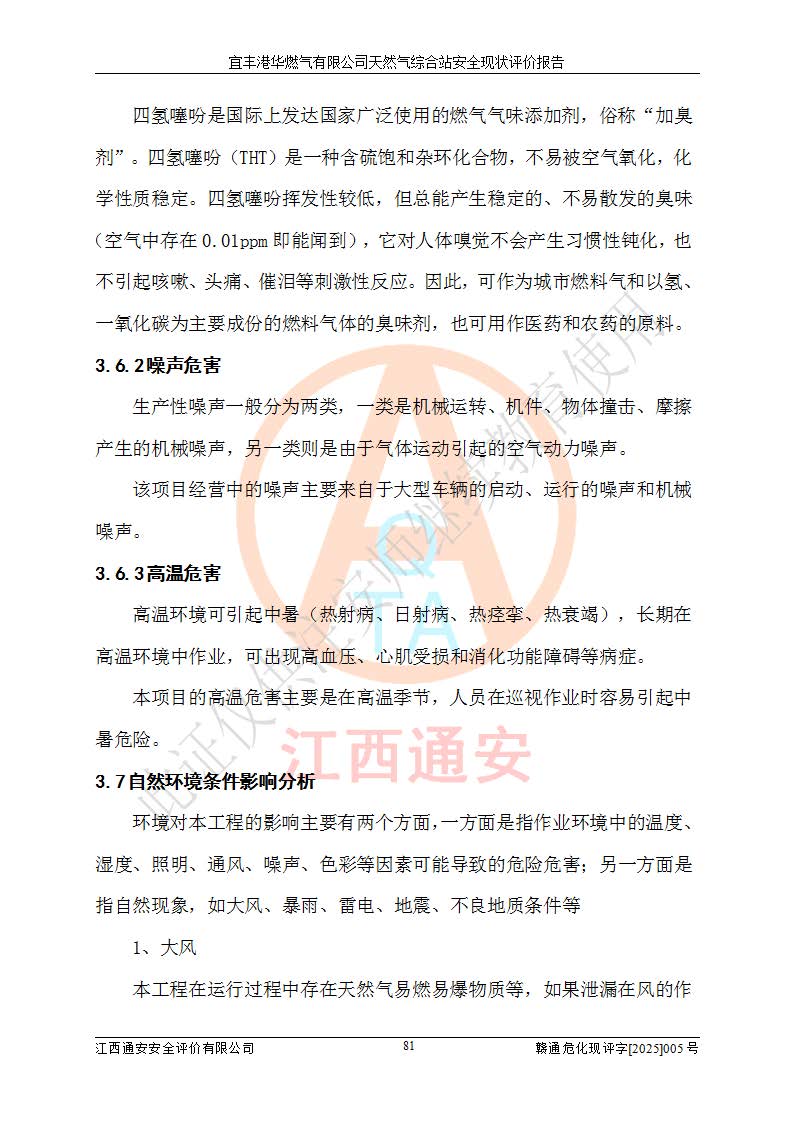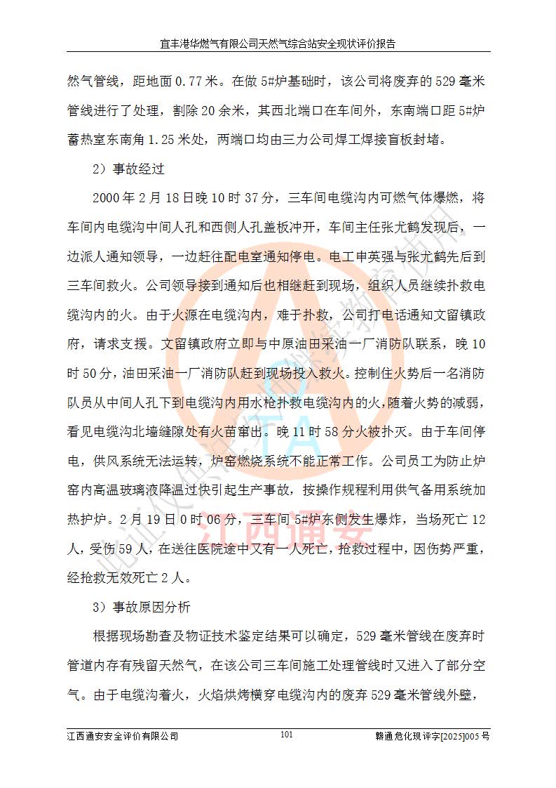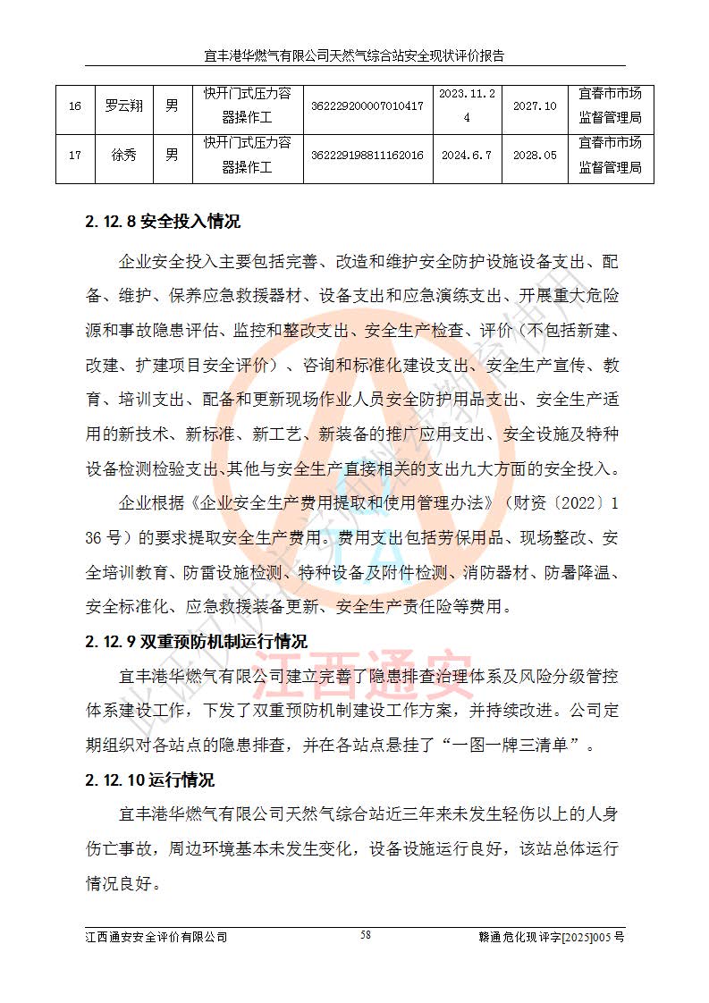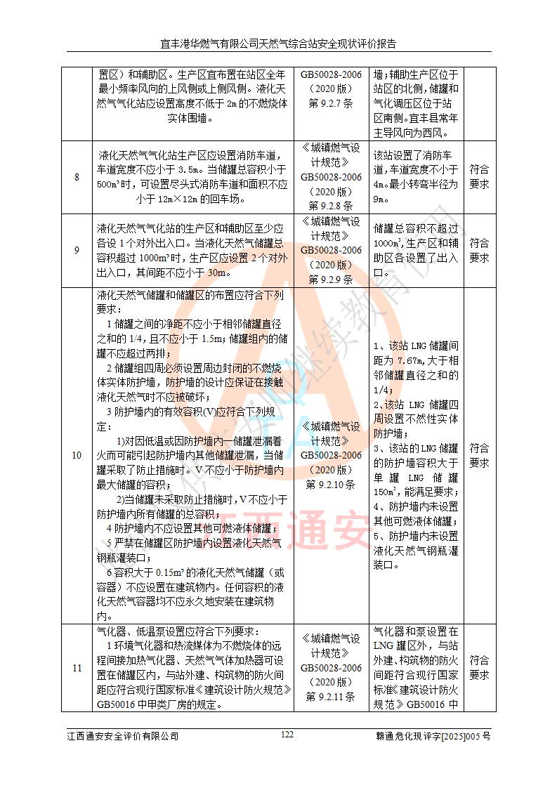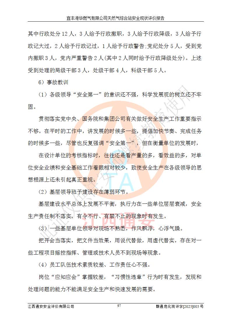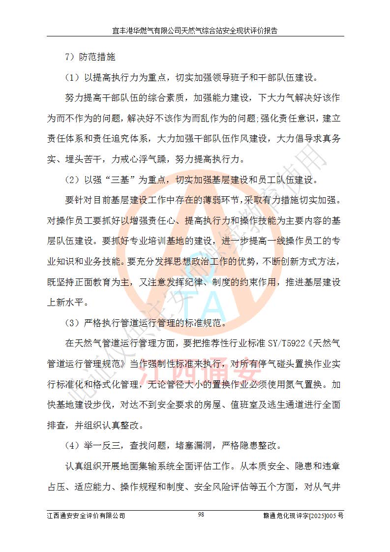1、主要危险、危害因素辨识结果 宜丰港华燃气有限公司天然气综合站在生产经营过程中存在的主要危险有:火灾与爆炸、中毒窒息、触电、机械伤害、物体打击、**伤害、高处坠落、灼烫、低温冻伤、容器爆炸、淹溺等,存在的主要危害因素有:化学因素、物理因素(噪声、高温等)等,同时存在人为失误和管理缺陷。应重点防范的主要危险为火灾与爆炸、容器爆炸。 2、危险化学品辨识结果 经辨识,该储配站涉及的天然气、四氢噻吩及柴油属于危险化学品,天然气属于重点监管的危险化学品和特别管控危险化学品,不涉及监控化学品、易制毒化学品、易制爆危险化学品、剧毒化学品和高毒物品等危险化学品。 3、危险化学品重大危险源辨识结果 根据《危险化学品重大危险源辨识》(GB18218-2018)和《危险化学品重大危险源监督管理暂行规定》(2011)(40号令)(2015年 **安监总局令第79号修订)得出结论如下:该公司LNG储罐区构成三级重大危险源,其余生产单元及储存单元不构成危险化学品重大危险源。 4、重点监管危险化工工艺辨识结果 根据《**安全监管总局关于公布首批重点监管的危险化学品名录的通知》安监总管三[2011]95号、《**安全监管总局关于公布第二批重点监管危险化学品名录的通知》安监总管三[2013]12号进行辨识,该天然气储配站不涉及重点监管的危险化工工艺。 5、作业条件危险性分析结果: 液化天然气的储罐区、调压计量气化加臭区、卸车区、变配电、厂内运输、消防水池作业等单元。等单元危险程度均为“一般危险,需要注意”或“稍有危险,可以接受”级别。作业条件相对安全。 6、危险度评价结果:工艺装置区等级为Ⅱ级,危险程度为中度危险。LNG储罐区等级为Ⅰ级,危险程度为**危险。 7、事故后果预测结果:本报告采用中国安全生产科学研究院研发的重大危险源区域定量风险评价(CASST-QRA)软件对可能发生的危险化学品事故进行预测,宜丰港华燃气有限公司天然气综合站LNG储罐容器整体破裂,发生BLEVE灾害模式后果*大,*大死亡半径为181m,重伤半径为243m,轻伤半径为448m。 8、多米诺效应分析结果:该公司LNG储罐发生容器整体破裂引发的BLEVE事故的多米诺半径*大,为141m。 9、采用安全检查表评价法对该储配站周边环境、总平面布置、站内建构筑物防火间距、站内交通、LNG卸车、储罐、气化装置、加臭装置、调压装置、安全附件、工艺设备、管道、自动化控制等供配电、给排水、消防设施、供热装置、安全管理、“两重点一重大”安全措施及安全管理进行定性评价,不符合项共2项,其他均符合**法律、法规、标准、规范的要求。 (1)企业对不符合项整改完成后,安全条件符合燃气储存经营的安全要求。 (2)该储配站涉及“两重点一重大”,采取了首批重点监管的危险化学品安全措施和应急处置措施,站内LNG罐区构成三级重大危险源,采取的重大危险源安全技术和监控措施符合相关要求。 (3)根据《燃气经营许可管理办法》(建城〔2014〕167号发布,建城规〔2019〕2号修改)制成安全检查表对该单位的经营条件逐一检查,检查结果符合要求。 (4)根据《住房城乡建设部关于印发《城镇燃气经营安全重大隐患判定标准》的通知》(建城规[2023]4号)要求,对该项目重大隐患情况进行检查,该站LNG罐完成整改后不涉及重大隐患。 评价结论 综上所述,宜丰港华燃气有限公司天然气综合站选址和总平面布置合理,建构筑物间的防火间距、耐火等级等符合标准规范的要求,LNG卸车、储存、加臭、气化调压计量等装置采用成熟的工艺和设备,本质安全程度较高;公司制定了安全管理制度和操作规程,人员经培训合格后上岗,主要负责人、安全管理人员及特种作业人员均取得了相应的考核合格资格证书,能按照法律法规要求开展安全生产管理工作。公司对现场存在事故危险的设施和场所采取了合理可行的防护措施和科学的管理,使生产过程中的危险有害因素能得到**控制。该项目安全设施符合**现行有关法律、法规、标准的要求。企业对现场存在的安全问题进行了整改,主要的安全缺陷消除。 综合结论:宜丰港华燃气有限公司天然气综合站的安全条件符合燃气安全运行要求。 |