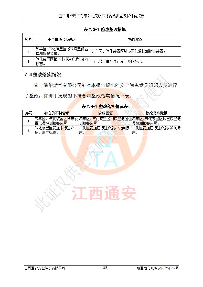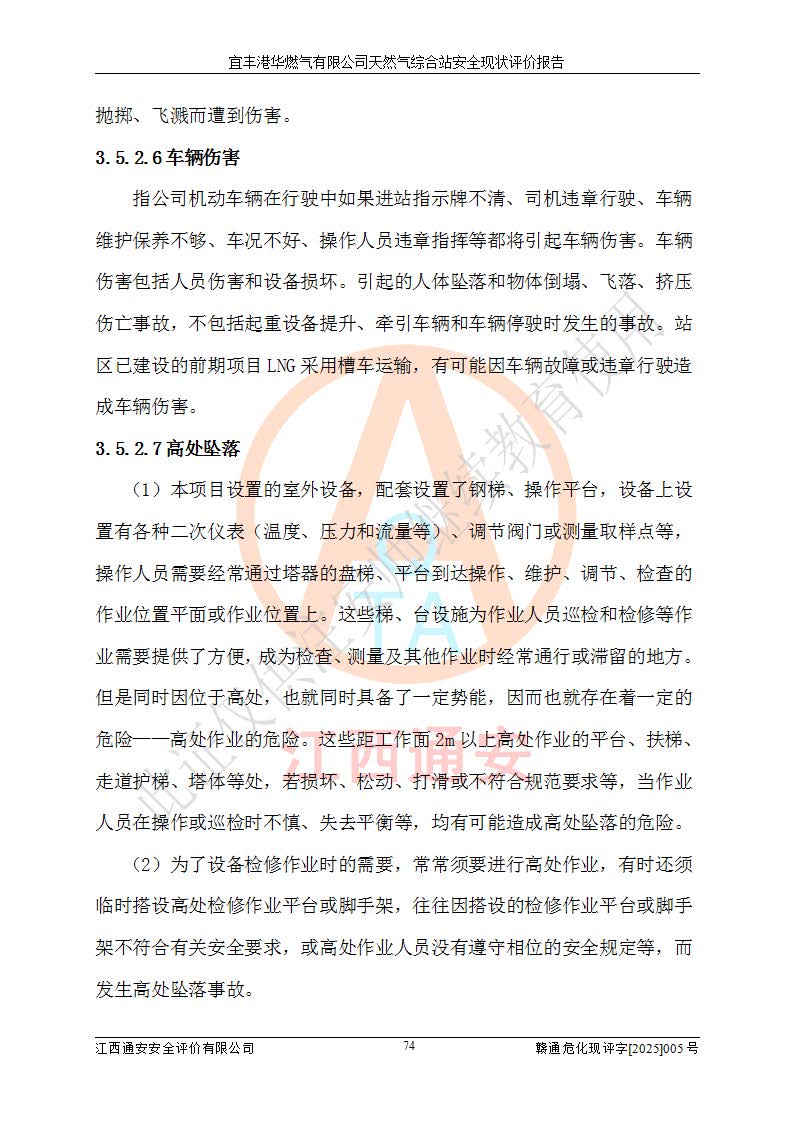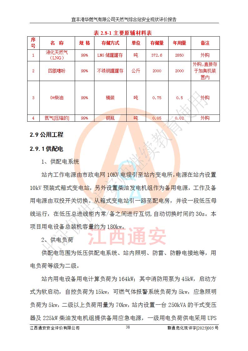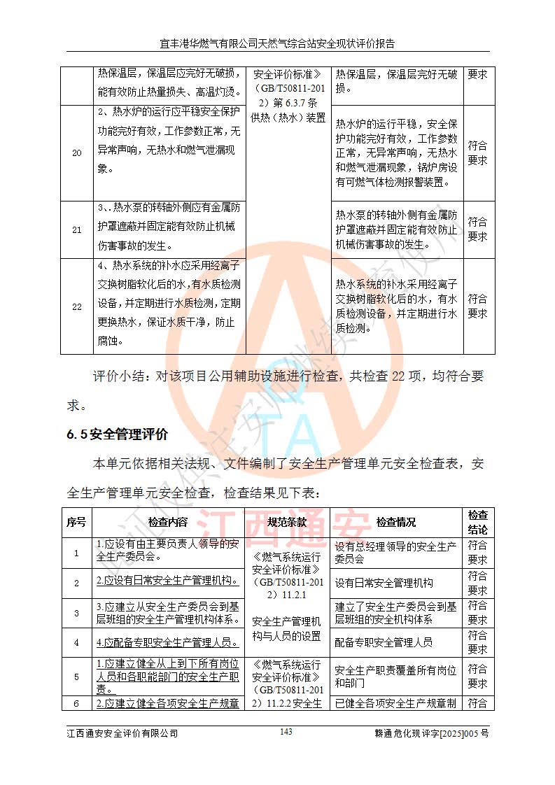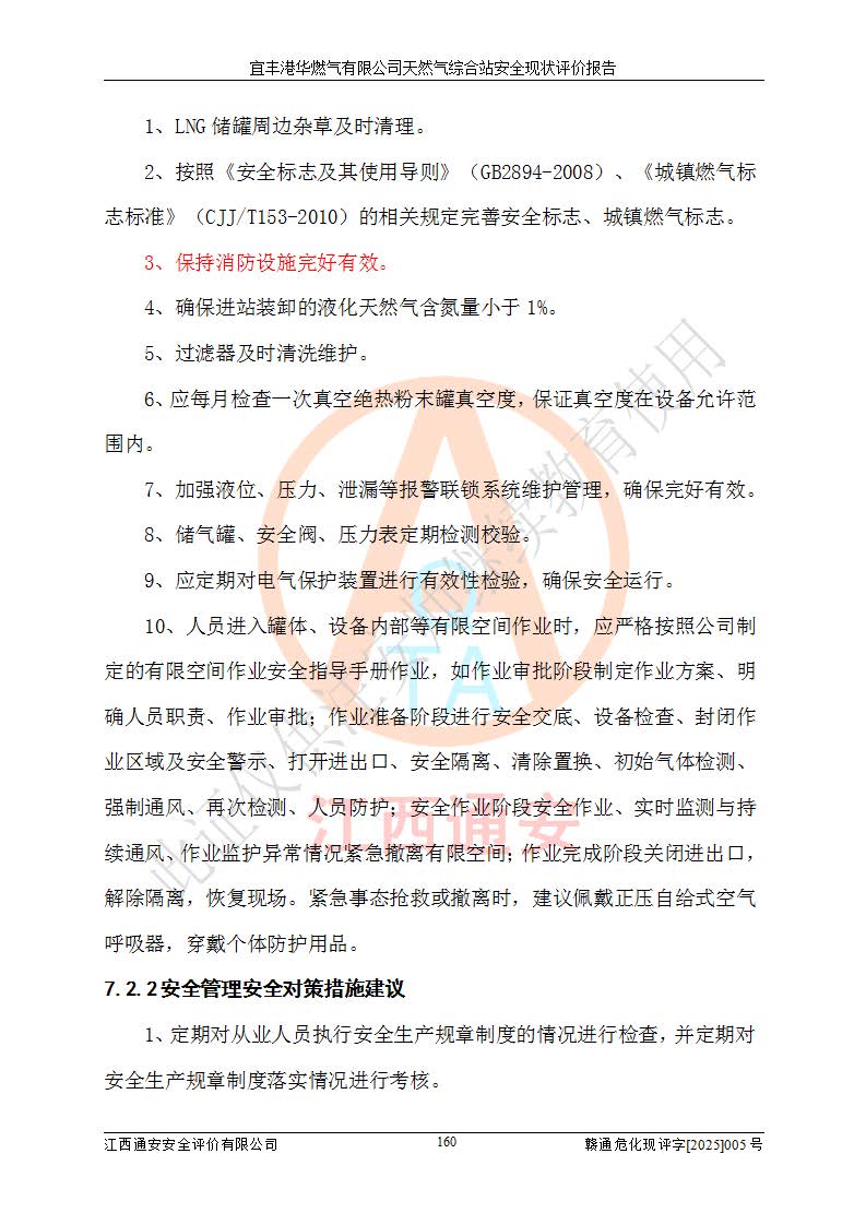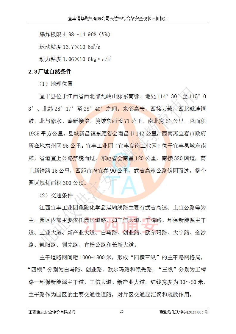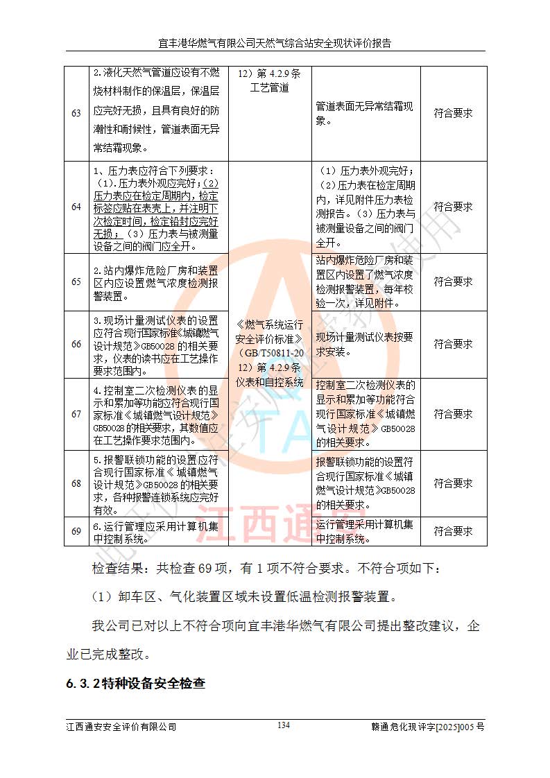 1、主要危险、危害因素辨识结果 宜丰港华燃气有限公司天然气综合站在生产经营过程中存在的主要危险有:火灾与爆炸、中毒窒息、触电、机械伤害、物体打击、**伤害、高处坠落、灼烫、低温冻伤、容器爆炸、淹溺等,存在的主要危害因素有:化学因素、物理因素(噪声、高温等)等,同时存在人为失误和管理缺陷。应重点防范的主要危险为火灾与爆炸、容器爆炸。 2、危险化学品辨识结果 经辨识,该储配站涉及的天然气、四氢噻吩及柴油属于危险化学品,天然气属于重点监管的危险化学品和特别管控危险化学品,不涉及监控化学品、易制毒化学品、易制爆危险化学品、剧毒化学品和高毒物品等危险化学品。 3、危险化学品重大危险源辨识结果 根据《危险化学品重大危险源辨识》(GB18218-2018)和《危险化学品重大危险源监督管理暂行规定》(2011)(40号令)(2015年 **安监总局令第79号修订)得出结论如下:该公司LNG储罐区构成三级重大危险源,其余生产单元及储存单元不构成危险化学品重大危险源。 4、重点监管危险化工工艺辨识结果 根据《**安全监管总局关于公布首批重点监管的危险化学品名录的通知》安监总管三[2011]95号、《**安全监管总局关于公布第二批重点监管危险化学品名录的通知》安监总管三[2013]12号进行辨识,该天然气储配站不涉及重点监管的危险化工工艺。 5、作业条件危险性分析结果: 液化天然气的储罐区、调压计量气化加臭区、卸车区、变配电、厂内运输、消防水池作业等单元。等单元危险程度均为“一般危险,需要注意”或“稍有危险,可以接受”级别。作业条件相对安全。 6、危险度评价结果:工艺装置区等级为Ⅱ级,危险程度为中度危险。LNG储罐区等级为Ⅰ级,危险程度为**危险。 7、事故后果预测结果:本报告采用中国安全生产科学研究院研发的重大危险源区域定量风险评价(CASST-QRA)软件对可能发生的危险化学品事故进行预测,宜丰港华燃气有限公司天然气综合站LNG储罐容器整体破裂,发生BLEVE灾害模式后果*大,*大死亡半径为181m,重伤半径为243m,轻伤半径为448m。 8、多米诺效应分析结果:该公司LNG储罐发生容器整体破裂引发的BLEVE事故的多米诺半径*大,为141m。 9、采用安全检查表评价法对该储配站周边环境、总平面布置、站内建构筑物防火间距、站内交通、LNG卸车、储罐、气化装置、加臭装置、调压装置、安全附件、工艺设备、管道、自动化控制等供配电、给排水、消防设施、供热装置、安全管理、“两重点一重大”安全措施及安全管理进行定性评价,不符合项共2项,其他均符合**法律、法规、标准、规范的要求。 (1)企业对不符合项整改完成后,安全条件符合燃气储存经营的安全要求。 (2)该储配站涉及“两重点一重大”,采取了首批重点监管的危险化学品安全措施和应急处置措施,站内LNG罐区构成三级重大危险源,采取的重大危险源安全技术和监控措施符合相关要求。 (3)根据《燃气经营许可管理办法》(建城〔2014〕167号发布,建城规〔2019〕2号修改)制成安全检查表对该单位的经营条件逐一检查,检查结果符合要求。 (4)根据《住房城乡建设部关于印发《城镇燃气经营安全重大隐患判定标准》的通知》(建城规[2023]4号)要求,对该项目重大隐患情况进行检查,该站LNG罐完成整改后不涉及重大隐患。 评价结论 综上所述,宜丰港华燃气有限公司天然气综合站选址和总平面布置合理,建构筑物间的防火间距、耐火等级等符合标准规范的要求,LNG卸车、储存、加臭、气化调压计量等装置采用成熟的工艺和设备,本质安全程度较高;公司制定了安全管理制度和操作规程,人员经培训合格后上岗,主要负责人、安全管理人员及特种作业人员均取得了相应的考核合格资格证书,能按照法律法规要求开展安全生产管理工作。公司对现场存在事故危险的设施和场所采取了合理可行的防护措施和科学的管理,使生产过程中的危险有害因素能得到**控制。该项目安全设施符合**现行有关法律、法规、标准的要求。企业对现场存在的安全问题进行了整改,主要的安全缺陷消除。 综合结论:宜丰港华燃气有限公司天然气综合站的安全条件符合燃气安全运行要求。 |