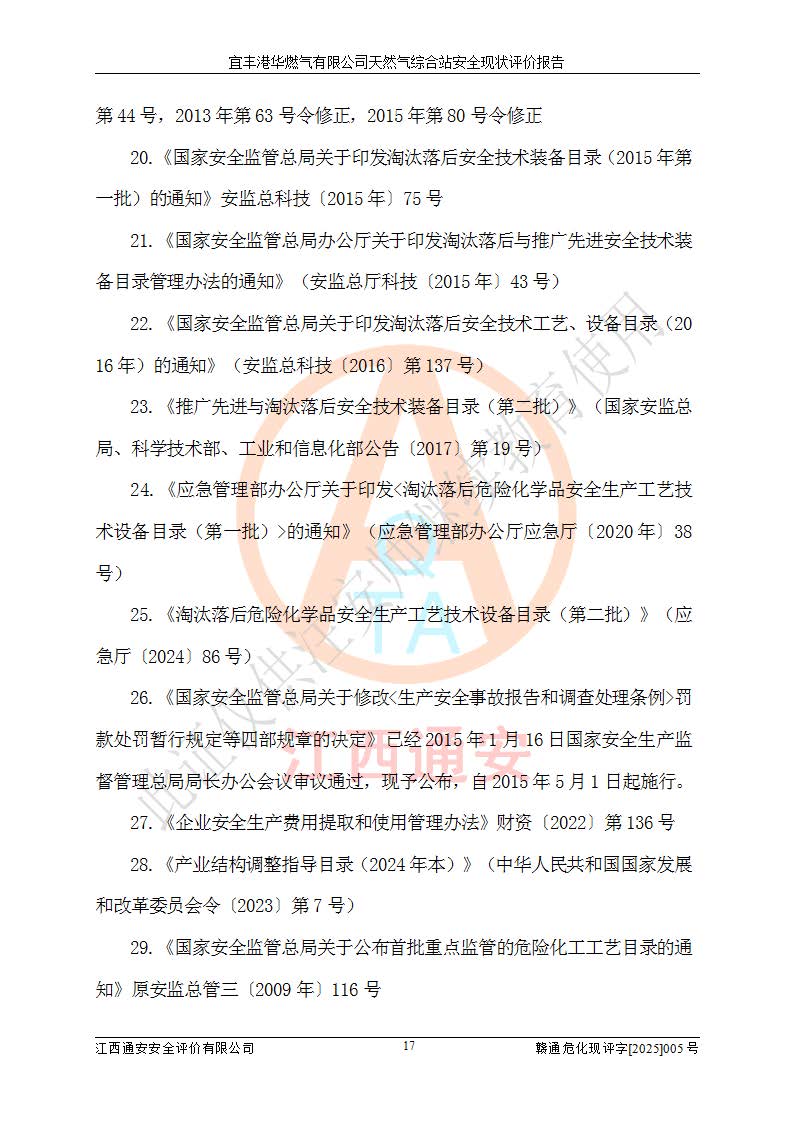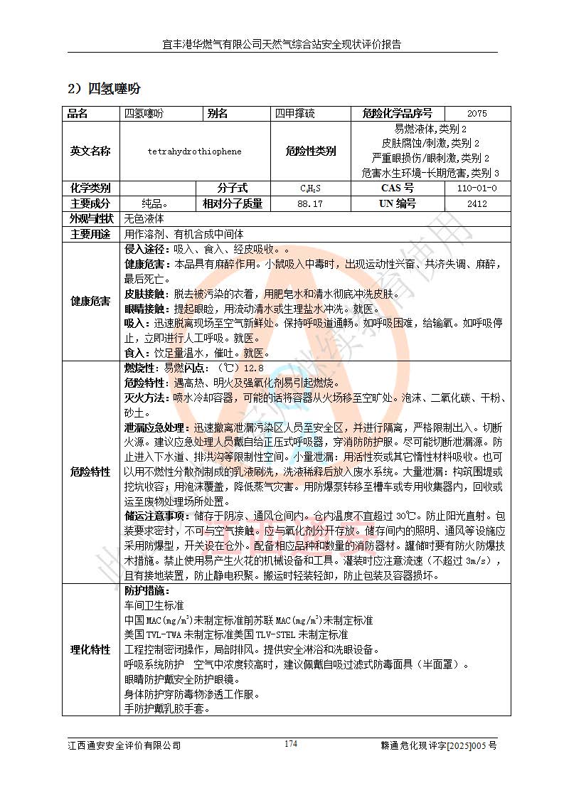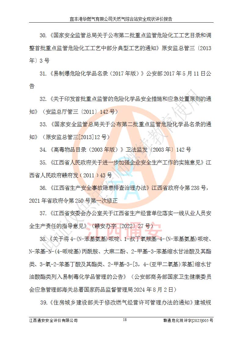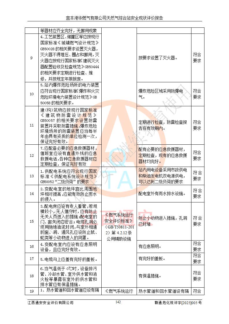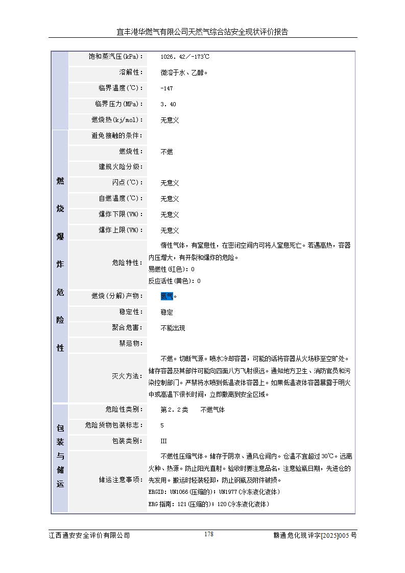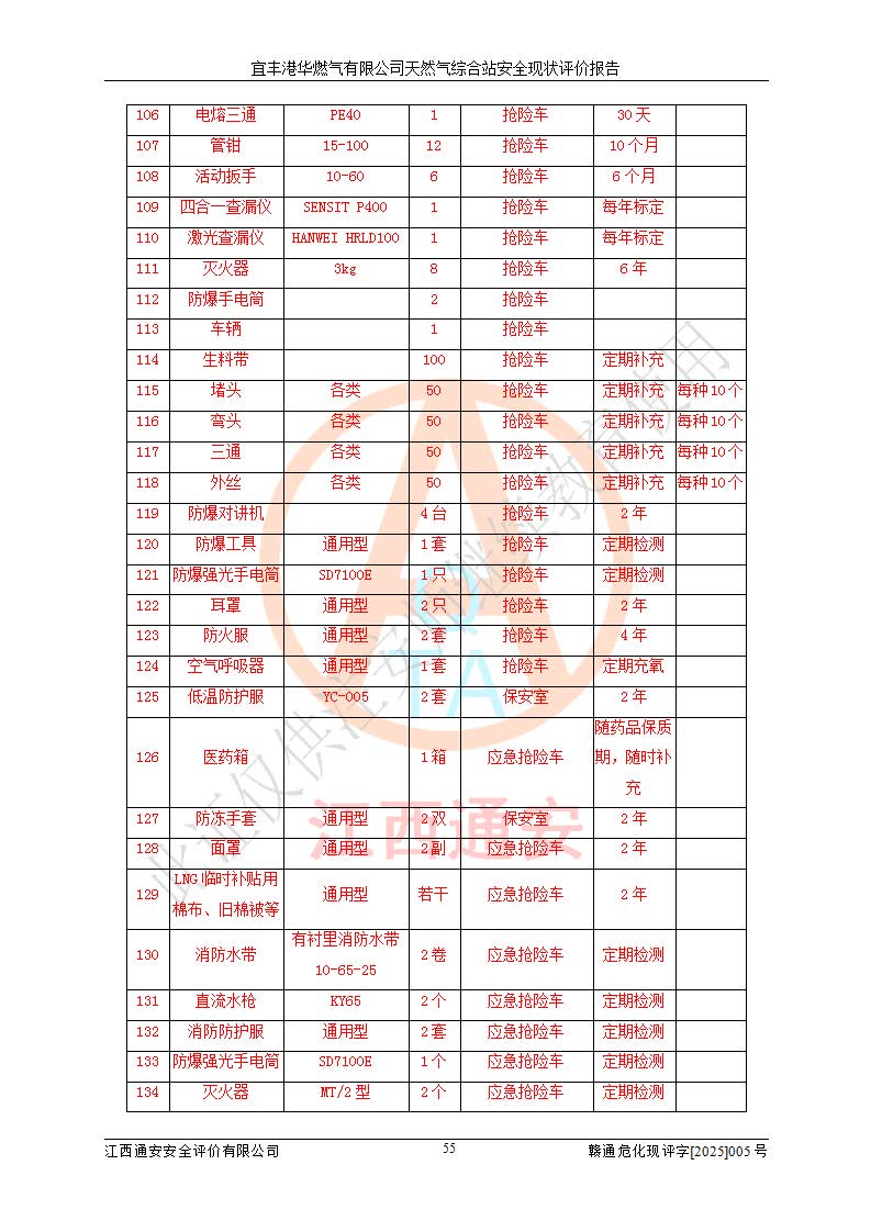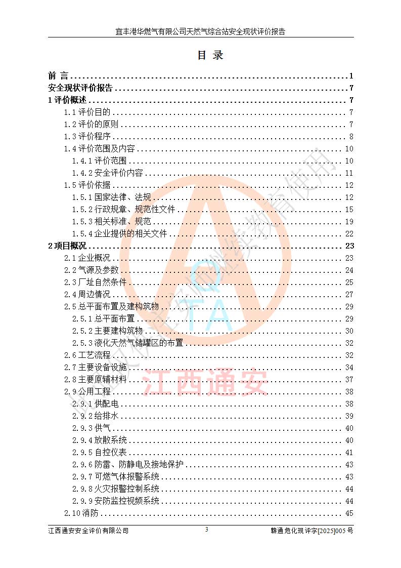 1、主要危险、危害因素辨识结果 宜丰港华燃气有限公司天然气综合站在生产经营过程中存在的主要危险有:火灾与爆炸、中毒窒息、触电、机械伤害、物体打击、**伤害、高处坠落、灼烫、低温冻伤、容器爆炸、淹溺等,存在的主要危害因素有:化学因素、物理因素(噪声、高温等)等,同时存在人为失误和管理缺陷。应重点防范的主要危险为火灾与爆炸、容器爆炸。 2、危险化学品辨识结果 经辨识,该储配站涉及的天然气、四氢噻吩及柴油属于危险化学品,天然气属于重点监管的危险化学品和特别管控危险化学品,不涉及监控化学品、易制毒化学品、易制爆危险化学品、剧毒化学品和高毒物品等危险化学品。 3、危险化学品重大危险源辨识结果 根据《危险化学品重大危险源辨识》(GB18218-2018)和《危险化学品重大危险源监督管理暂行规定》(2011)(40号令)(2015年 **安监总局令第79号修订)得出结论如下:该公司LNG储罐区构成三级重大危险源,其余生产单元及储存单元不构成危险化学品重大危险源。 4、重点监管危险化工工艺辨识结果 根据《**安全监管总局关于公布首批重点监管的危险化学品名录的通知》安监总管三[2011]95号、《**安全监管总局关于公布第二批重点监管危险化学品名录的通知》安监总管三[2013]12号进行辨识,该天然气储配站不涉及重点监管的危险化工工艺。 5、作业条件危险性分析结果: 液化天然气的储罐区、调压计量气化加臭区、卸车区、变配电、厂内运输、消防水池作业等单元。等单元危险程度均为“一般危险,需要注意”或“稍有危险,可以接受”级别。作业条件相对安全。 6、危险度评价结果:工艺装置区等级为Ⅱ级,危险程度为中度危险。LNG储罐区等级为Ⅰ级,危险程度为**危险。 7、事故后果预测结果:本报告采用中国安全生产科学研究院研发的重大危险源区域定量风险评价(CASST-QRA)软件对可能发生的危险化学品事故进行预测,宜丰港华燃气有限公司天然气综合站LNG储罐容器整体破裂,发生BLEVE灾害模式后果*大,*大死亡半径为181m,重伤半径为243m,轻伤半径为448m。 8、多米诺效应分析结果:该公司LNG储罐发生容器整体破裂引发的BLEVE事故的多米诺半径*大,为141m。 9、采用安全检查表评价法对该储配站周边环境、总平面布置、站内建构筑物防火间距、站内交通、LNG卸车、储罐、气化装置、加臭装置、调压装置、安全附件、工艺设备、管道、自动化控制等供配电、给排水、消防设施、供热装置、安全管理、“两重点一重大”安全措施及安全管理进行定性评价,不符合项共2项,其他均符合**法律、法规、标准、规范的要求。 (1)企业对不符合项整改完成后,安全条件符合燃气储存经营的安全要求。 (2)该储配站涉及“两重点一重大”,采取了首批重点监管的危险化学品安全措施和应急处置措施,站内LNG罐区构成三级重大危险源,采取的重大危险源安全技术和监控措施符合相关要求。 (3)根据《燃气经营许可管理办法》(建城〔2014〕167号发布,建城规〔2019〕2号修改)制成安全检查表对该单位的经营条件逐一检查,检查结果符合要求。 (4)根据《住房城乡建设部关于印发《城镇燃气经营安全重大隐患判定标准》的通知》(建城规[2023]4号)要求,对该项目重大隐患情况进行检查,该站LNG罐完成整改后不涉及重大隐患。 评价结论 综上所述,宜丰港华燃气有限公司天然气综合站选址和总平面布置合理,建构筑物间的防火间距、耐火等级等符合标准规范的要求,LNG卸车、储存、加臭、气化调压计量等装置采用成熟的工艺和设备,本质安全程度较高;公司制定了安全管理制度和操作规程,人员经培训合格后上岗,主要负责人、安全管理人员及特种作业人员均取得了相应的考核合格资格证书,能按照法律法规要求开展安全生产管理工作。公司对现场存在事故危险的设施和场所采取了合理可行的防护措施和科学的管理,使生产过程中的危险有害因素能得到**控制。该项目安全设施符合**现行有关法律、法规、标准的要求。企业对现场存在的安全问题进行了整改,主要的安全缺陷消除。 综合结论:宜丰港华燃气有限公司天然气综合站的安全条件符合燃气安全运行要求。 |