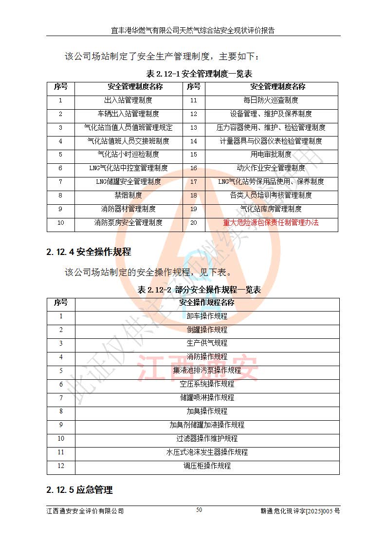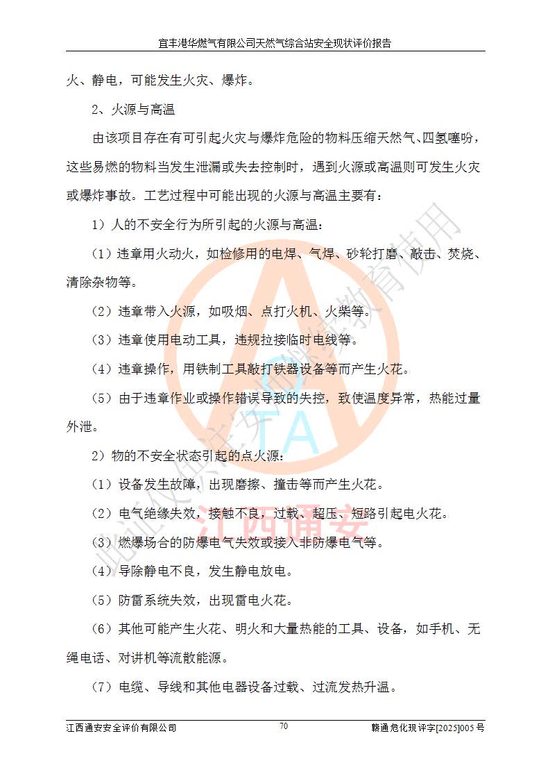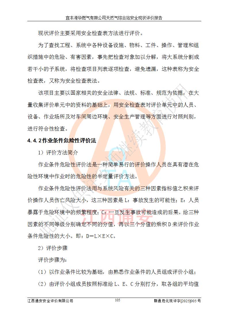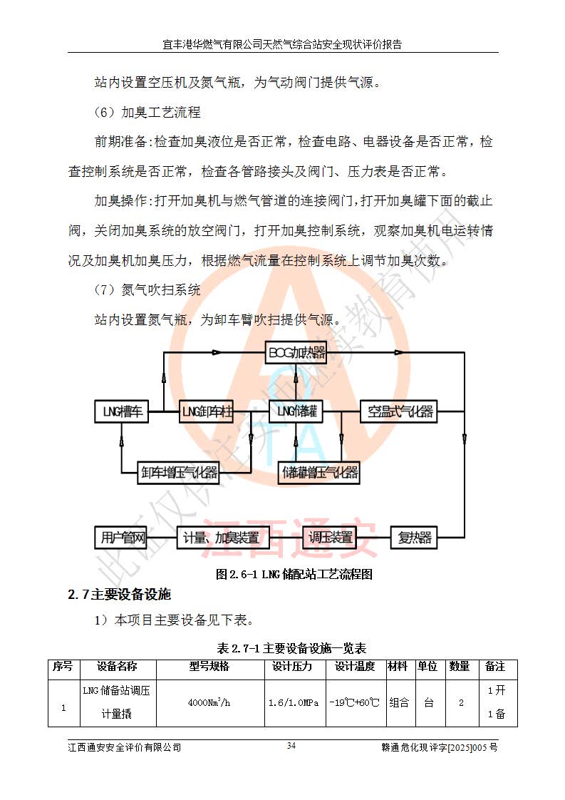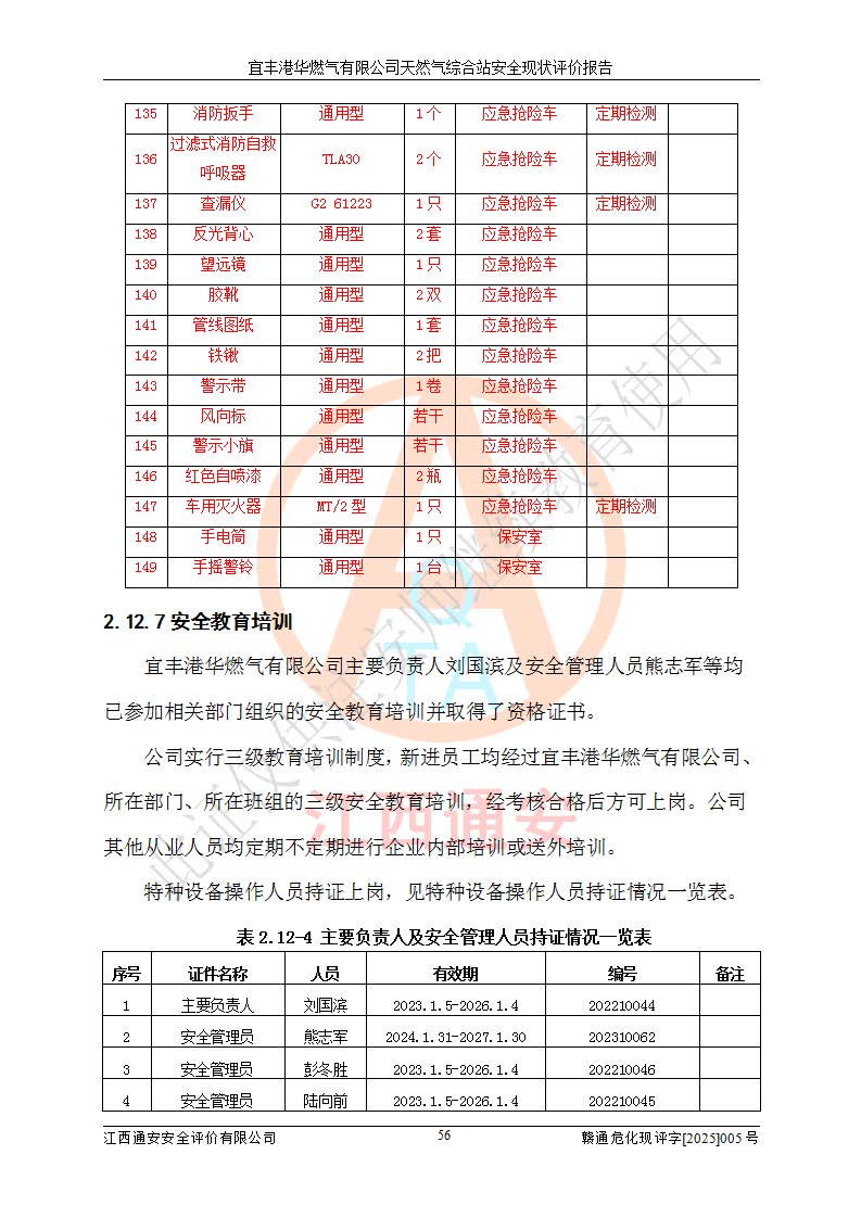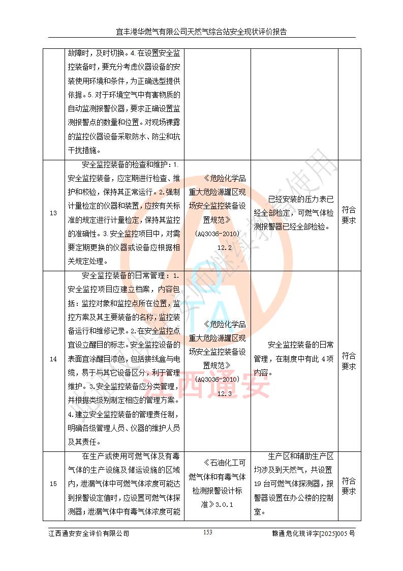 1、主要危险、危害因素辨识结果 宜丰港华燃气有限公司天然气综合站在生产经营过程中存在的主要危险有:火灾与爆炸、中毒窒息、触电、机械伤害、物体打击、**伤害、高处坠落、灼烫、低温冻伤、容器爆炸、淹溺等,存在的主要危害因素有:化学因素、物理因素(噪声、高温等)等,同时存在人为失误和管理缺陷。应重点防范的主要危险为火灾与爆炸、容器爆炸。 2、危险化学品辨识结果 经辨识,该储配站涉及的天然气、四氢噻吩及柴油属于危险化学品,天然气属于重点监管的危险化学品和特别管控危险化学品,不涉及监控化学品、易制毒化学品、易制爆危险化学品、剧毒化学品和高毒物品等危险化学品。 3、危险化学品重大危险源辨识结果 根据《危险化学品重大危险源辨识》(GB18218-2018)和《危险化学品重大危险源监督管理暂行规定》(2011)(40号令)(2015年 **安监总局令第79号修订)得出结论如下:该公司LNG储罐区构成三级重大危险源,其余生产单元及储存单元不构成危险化学品重大危险源。 4、重点监管危险化工工艺辨识结果 根据《**安全监管总局关于公布首批重点监管的危险化学品名录的通知》安监总管三[2011]95号、《**安全监管总局关于公布第二批重点监管危险化学品名录的通知》安监总管三[2013]12号进行辨识,该天然气储配站不涉及重点监管的危险化工工艺。 5、作业条件危险性分析结果: 液化天然气的储罐区、调压计量气化加臭区、卸车区、变配电、厂内运输、消防水池作业等单元。等单元危险程度均为“一般危险,需要注意”或“稍有危险,可以接受”级别。作业条件相对安全。 6、危险度评价结果:工艺装置区等级为Ⅱ级,危险程度为中度危险。LNG储罐区等级为Ⅰ级,危险程度为**危险。 7、事故后果预测结果:本报告采用中国安全生产科学研究院研发的重大危险源区域定量风险评价(CASST-QRA)软件对可能发生的危险化学品事故进行预测,宜丰港华燃气有限公司天然气综合站LNG储罐容器整体破裂,发生BLEVE灾害模式后果*大,*大死亡半径为181m,重伤半径为243m,轻伤半径为448m。 8、多米诺效应分析结果:该公司LNG储罐发生容器整体破裂引发的BLEVE事故的多米诺半径*大,为141m。 9、采用安全检查表评价法对该储配站周边环境、总平面布置、站内建构筑物防火间距、站内交通、LNG卸车、储罐、气化装置、加臭装置、调压装置、安全附件、工艺设备、管道、自动化控制等供配电、给排水、消防设施、供热装置、安全管理、“两重点一重大”安全措施及安全管理进行定性评价,不符合项共2项,其他均符合**法律、法规、标准、规范的要求。 (1)企业对不符合项整改完成后,安全条件符合燃气储存经营的安全要求。 (2)该储配站涉及“两重点一重大”,采取了首批重点监管的危险化学品安全措施和应急处置措施,站内LNG罐区构成三级重大危险源,采取的重大危险源安全技术和监控措施符合相关要求。 (3)根据《燃气经营许可管理办法》(建城〔2014〕167号发布,建城规〔2019〕2号修改)制成安全检查表对该单位的经营条件逐一检查,检查结果符合要求。 (4)根据《住房城乡建设部关于印发《城镇燃气经营安全重大隐患判定标准》的通知》(建城规[2023]4号)要求,对该项目重大隐患情况进行检查,该站LNG罐完成整改后不涉及重大隐患。 评价结论 综上所述,宜丰港华燃气有限公司天然气综合站选址和总平面布置合理,建构筑物间的防火间距、耐火等级等符合标准规范的要求,LNG卸车、储存、加臭、气化调压计量等装置采用成熟的工艺和设备,本质安全程度较高;公司制定了安全管理制度和操作规程,人员经培训合格后上岗,主要负责人、安全管理人员及特种作业人员均取得了相应的考核合格资格证书,能按照法律法规要求开展安全生产管理工作。公司对现场存在事故危险的设施和场所采取了合理可行的防护措施和科学的管理,使生产过程中的危险有害因素能得到**控制。该项目安全设施符合**现行有关法律、法规、标准的要求。企业对现场存在的安全问题进行了整改,主要的安全缺陷消除。 综合结论:宜丰港华燃气有限公司天然气综合站的安全条件符合燃气安全运行要求。 |