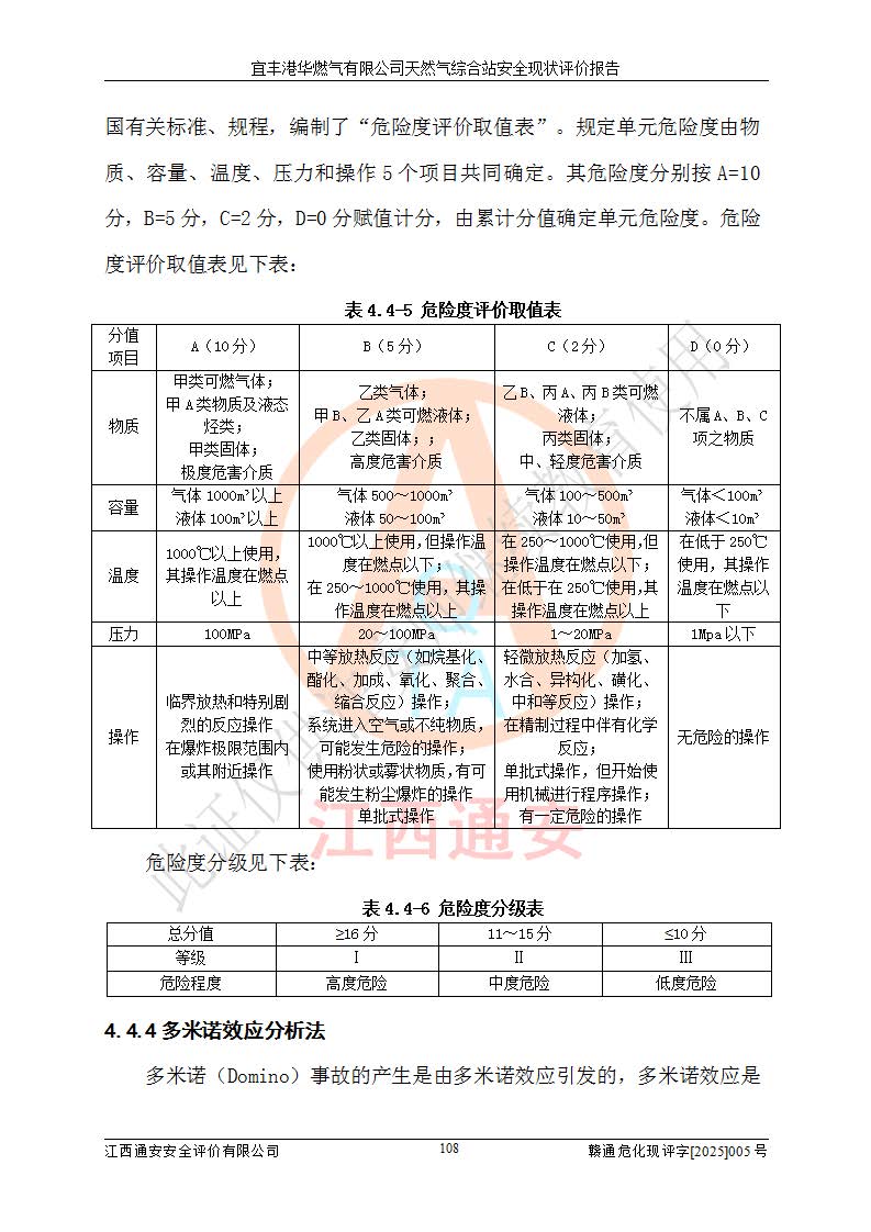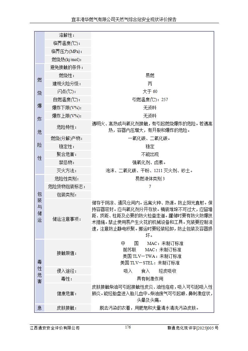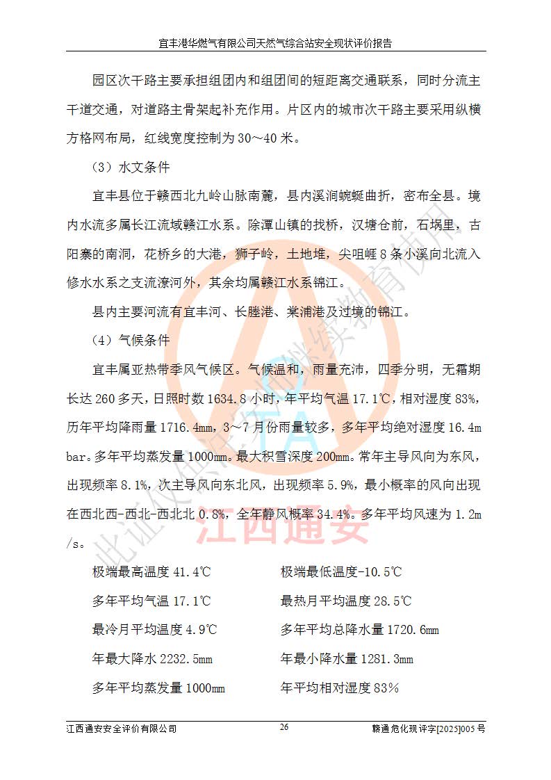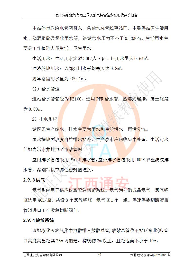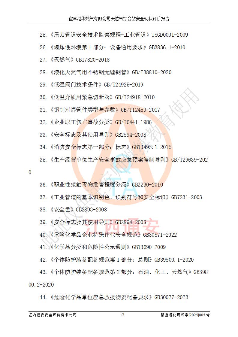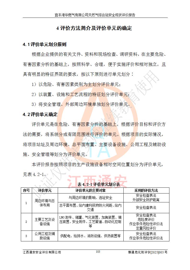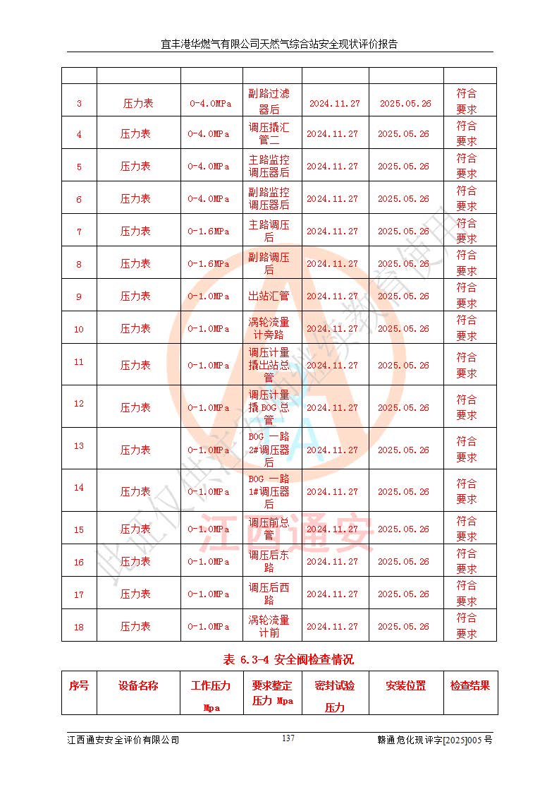 1、主要危险、危害因素辨识结果 宜丰港华燃气有限公司天然气综合站在生产经营过程中存在的主要危险有:火灾与爆炸、中毒窒息、触电、机械伤害、物体打击、**伤害、高处坠落、灼烫、低温冻伤、容器爆炸、淹溺等,存在的主要危害因素有:化学因素、物理因素(噪声、高温等)等,同时存在人为失误和管理缺陷。应重点防范的主要危险为火灾与爆炸、容器爆炸。 2、危险化学品辨识结果 经辨识,该储配站涉及的天然气、四氢噻吩及柴油属于危险化学品,天然气属于重点监管的危险化学品和特别管控危险化学品,不涉及监控化学品、易制毒化学品、易制爆危险化学品、剧毒化学品和高毒物品等危险化学品。 3、危险化学品重大危险源辨识结果 根据《危险化学品重大危险源辨识》(GB18218-2018)和《危险化学品重大危险源监督管理暂行规定》(2011)(40号令)(2015年 **安监总局令第79号修订)得出结论如下:该公司LNG储罐区构成三级重大危险源,其余生产单元及储存单元不构成危险化学品重大危险源。 4、重点监管危险化工工艺辨识结果 根据《**安全监管总局关于公布首批重点监管的危险化学品名录的通知》安监总管三[2011]95号、《**安全监管总局关于公布第二批重点监管危险化学品名录的通知》安监总管三[2013]12号进行辨识,该天然气储配站不涉及重点监管的危险化工工艺。 5、作业条件危险性分析结果: 液化天然气的储罐区、调压计量气化加臭区、卸车区、变配电、厂内运输、消防水池作业等单元。等单元危险程度均为“一般危险,需要注意”或“稍有危险,可以接受”级别。作业条件相对安全。 6、危险度评价结果:工艺装置区等级为Ⅱ级,危险程度为中度危险。LNG储罐区等级为Ⅰ级,危险程度为**危险。 7、事故后果预测结果:本报告采用中国安全生产科学研究院研发的重大危险源区域定量风险评价(CASST-QRA)软件对可能发生的危险化学品事故进行预测,宜丰港华燃气有限公司天然气综合站LNG储罐容器整体破裂,发生BLEVE灾害模式后果*大,*大死亡半径为181m,重伤半径为243m,轻伤半径为448m。 8、多米诺效应分析结果:该公司LNG储罐发生容器整体破裂引发的BLEVE事故的多米诺半径*大,为141m。 9、采用安全检查表评价法对该储配站周边环境、总平面布置、站内建构筑物防火间距、站内交通、LNG卸车、储罐、气化装置、加臭装置、调压装置、安全附件、工艺设备、管道、自动化控制等供配电、给排水、消防设施、供热装置、安全管理、“两重点一重大”安全措施及安全管理进行定性评价,不符合项共2项,其他均符合**法律、法规、标准、规范的要求。 (1)企业对不符合项整改完成后,安全条件符合燃气储存经营的安全要求。 (2)该储配站涉及“两重点一重大”,采取了首批重点监管的危险化学品安全措施和应急处置措施,站内LNG罐区构成三级重大危险源,采取的重大危险源安全技术和监控措施符合相关要求。 (3)根据《燃气经营许可管理办法》(建城〔2014〕167号发布,建城规〔2019〕2号修改)制成安全检查表对该单位的经营条件逐一检查,检查结果符合要求。 (4)根据《住房城乡建设部关于印发《城镇燃气经营安全重大隐患判定标准》的通知》(建城规[2023]4号)要求,对该项目重大隐患情况进行检查,该站LNG罐完成整改后不涉及重大隐患。 评价结论 综上所述,宜丰港华燃气有限公司天然气综合站选址和总平面布置合理,建构筑物间的防火间距、耐火等级等符合标准规范的要求,LNG卸车、储存、加臭、气化调压计量等装置采用成熟的工艺和设备,本质安全程度较高;公司制定了安全管理制度和操作规程,人员经培训合格后上岗,主要负责人、安全管理人员及特种作业人员均取得了相应的考核合格资格证书,能按照法律法规要求开展安全生产管理工作。公司对现场存在事故危险的设施和场所采取了合理可行的防护措施和科学的管理,使生产过程中的危险有害因素能得到**控制。该项目安全设施符合**现行有关法律、法规、标准的要求。企业对现场存在的安全问题进行了整改,主要的安全缺陷消除。 综合结论:宜丰港华燃气有限公司天然气综合站的安全条件符合燃气安全运行要求。 |