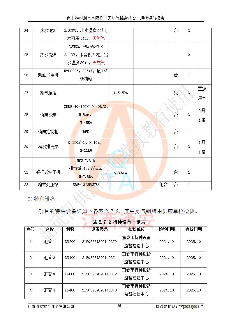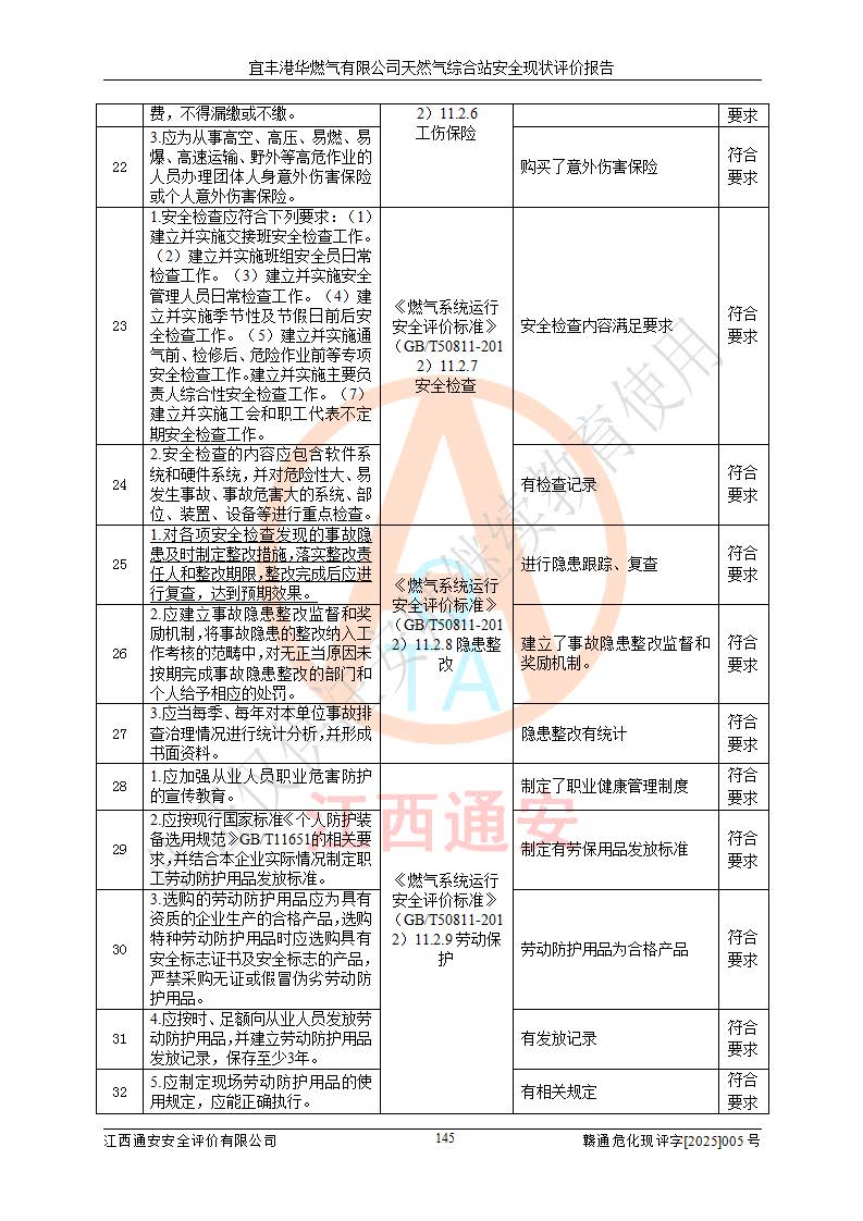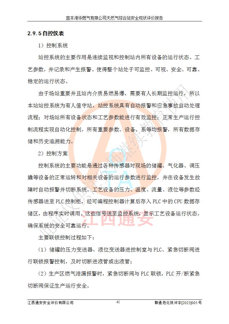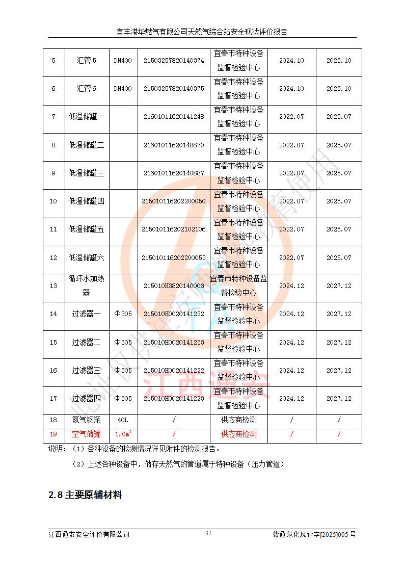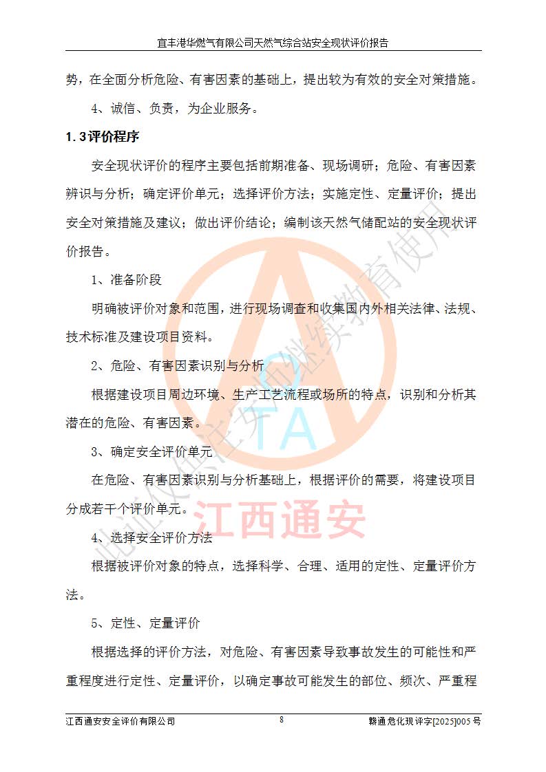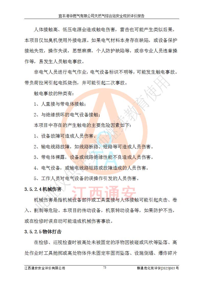1、主要危险、危害因素辨识结果 宜丰港华燃气有限公司天然气综合站在生产经营过程中存在的主要危险有:火灾与爆炸、中毒窒息、触电、机械伤害、物体打击、**伤害、高处坠落、灼烫、低温冻伤、容器爆炸、淹溺等,存在的主要危害因素有:化学因素、物理因素(噪声、高温等)等,同时存在人为失误和管理缺陷。应重点防范的主要危险为火灾与爆炸、容器爆炸。 2、危险化学品辨识结果 经辨识,该储配站涉及的天然气、四氢噻吩及柴油属于危险化学品,天然气属于重点监管的危险化学品和特别管控危险化学品,不涉及监控化学品、易制毒化学品、易制爆危险化学品、剧毒化学品和高毒物品等危险化学品。 3、危险化学品重大危险源辨识结果 根据《危险化学品重大危险源辨识》(GB18218-2018)和《危险化学品重大危险源监督管理暂行规定》(2011)(40号令)(2015年 **安监总局令第79号修订)得出结论如下:该公司LNG储罐区构成三级重大危险源,其余生产单元及储存单元不构成危险化学品重大危险源。 4、重点监管危险化工工艺辨识结果 根据《**安全监管总局关于公布首批重点监管的危险化学品名录的通知》安监总管三[2011]95号、《**安全监管总局关于公布第二批重点监管危险化学品名录的通知》安监总管三[2013]12号进行辨识,该天然气储配站不涉及重点监管的危险化工工艺。 5、作业条件危险性分析结果: 液化天然气的储罐区、调压计量气化加臭区、卸车区、变配电、厂内运输、消防水池作业等单元。等单元危险程度均为“一般危险,需要注意”或“稍有危险,可以接受”级别。作业条件相对安全。 6、危险度评价结果:工艺装置区等级为Ⅱ级,危险程度为中度危险。LNG储罐区等级为Ⅰ级,危险程度为**危险。 7、事故后果预测结果:本报告采用中国安全生产科学研究院研发的重大危险源区域定量风险评价(CASST-QRA)软件对可能发生的危险化学品事故进行预测,宜丰港华燃气有限公司天然气综合站LNG储罐容器整体破裂,发生BLEVE灾害模式后果*大,*大死亡半径为181m,重伤半径为243m,轻伤半径为448m。 8、多米诺效应分析结果:该公司LNG储罐发生容器整体破裂引发的BLEVE事故的多米诺半径*大,为141m。 9、采用安全检查表评价法对该储配站周边环境、总平面布置、站内建构筑物防火间距、站内交通、LNG卸车、储罐、气化装置、加臭装置、调压装置、安全附件、工艺设备、管道、自动化控制等供配电、给排水、消防设施、供热装置、安全管理、“两重点一重大”安全措施及安全管理进行定性评价,不符合项共2项,其他均符合**法律、法规、标准、规范的要求。 (1)企业对不符合项整改完成后,安全条件符合燃气储存经营的安全要求。 (2)该储配站涉及“两重点一重大”,采取了首批重点监管的危险化学品安全措施和应急处置措施,站内LNG罐区构成三级重大危险源,采取的重大危险源安全技术和监控措施符合相关要求。 (3)根据《燃气经营许可管理办法》(建城〔2014〕167号发布,建城规〔2019〕2号修改)制成安全检查表对该单位的经营条件逐一检查,检查结果符合要求。 (4)根据《住房城乡建设部关于印发《城镇燃气经营安全重大隐患判定标准》的通知》(建城规[2023]4号)要求,对该项目重大隐患情况进行检查,该站LNG罐完成整改后不涉及重大隐患。 评价结论 综上所述,宜丰港华燃气有限公司天然气综合站选址和总平面布置合理,建构筑物间的防火间距、耐火等级等符合标准规范的要求,LNG卸车、储存、加臭、气化调压计量等装置采用成熟的工艺和设备,本质安全程度较高;公司制定了安全管理制度和操作规程,人员经培训合格后上岗,主要负责人、安全管理人员及特种作业人员均取得了相应的考核合格资格证书,能按照法律法规要求开展安全生产管理工作。公司对现场存在事故危险的设施和场所采取了合理可行的防护措施和科学的管理,使生产过程中的危险有害因素能得到**控制。该项目安全设施符合**现行有关法律、法规、标准的要求。企业对现场存在的安全问题进行了整改,主要的安全缺陷消除。 综合结论:宜丰港华燃气有限公司天然气综合站的安全条件符合燃气安全运行要求。 |