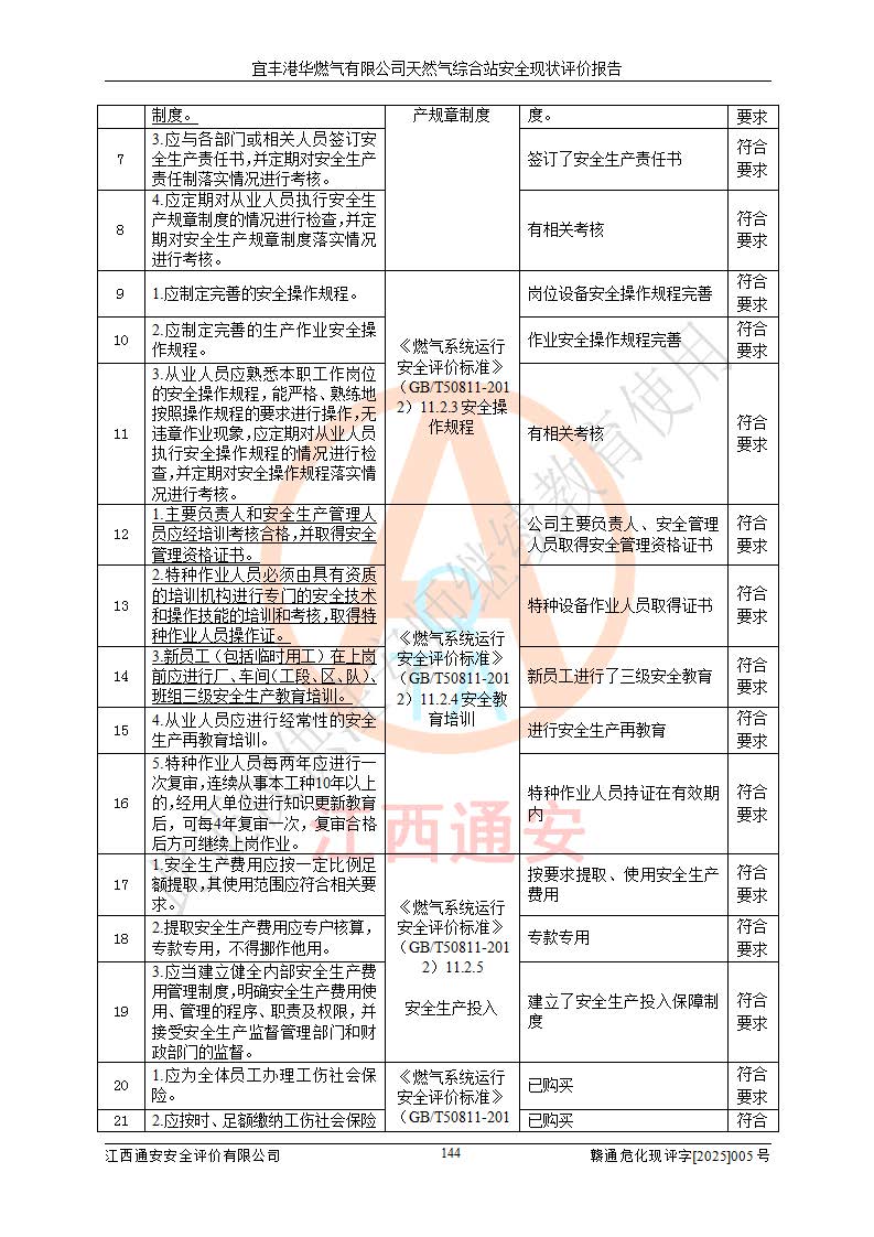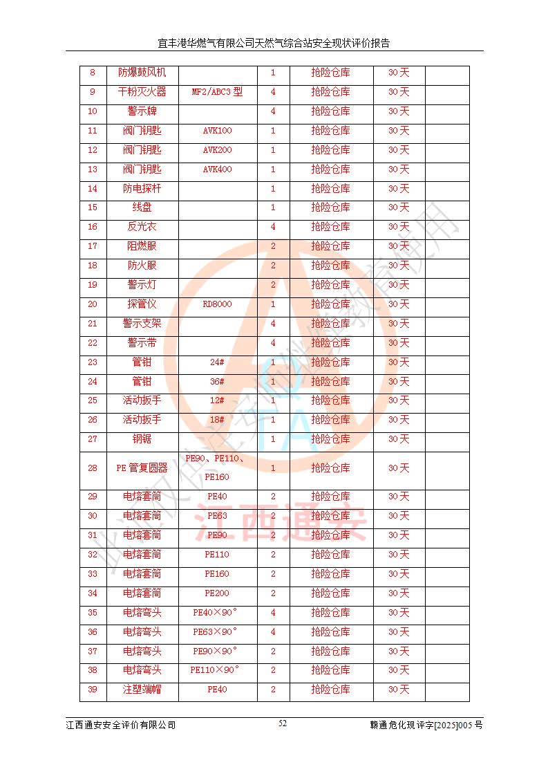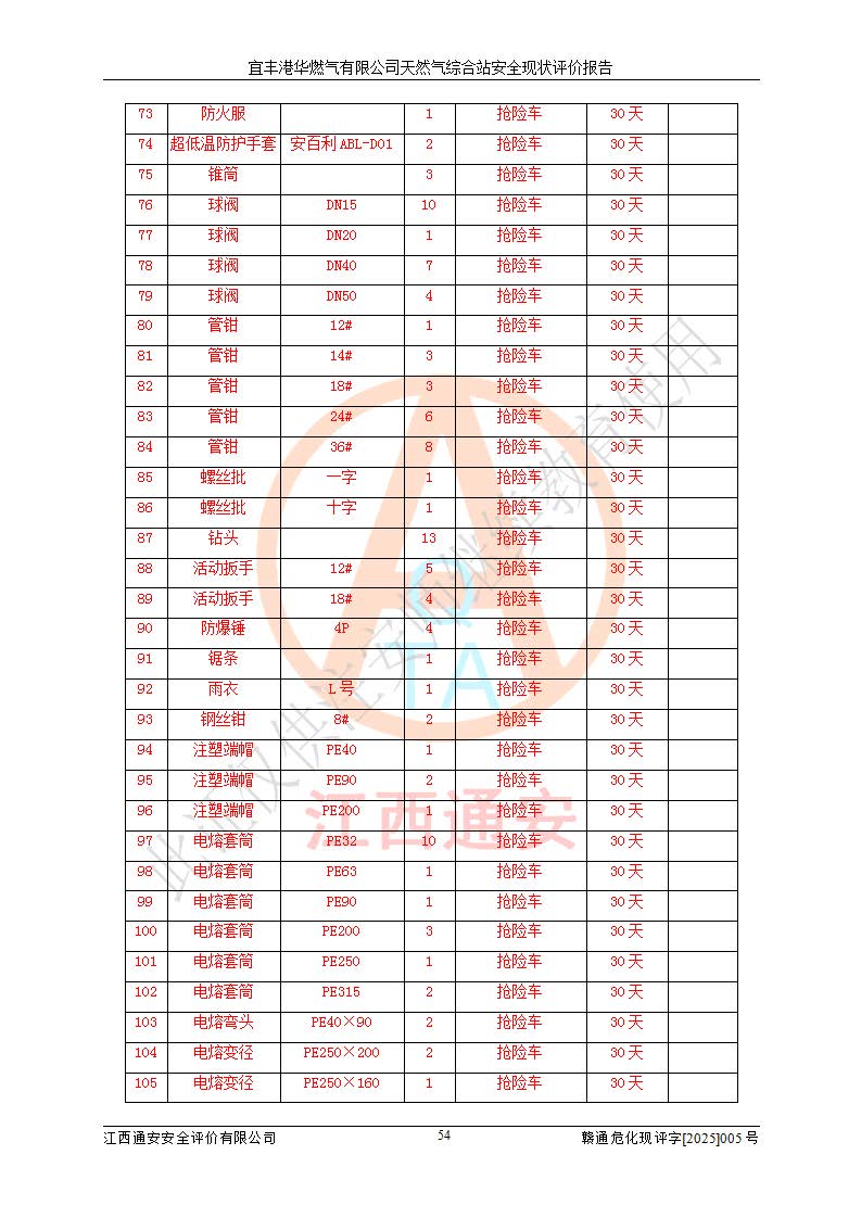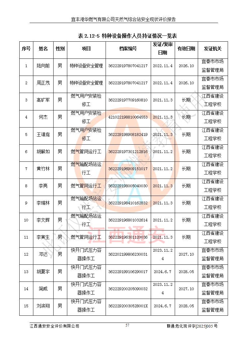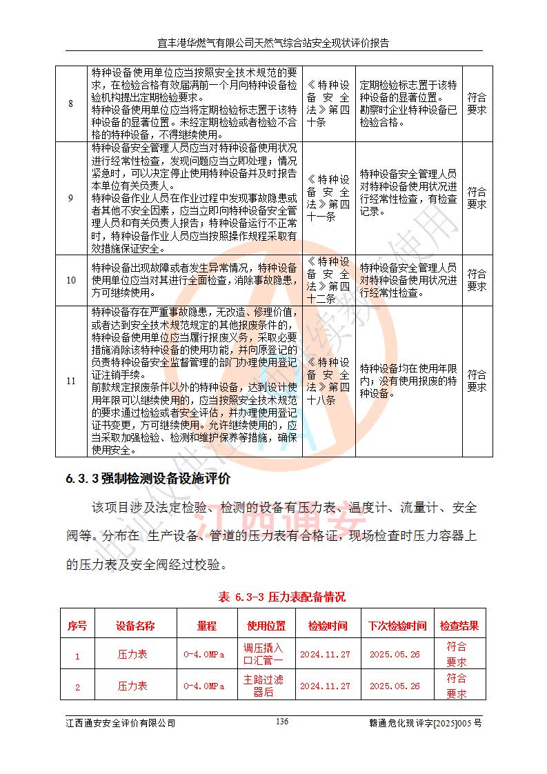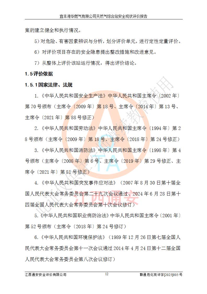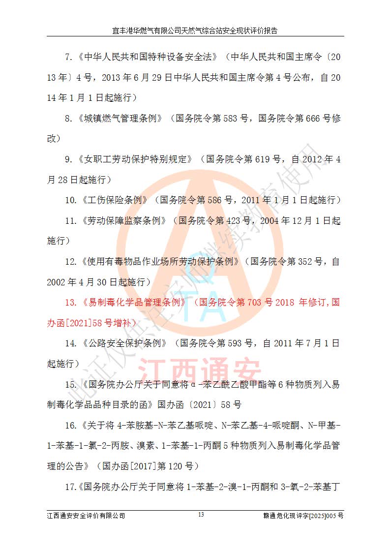 1、主要危险、危害因素辨识结果 宜丰港华燃气有限公司天然气综合站在生产经营过程中存在的主要危险有:火灾与爆炸、中毒窒息、触电、机械伤害、物体打击、**伤害、高处坠落、灼烫、低温冻伤、容器爆炸、淹溺等,存在的主要危害因素有:化学因素、物理因素(噪声、高温等)等,同时存在人为失误和管理缺陷。应重点防范的主要危险为火灾与爆炸、容器爆炸。 2、危险化学品辨识结果 经辨识,该储配站涉及的天然气、四氢噻吩及柴油属于危险化学品,天然气属于重点监管的危险化学品和特别管控危险化学品,不涉及监控化学品、易制毒化学品、易制爆危险化学品、剧毒化学品和高毒物品等危险化学品。 3、危险化学品重大危险源辨识结果 根据《危险化学品重大危险源辨识》(GB18218-2018)和《危险化学品重大危险源监督管理暂行规定》(2011)(40号令)(2015年 **安监总局令第79号修订)得出结论如下:该公司LNG储罐区构成三级重大危险源,其余生产单元及储存单元不构成危险化学品重大危险源。 4、重点监管危险化工工艺辨识结果 根据《**安全监管总局关于公布首批重点监管的危险化学品名录的通知》安监总管三[2011]95号、《**安全监管总局关于公布第二批重点监管危险化学品名录的通知》安监总管三[2013]12号进行辨识,该天然气储配站不涉及重点监管的危险化工工艺。 5、作业条件危险性分析结果: 液化天然气的储罐区、调压计量气化加臭区、卸车区、变配电、厂内运输、消防水池作业等单元。等单元危险程度均为“一般危险,需要注意”或“稍有危险,可以接受”级别。作业条件相对安全。 6、危险度评价结果:工艺装置区等级为Ⅱ级,危险程度为中度危险。LNG储罐区等级为Ⅰ级,危险程度为**危险。 7、事故后果预测结果:本报告采用中国安全生产科学研究院研发的重大危险源区域定量风险评价(CASST-QRA)软件对可能发生的危险化学品事故进行预测,宜丰港华燃气有限公司天然气综合站LNG储罐容器整体破裂,发生BLEVE灾害模式后果*大,*大死亡半径为181m,重伤半径为243m,轻伤半径为448m。 8、多米诺效应分析结果:该公司LNG储罐发生容器整体破裂引发的BLEVE事故的多米诺半径*大,为141m。 9、采用安全检查表评价法对该储配站周边环境、总平面布置、站内建构筑物防火间距、站内交通、LNG卸车、储罐、气化装置、加臭装置、调压装置、安全附件、工艺设备、管道、自动化控制等供配电、给排水、消防设施、供热装置、安全管理、“两重点一重大”安全措施及安全管理进行定性评价,不符合项共2项,其他均符合**法律、法规、标准、规范的要求。 (1)企业对不符合项整改完成后,安全条件符合燃气储存经营的安全要求。 (2)该储配站涉及“两重点一重大”,采取了首批重点监管的危险化学品安全措施和应急处置措施,站内LNG罐区构成三级重大危险源,采取的重大危险源安全技术和监控措施符合相关要求。 (3)根据《燃气经营许可管理办法》(建城〔2014〕167号发布,建城规〔2019〕2号修改)制成安全检查表对该单位的经营条件逐一检查,检查结果符合要求。 (4)根据《住房城乡建设部关于印发《城镇燃气经营安全重大隐患判定标准》的通知》(建城规[2023]4号)要求,对该项目重大隐患情况进行检查,该站LNG罐完成整改后不涉及重大隐患。 评价结论 综上所述,宜丰港华燃气有限公司天然气综合站选址和总平面布置合理,建构筑物间的防火间距、耐火等级等符合标准规范的要求,LNG卸车、储存、加臭、气化调压计量等装置采用成熟的工艺和设备,本质安全程度较高;公司制定了安全管理制度和操作规程,人员经培训合格后上岗,主要负责人、安全管理人员及特种作业人员均取得了相应的考核合格资格证书,能按照法律法规要求开展安全生产管理工作。公司对现场存在事故危险的设施和场所采取了合理可行的防护措施和科学的管理,使生产过程中的危险有害因素能得到**控制。该项目安全设施符合**现行有关法律、法规、标准的要求。企业对现场存在的安全问题进行了整改,主要的安全缺陷消除。 综合结论:宜丰港华燃气有限公司天然气综合站的安全条件符合燃气安全运行要求。 |