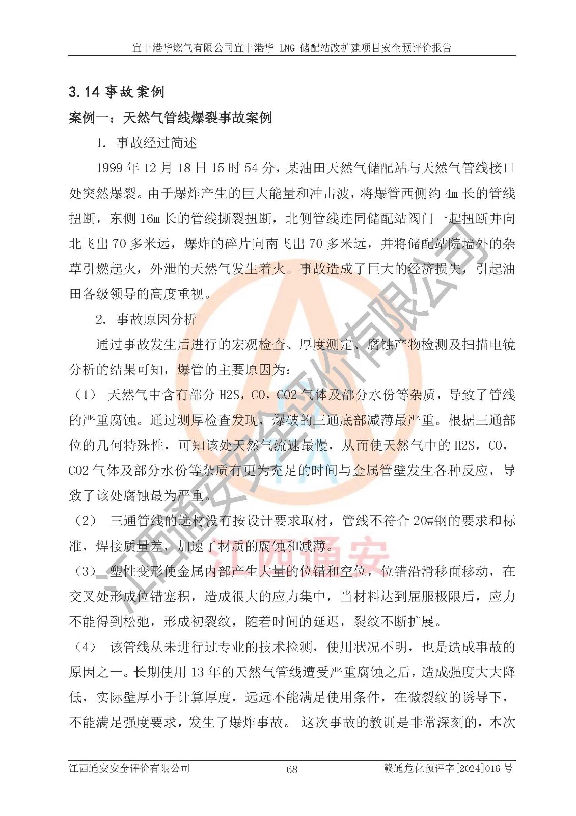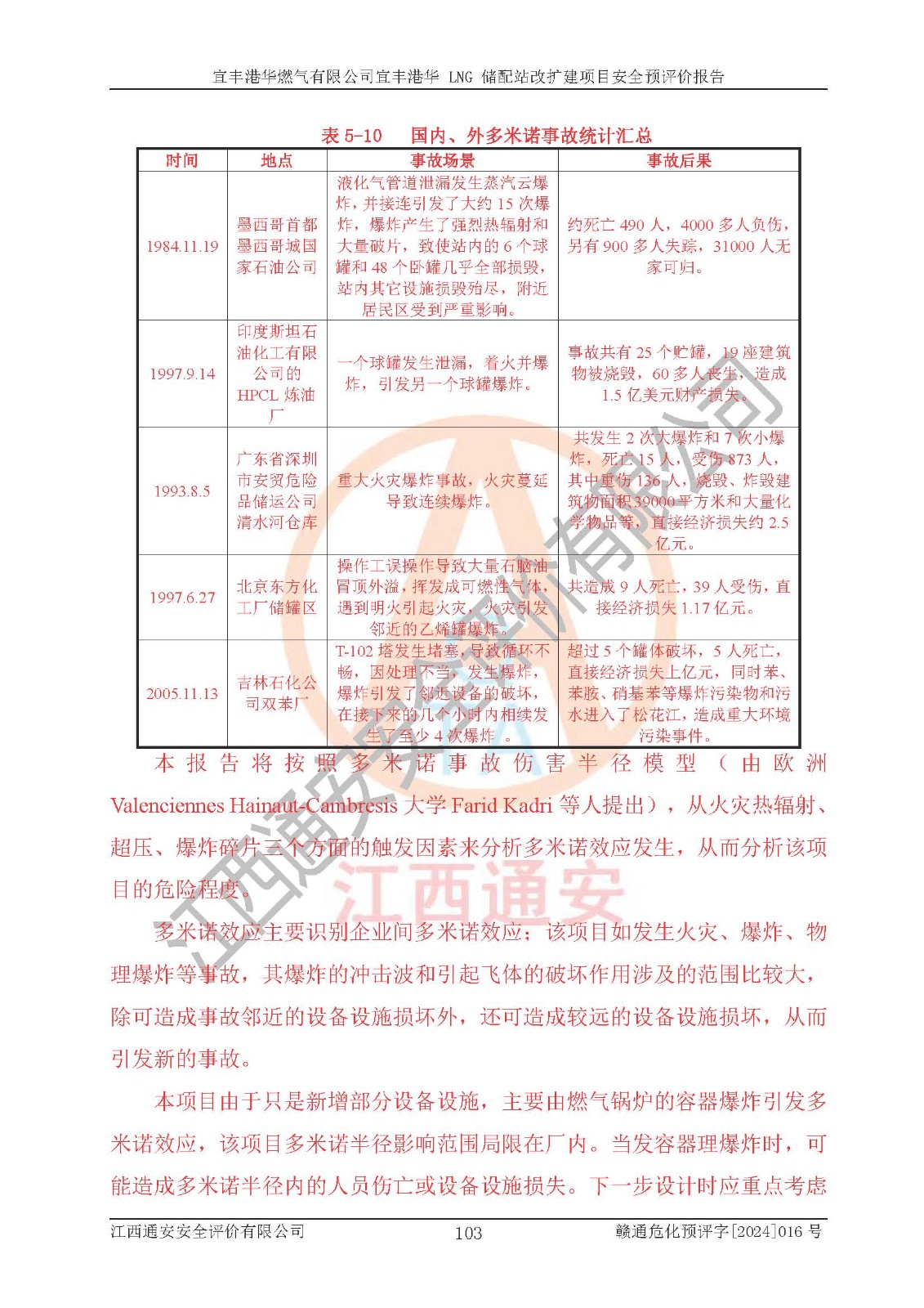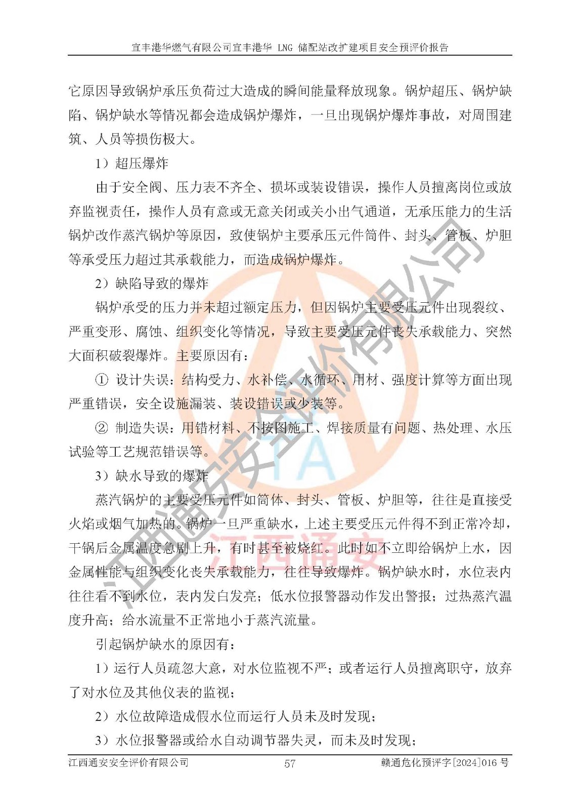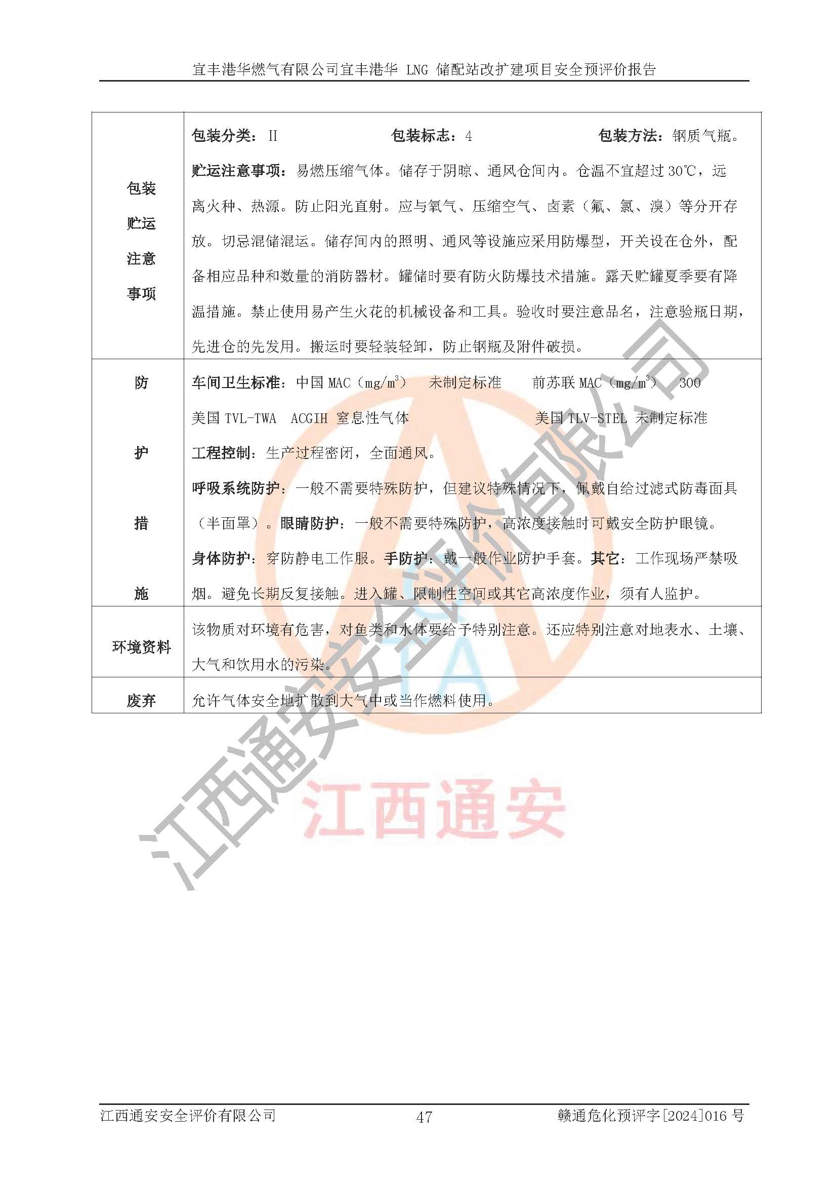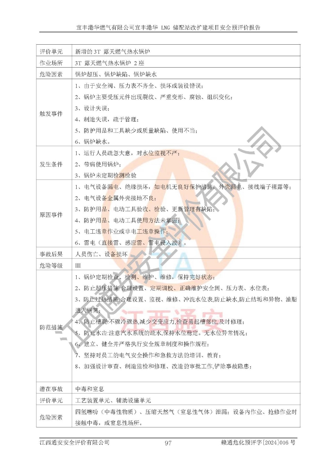 其它 | 1、该项目运行过程中的主要危险、有害物质有天然气、四氢噻吩(加臭剂)、柴油等。 2、本项目运行过程存在的主要危险因素为火灾、爆炸、锅炉爆炸、中毒和窒息、触电、灼烫、高处坠落、**伤害、物体打击、机械伤害等;有害因素有有毒物质、高温、噪声等。 3、该项目所在区域存在的自然危险、有害因素有地震、雷击、暴雨等。 4、按《危险化学品重大危险源辨识》(GB18218-2018)的规定,该项目不构成危险化学品重大危险源。 5、经辨识,该项目涉及的天然气属于重点监管的危险化学品,不涉及剧毒化学品、易制毒化学品、监控化学品和易制爆化学品 9、该项目站场周边环境防火间距符合标准、规范要求,选址符合法律法规等的规定和要求。 10、该项目总平面布置、工艺装置区、自动控制等符合标准、规范的要求。 11、预先危险性分析表明火灾、爆炸、锅炉爆炸的危险等级为Ⅲ级,触电、中毒与窒息等危险有害因素的危险等级均为Ⅱ级。 12、危险度评价结果:工艺装置区得分为14分,等级为Ⅱ级,危险程度为中度危险。 该项目按照《安全生产法》、《城镇燃气管理条例》、《建设项目安全设施“三同时”监督管理办法》等法律法规的规定和要求进行安全预评价,保障了建设项目安全设施与主体工程同时设计、同时施工、同时投入生产和使用的“三同时”的要求。 该项目在下一步的设计、施工中,建设单位应认真执行**的有关法律、法规、标准、规范,将本报告提出的安全措施落实到位;完善各项安全规章制度、事故应急预案,并认真的学习和演练;在生产运行过程中,保障各项安全设施可靠,**;操作人员严格执行安全操作规程,该项目的危险是可以得到**控制的,项目建成后的安全运行是有保障的。 结论:宜丰港华燃气有限公司宜丰港华 LNG 储配站改扩建项目的危险、有害因素可得到**控制,风险在可接受范围内,本建设项目从安全方面分析可行,风险程度在可以接受范围内。