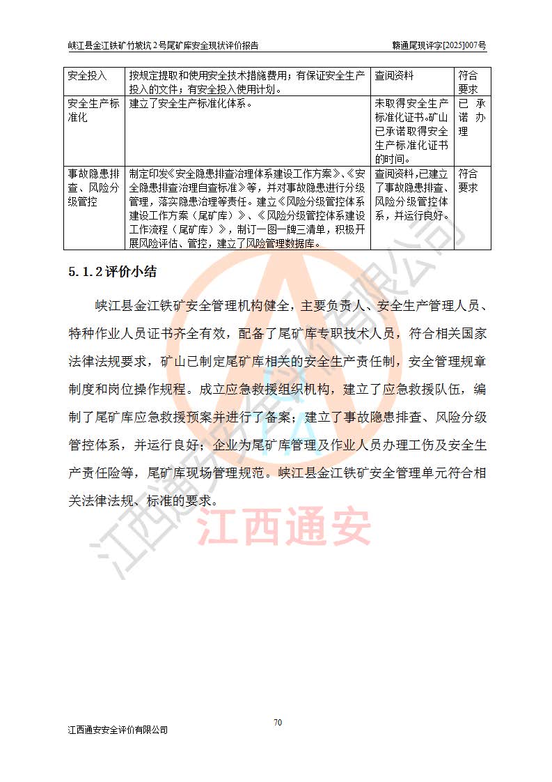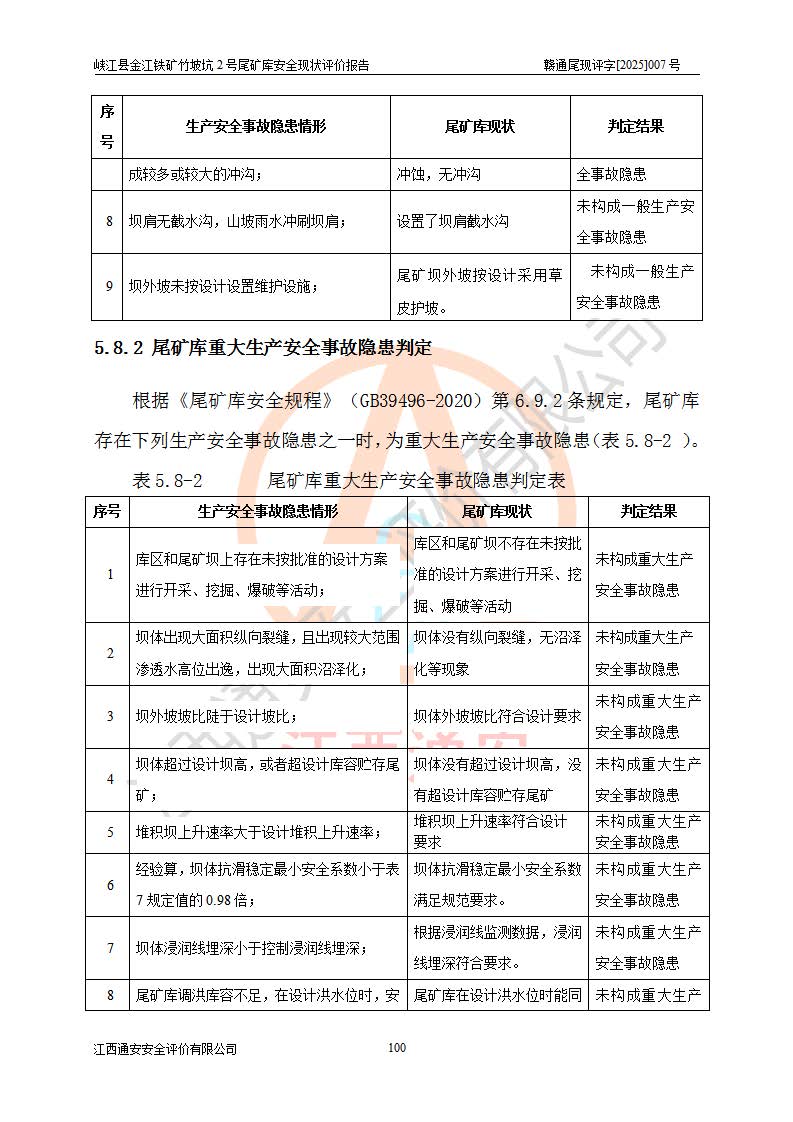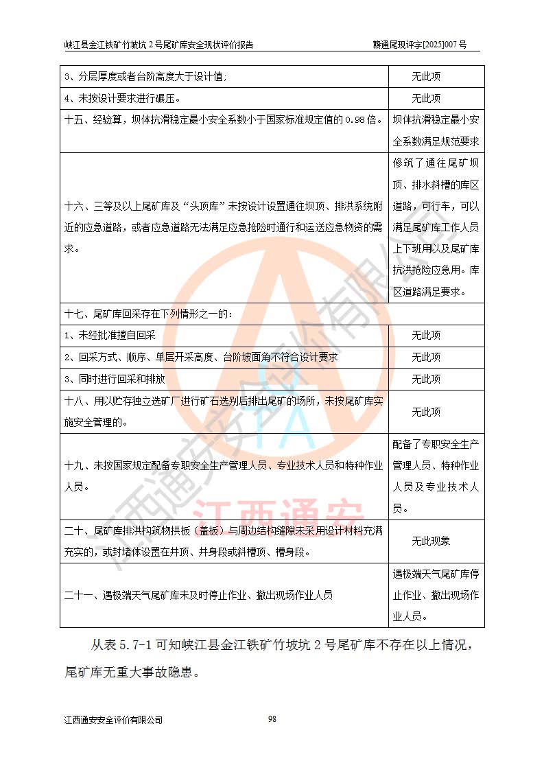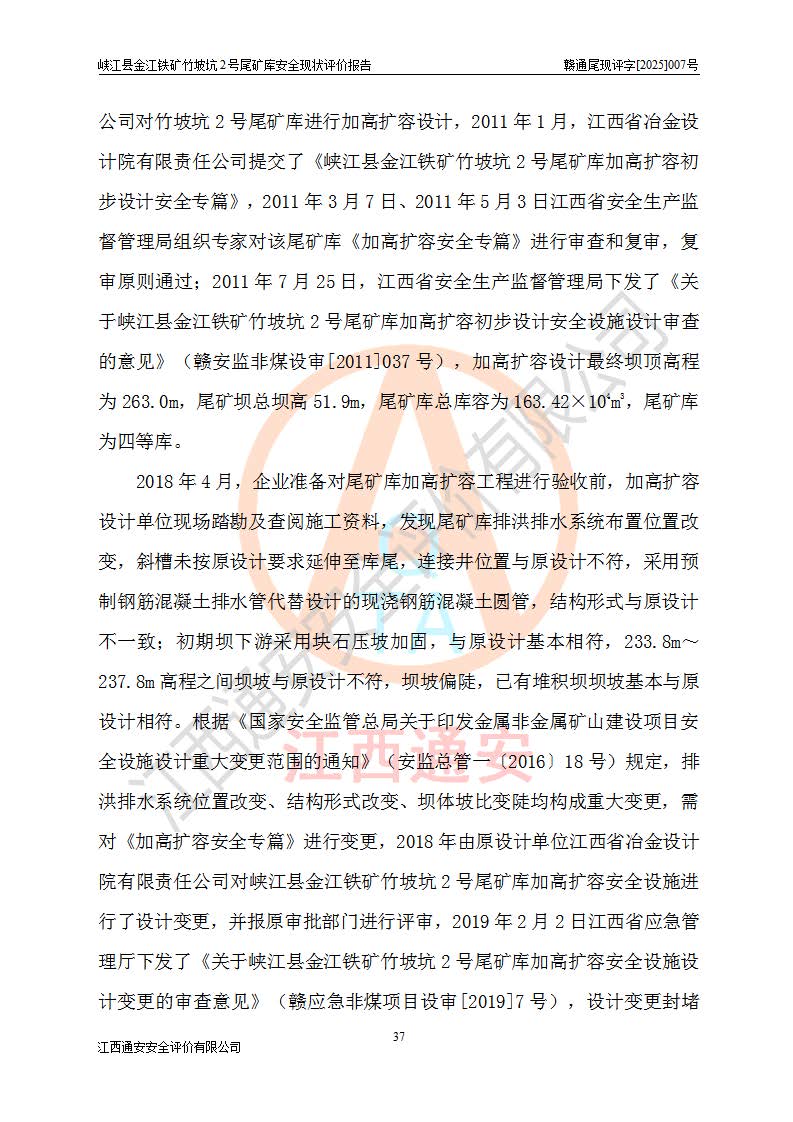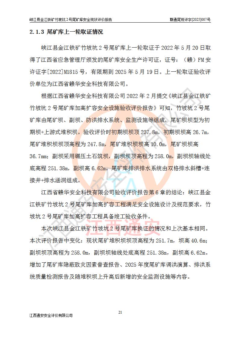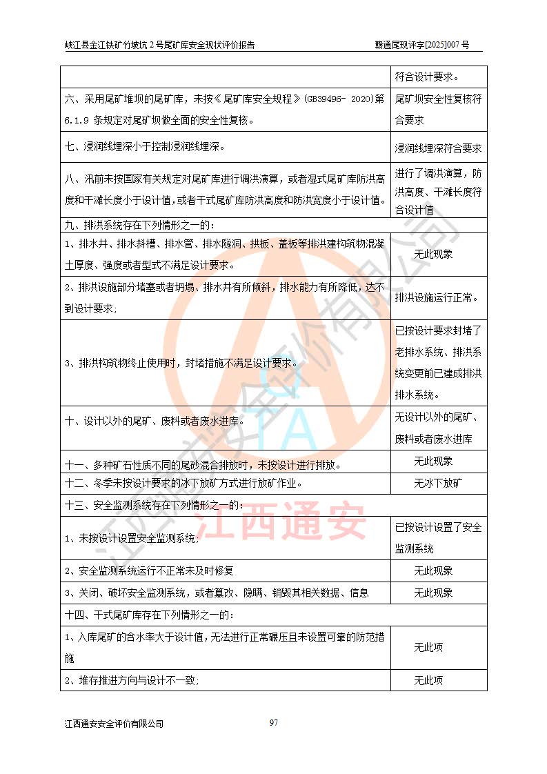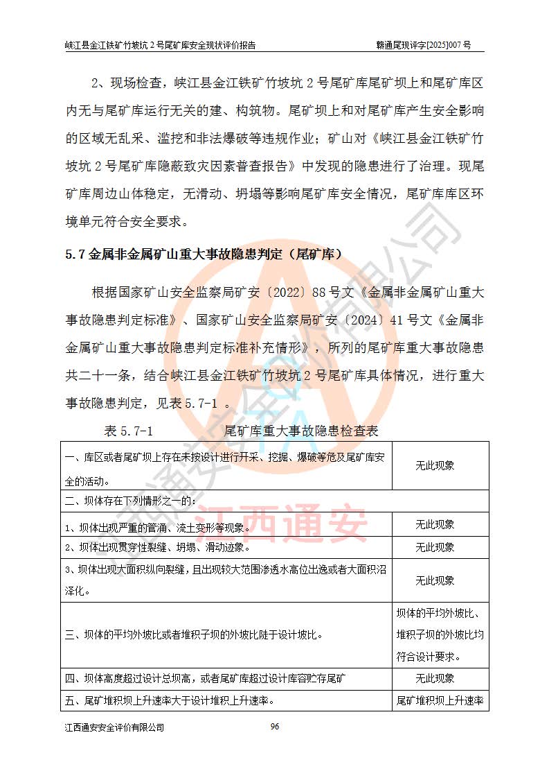 评价结论 | 峡江县金江铁矿竹坡坑2号尾矿库现状与《峡江县金江铁矿竹坡坑2号尾矿库加高扩容工程安全设施设计变更》一致,竹坡坑2号尾矿库为正常库,具备继续生产运行的安全生产条件。 | |||
