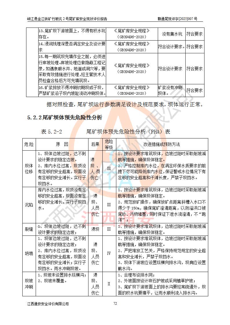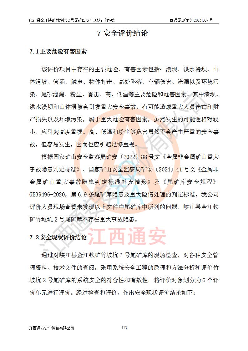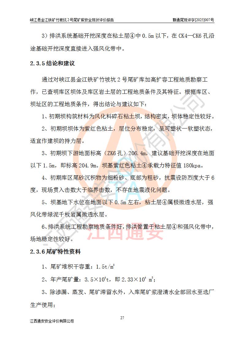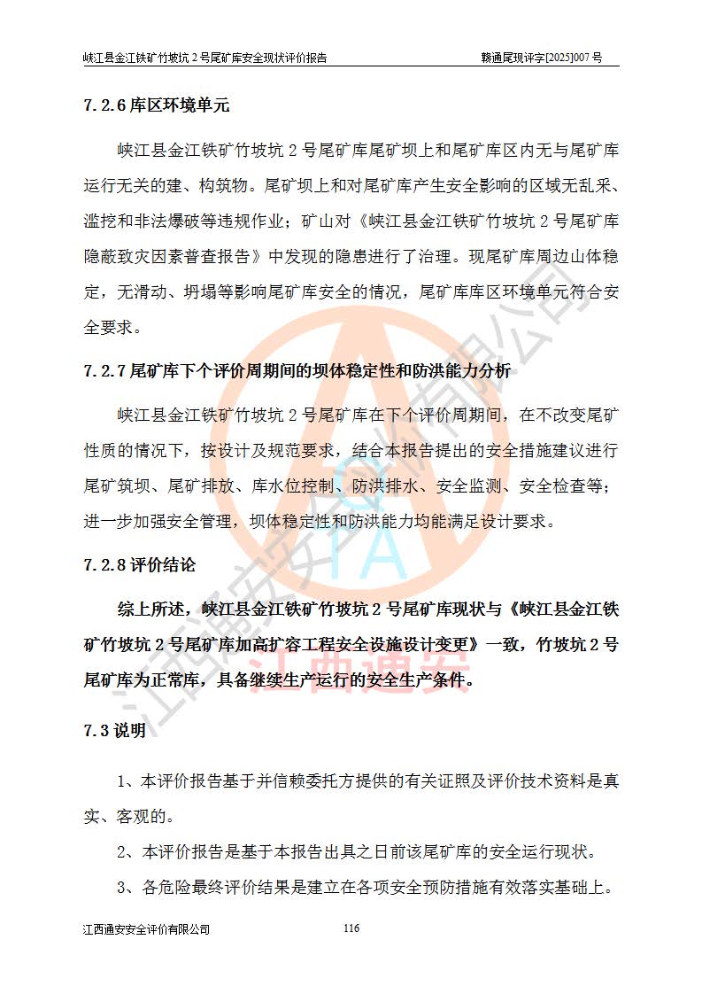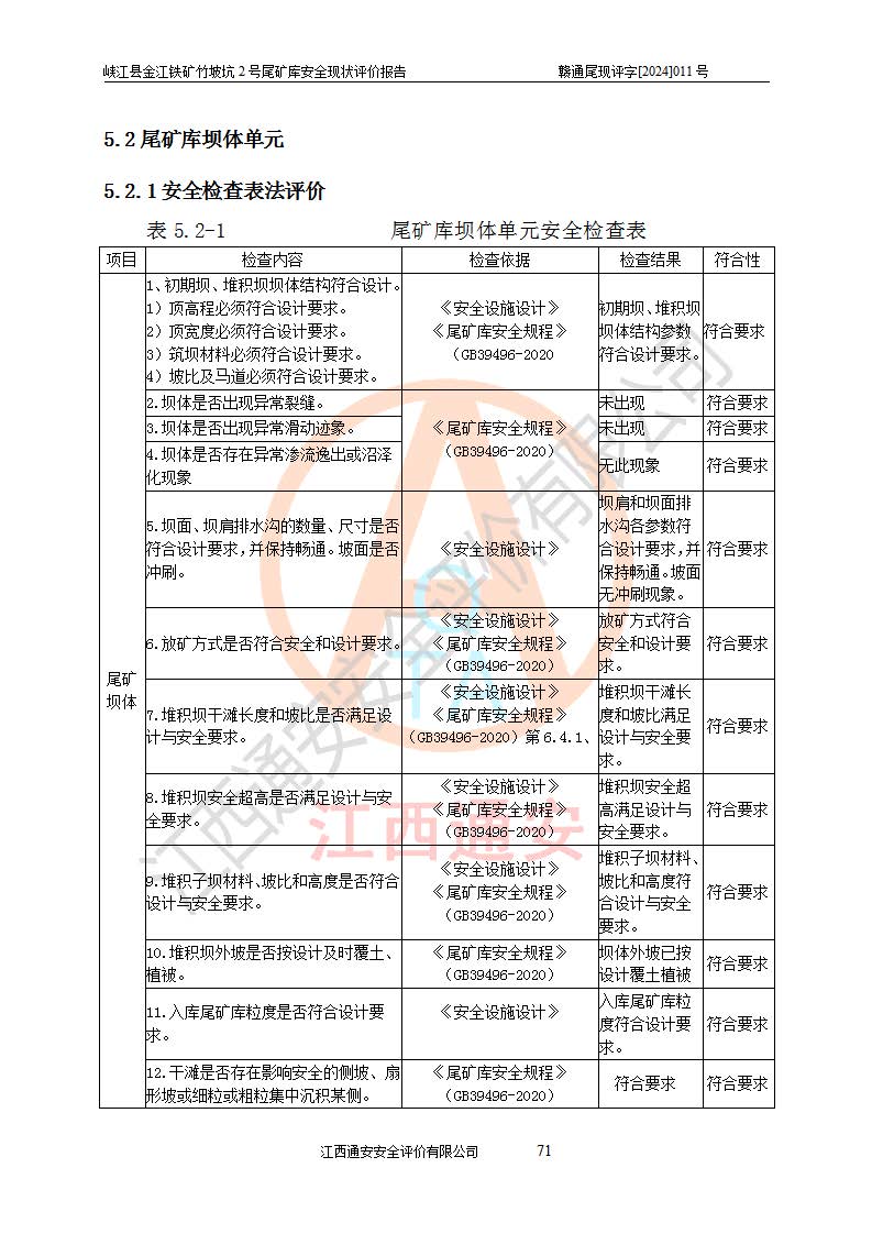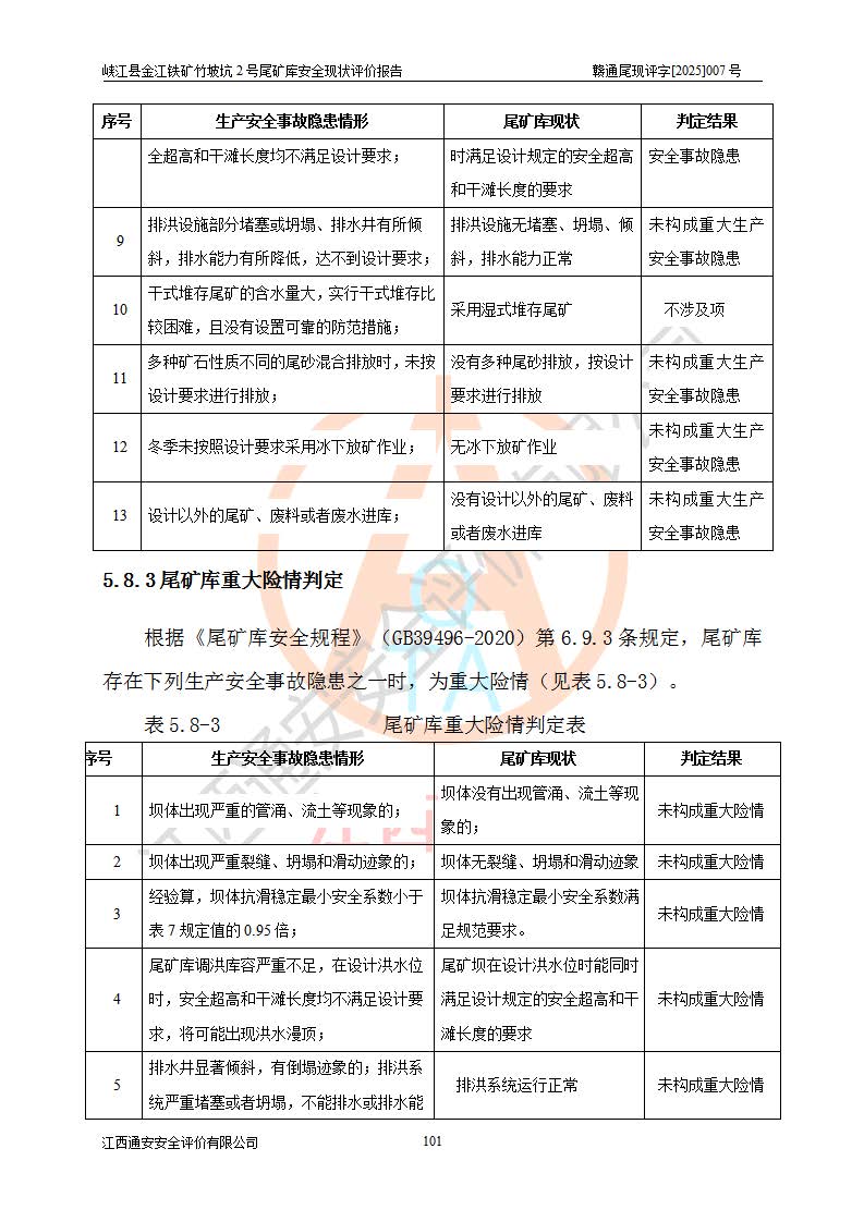 评价结论 | 峡江县金江铁矿竹坡坑2号尾矿库现状与《峡江县金江铁矿竹坡坑2号尾矿库加高扩容工程安全设施设计变更》一致,竹坡坑2号尾矿库为正常库,具备继续生产运行的安全生产条件。 | |||