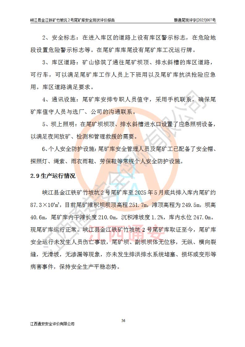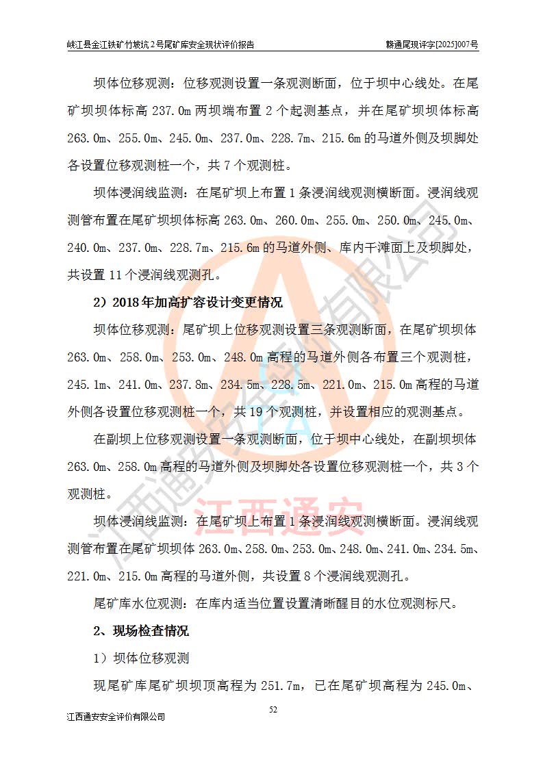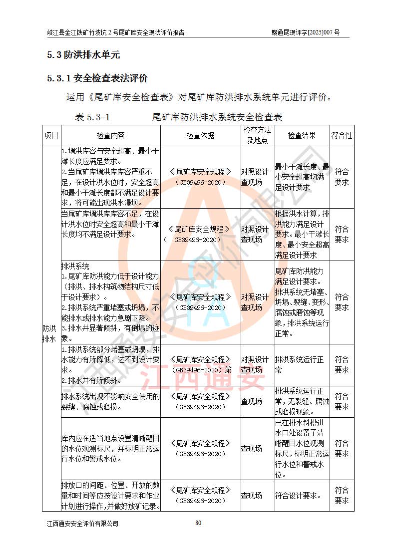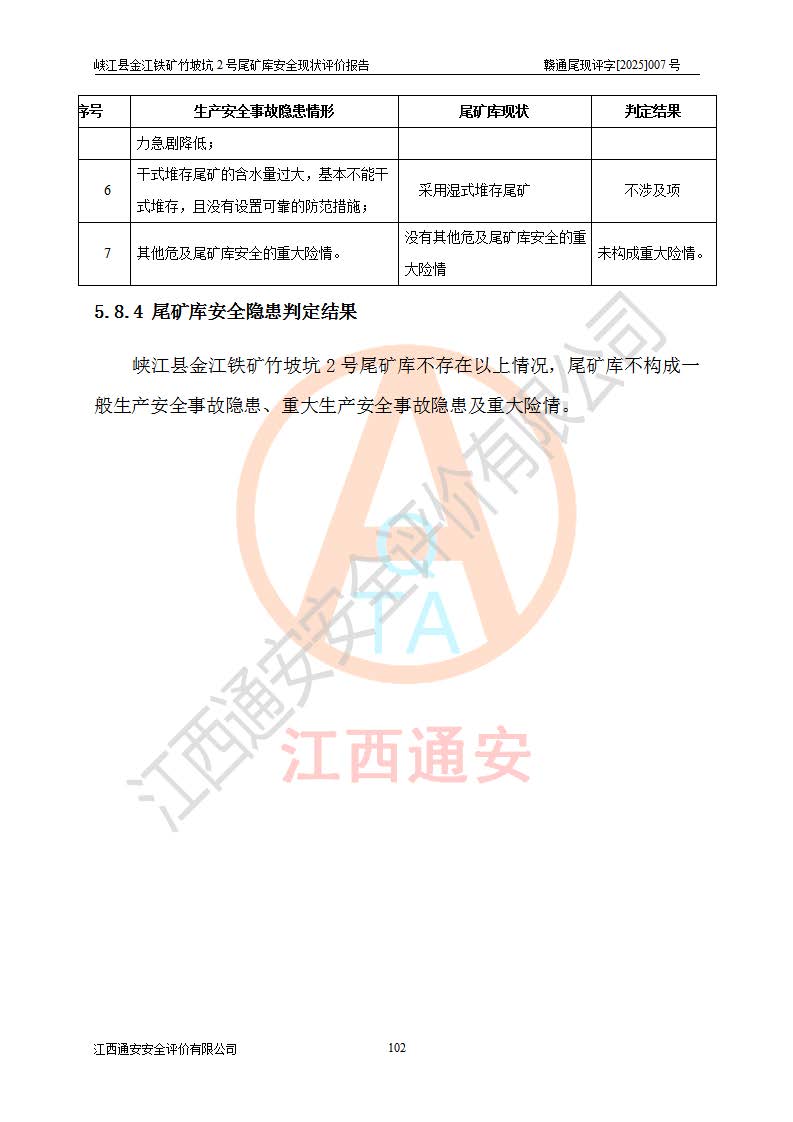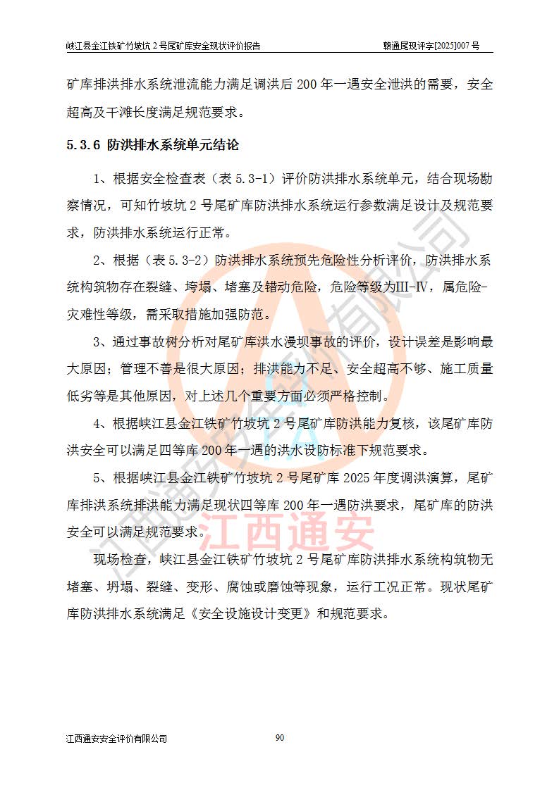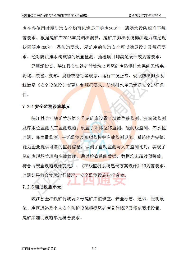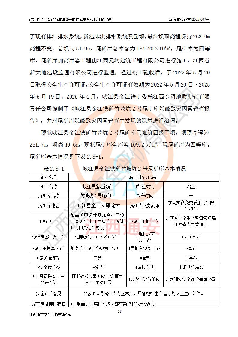 评价结论 | 峡江县金江铁矿竹坡坑2号尾矿库现状与《峡江县金江铁矿竹坡坑2号尾矿库加高扩容工程安全设施设计变更》一致,竹坡坑2号尾矿库为正常库,具备继续生产运行的安全生产条件。 | |||