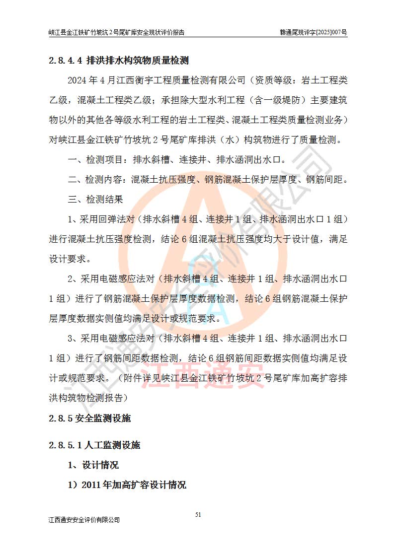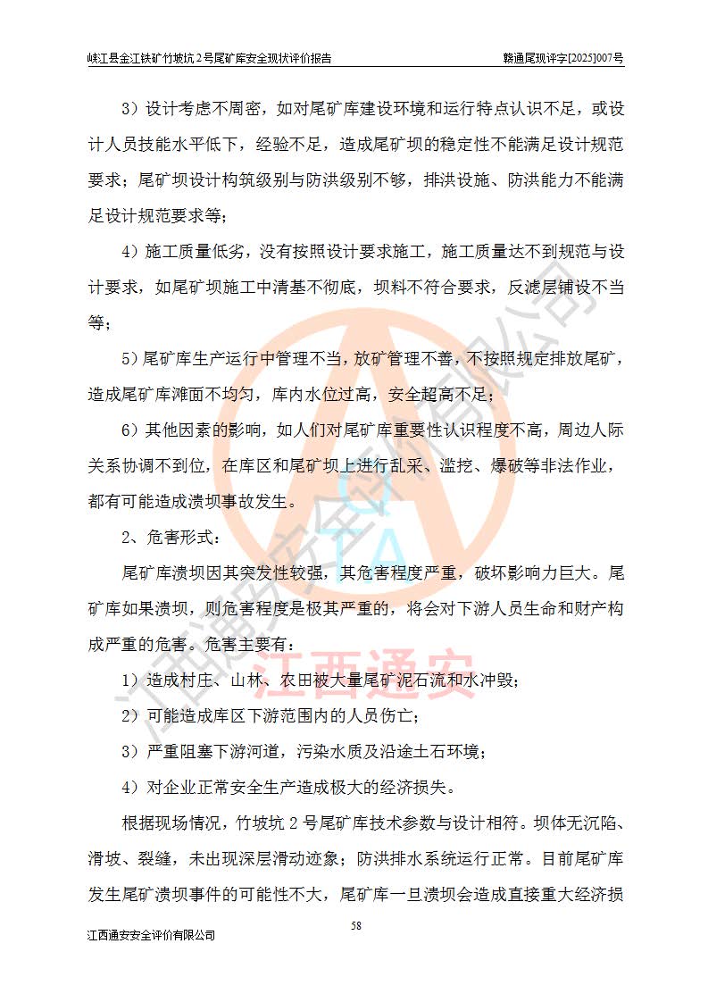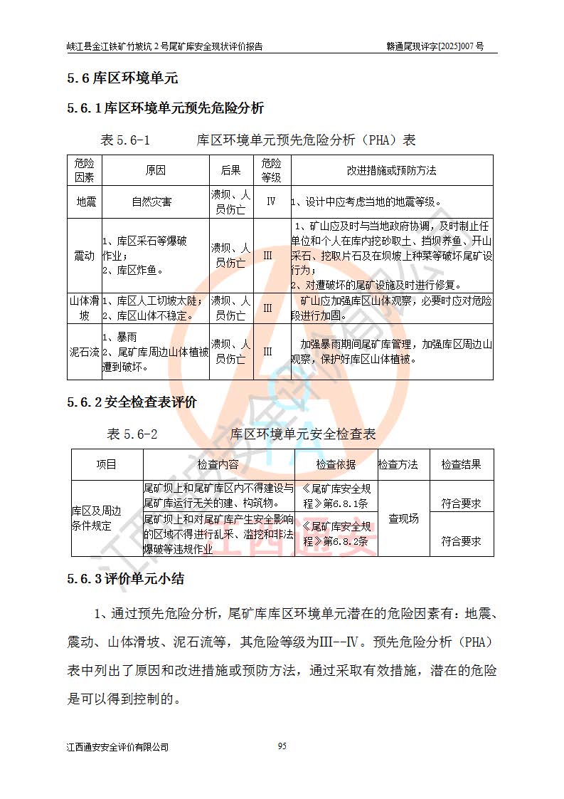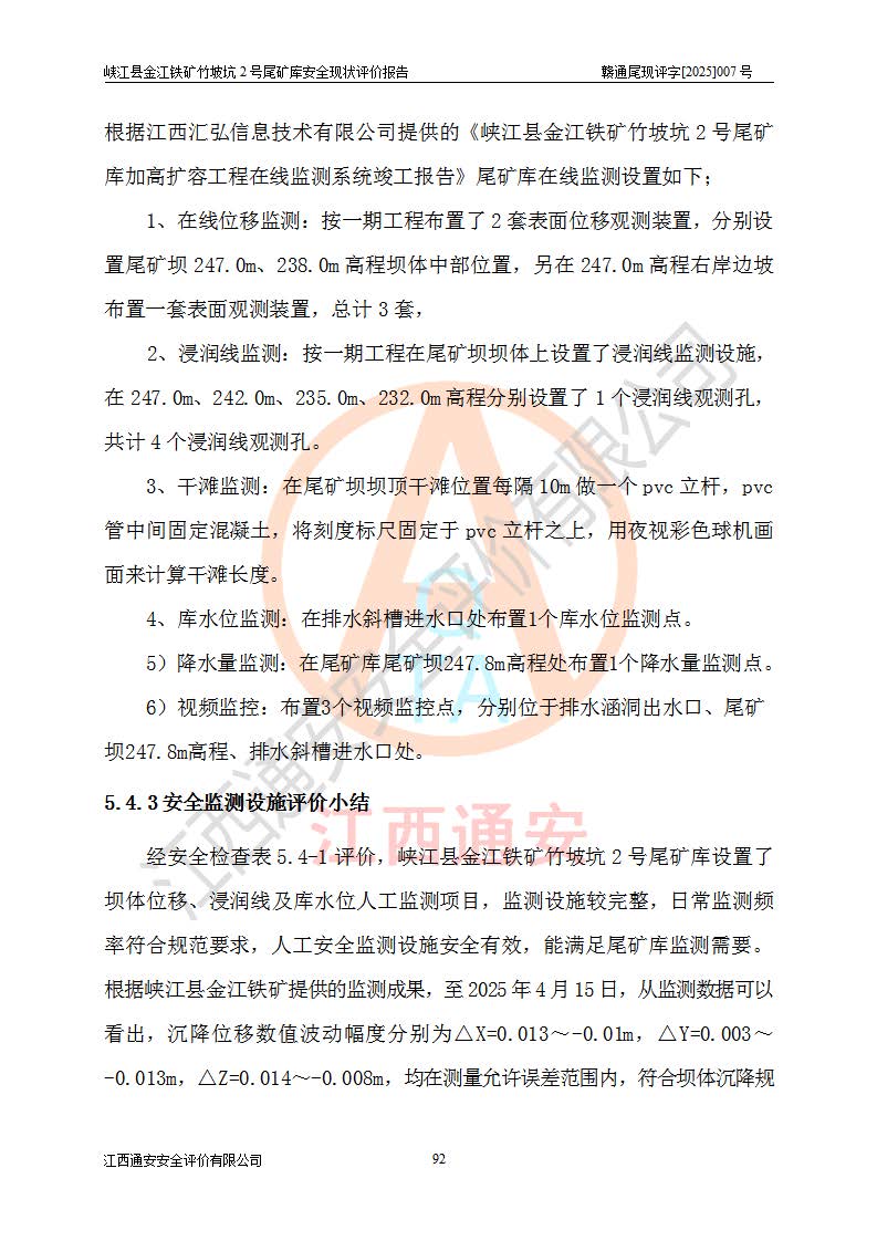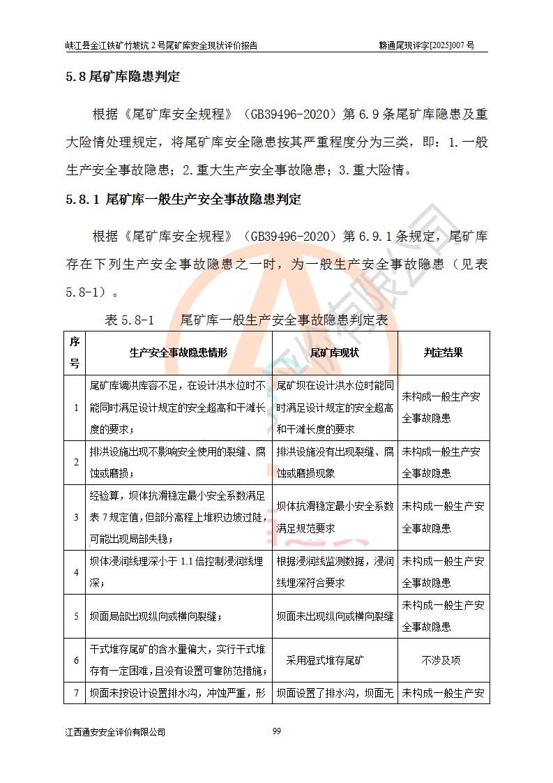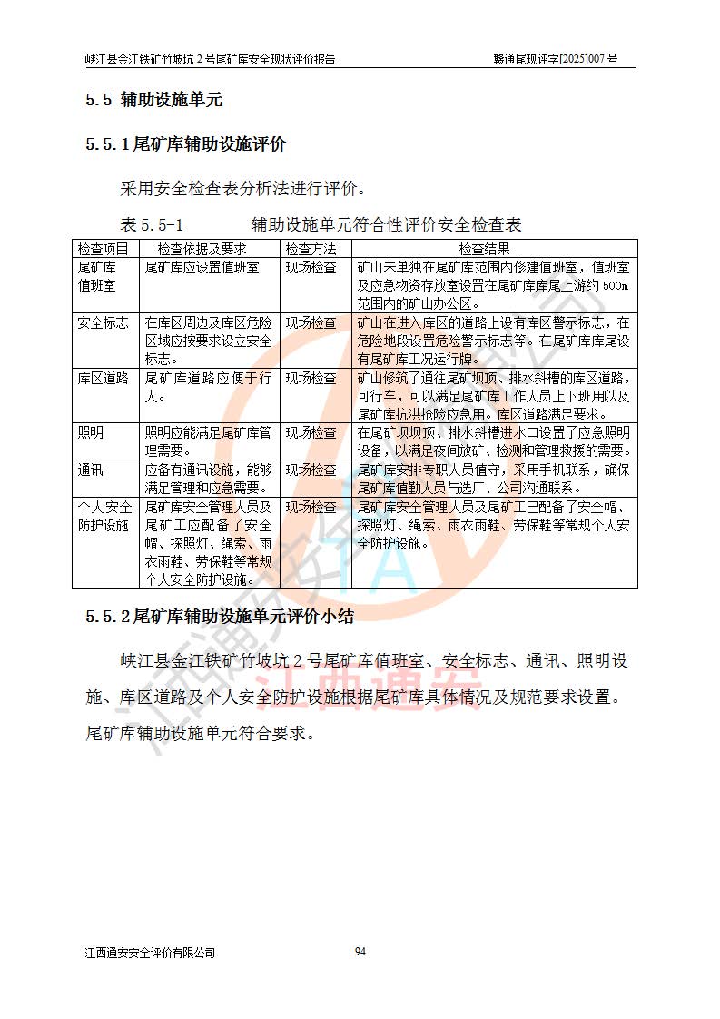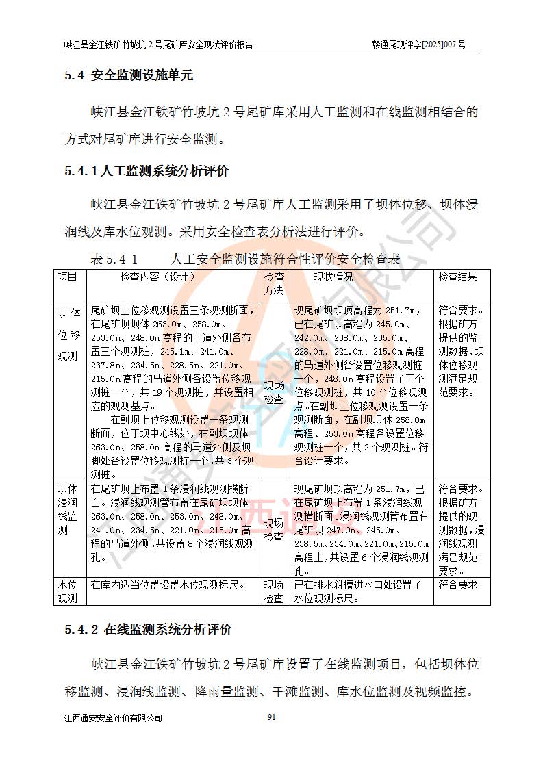 评价结论 | 峡江县金江铁矿竹坡坑2号尾矿库现状与《峡江县金江铁矿竹坡坑2号尾矿库加高扩容工程安全设施设计变更》一致,竹坡坑2号尾矿库为正常库,具备继续生产运行的安全生产条件。 | |||