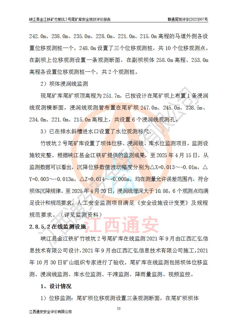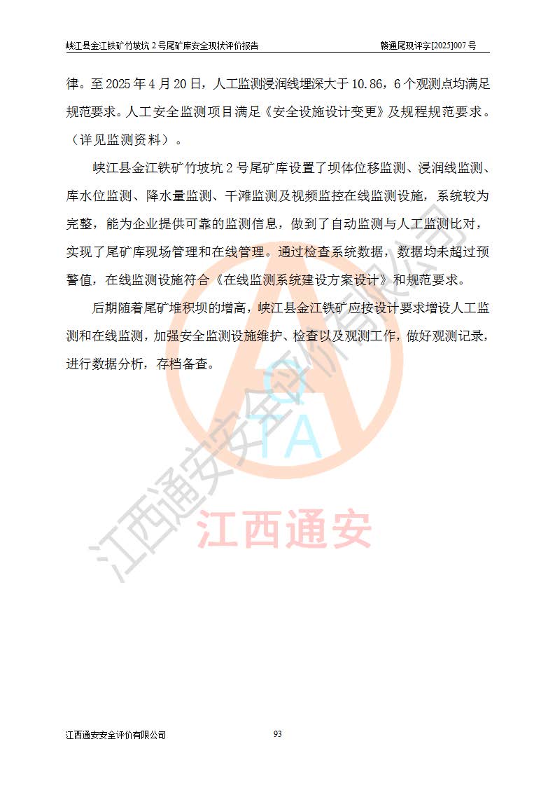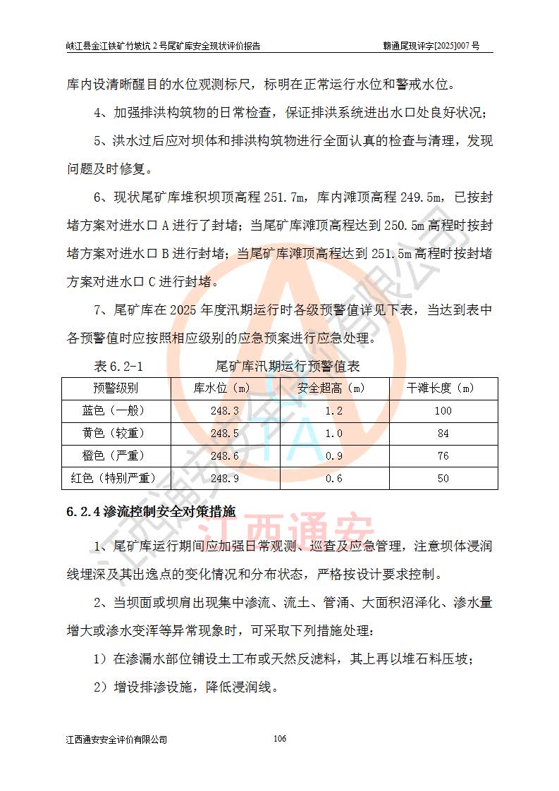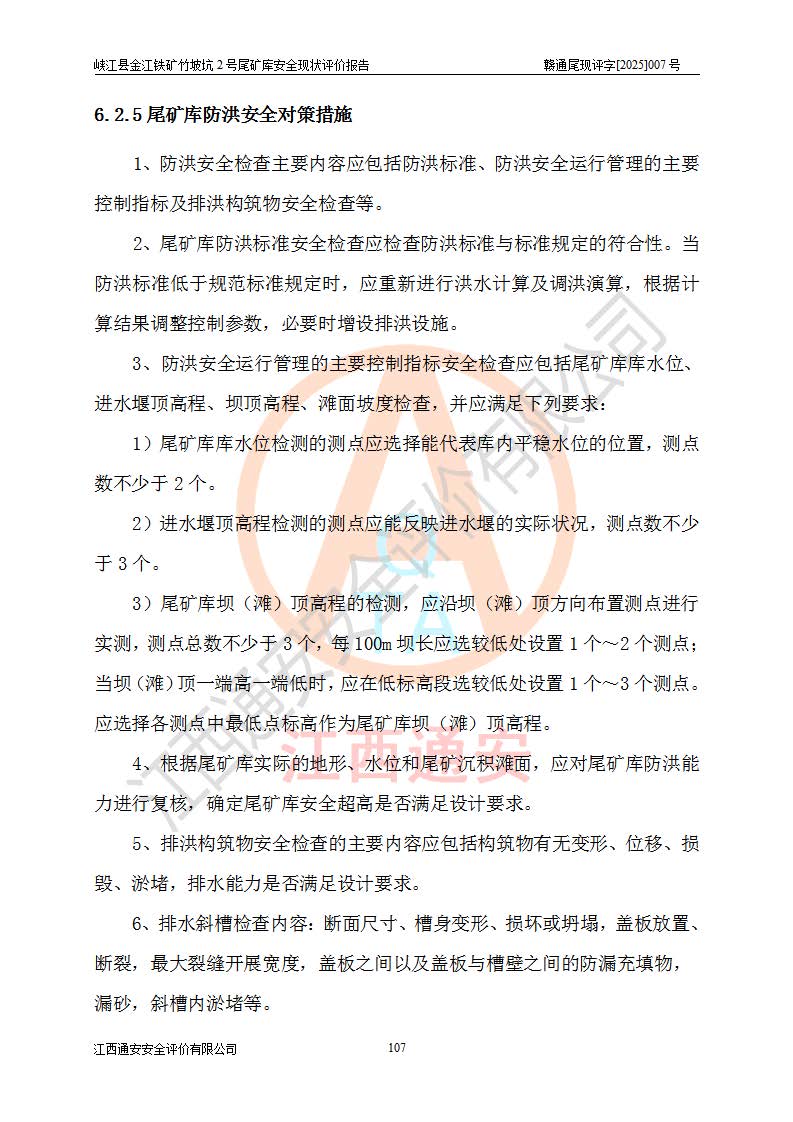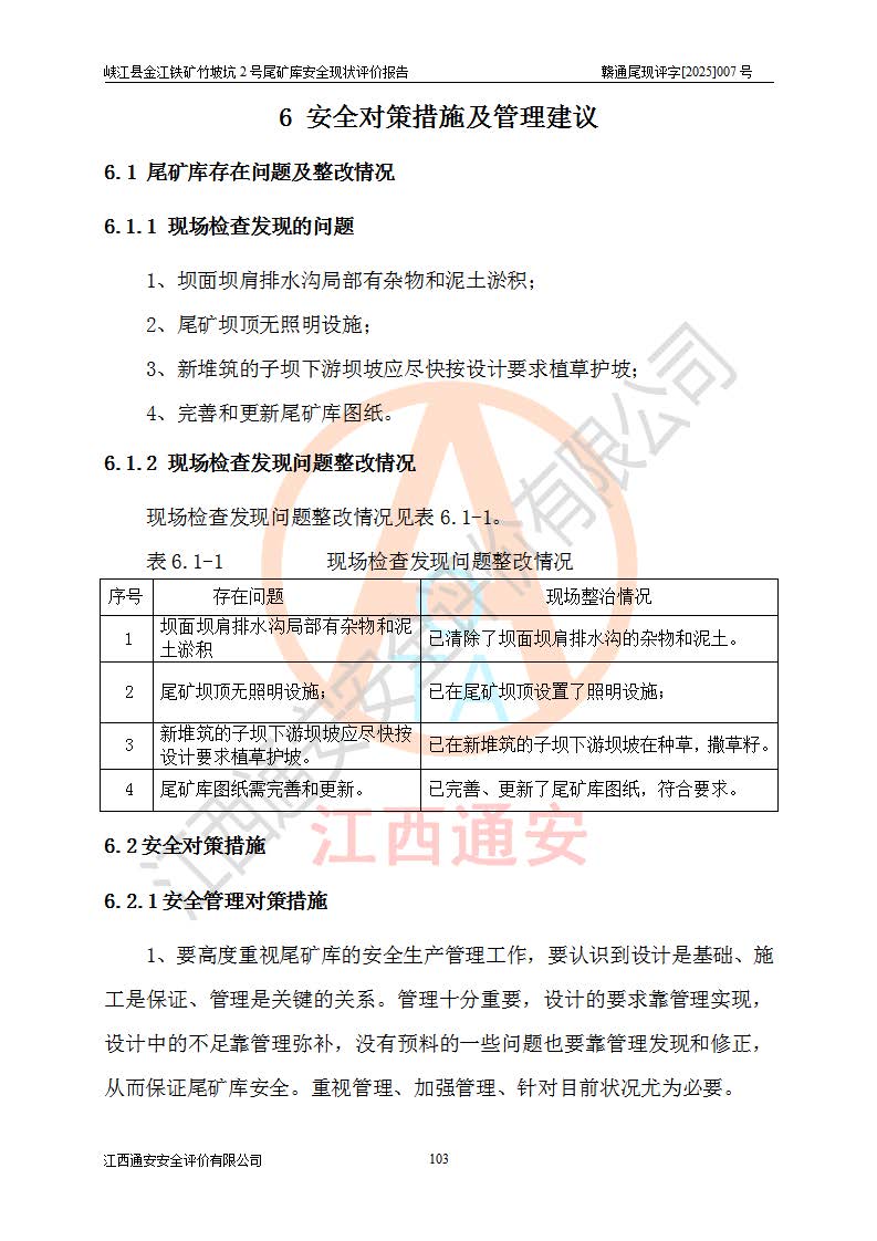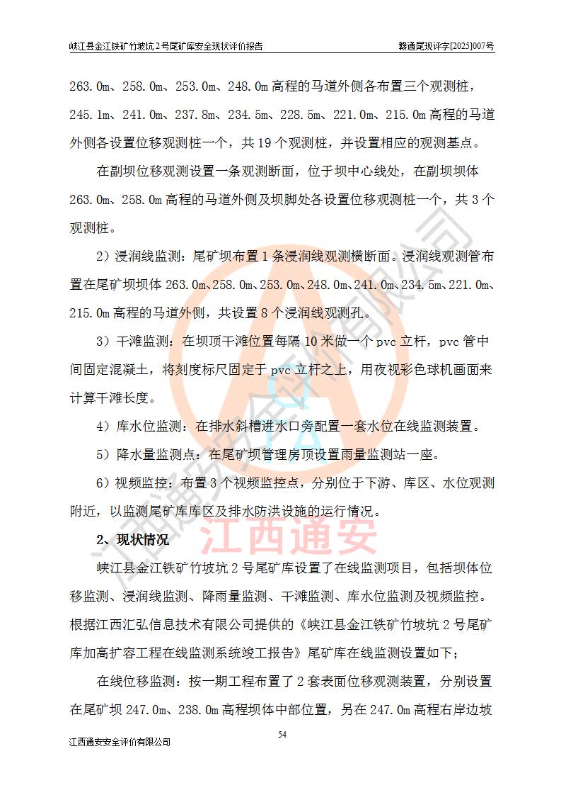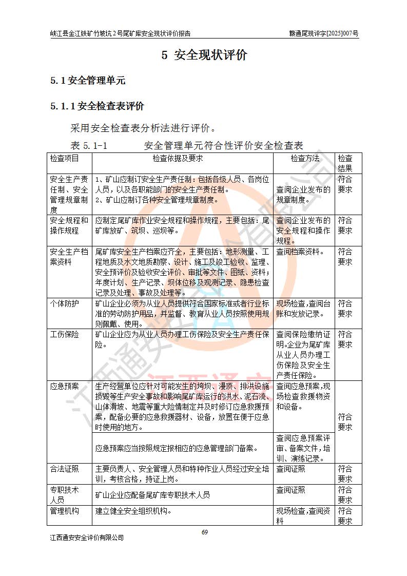 评价结论 | 峡江县金江铁矿竹坡坑2号尾矿库现状与《峡江县金江铁矿竹坡坑2号尾矿库加高扩容工程安全设施设计变更》一致,竹坡坑2号尾矿库为正常库,具备继续生产运行的安全生产条件。 | |||