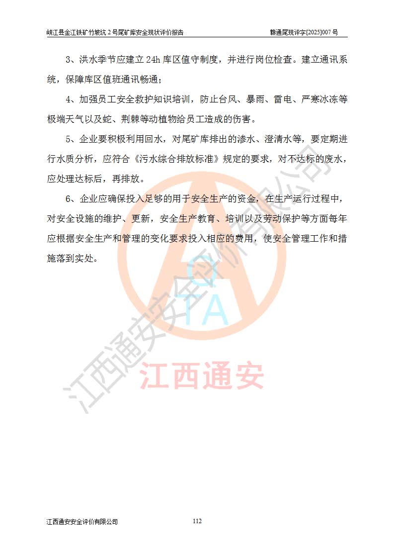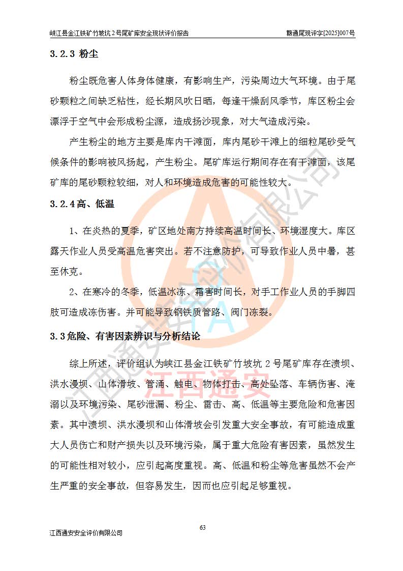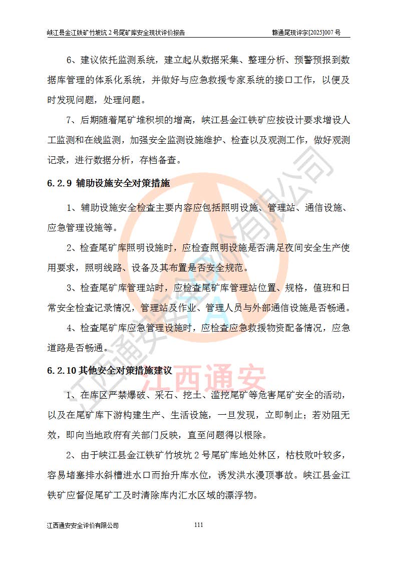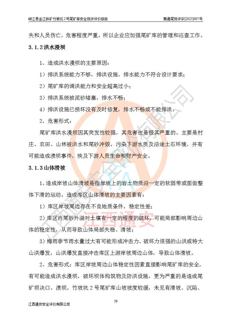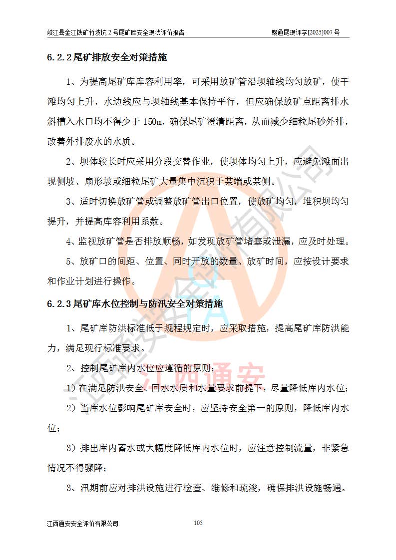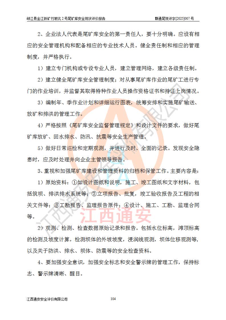 评价结论 | 峡江县金江铁矿竹坡坑2号尾矿库现状与《峡江县金江铁矿竹坡坑2号尾矿库加高扩容工程安全设施设计变更》一致,竹坡坑2号尾矿库为正常库,具备继续生产运行的安全生产条件。 | |||