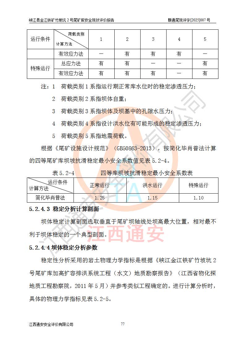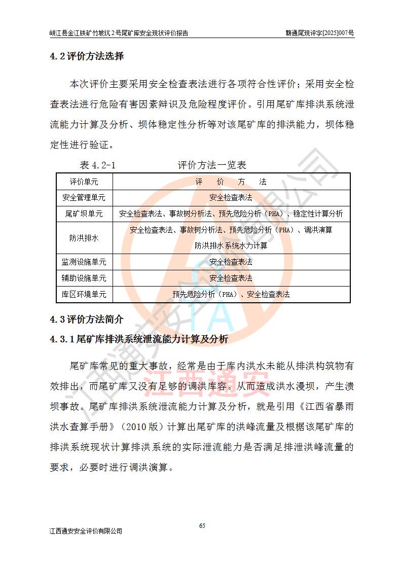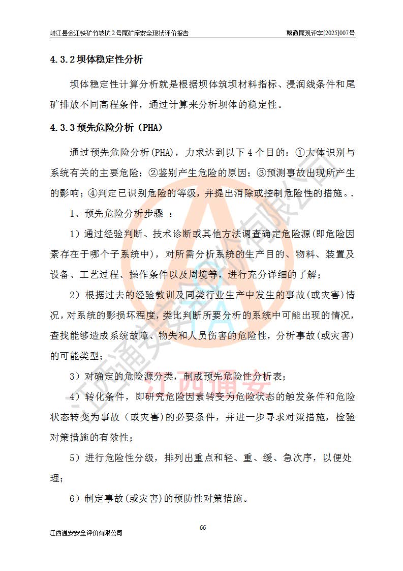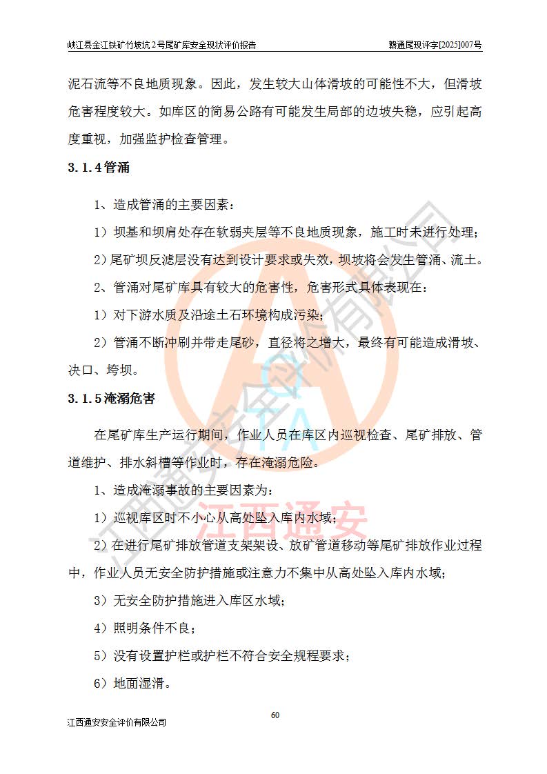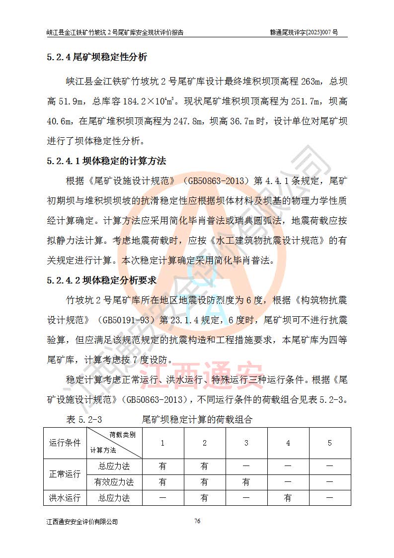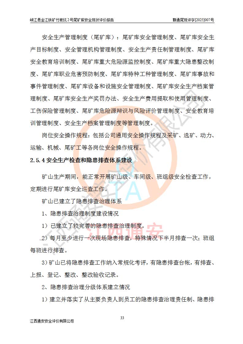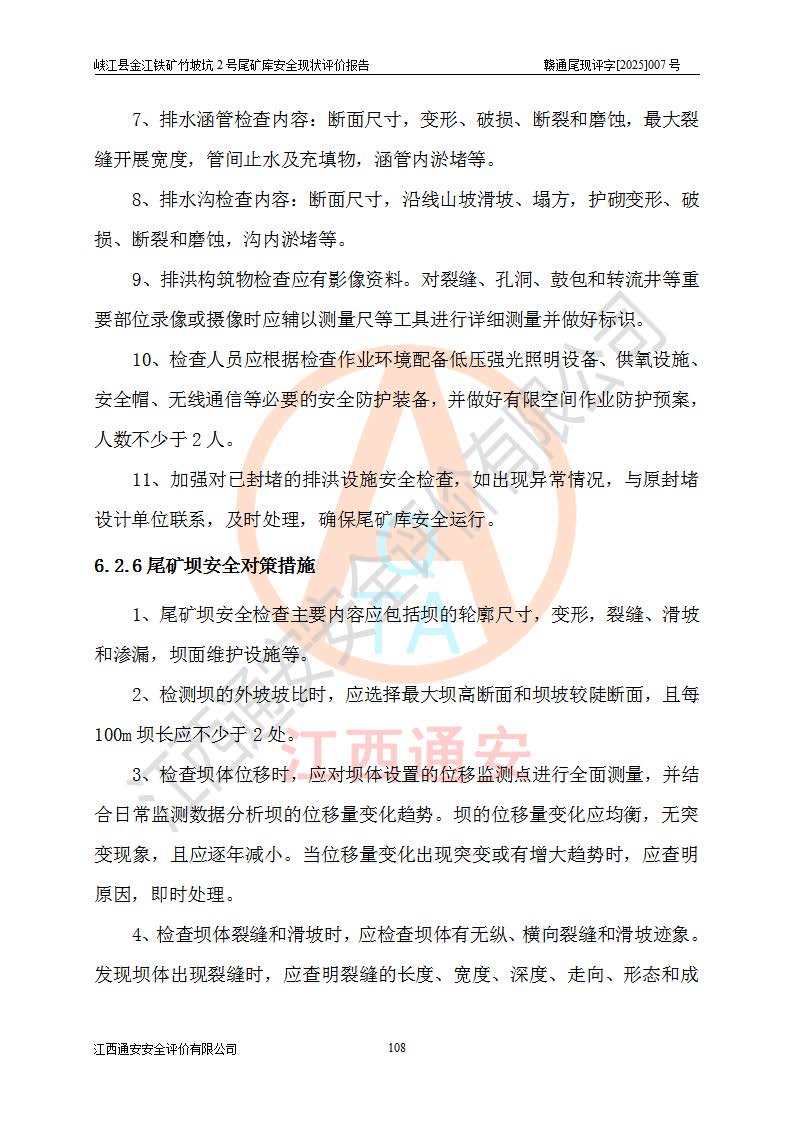 评价结论 | 峡江县金江铁矿竹坡坑2号尾矿库现状与《峡江县金江铁矿竹坡坑2号尾矿库加高扩容工程安全设施设计变更》一致,竹坡坑2号尾矿库为正常库,具备继续生产运行的安全生产条件。 | |||