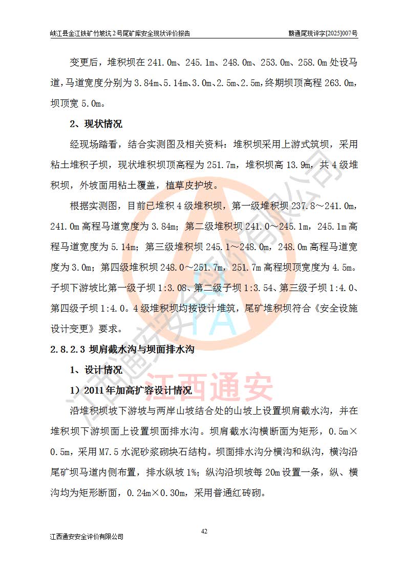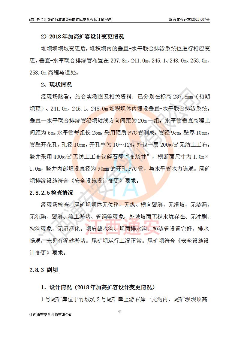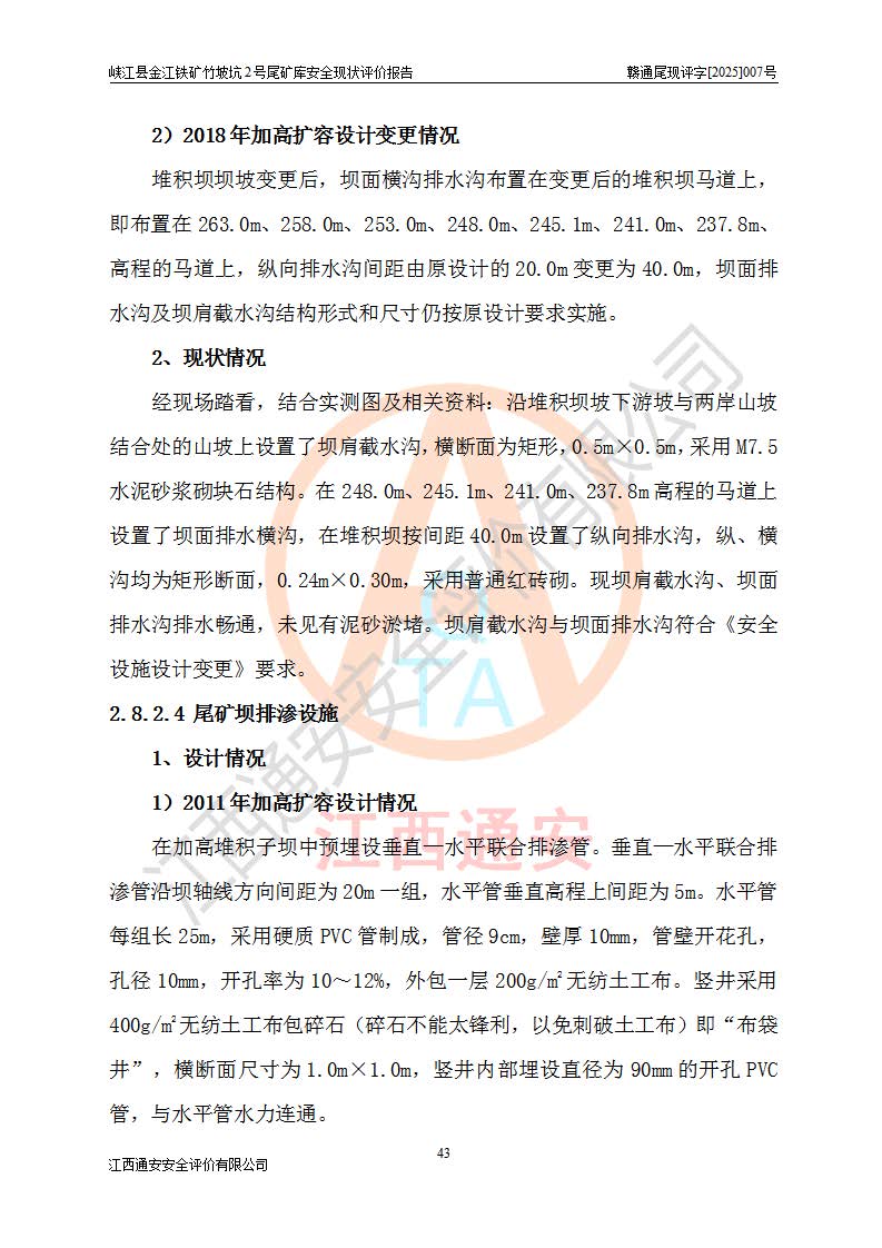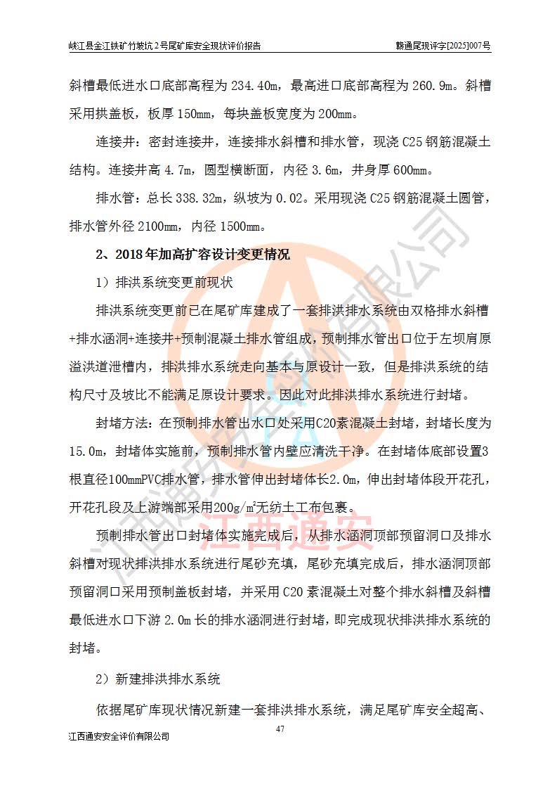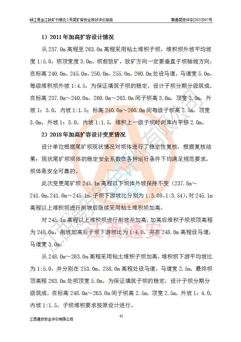 项目简介 | 峡江县金江铁矿成立于2004年5月9日,投资人为汪润生,为个人独资企业,住所为江西省吉安市峡江县金江乡黑虎村委二龙山,经营范围为铁矿露天/地下开采,铁精粉加工销售,废石尾砂加工销售。竹坡坑2号尾矿库位于峡江县金江乡黑虎村,靠近新余市与峡江县交界处,距峡江县城直线距离43**,距新余市良山镇直线距离8**,现状尾矿坝坝顶中部地理坐标:北纬X:27°35′47.96″,东经Y:114°53′41.06″,有公路相通市内外,交通方便。 峡江县金江铁矿竹坡坑2号尾矿库原设计尾矿坝为碾压土坝,采用风化土料一次性筑坝,总坝高26.0m,顶宽6.0m,坝顶高程为237.1m,坝轴线长94.5m,尾矿库库容为49.8×104m3。 2011年江西省冶金设计院有限责任公司对竹坡坑2号尾矿库进行加高扩容设计,2018年由原设计单位江西省冶金设计院有限责任公司对峡江县金江铁矿竹坡坑2号尾矿库加高扩容安全设施进行了设计变更。设计变更后竹坡坑2号尾矿库*终坝顶高程为263.0m,总坝高51.9m,尾矿库总库容为184.20×104m3,尾矿库为四等库。排洪系统采用双格斜槽+连接井+排水涵洞。 峡江县金江铁矿竹坡坑2号尾矿库于2022年5月20日取得江西省应急管理厅颁发的安全生产许可证,证书编号(赣)FM安许证字[2022]M1815号,有限期从2022年5月20日到2025年5月19日,为三年期。依照《非煤矿矿山企业安全生产许可证延期换证工作》的通知,根据***《安全生产许可证条例》、《江西省安全生产条例》、《非煤矿山安全生产许可证实施办法》、《江西省非煤矿矿山企业安全生产许可证办法》等规定的要求,受峡江县金江铁矿委托,我公司承担了竹坡坑2号尾矿库延期换证安全现状评价工作。 | |||